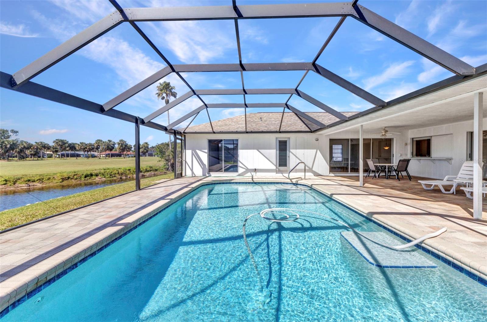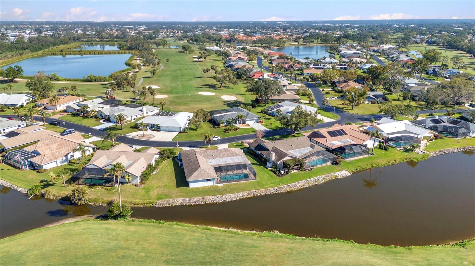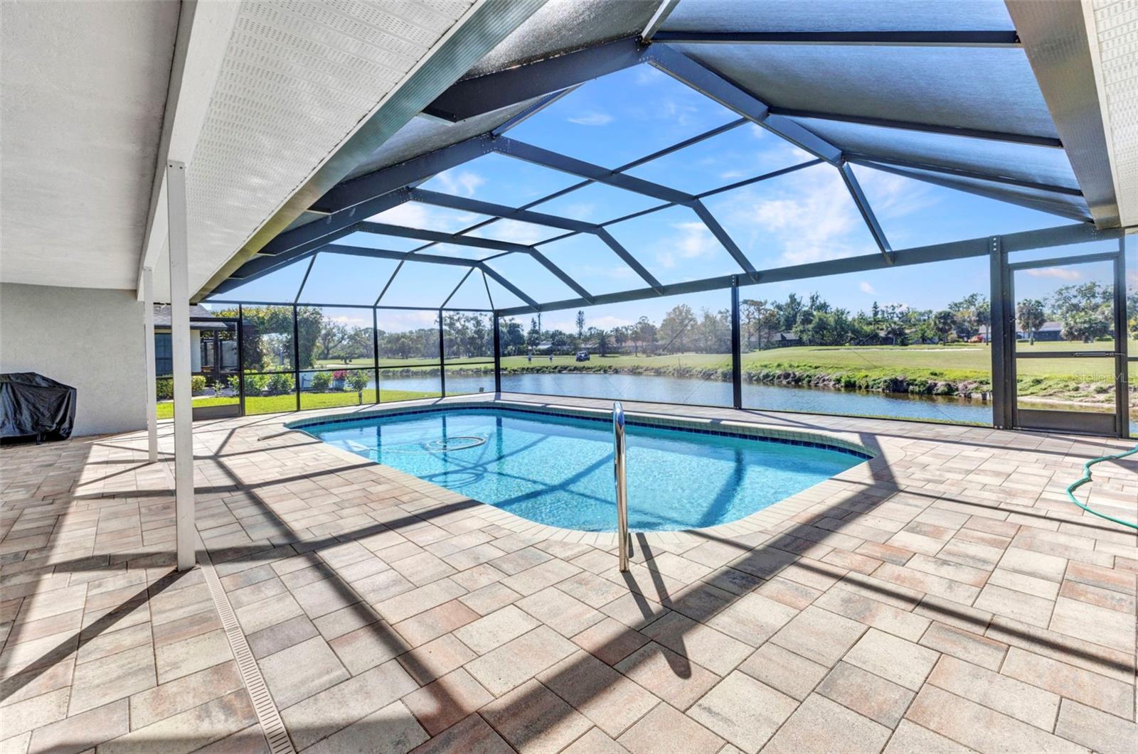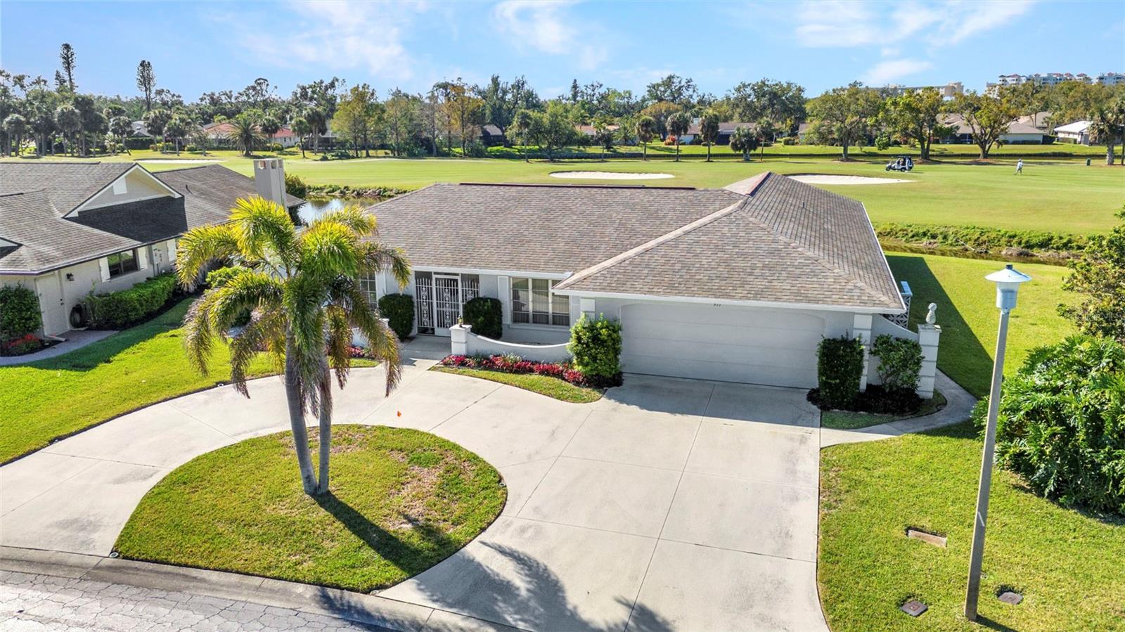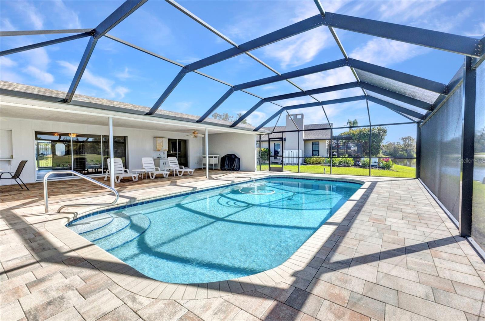 One or more photo(s) has been virtually staged. Discover the perfect blend of space, location, and breathtaking views in this beautiful Jacaranda Country Club home. You'll fall in love with the oversized, newly paved southern-facing lanai and large pool, offering serene WATER AND GOLF COURSE VIEWS--the best of both worlds. This home has been thoughtfully updated for both comfort and style. NEW PROFESSIONAL INTERIOR PAINTING was just completed to provide a bright fresh background for your decor, a new roof was installed in 2016, and a new pool cage was added in 2018. NEWER LUXURY VINYL PLANK FLOORING throughout the living, dining, kitchen and family room areas for easy maintenance and cleaning. REMODELED KITCHEN features neutral easy to clean quartz countertops, soft-close shaker style cabinetry, and a cozy breakfast nook that opens to the vaulted-ceiling family room. Designed for seamless indoor-outdoor living, the home offers multiple sliding glass doors, allowing access to the pool from nearly every room, including the living room, primary bedroom, family room, second bath, and third bedroom. Having the pool access bath is so convenient to avoid drips though the house. Additional highlights include a circle driveway for added parking space, a spacious 25' x 24' garage with pull-down attic storage, a walk-in pantry, and an extra-large laundry room. A RainBird irrigation system keeps the lawn lush and green year-round. Located in an X FLOOD ZONE so no flood insurance required with most lenders, NO CDD FEES and a low HOA of just $500 a year, this home offers the ultimate affordable Florida lifestyle. Superb location just about 5 miles from the beautiful beaches along the Gulf, the newly developing Wellen Park & the Cool Today Atlanta Braves Training Facility, Historic Downtown Venice is just 6 miles away and features a multitude of boutique shops and sidewalk cafe restaurants along with many events. Don't miss your chance to make it yours!