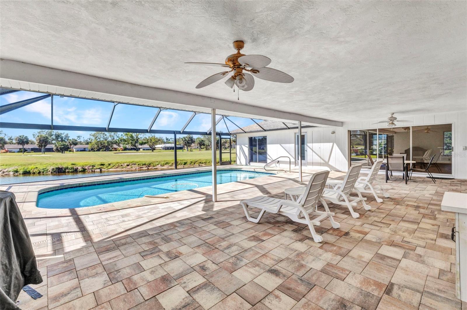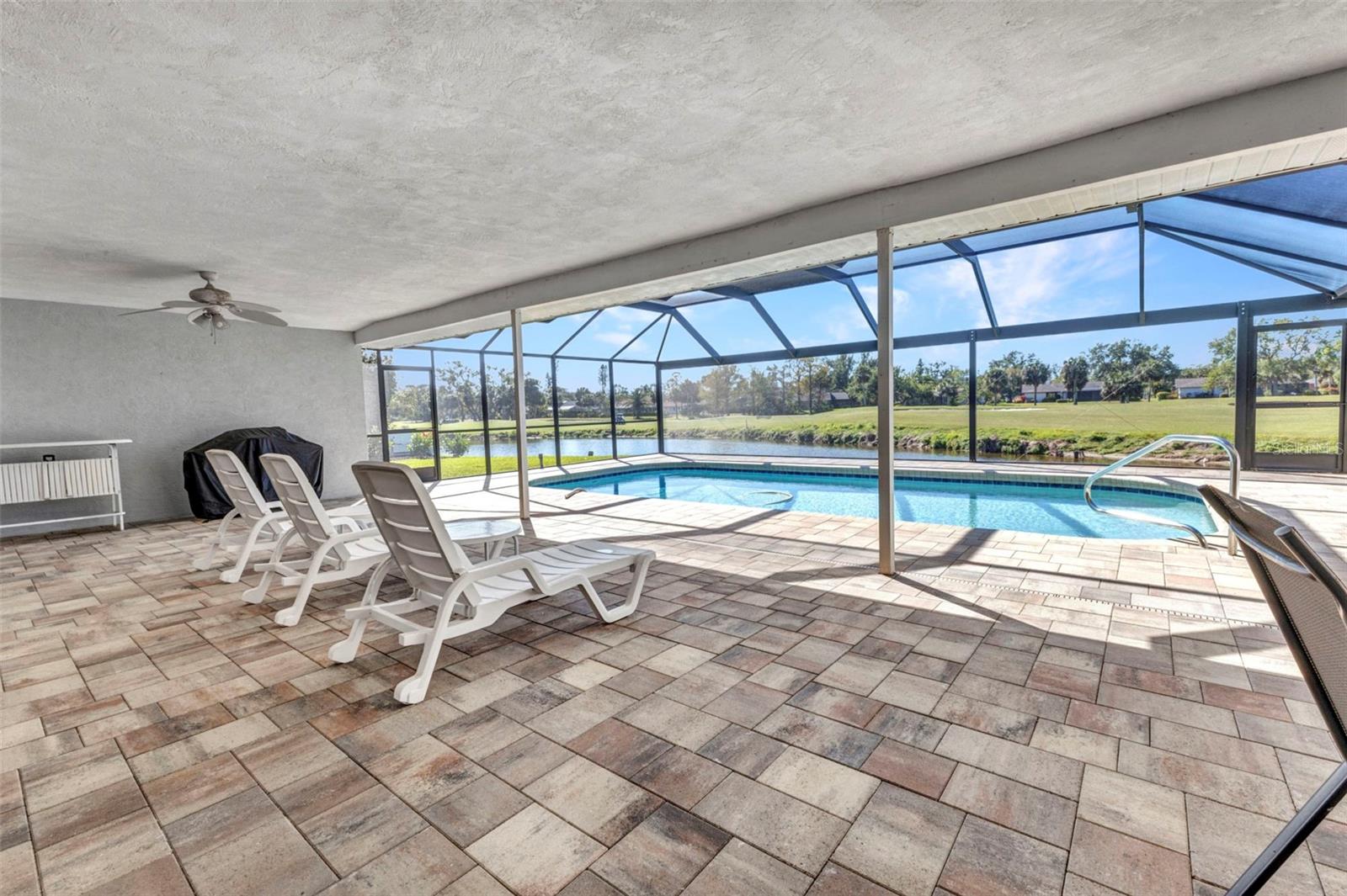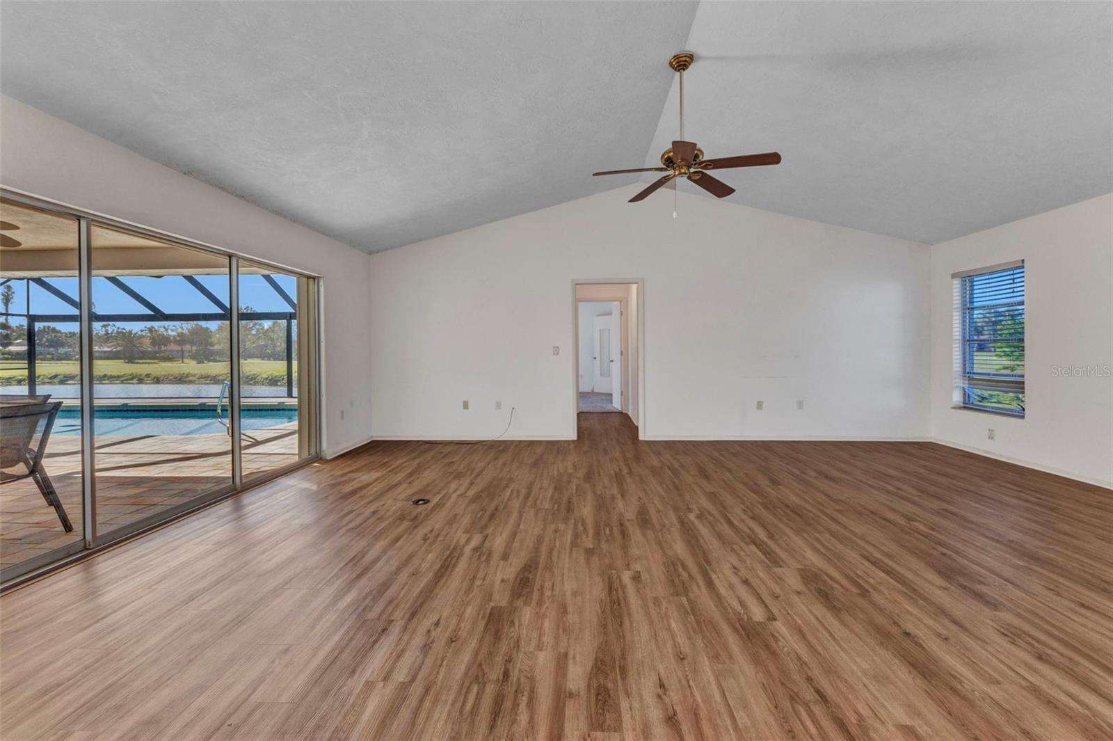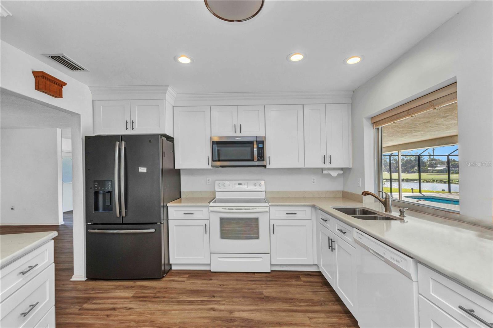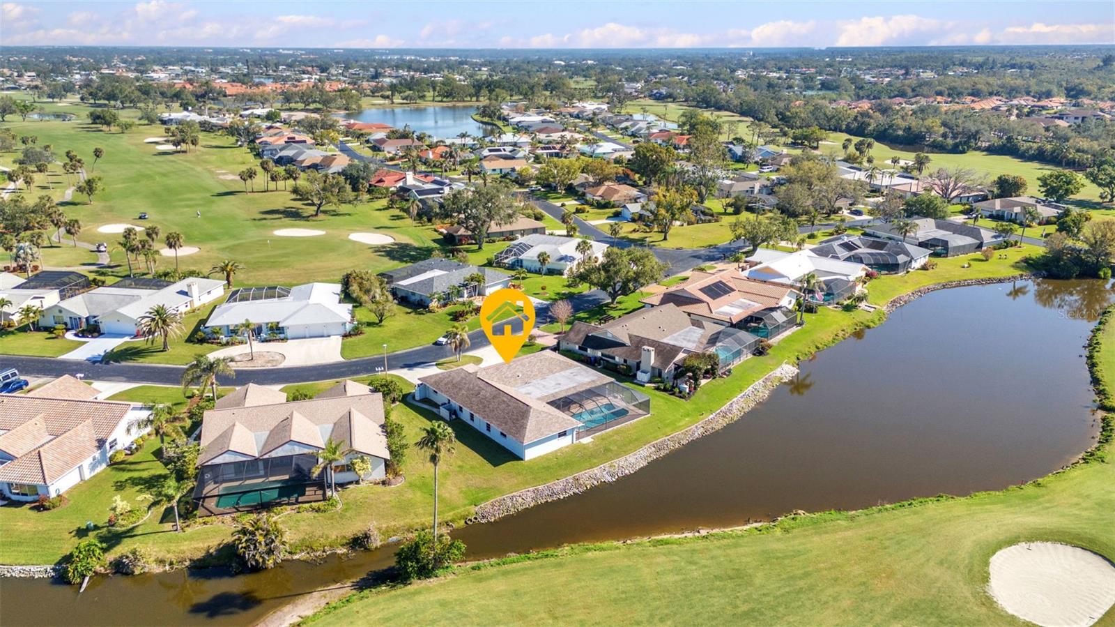 One or more photo(s) has been virtually staged. Discover the perfect blend of space, location, and breathtaking views in this beautiful Jacaranda Country Club home. You'll fall in love with the oversized, newly paved southern-facing lanai and large pool, offering serene WATER AND GOLF COURSE VIEWS--the best of both worlds. This home has been thoughtfully updated for both comfort and style. NEW PROFESSIONAL INTERIOR PAINTING was just completed to provide a bright fresh background for your decor, a new roof was installed in 2016, and a new pool cage was added in 2018. NEWER LUXURY VINYL PLANK FLOORING throughout the living, dining, kitchen and family room areas for easy maintenance and cleaning. REMODELED KITCHEN features neutral easy to clean quartz countertops, soft-close shaker style cabinetry, and a cozy breakfast nook that opens to the vaulted-ceiling family room. Designed for seamless indoor-outdoor living, the home offers multiple sliding glass doors, allowing access to the pool from nearly every room, including the living room, primary bedroom, family room, second bath, and third bedroom. Having the pool access bath is so convenient to avoid drips though the house. Additional highlights include a circle driveway for added parking space, a spacious 25' x 24' garage with pull-down attic storage, a walk-in pantry, and an extra-large laundry room. A RainBird irrigation system keeps the lawn lush and green year-round. Located in an X FLOOD ZONE so no flood insurance required with most lenders, NO CDD FEES and a low HOA of just $500 a year, this home offers the ultimate affordable Florida lifestyle. Superb location just about 5 miles from the beautiful beaches along the Gulf, the newly developing Wellen Park & the Cool Today Atlanta Braves Training Facility, Historic Downtown Venice is just 6 miles away and features a multitude of boutique shops and sidewalk cafe restaurants along with many events. Don't miss your chance to make it yours!