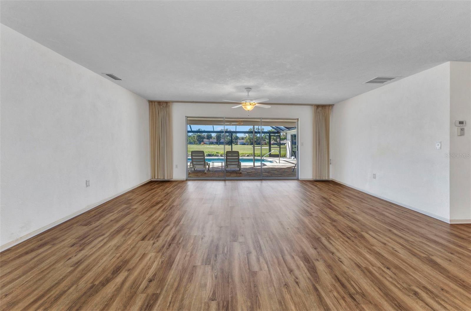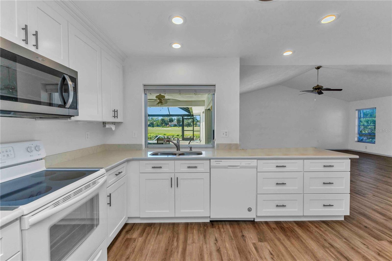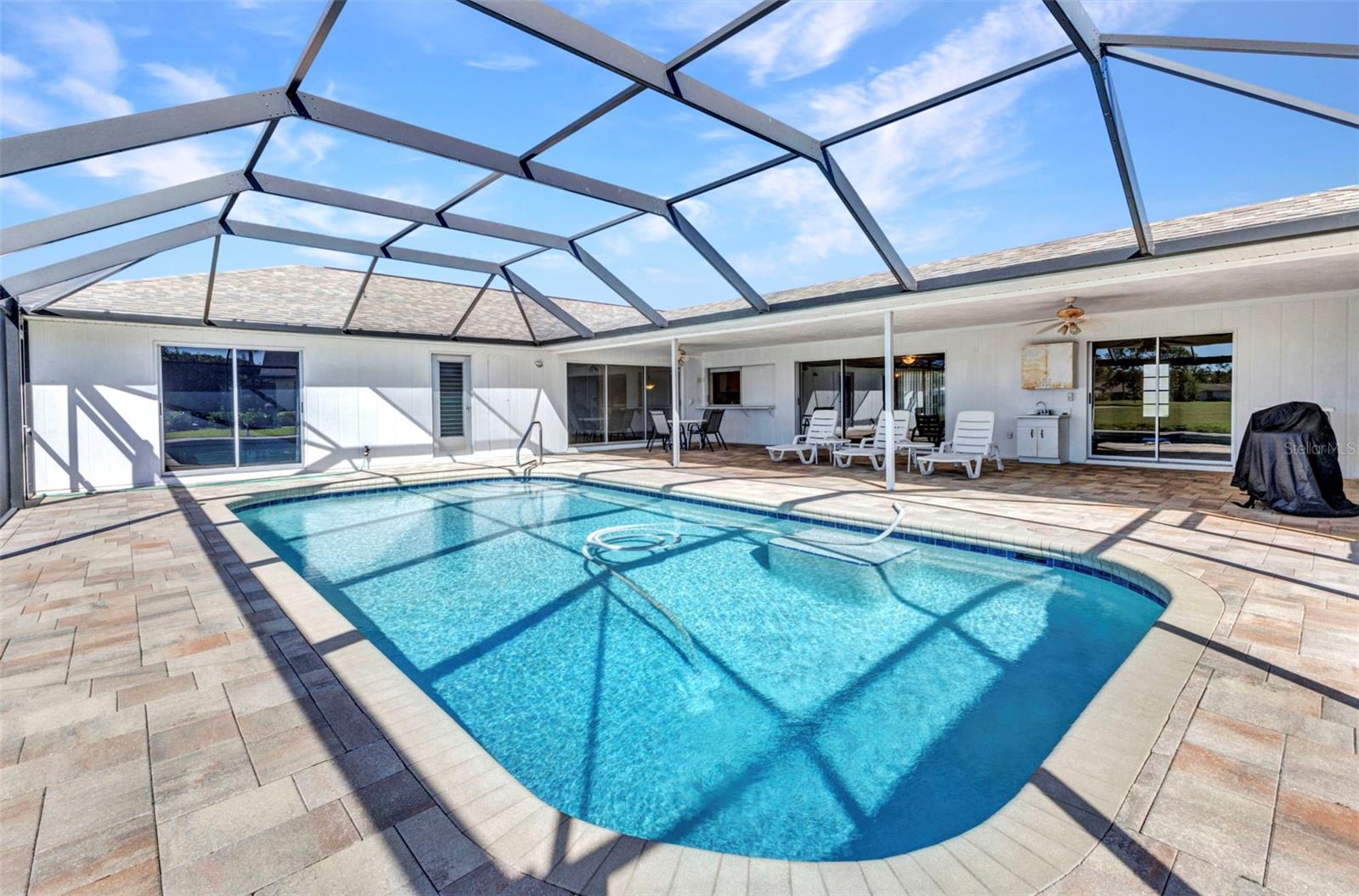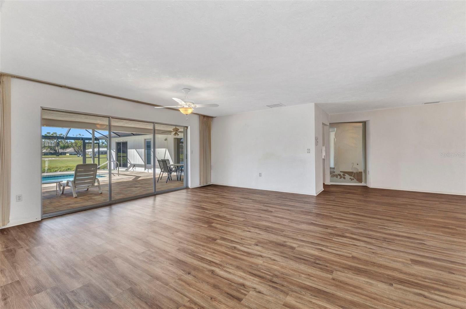 One or more photo(s) has been virtually staged. Discover the perfect blend of space, location, and breathtaking views in this beautiful Jacaranda Country Club home. You'll fall in love with the oversized, newly paved southern-facing lanai and large pool, offering serene WATER AND GOLF COURSE VIEWS--the best of both worlds. This home has been thoughtfully updated for both comfort and style. NEW PROFESSIONAL INTERIOR PAINTING was just completed to provide a bright fresh background for your decor, a new roof was installed in 2016, and a new pool cage was added in 2018. NEWER LUXURY VINYL PLANK FLOORING throughout the living, dining, kitchen and family room areas for easy maintenance and cleaning. REMODELED KITCHEN features neutral easy to clean quartz countertops, soft-close shaker style cabinetry, and a cozy breakfast nook that opens to the vaulted-ceiling family room. Designed for seamless indoor-outdoor living, the home offers multiple sliding glass doors, allowing access to the pool from nearly every room, including the living room, primary bedroom, family room, second bath, and third bedroom. Having the pool access bath is so convenient to avoid drips though the house. Additional highlights include a circle driveway for added parking space, a spacious 25' x 24' garage with pull-down attic storage, a walk-in pantry, and an extra-large laundry room. A RainBird irrigation system keeps the lawn lush and green year-round. Located in an X FLOOD ZONE so no flood insurance required with most lenders, NO CDD FEES and a low HOA of just $500 a year, this home offers the ultimate affordable Florida lifestyle. Superb location just about 5 miles from the beautiful beaches along the Gulf, the newly developing Wellen Park & the Cool Today Atlanta Braves Training Facility, Historic Downtown Venice is just 6 miles away and features a multitude of boutique shops and sidewalk cafe restaurants along with many events. Don't miss your chance to make it yours!