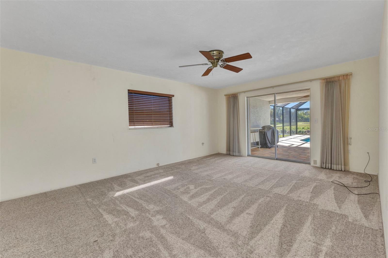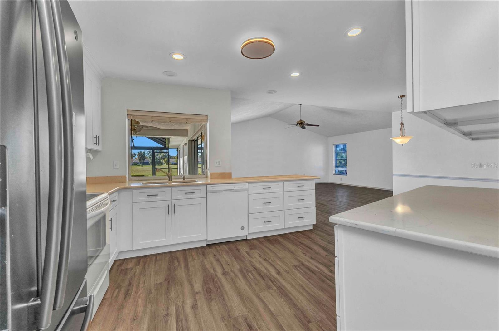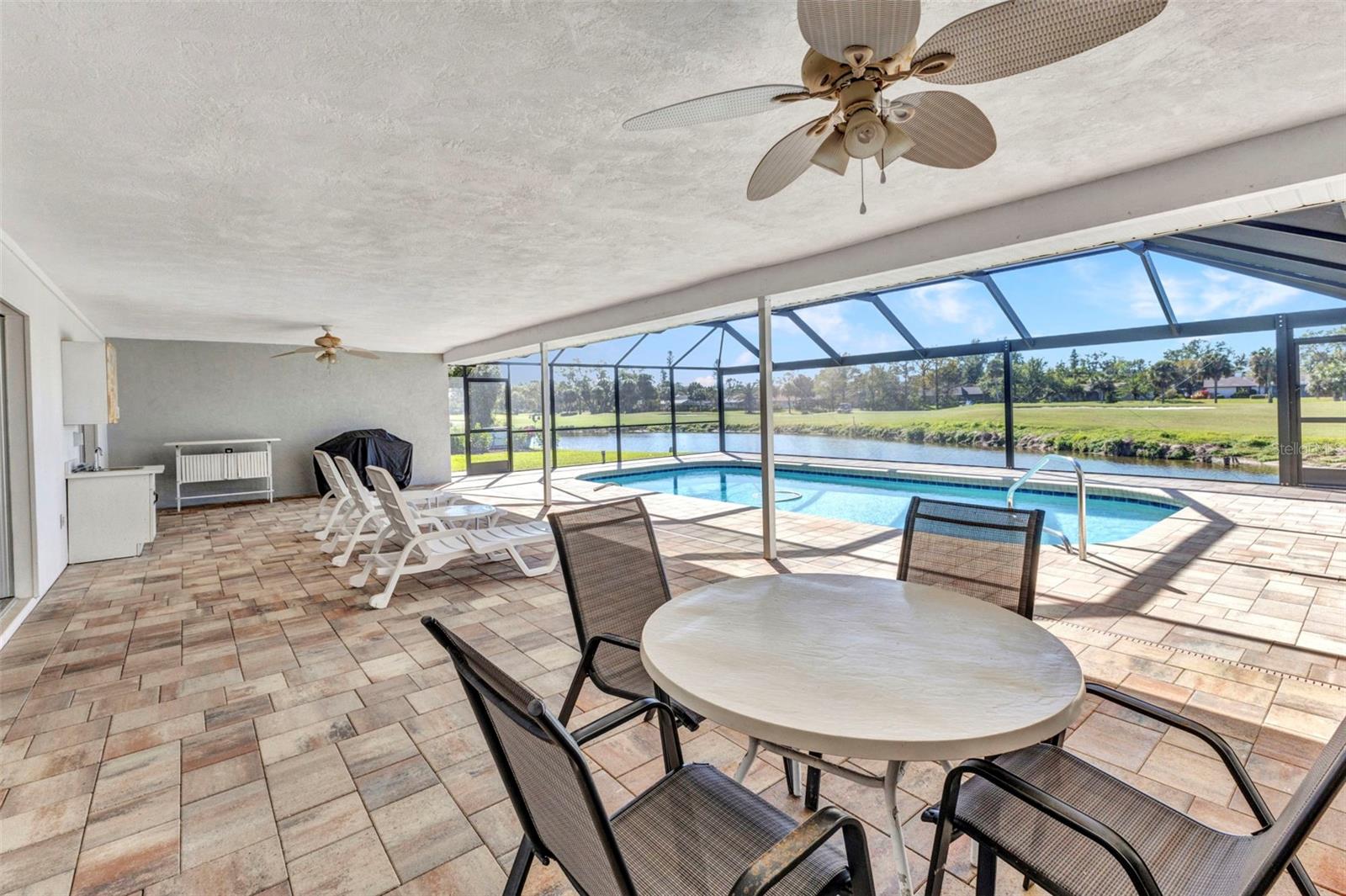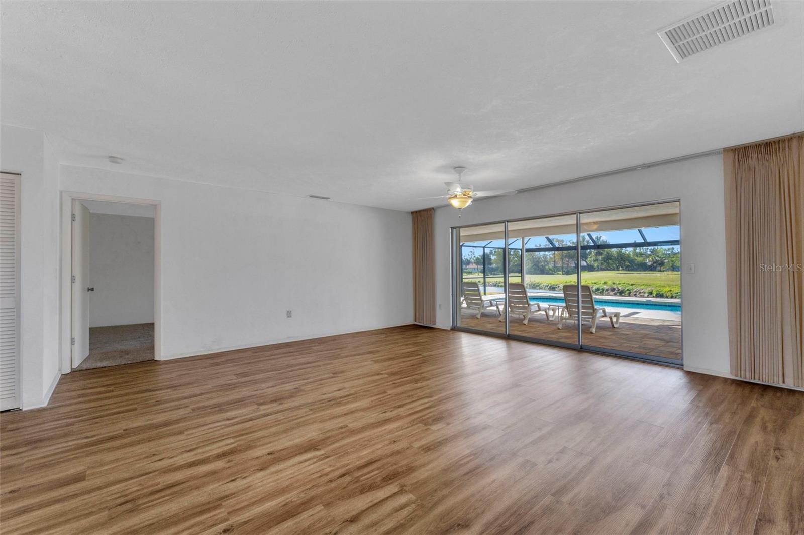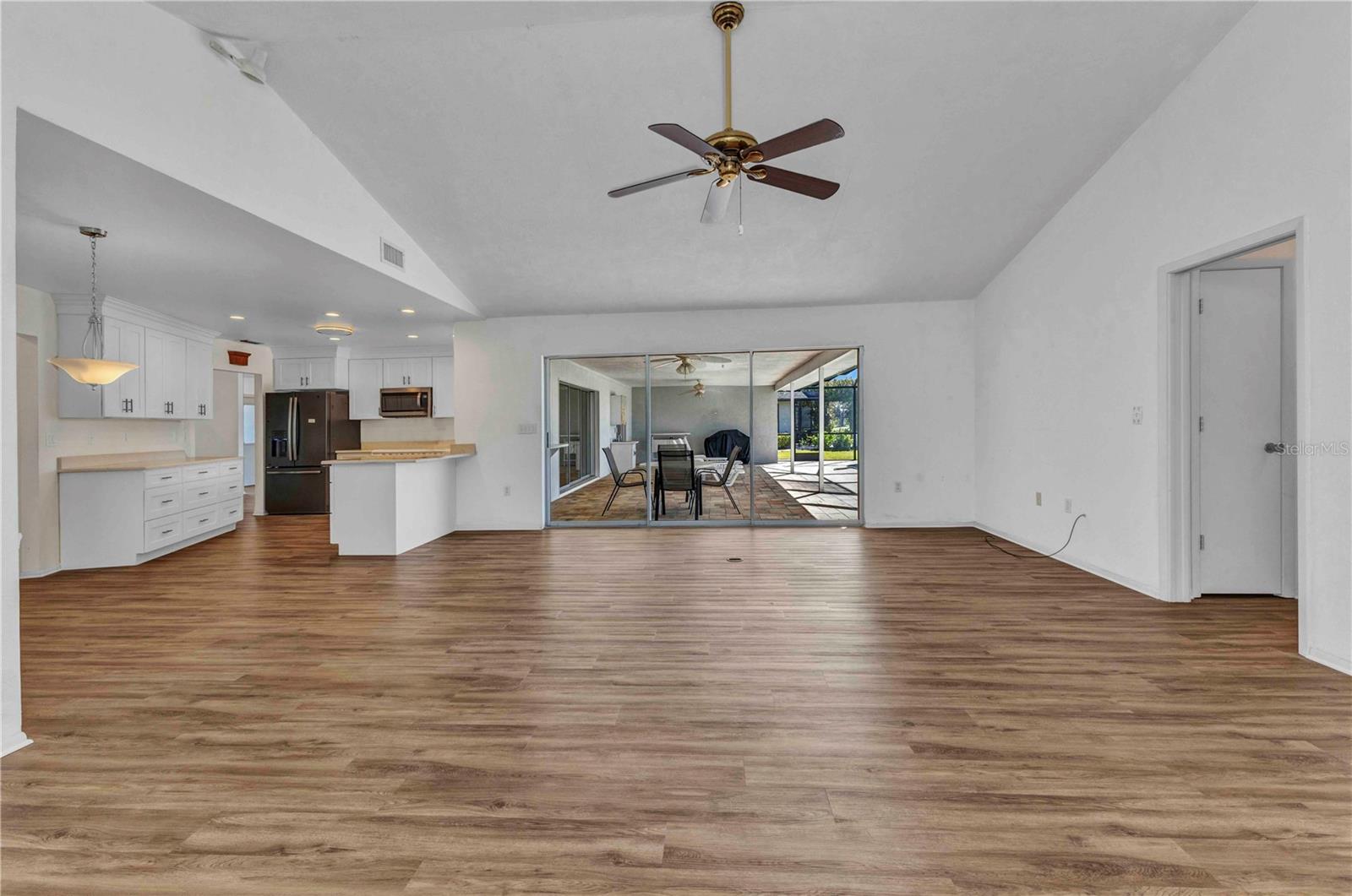 One or more photo(s) has been virtually staged. Discover the perfect blend of space, location, and breathtaking views in this beautiful Jacaranda Country Club home. You'll fall in love with the oversized, newly paved southern-facing lanai and large pool, offering serene WATER AND GOLF COURSE VIEWS--the best of both worlds. This home has been thoughtfully updated for both comfort and style. NEW PROFESSIONAL INTERIOR PAINTING was just completed to provide a bright fresh background for your decor, a new roof was installed in 2016, and a new pool cage was added in 2018. NEWER LUXURY VINYL PLANK FLOORING throughout the living, dining, kitchen and family room areas for easy maintenance and cleaning. REMODELED KITCHEN features neutral easy to clean quartz countertops, soft-close shaker style cabinetry, and a cozy breakfast nook that opens to the vaulted-ceiling family room. Designed for seamless indoor-outdoor living, the home offers multiple sliding glass doors, allowing access to the pool from nearly every room, including the living room, primary bedroom, family room, second bath, and third bedroom. Having the pool access bath is so convenient to avoid drips though the house. Additional highlights include a circle driveway for added parking space, a spacious 25' x 24' garage with pull-down attic storage, a walk-in pantry, and an extra-large laundry room. A RainBird irrigation system keeps the lawn lush and green year-round. Located in an X FLOOD ZONE so no flood insurance required with most lenders, NO CDD FEES and a low HOA of just $500 a year, this home offers the ultimate affordable Florida lifestyle. Superb location just about 5 miles from the beautiful beaches along the Gulf, the newly developing Wellen Park & the Cool Today Atlanta Braves Training Facility, Historic Downtown Venice is just 6 miles away and features a multitude of boutique shops and sidewalk cafe restaurants along with many events. Don't miss your chance to make it yours!