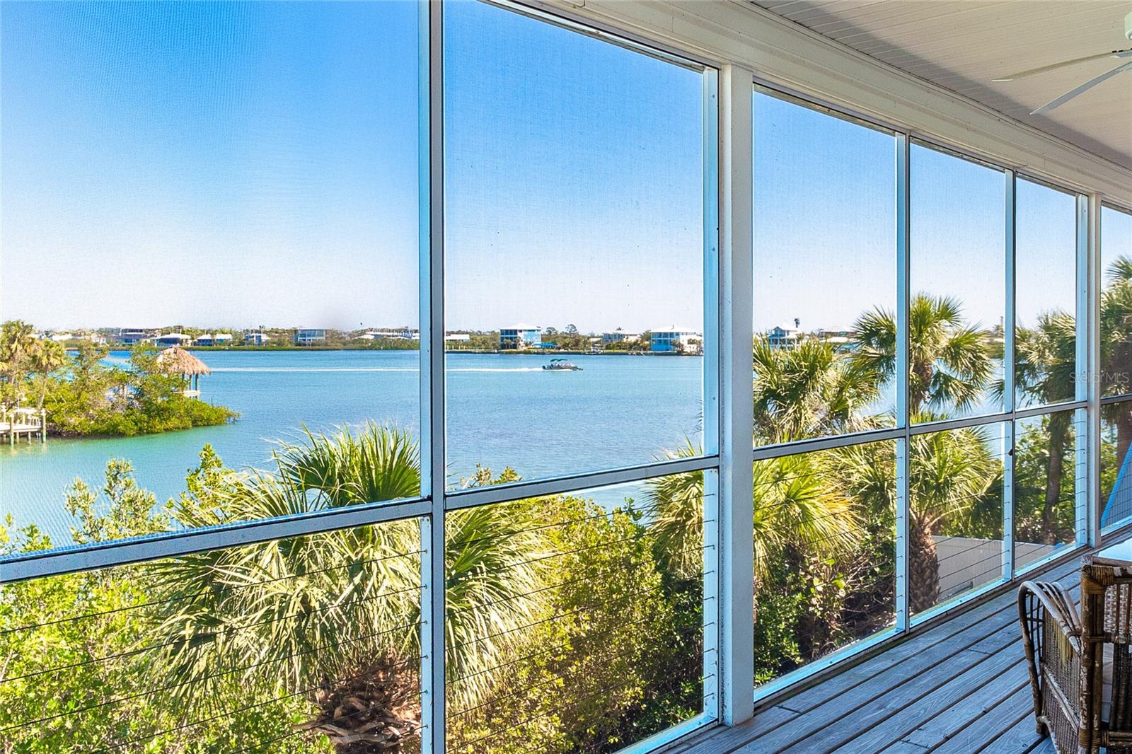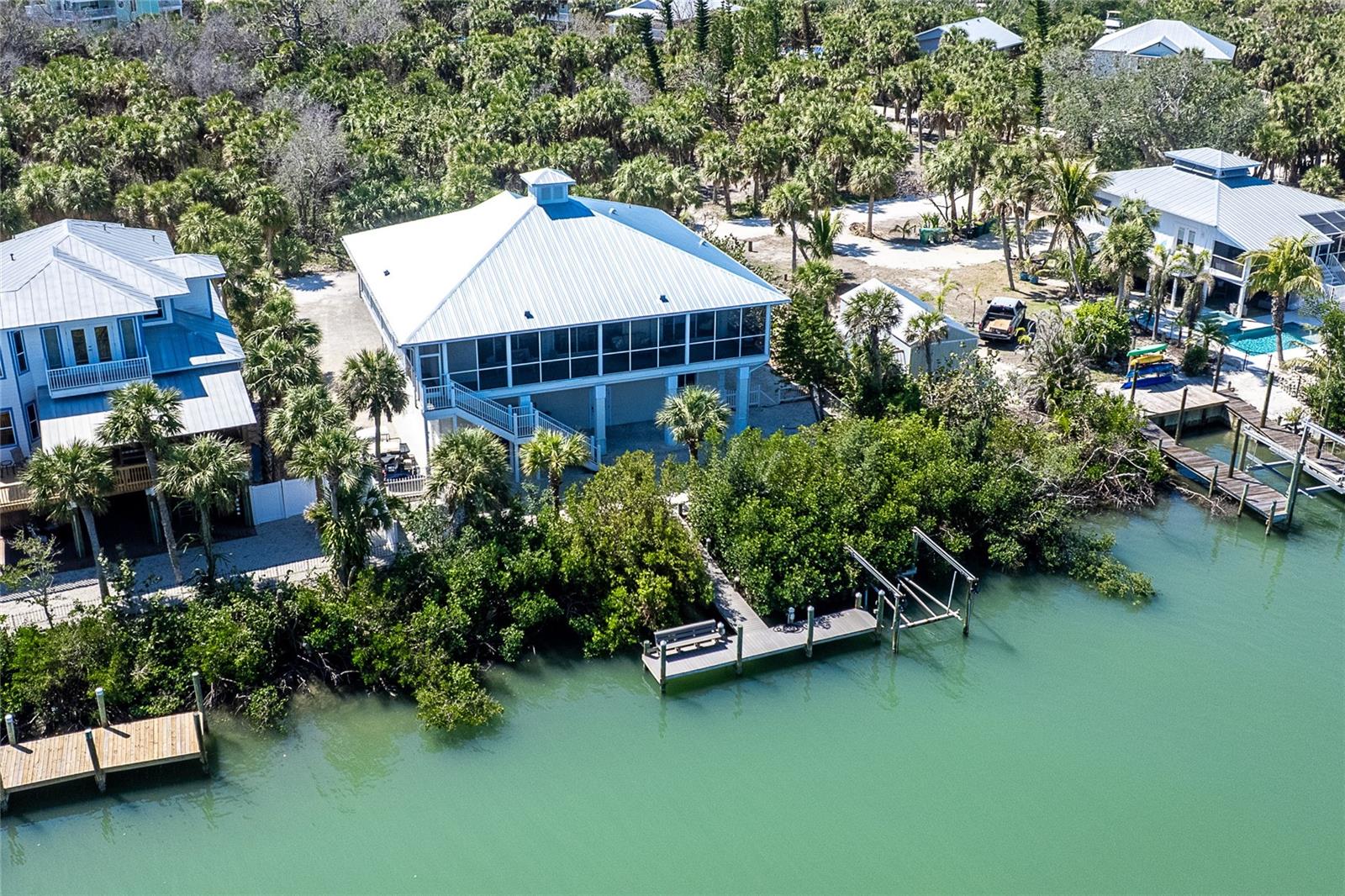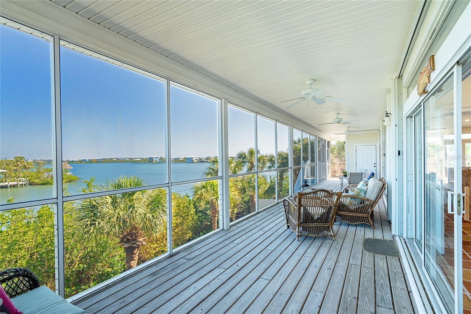 Contemporary, yet beachy 3 bedroom 2 and 1/2 bathroom home on deep water, just minutes from the Intracoastal Waterway!! This home, which is on one floor has tile throughout, quartz countertops and wood cabinets in the kitchen, elevator and open floor plan with expansive views of the Intracoastal Waterway. The primary bedroom has the same water view and boasts two walk in closets and one full wall of built in drawer space. The ensuite bathroom has both a shower and tub, with linen closet for storage. The rear deck with massive water views runs the entire length of the home. There is a front porch and wrap around decks. Being sold furnished with hurricane shutters. Dock with lift is just seconds from the ICW. The entire first floor foundation is 2000 square foot garage with tons of storage. Located on the bridgeless, barrier Don Pedro-Knight-Palm Island which is situated between St. Myers/Naples to the south and Sarasota/Tampa to the north. Accessible only via private boat or a 4 minute car passenger ferry ride. Enjoy all the pleasures of serene island life: fishing, kayaking, paddle boarding , boating, diving, watching glorious sunsets and walking the uncrowded beaches in search of shells and shark's teeth. Just a few minutes in a golf cart to the beach. Rental income available upon request. Buy your piece of island paradise today!!!!