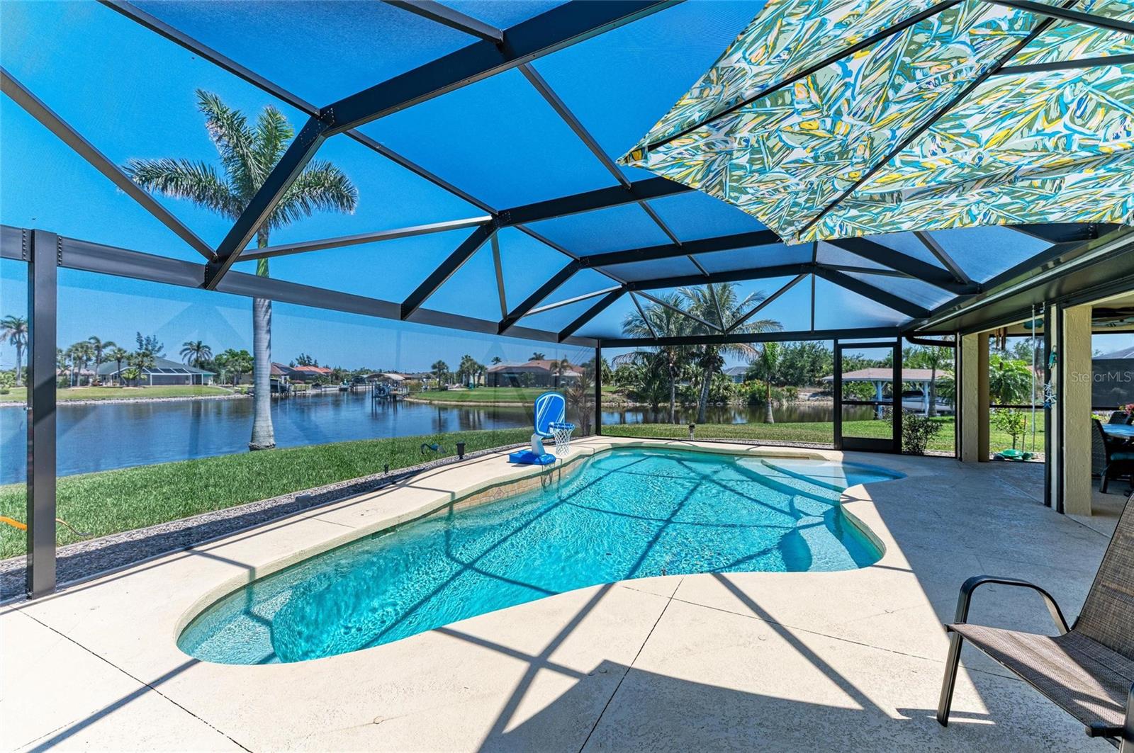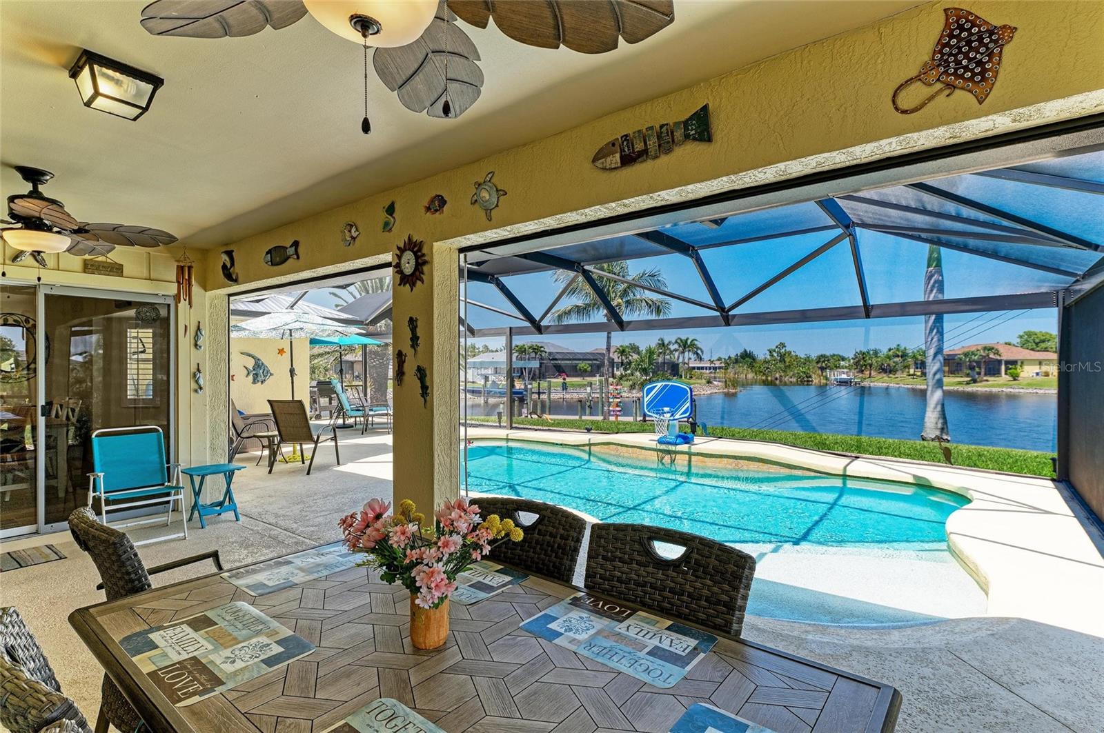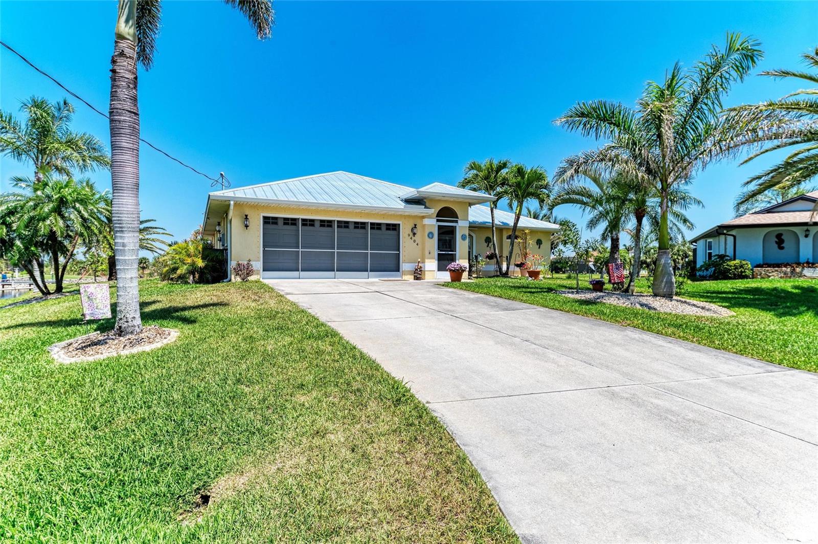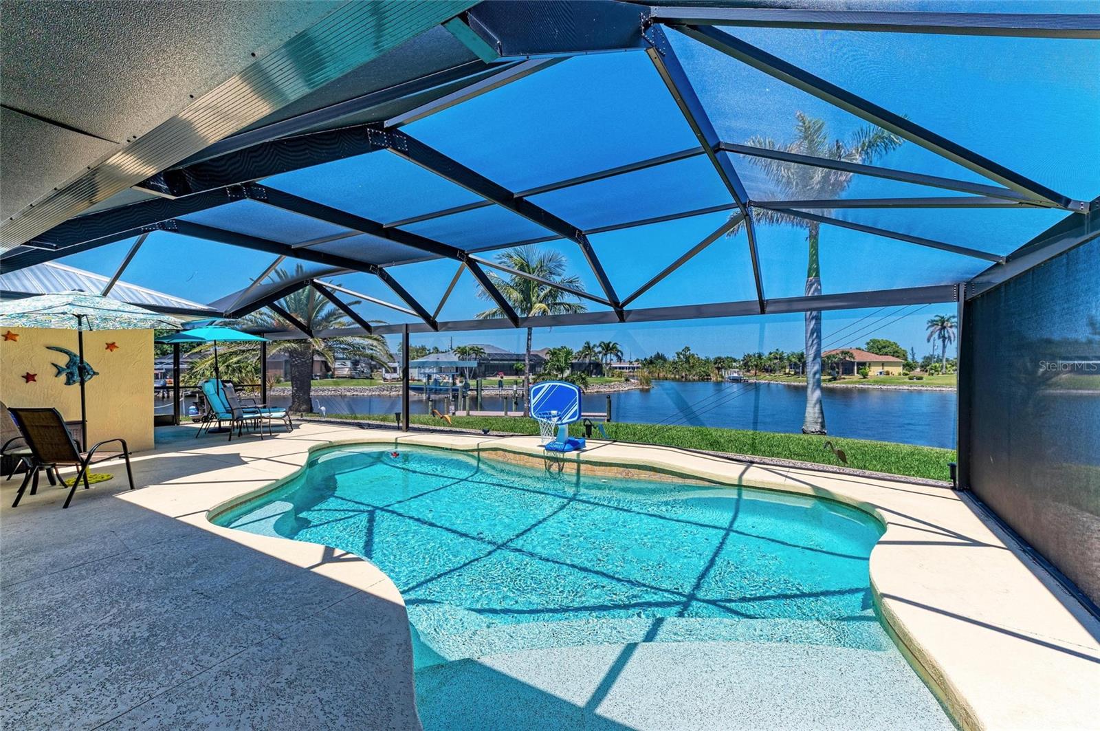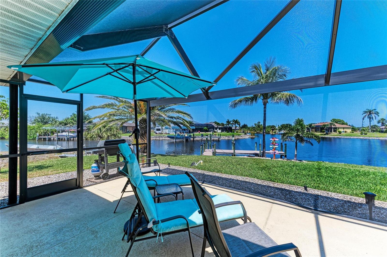 This stunning waterfront home boasts an impressive 168 (appx.) feet of serene water frontage, offering unobstructed, panoramic views and a peaceful ambiance. Designed with both durability and charm in mind, the home features a sleek metal roof and gutters, providing long-lasting protection and a clean, modern aesthetic. Recently redesigned with a fresh, modern touch, this beautiful home showcases porcelain tile throughout, and an open floor plan that seamlessly connects the living room, dinette area, and kitchen beneath a striking vaulted ceiling, creating an airy and expansive feel. The living room is adorned with classic plantation shutters and features large pocket sliders that open fully to the lanai, blending indoor and outdoor living with ease. The kitchen boasts rich wood cabinetry, quartz countertops, a charming farmhouse sink, and all appliances, making both everyday cooking and entertaining a breeze. Just off the kitchen, a cozy dinette with its own set of sliders to the lanai offers the perfect spot for casual dining or morning coffee with a stunning view. The inviting screened entrance creates a welcoming first impression, and the carefully designed curbing around the lush vegetation beds adds a polished touch to the mature tropical landscaping including palms and fruit-bearing mango, guava, and avocado trees is sustained by a 5-zone irrigation system. Additional thoughtful touches like the screened garage door allow for comfortable airflow while maintaining privacy and functionality. The primary bedroom includes pocket sliders that open directly to the lanai, his-and-her closets, and an ensuite bath with quartz topped vanity, creating a private retreat. Two guest bedrooms share the second bath which also has a wood vanity with quartz countertop and single bowl sink, perfect for family or visitors. The expansive lanai and pool deck area surround a heated saltwater pool featuring a sunshelf, beachfront-style entrance, and an outdoor shower--all enclosed by a panoramic screen that provides breathtaking, unobstructed water views. The property is enhanced by a 33 x 7 ft. composite dock equipped with water and electricity, riprap shoreline protection, and irrigation capabilities drawn from the canal. This property is a must see with its stunning waterfront views. You will love its perfect blend of style, comfort, and waterfront living while combining thoughtful design with modern living.