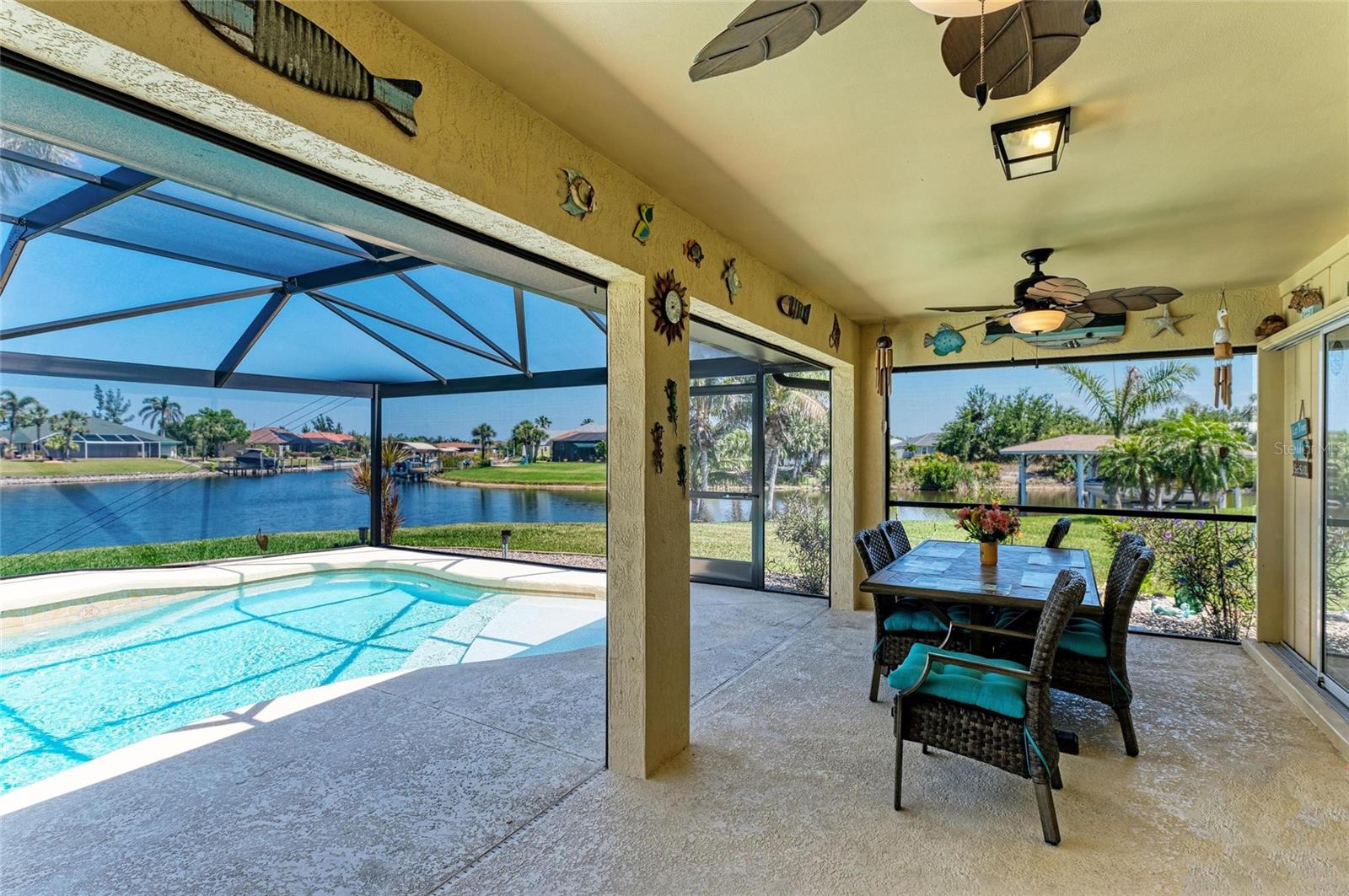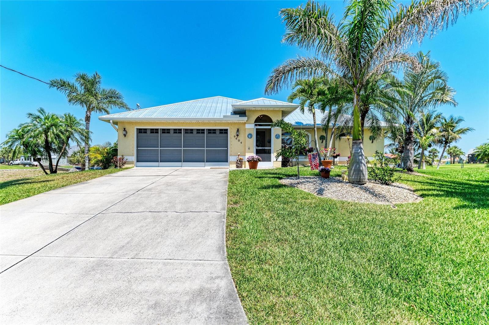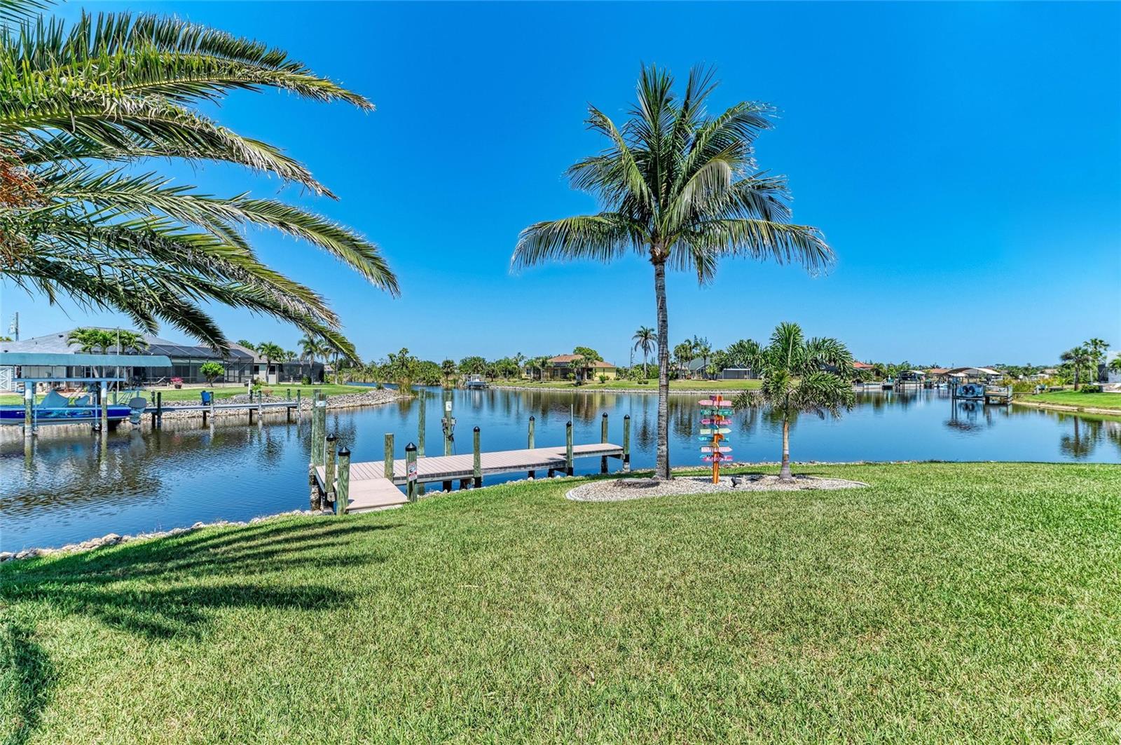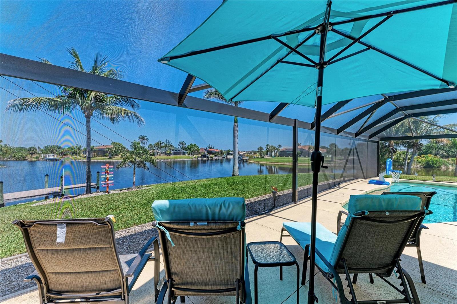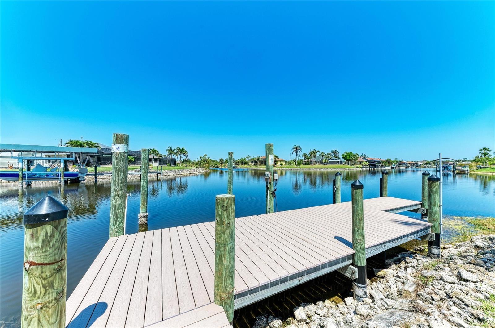 This stunning waterfront home boasts an impressive 168 (appx.) feet of serene water frontage, offering unobstructed, panoramic views and a peaceful ambiance. Designed with both durability and charm in mind, the home features a sleek metal roof and gutters, providing long-lasting protection and a clean, modern aesthetic. Recently redesigned with a fresh, modern touch, this beautiful home showcases porcelain tile throughout, and an open floor plan that seamlessly connects the living room, dinette area, and kitchen beneath a striking vaulted ceiling, creating an airy and expansive feel. The living room is adorned with classic plantation shutters and features large pocket sliders that open fully to the lanai, blending indoor and outdoor living with ease. The kitchen boasts rich wood cabinetry, quartz countertops, a charming farmhouse sink, and all appliances, making both everyday cooking and entertaining a breeze. Just off the kitchen, a cozy dinette with its own set of sliders to the lanai offers the perfect spot for casual dining or morning coffee with a stunning view. The inviting screened entrance creates a welcoming first impression, and the carefully designed curbing around the lush vegetation beds adds a polished touch to the mature tropical landscaping including palms and fruit-bearing mango, guava, and avocado trees is sustained by a 5-zone irrigation system. Additional thoughtful touches like the screened garage door allow for comfortable airflow while maintaining privacy and functionality. The primary bedroom includes pocket sliders that open directly to the lanai, his-and-her closets, and an ensuite bath with quartz topped vanity, creating a private retreat. Two guest bedrooms share the second bath which also has a wood vanity with quartz countertop and single bowl sink, perfect for family or visitors. The expansive lanai and pool deck area surround a heated saltwater pool featuring a sunshelf, beachfront-style entrance, and an outdoor shower--all enclosed by a panoramic screen that provides breathtaking, unobstructed water views. The property is enhanced by a 33 x 7 ft. composite dock equipped with water and electricity, riprap shoreline protection, and irrigation capabilities drawn from the canal. This property is a must see with its stunning waterfront views. You will love its perfect blend of style, comfort, and waterfront living while combining thoughtful design with modern living.