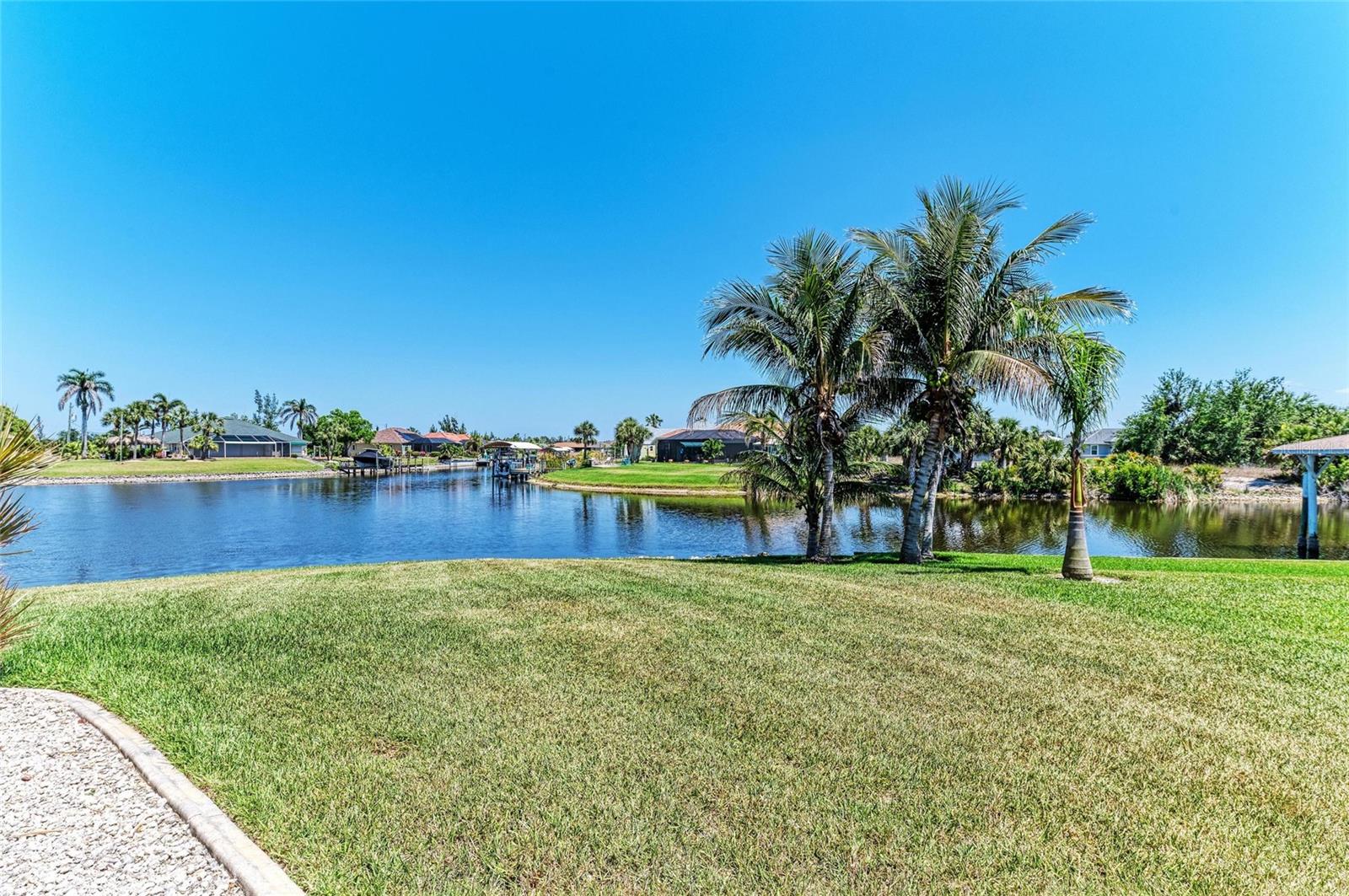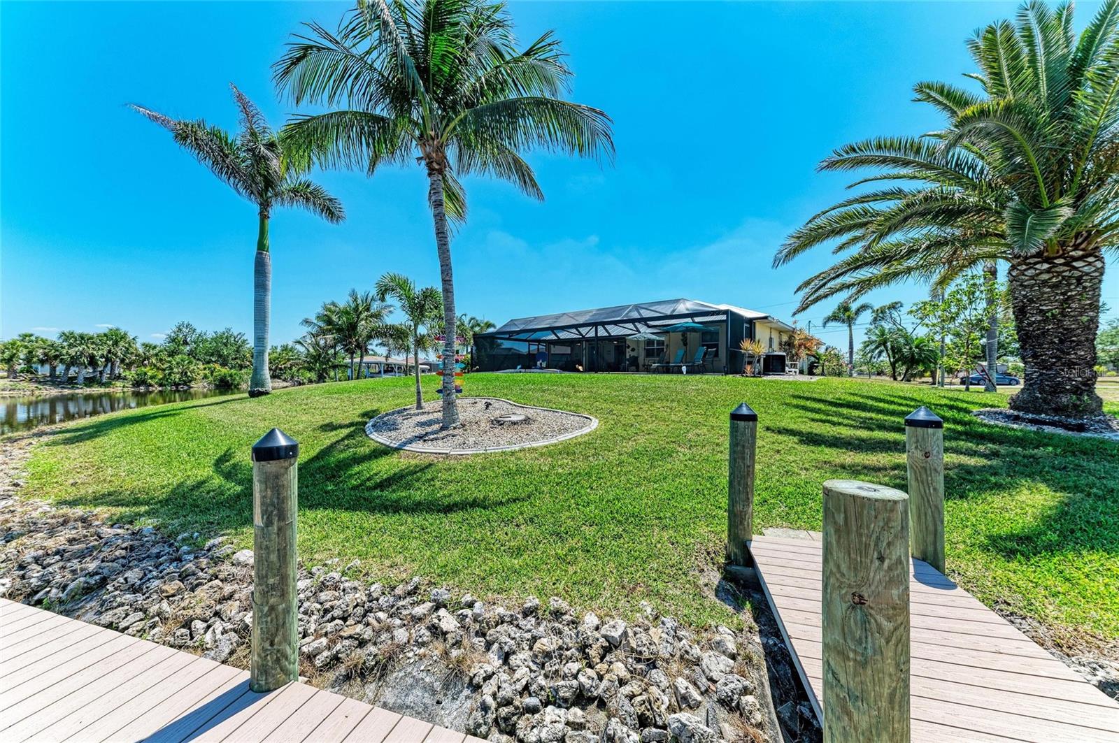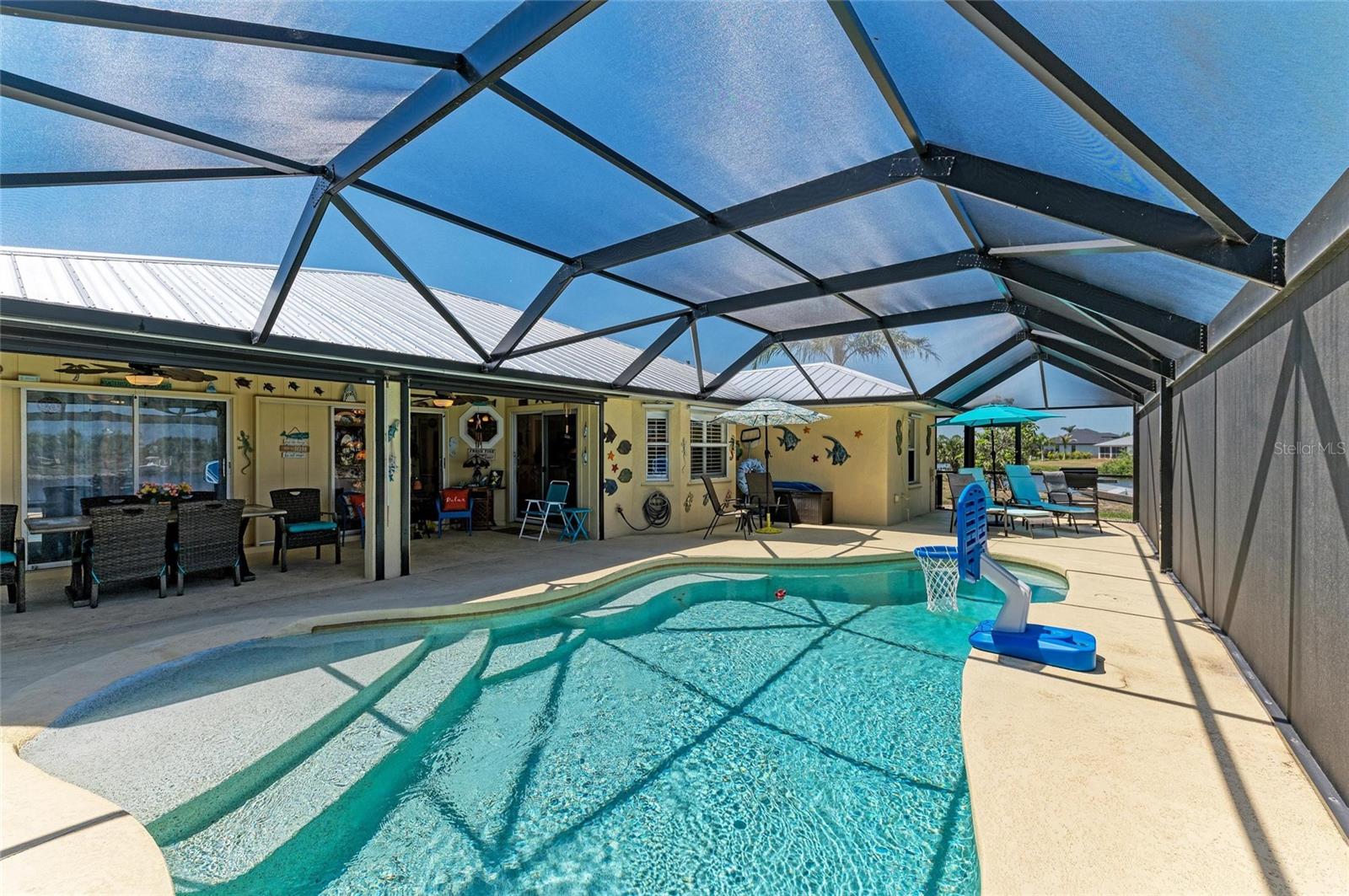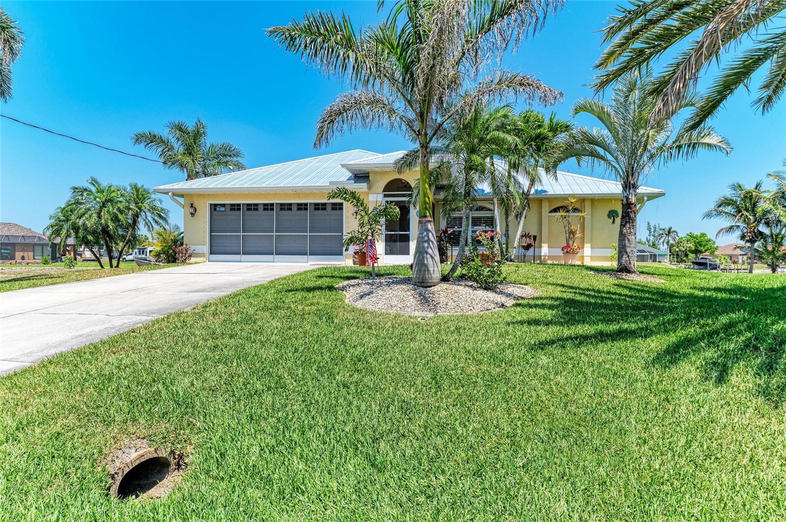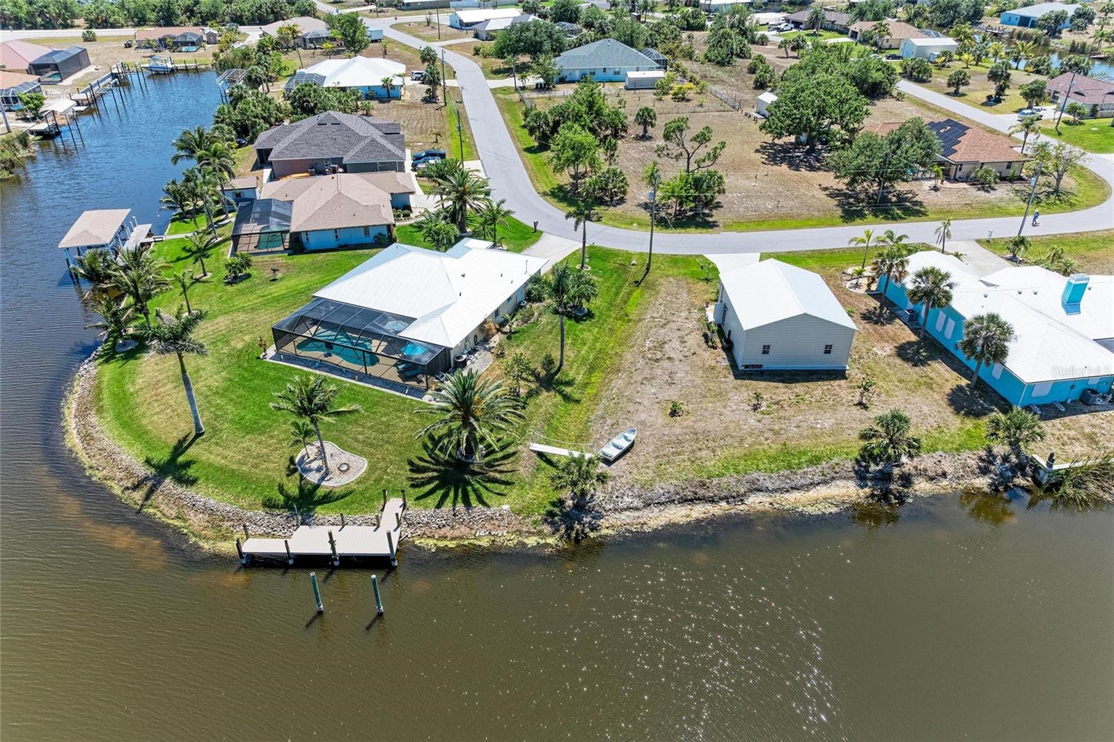 This stunning waterfront home boasts an impressive 168 (appx.) feet of serene water frontage, offering unobstructed, panoramic views and a peaceful ambiance. Designed with both durability and charm in mind, the home features a sleek metal roof and gutters, providing long-lasting protection and a clean, modern aesthetic. Recently redesigned with a fresh, modern touch, this beautiful home showcases porcelain tile throughout, and an open floor plan that seamlessly connects the living room, dinette area, and kitchen beneath a striking vaulted ceiling, creating an airy and expansive feel. The living room is adorned with classic plantation shutters and features large pocket sliders that open fully to the lanai, blending indoor and outdoor living with ease. The kitchen boasts rich wood cabinetry, quartz countertops, a charming farmhouse sink, and all appliances, making both everyday cooking and entertaining a breeze. Just off the kitchen, a cozy dinette with its own set of sliders to the lanai offers the perfect spot for casual dining or morning coffee with a stunning view. The inviting screened entrance creates a welcoming first impression, and the carefully designed curbing around the lush vegetation beds adds a polished touch to the mature tropical landscaping including palms and fruit-bearing mango, guava, and avocado trees is sustained by a 5-zone irrigation system. Additional thoughtful touches like the screened garage door allow for comfortable airflow while maintaining privacy and functionality. The primary bedroom includes pocket sliders that open directly to the lanai, his-and-her closets, and an ensuite bath with quartz topped vanity, creating a private retreat. Two guest bedrooms share the second bath which also has a wood vanity with quartz countertop and single bowl sink, perfect for family or visitors. The expansive lanai and pool deck area surround a heated saltwater pool featuring a sunshelf, beachfront-style entrance, and an outdoor shower--all enclosed by a panoramic screen that provides breathtaking, unobstructed water views. The property is enhanced by a 33 x 7 ft. composite dock equipped with water and electricity, riprap shoreline protection, and irrigation capabilities drawn from the canal. This property is a must see with its stunning waterfront views. You will love its perfect blend of style, comfort, and waterfront living while combining thoughtful design with modern living.