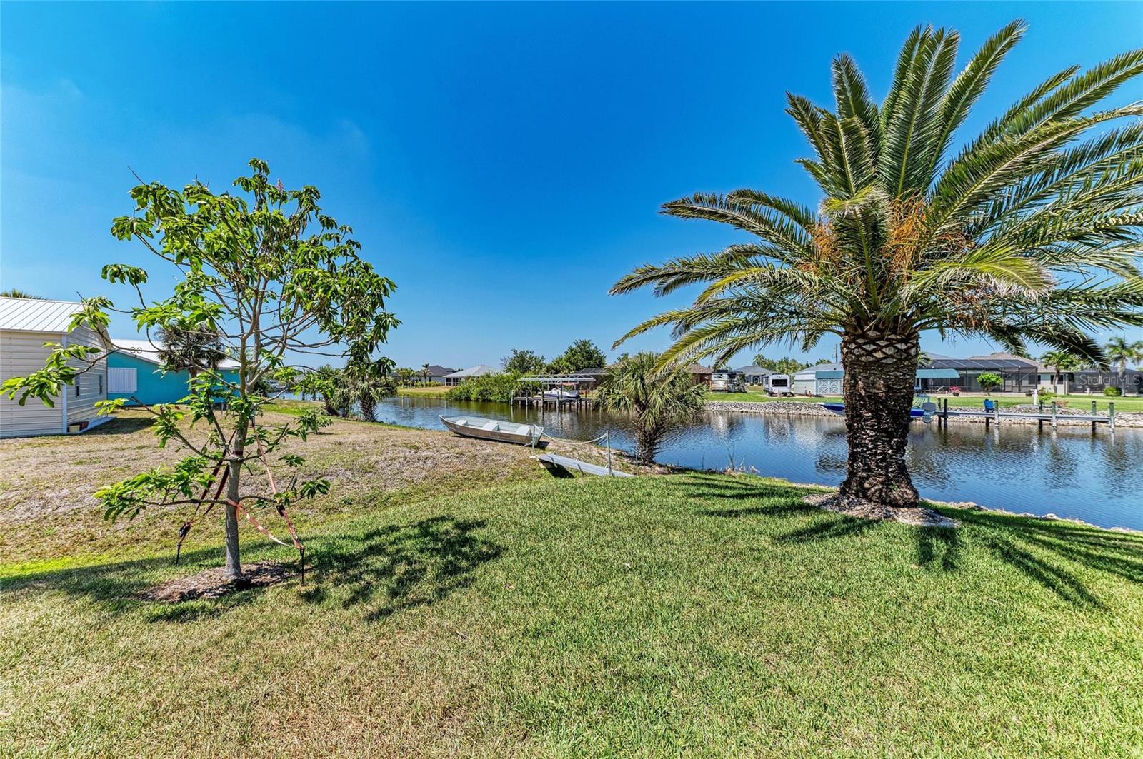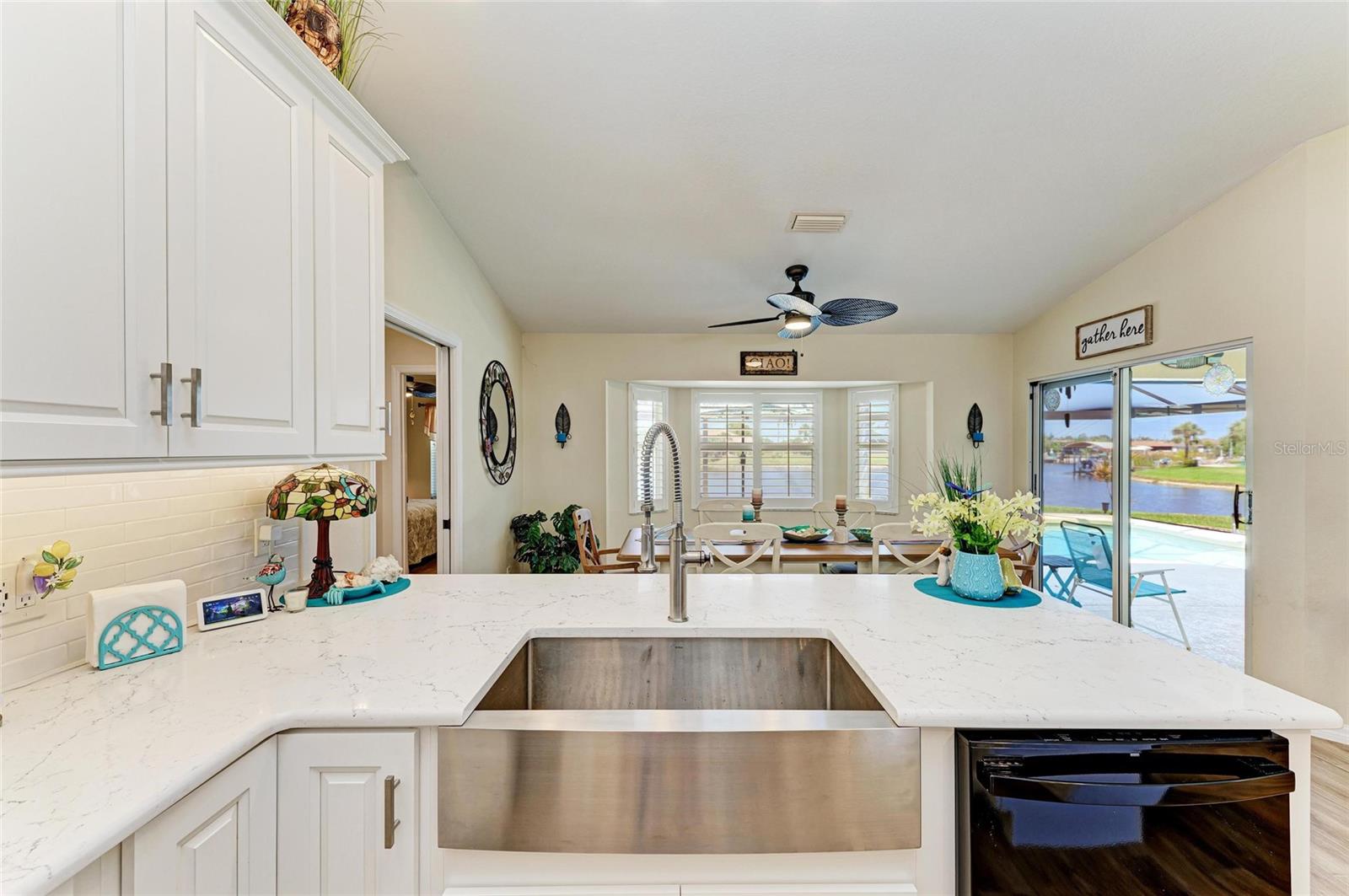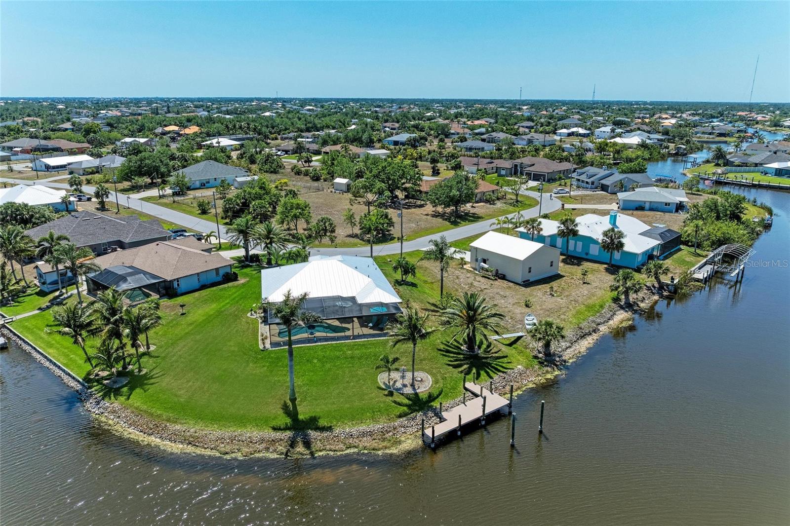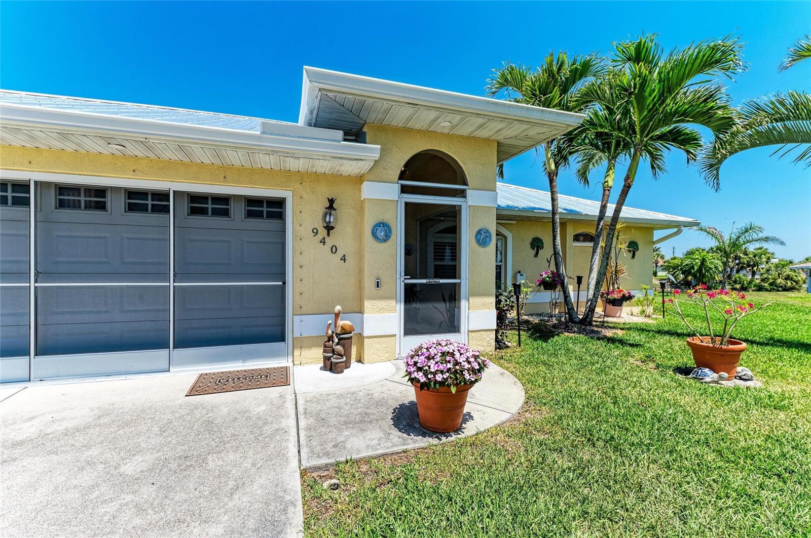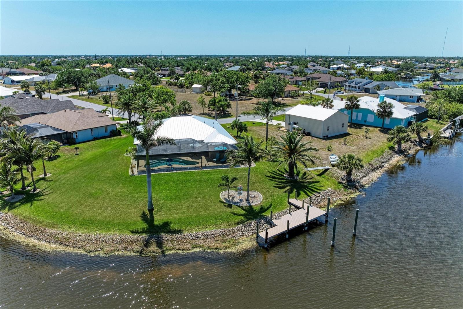 This stunning waterfront home boasts an impressive 168 (appx.) feet of serene water frontage, offering unobstructed, panoramic views and a peaceful ambiance. Designed with both durability and charm in mind, the home features a sleek metal roof and gutters, providing long-lasting protection and a clean, modern aesthetic. Recently redesigned with a fresh, modern touch, this beautiful home showcases porcelain tile throughout, and an open floor plan that seamlessly connects the living room, dinette area, and kitchen beneath a striking vaulted ceiling, creating an airy and expansive feel. The living room is adorned with classic plantation shutters and features large pocket sliders that open fully to the lanai, blending indoor and outdoor living with ease. The kitchen boasts rich wood cabinetry, quartz countertops, a charming farmhouse sink, and all appliances, making both everyday cooking and entertaining a breeze. Just off the kitchen, a cozy dinette with its own set of sliders to the lanai offers the perfect spot for casual dining or morning coffee with a stunning view. The inviting screened entrance creates a welcoming first impression, and the carefully designed curbing around the lush vegetation beds adds a polished touch to the mature tropical landscaping including palms and fruit-bearing mango, guava, and avocado trees is sustained by a 5-zone irrigation system. Additional thoughtful touches like the screened garage door allow for comfortable airflow while maintaining privacy and functionality. The primary bedroom includes pocket sliders that open directly to the lanai, his-and-her closets, and an ensuite bath with quartz topped vanity, creating a private retreat. Two guest bedrooms share the second bath which also has a wood vanity with quartz countertop and single bowl sink, perfect for family or visitors. The expansive lanai and pool deck area surround a heated saltwater pool featuring a sunshelf, beachfront-style entrance, and an outdoor shower--all enclosed by a panoramic screen that provides breathtaking, unobstructed water views. The property is enhanced by a 33 x 7 ft. composite dock equipped with water and electricity, riprap shoreline protection, and irrigation capabilities drawn from the canal. This property is a must see with its stunning waterfront views. You will love its perfect blend of style, comfort, and waterfront living while combining thoughtful design with modern living.