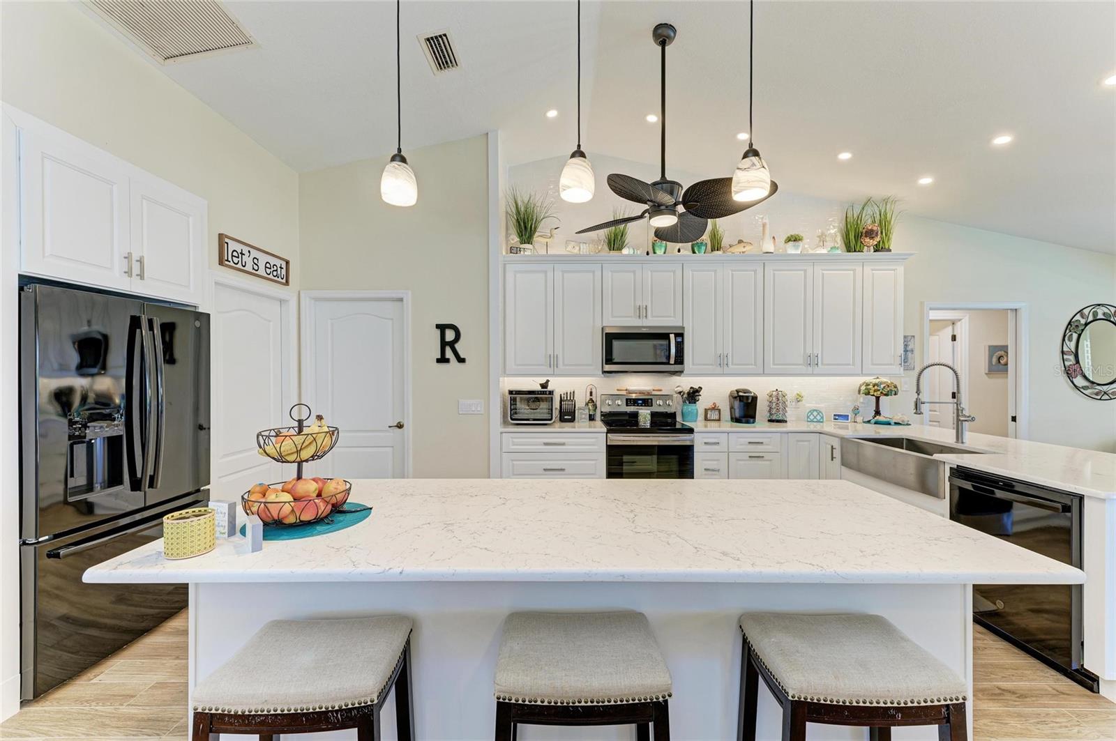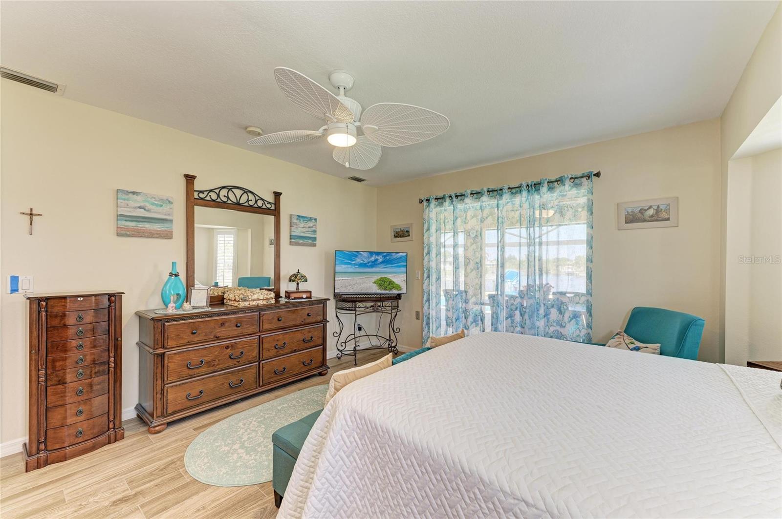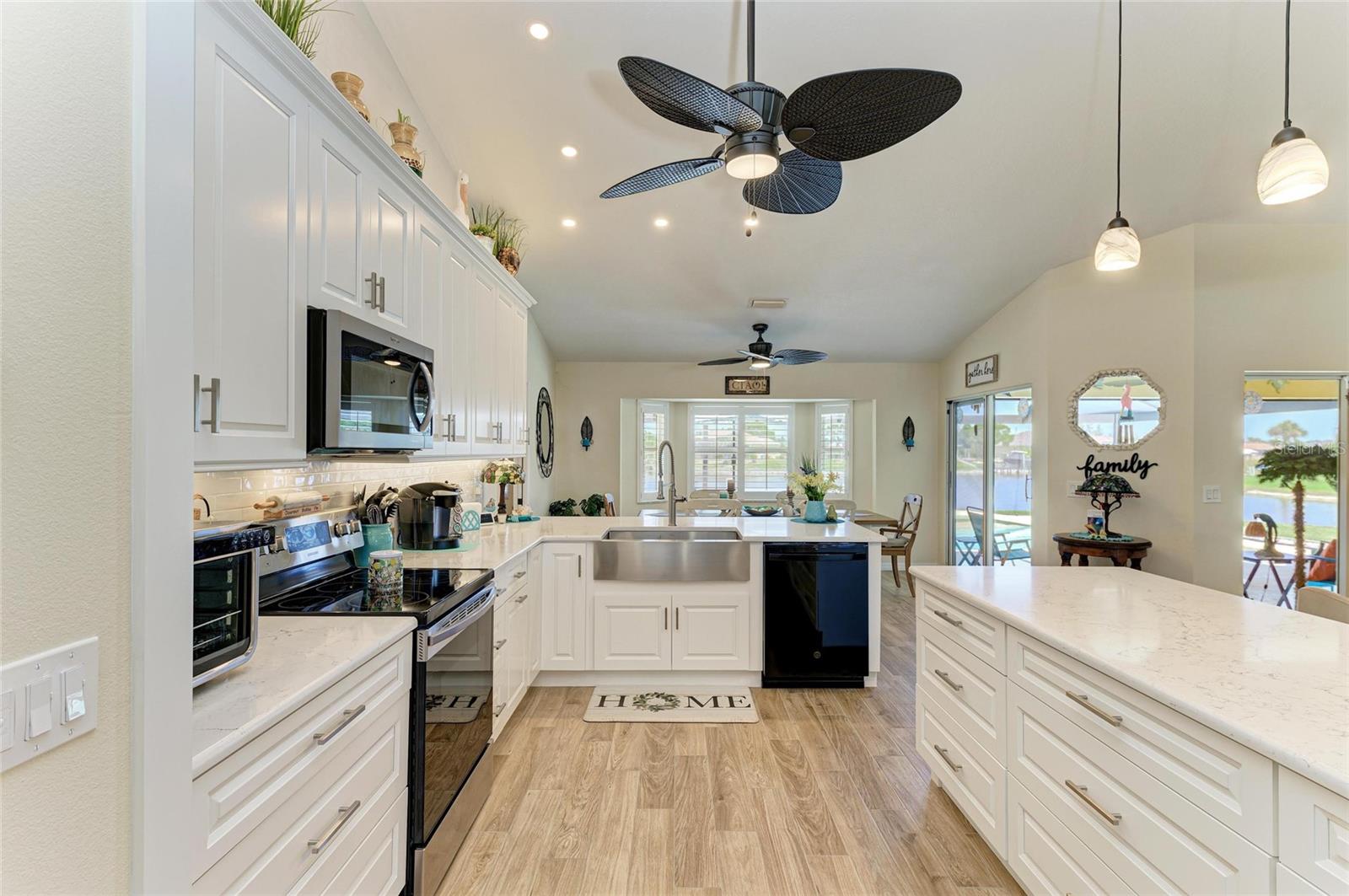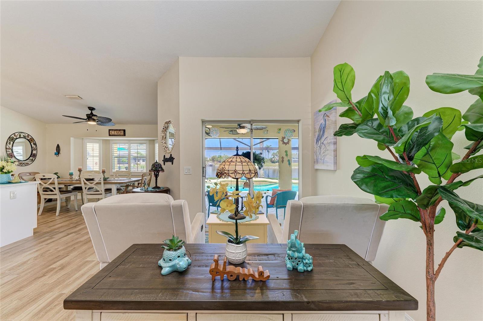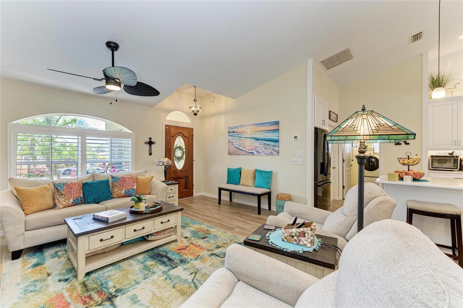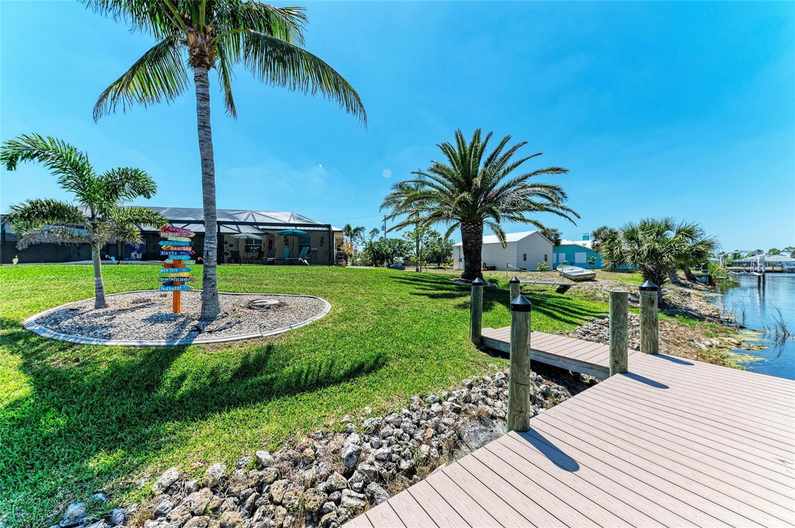This stunning waterfront home boasts an impressive 168 (appx.) feet of serene water frontage, offering unobstructed, panoramic views and a peaceful ambiance. Designed with both durability and charm in mind, the home features a sleek metal roof and gutters, providing long-lasting protection and a clean, modern aesthetic. Recently redesigned with a fresh, modern touch, this beautiful home showcases porcelain tile throughout, and an open floor plan that seamlessly connects the living room, dinette area, and kitchen beneath a striking vaulted ceiling, creating an airy and expansive feel. The living room is adorned with classic plantation shutters and features large pocket sliders that open fully to the lanai, blending indoor and outdoor living with ease. The kitchen boasts rich wood cabinetry, quartz countertops, a charming farmhouse sink, and all appliances, making both everyday cooking and entertaining a breeze. Just off the kitchen, a cozy dinette with its own set of sliders to the lanai offers the perfect spot for casual dining or morning coffee with a stunning view. The inviting screened entrance creates a welcoming first impression, and the carefully designed curbing around the lush vegetation beds adds a polished touch to the mature tropical landscaping including palms and fruit-bearing mango, guava, and avocado trees is sustained by a 5-zone irrigation system. Additional thoughtful touches like the screened garage door allow for comfortable airflow while maintaining privacy and functionality. The primary bedroom includes pocket sliders that open directly to the lanai, his-and-her closets, and an ensuite bath with quartz topped vanity, creating a private retreat. Two guest bedrooms share the second bath which also has a wood vanity with quartz countertop and single bowl sink, perfect for family or visitors. The expansive lanai and pool deck area surround a heated saltwater pool featuring a sunshelf, beachfront-style entrance, and an outdoor shower--all enclosed by a panoramic screen that provides breathtaking, unobstructed water views. The property is enhanced by a 33 x 7 ft. composite dock equipped with water and electricity, riprap shoreline protection, and irrigation capabilities drawn from the canal. This property is a must see with its stunning waterfront views. You will love its perfect blend of style, comfort, and waterfront living while combining thoughtful design with modern living.