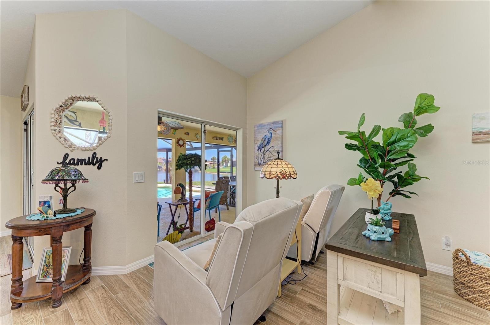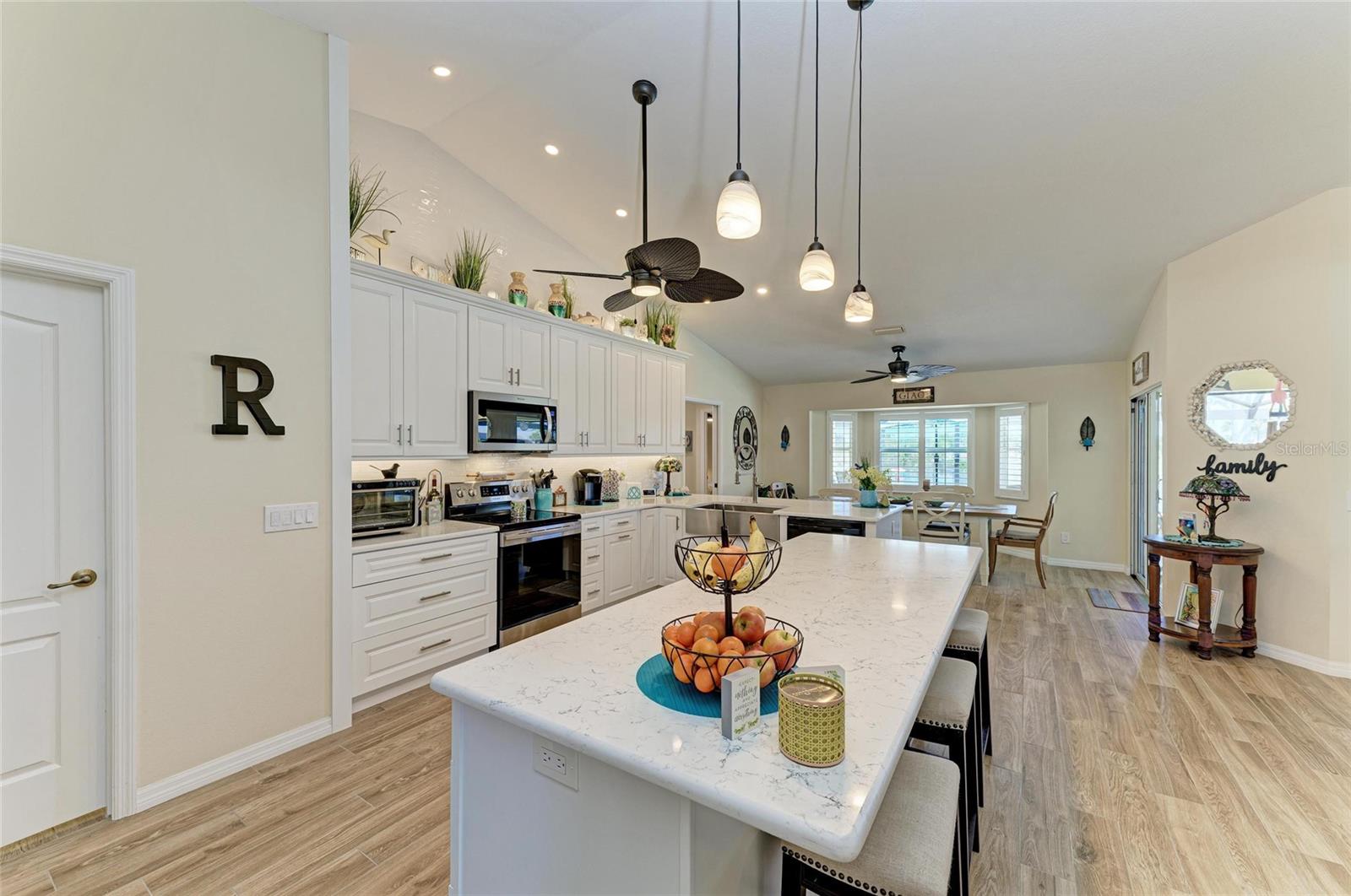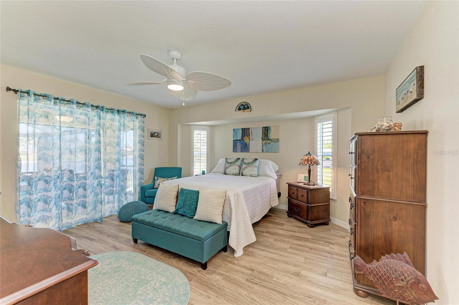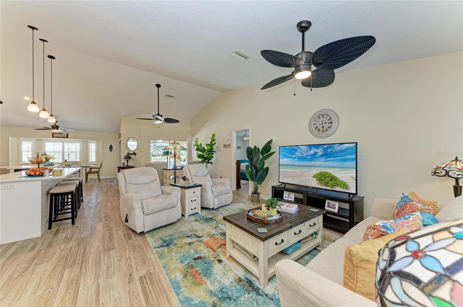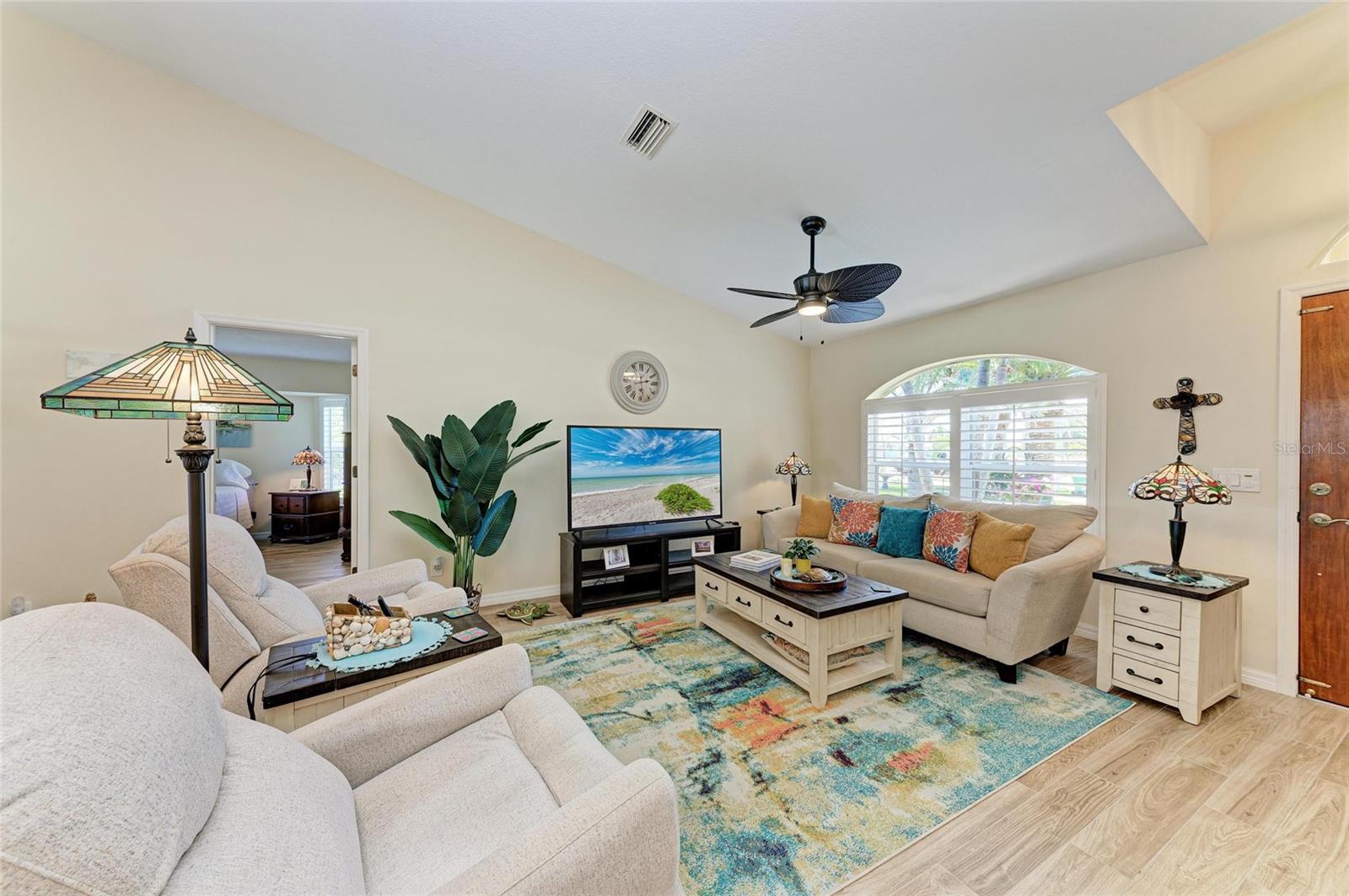 This stunning waterfront home boasts an impressive 168 (appx.) feet of serene water frontage, offering unobstructed, panoramic views and a peaceful ambiance. Designed with both durability and charm in mind, the home features a sleek metal roof and gutters, providing long-lasting protection and a clean, modern aesthetic. Recently redesigned with a fresh, modern touch, this beautiful home showcases porcelain tile throughout, and an open floor plan that seamlessly connects the living room, dinette area, and kitchen beneath a striking vaulted ceiling, creating an airy and expansive feel. The living room is adorned with classic plantation shutters and features large pocket sliders that open fully to the lanai, blending indoor and outdoor living with ease. The kitchen boasts rich wood cabinetry, quartz countertops, a charming farmhouse sink, and all appliances, making both everyday cooking and entertaining a breeze. Just off the kitchen, a cozy dinette with its own set of sliders to the lanai offers the perfect spot for casual dining or morning coffee with a stunning view. The inviting screened entrance creates a welcoming first impression, and the carefully designed curbing around the lush vegetation beds adds a polished touch to the mature tropical landscaping including palms and fruit-bearing mango, guava, and avocado trees is sustained by a 5-zone irrigation system. Additional thoughtful touches like the screened garage door allow for comfortable airflow while maintaining privacy and functionality. The primary bedroom includes pocket sliders that open directly to the lanai, his-and-her closets, and an ensuite bath with quartz topped vanity, creating a private retreat. Two guest bedrooms share the second bath which also has a wood vanity with quartz countertop and single bowl sink, perfect for family or visitors. The expansive lanai and pool deck area surround a heated saltwater pool featuring a sunshelf, beachfront-style entrance, and an outdoor shower--all enclosed by a panoramic screen that provides breathtaking, unobstructed water views. The property is enhanced by a 33 x 7 ft. composite dock equipped with water and electricity, riprap shoreline protection, and irrigation capabilities drawn from the canal. This property is a must see with its stunning waterfront views. You will love its perfect blend of style, comfort, and waterfront living while combining thoughtful design with modern living.
