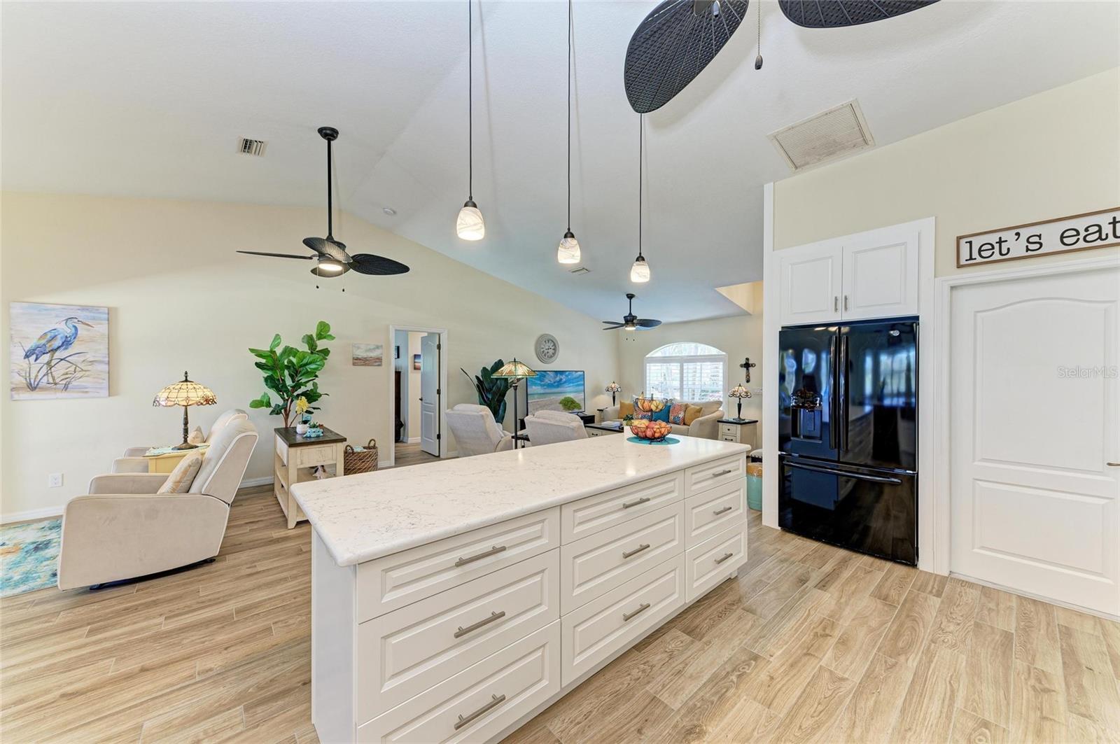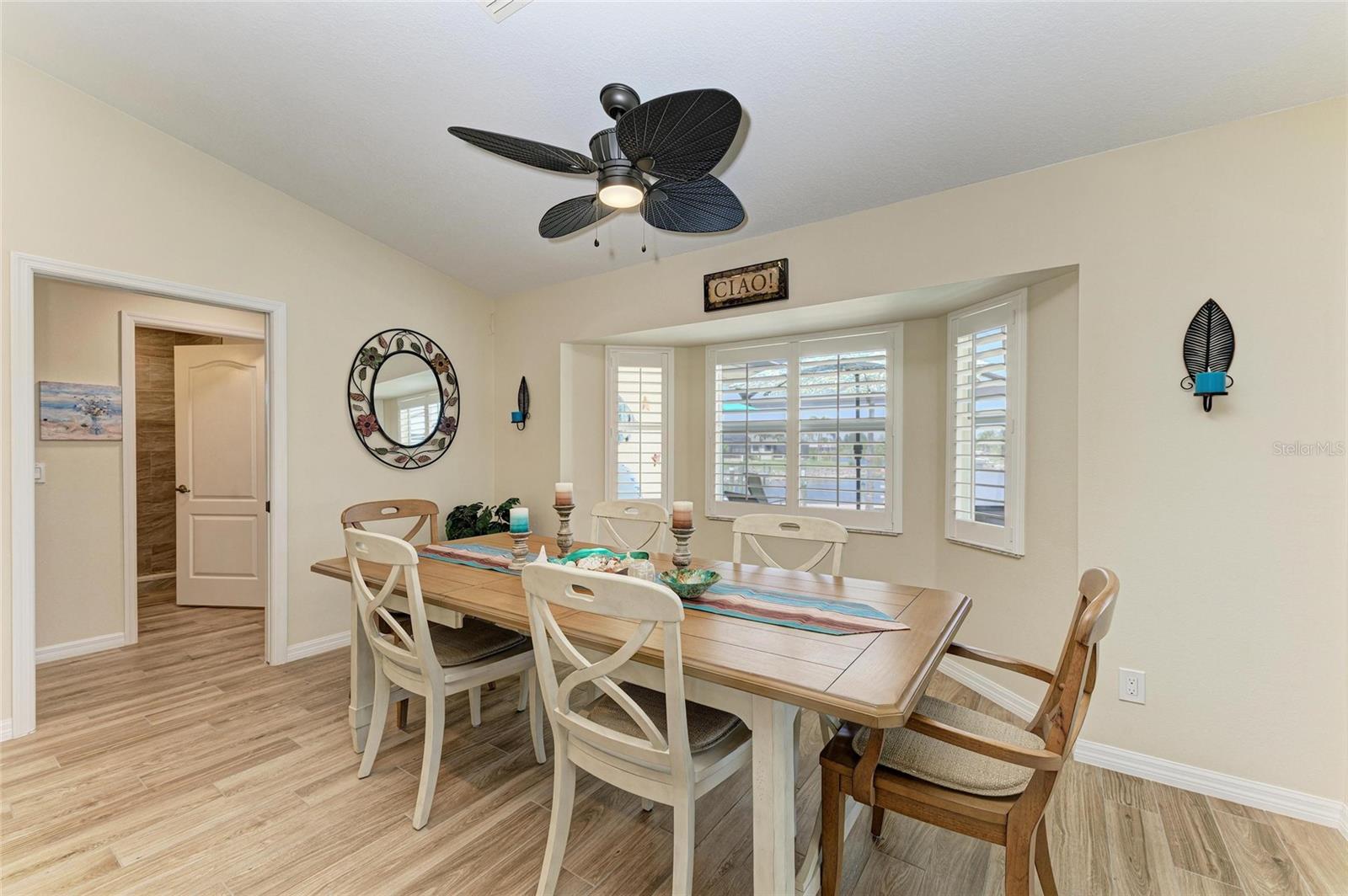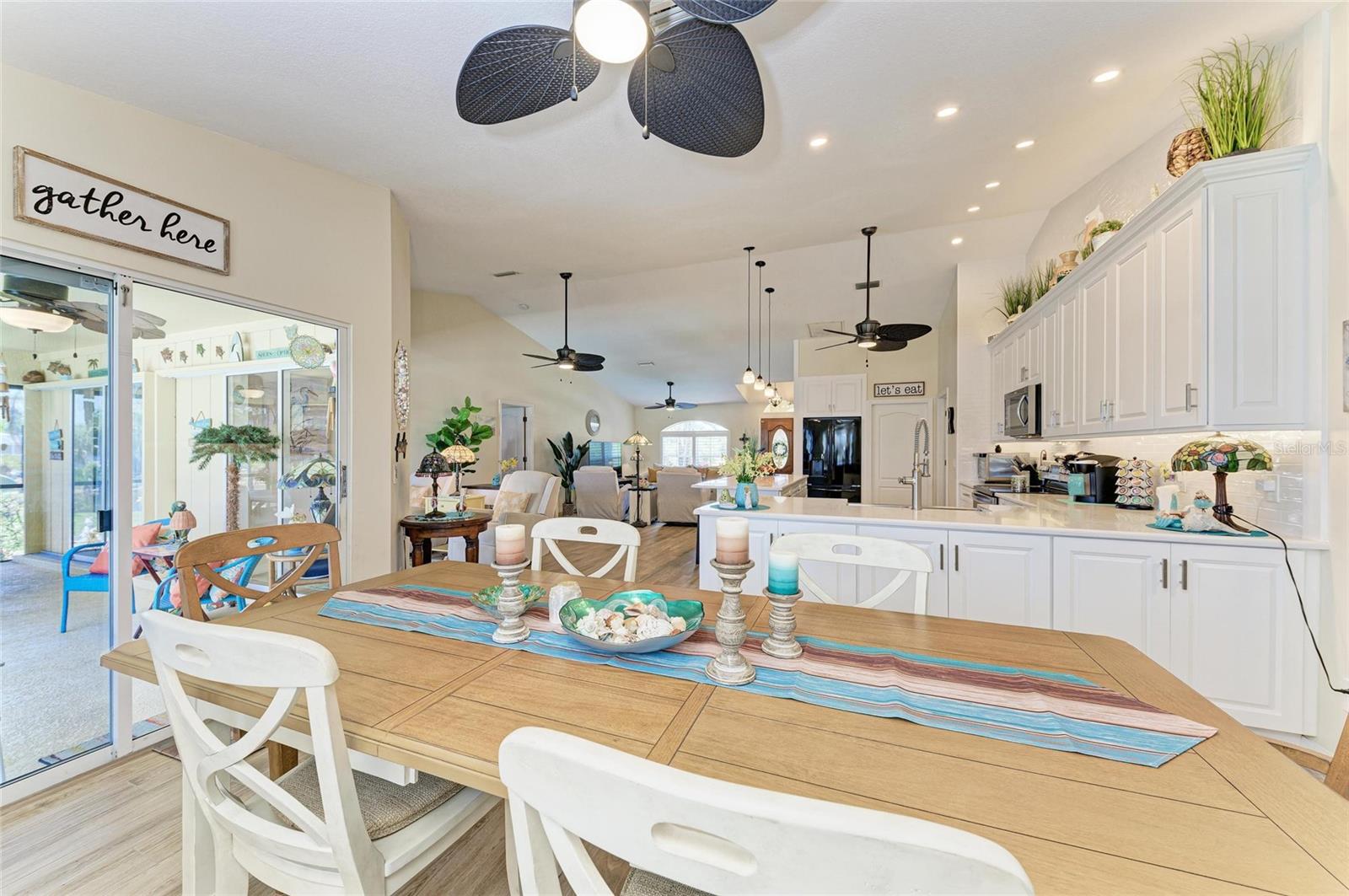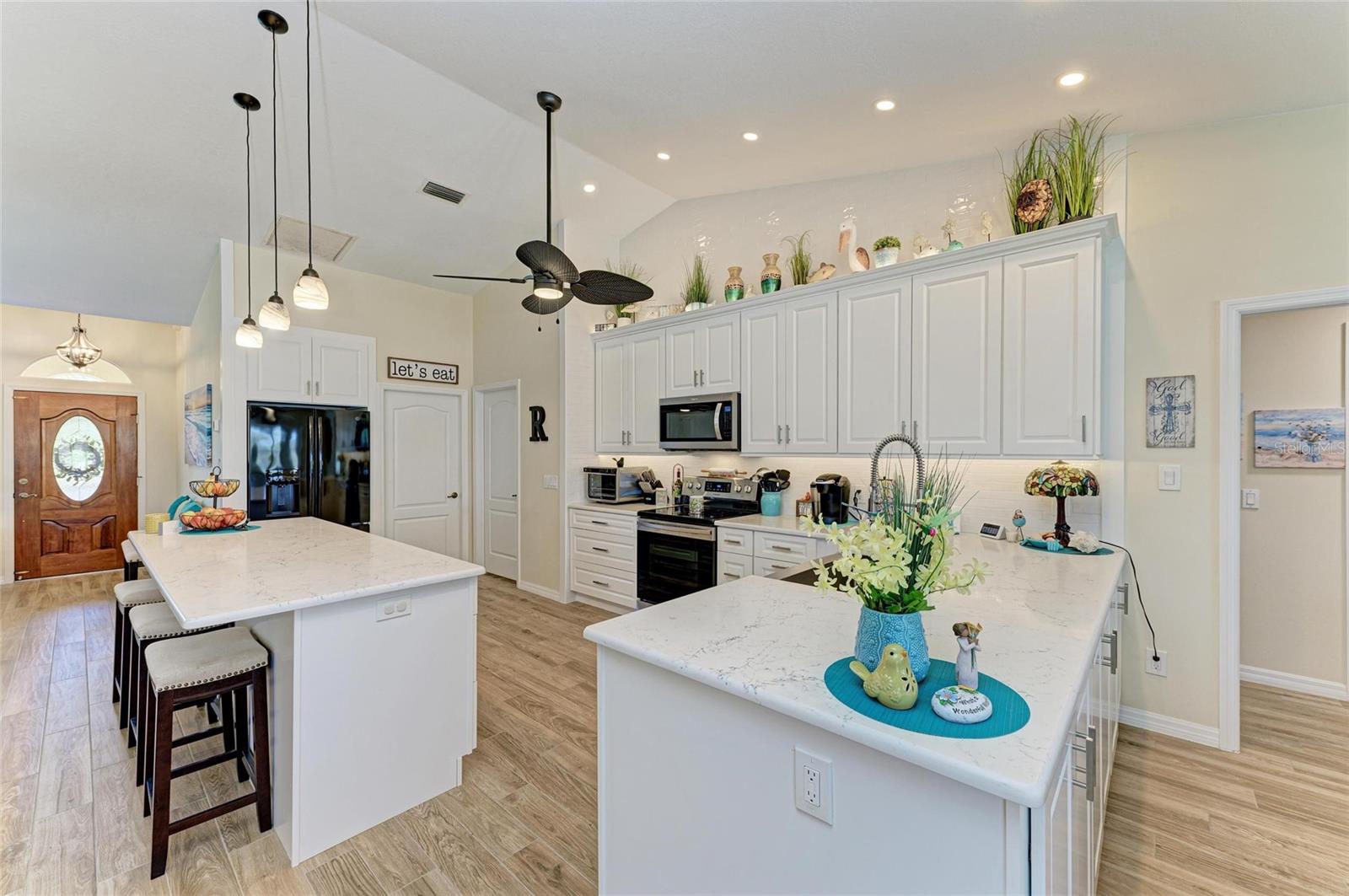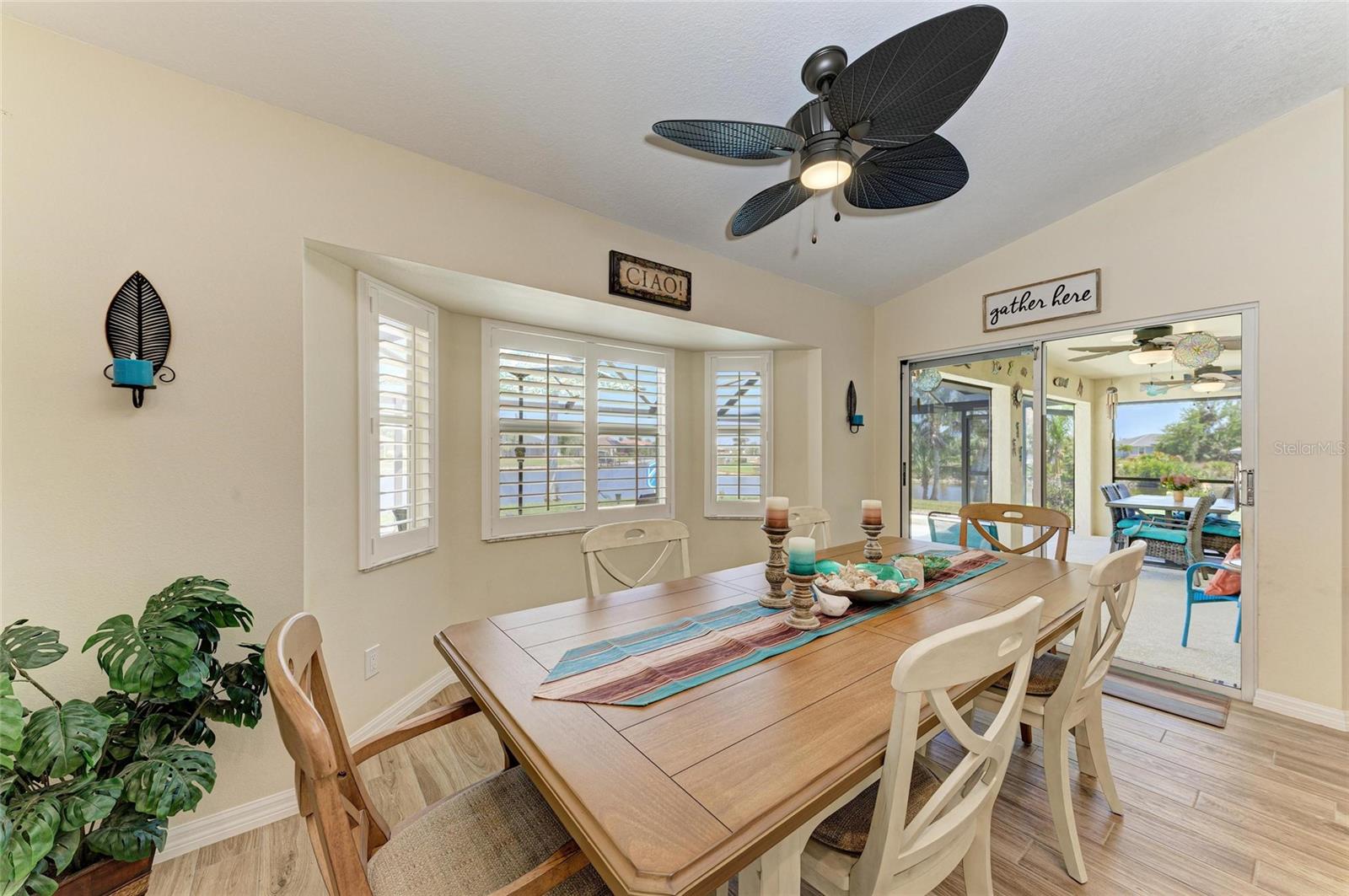 This stunning waterfront home boasts an impressive 168 (appx.) feet of serene water frontage, offering unobstructed, panoramic views and a peaceful ambiance. Designed with both durability and charm in mind, the home features a sleek metal roof and gutters, providing long-lasting protection and a clean, modern aesthetic. Recently redesigned with a fresh, modern touch, this beautiful home showcases porcelain tile throughout, and an open floor plan that seamlessly connects the living room, dinette area, and kitchen beneath a striking vaulted ceiling, creating an airy and expansive feel. The living room is adorned with classic plantation shutters and features large pocket sliders that open fully to the lanai, blending indoor and outdoor living with ease. The kitchen boasts rich wood cabinetry, quartz countertops, a charming farmhouse sink, and all appliances, making both everyday cooking and entertaining a breeze. Just off the kitchen, a cozy dinette with its own set of sliders to the lanai offers the perfect spot for casual dining or morning coffee with a stunning view. The inviting screened entrance creates a welcoming first impression, and the carefully designed curbing around the lush vegetation beds adds a polished touch to the mature tropical landscaping including palms and fruit-bearing mango, guava, and avocado trees is sustained by a 5-zone irrigation system. Additional thoughtful touches like the screened garage door allow for comfortable airflow while maintaining privacy and functionality. The primary bedroom includes pocket sliders that open directly to the lanai, his-and-her closets, and an ensuite bath with quartz topped vanity, creating a private retreat. Two guest bedrooms share the second bath which also has a wood vanity with quartz countertop and single bowl sink, perfect for family or visitors. The expansive lanai and pool deck area surround a heated saltwater pool featuring a sunshelf, beachfront-style entrance, and an outdoor shower--all enclosed by a panoramic screen that provides breathtaking, unobstructed water views. The property is enhanced by a 33 x 7 ft. composite dock equipped with water and electricity, riprap shoreline protection, and irrigation capabilities drawn from the canal. This property is a must see with its stunning waterfront views. You will love its perfect blend of style, comfort, and waterfront living while combining thoughtful design with modern living.