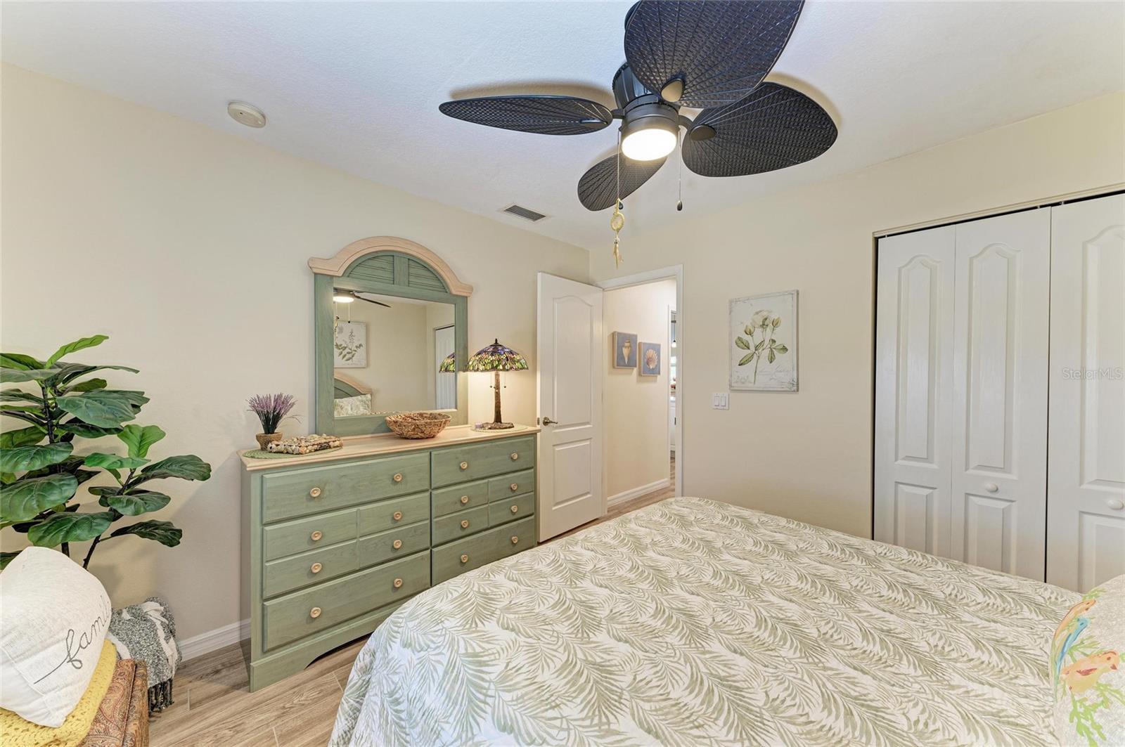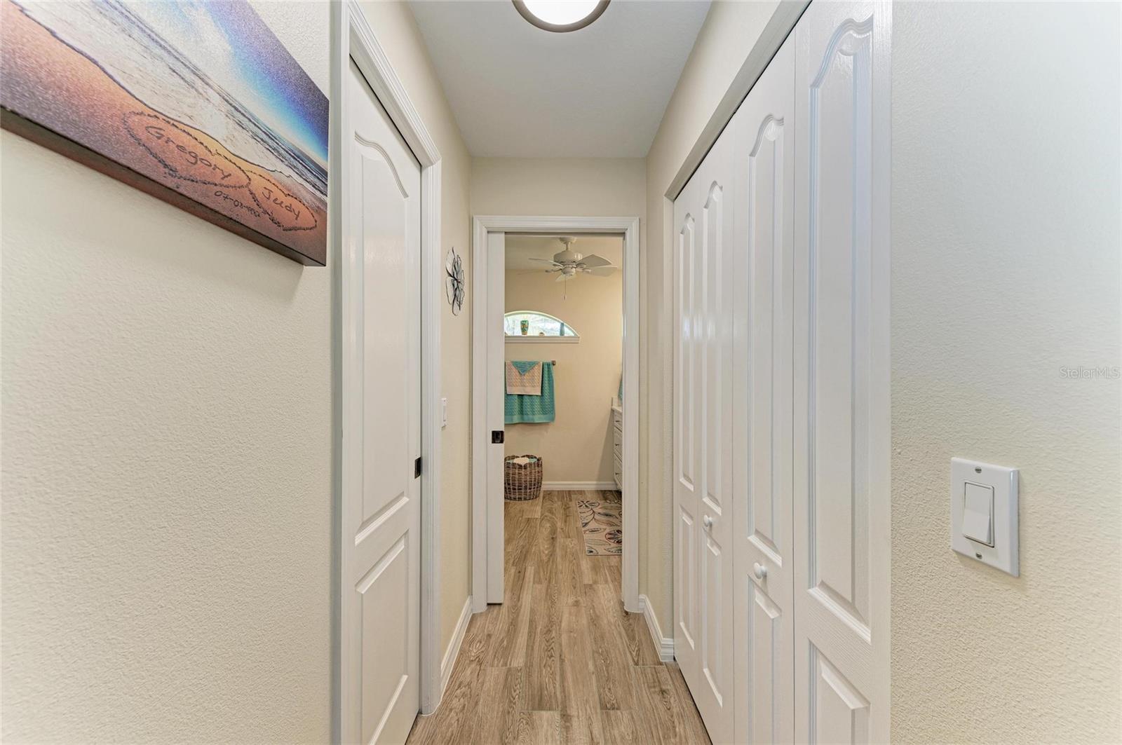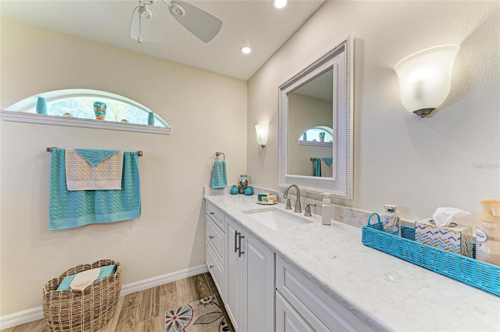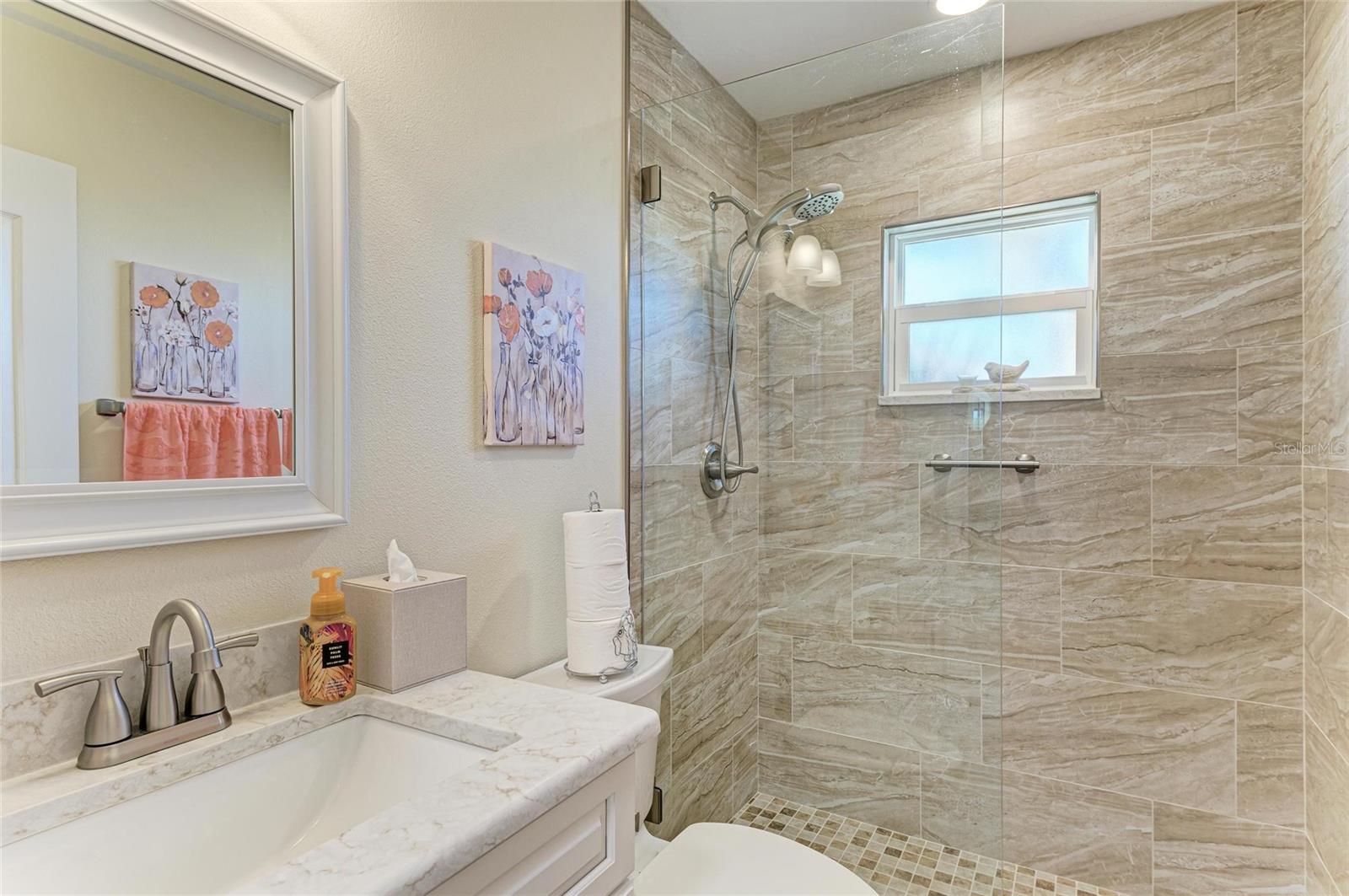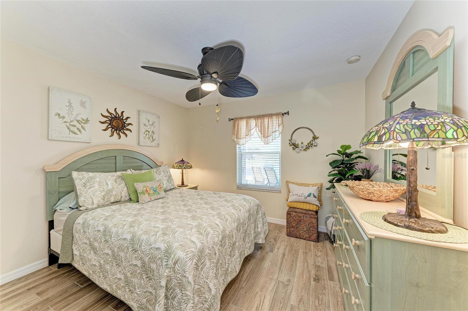 This stunning waterfront home boasts an impressive 168 (appx.) feet of serene water frontage, offering unobstructed, panoramic views and a peaceful ambiance. Designed with both durability and charm in mind, the home features a sleek metal roof and gutters, providing long-lasting protection and a clean, modern aesthetic. Recently redesigned with a fresh, modern touch, this beautiful home showcases porcelain tile throughout, and an open floor plan that seamlessly connects the living room, dinette area, and kitchen beneath a striking vaulted ceiling, creating an airy and expansive feel. The living room is adorned with classic plantation shutters and features large pocket sliders that open fully to the lanai, blending indoor and outdoor living with ease. The kitchen boasts rich wood cabinetry, quartz countertops, a charming farmhouse sink, and all appliances, making both everyday cooking and entertaining a breeze. Just off the kitchen, a cozy dinette with its own set of sliders to the lanai offers the perfect spot for casual dining or morning coffee with a stunning view. The inviting screened entrance creates a welcoming first impression, and the carefully designed curbing around the lush vegetation beds adds a polished touch to the mature tropical landscaping including palms and fruit-bearing mango, guava, and avocado trees is sustained by a 5-zone irrigation system. Additional thoughtful touches like the screened garage door allow for comfortable airflow while maintaining privacy and functionality. The primary bedroom includes pocket sliders that open directly to the lanai, his-and-her closets, and an ensuite bath with quartz topped vanity, creating a private retreat. Two guest bedrooms share the second bath which also has a wood vanity with quartz countertop and single bowl sink, perfect for family or visitors. The expansive lanai and pool deck area surround a heated saltwater pool featuring a sunshelf, beachfront-style entrance, and an outdoor shower--all enclosed by a panoramic screen that provides breathtaking, unobstructed water views. The property is enhanced by a 33 x 7 ft. composite dock equipped with water and electricity, riprap shoreline protection, and irrigation capabilities drawn from the canal. This property is a must see with its stunning waterfront views. You will love its perfect blend of style, comfort, and waterfront living while combining thoughtful design with modern living.