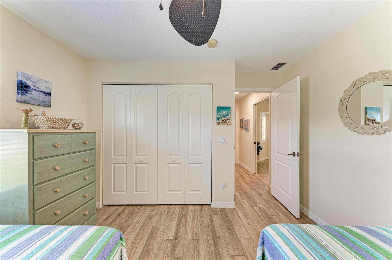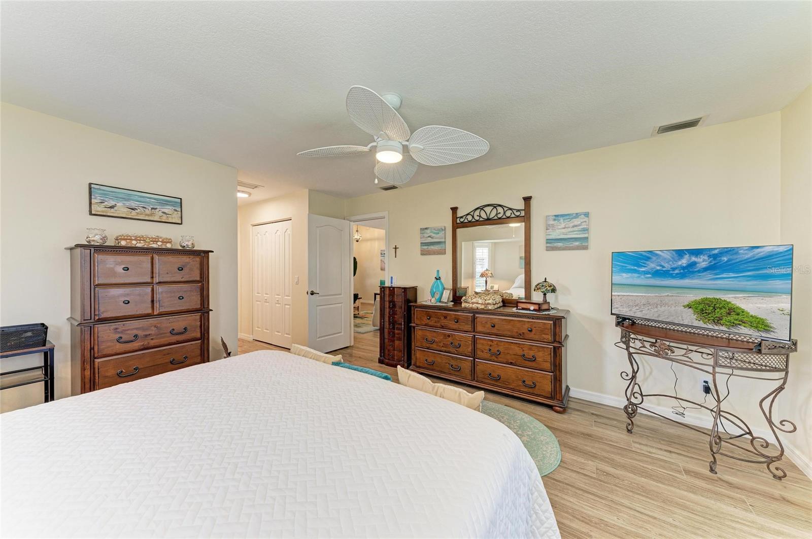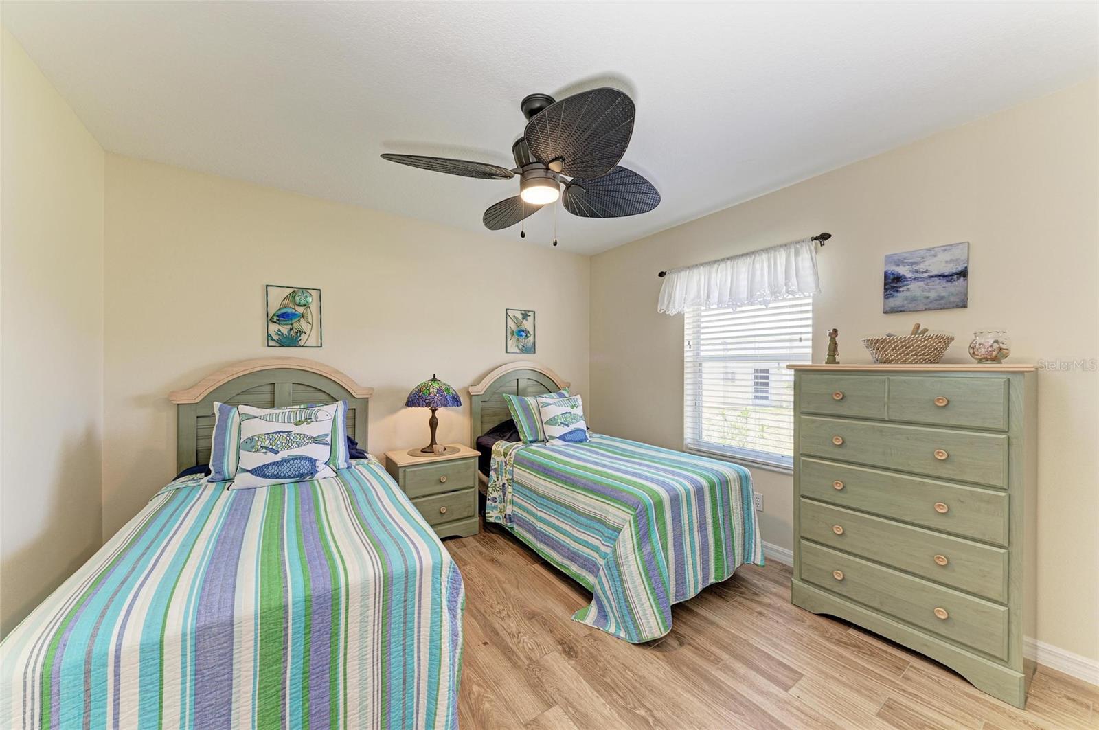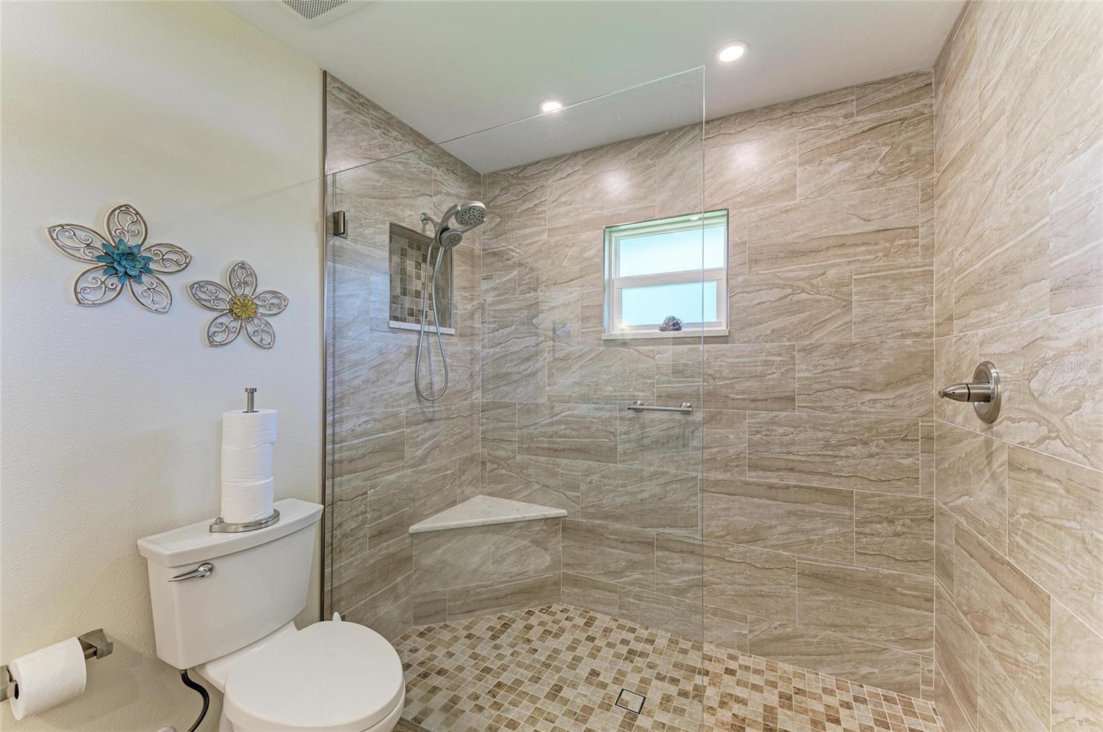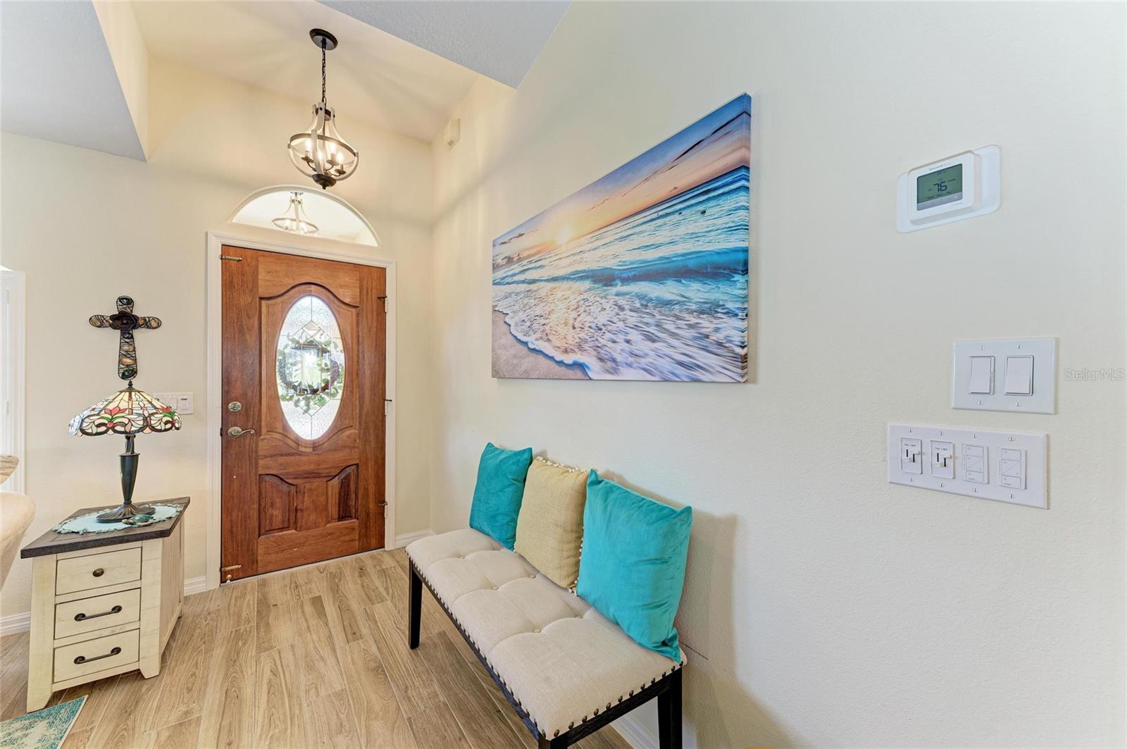 This stunning waterfront home boasts an impressive 168 (appx.) feet of serene water frontage, offering unobstructed, panoramic views and a peaceful ambiance. Designed with both durability and charm in mind, the home features a sleek metal roof and gutters, providing long-lasting protection and a clean, modern aesthetic. Recently redesigned with a fresh, modern touch, this beautiful home showcases porcelain tile throughout, and an open floor plan that seamlessly connects the living room, dinette area, and kitchen beneath a striking vaulted ceiling, creating an airy and expansive feel. The living room is adorned with classic plantation shutters and features large pocket sliders that open fully to the lanai, blending indoor and outdoor living with ease. The kitchen boasts rich wood cabinetry, quartz countertops, a charming farmhouse sink, and all appliances, making both everyday cooking and entertaining a breeze. Just off the kitchen, a cozy dinette with its own set of sliders to the lanai offers the perfect spot for casual dining or morning coffee with a stunning view. The inviting screened entrance creates a welcoming first impression, and the carefully designed curbing around the lush vegetation beds adds a polished touch to the mature tropical landscaping including palms and fruit-bearing mango, guava, and avocado trees is sustained by a 5-zone irrigation system. Additional thoughtful touches like the screened garage door allow for comfortable airflow while maintaining privacy and functionality. The primary bedroom includes pocket sliders that open directly to the lanai, his-and-her closets, and an ensuite bath with quartz topped vanity, creating a private retreat. Two guest bedrooms share the second bath which also has a wood vanity with quartz countertop and single bowl sink, perfect for family or visitors. The expansive lanai and pool deck area surround a heated saltwater pool featuring a sunshelf, beachfront-style entrance, and an outdoor shower--all enclosed by a panoramic screen that provides breathtaking, unobstructed water views. The property is enhanced by a 33 x 7 ft. composite dock equipped with water and electricity, riprap shoreline protection, and irrigation capabilities drawn from the canal. This property is a must see with its stunning waterfront views. You will love its perfect blend of style, comfort, and waterfront living while combining thoughtful design with modern living.