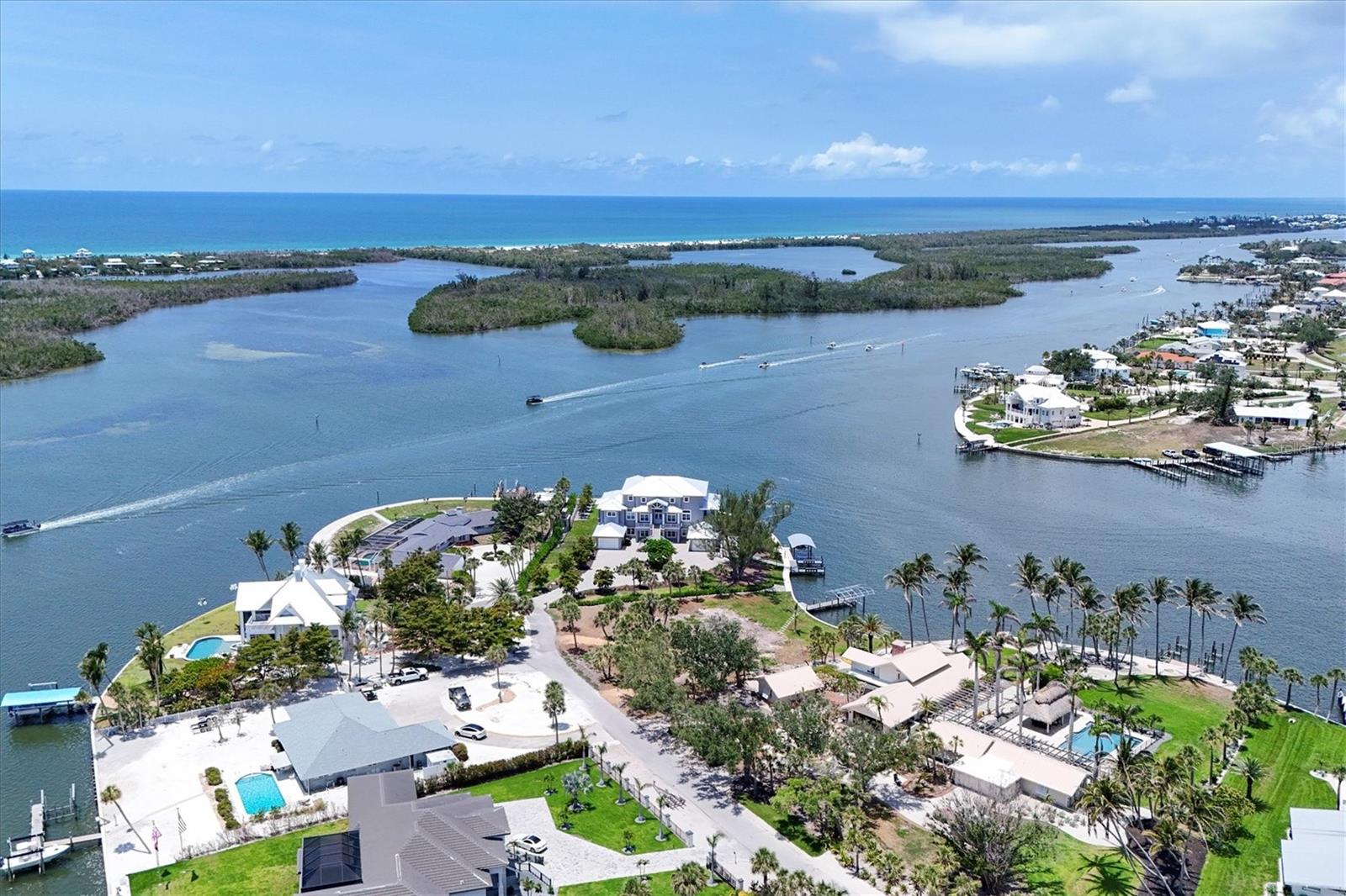 Magnificent 5 bedroom, 5 bath waterfront estate with over 5,300 sq.ft. in the historic neighborhood of Cape Haze offers mesmerizing panoramic views in every direction and superb boating access. Built in 2021 the home sits on maybe the most spectacular waterfront site in the area. The property is nearly a full acre and is surrounded by Pelican Bay and the Intracoastal Waterway with over 350 feet of seawall and excellent dockage. Less than a mile to the Gulf of Mexico and Charlotte Harbor, even bigger water is only minutes away. Drive down the long round-about driveway with stunning landscaping and towering mature trees, and gorgeous views of the bay and dockage before you park your car. Designed and built to highest coastal construction standards, the property is at home on the water. Heavy duty concrete piling and poured beam construction, impact storm windows and doors, metal roof and a 80KW Kohler generator with a 1,000 gallon propane tank. Entering the stunning home a grand 2 story great room with stunning beamed ceiling and a wall of 8 foot sliders and transom windows that brings the serene activity of the Intracoastal into the home. The large chef's kitchen has a giant island, Wolf range, custom wood cabinetry with endless storage. Just off the kitchen is an enormous laundry / pantry room with a folding island, large windows and tremendous cabinet space. Incredible outdoor living areas with a massive lanai with wood paneled ceiling off the main living room, terraces off of bedrooms and a giant patio around the stunning heated pool and spa, all affording spectacular water views. Gorgeous primary suite with a generous bedroom, large walk-in closet, and a comfortable sitting space for looking out bay windows at the waterway. The spa-like primary bath offers a large soaking tub, pebble tile flooring, expansive roman shower and dual vanities. The guest baths all have their own unique designs with custom tile work and wood cabinetry vanities. In addition to 5 bedrooms there's a large office/den that also affords incredible water views. Incredible nature and wildlife with multiple bird nests on the property, and dolphin and manatees frequently swimming around the shore. Prime boating location being at the southern end of Cape Haze, you're in world-class fishing waters of Charlotte Harbor or off shore waters of the Gulf of America in no time. Just minutes to historic Boca Grande, lots of shopping and fine dining, numerous private golf clubs, the Coral Creek Jetport, and miles of tranquil sandy beaches.