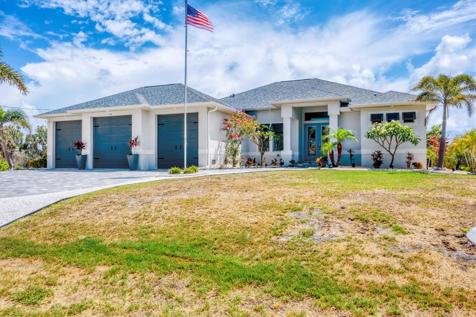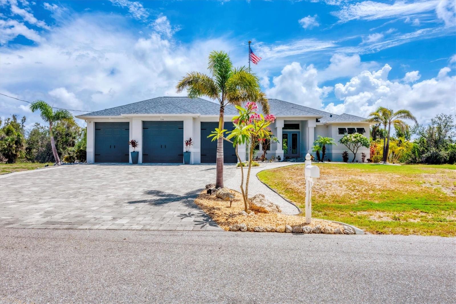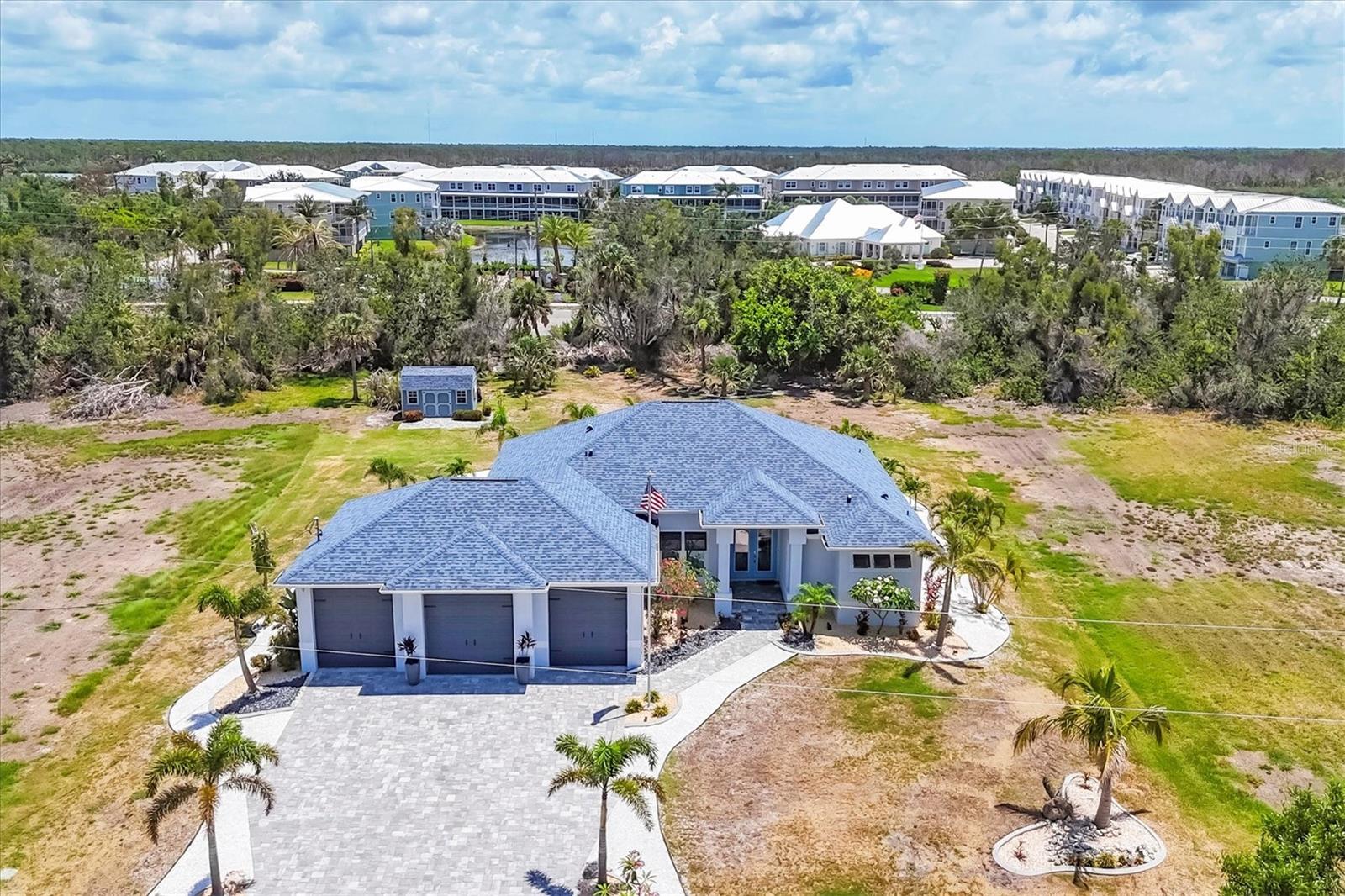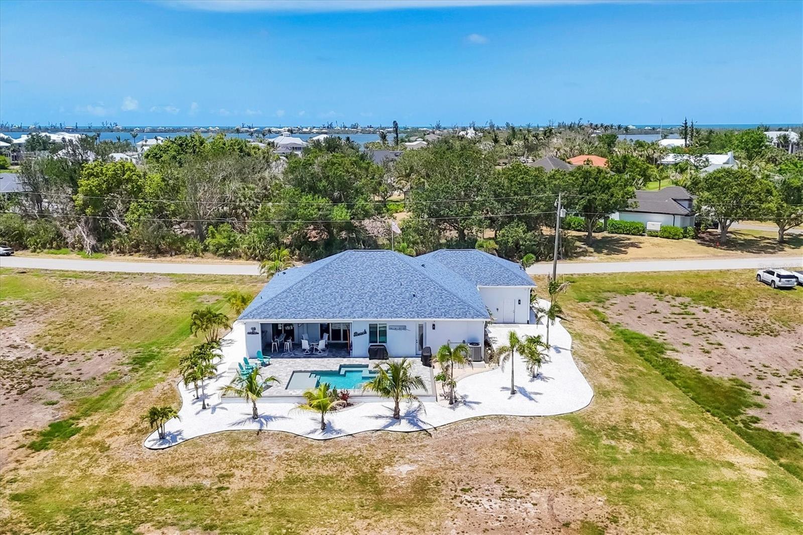 Built in 2019 this stunning 3 bed, plus den/study, 2 bath home sits on over half an acre of land, with a gorgeous heated pool and lanai and a car lover's dream 3 car garage. Located in the historic Vanderbilt developed neighborhood of Cape Haze with banyan lined streets, sidewalks to stroll to shopping and dining. Like all the homes in the neighborhood the house sits nicely back from the street, with a wide paver driveway and walkway up to the front door. Tall ceilings, large open kitchen and great room, custom wood cabinetry, stone counter tops, designer tile backsplash, high end appliances, plank tile flooring throughout, 8-foot zero corner sliding glass doors to the lanai, a full roll down screen and an outdoor kitchen on the lanai. Expansive paver lanai, beautifully designed pool with a sun shelf and in-pool seating. An incredible jumbo size 3 car garage with oversized stall doors, with two doors that are 9' wide by 10' tall and one 10'x10' middle door. Extra deep and tall ceilings, perfect for car lifts, storing boats, a workshop, and tremendous storage space. The home also comes with a very handy 10'x16' shed, perfect for even more storage. Cape Haze is a special waterfront community with membership in the Cape Haze POA there is usage of a dock and private beach on Don Pedro Island. A phenomenal location, Cape Haze is close to three full service marinas, numerous public and private golf courses, historic Boca Grande, miles of pristine sandy beaches and world-class fishing and boating.