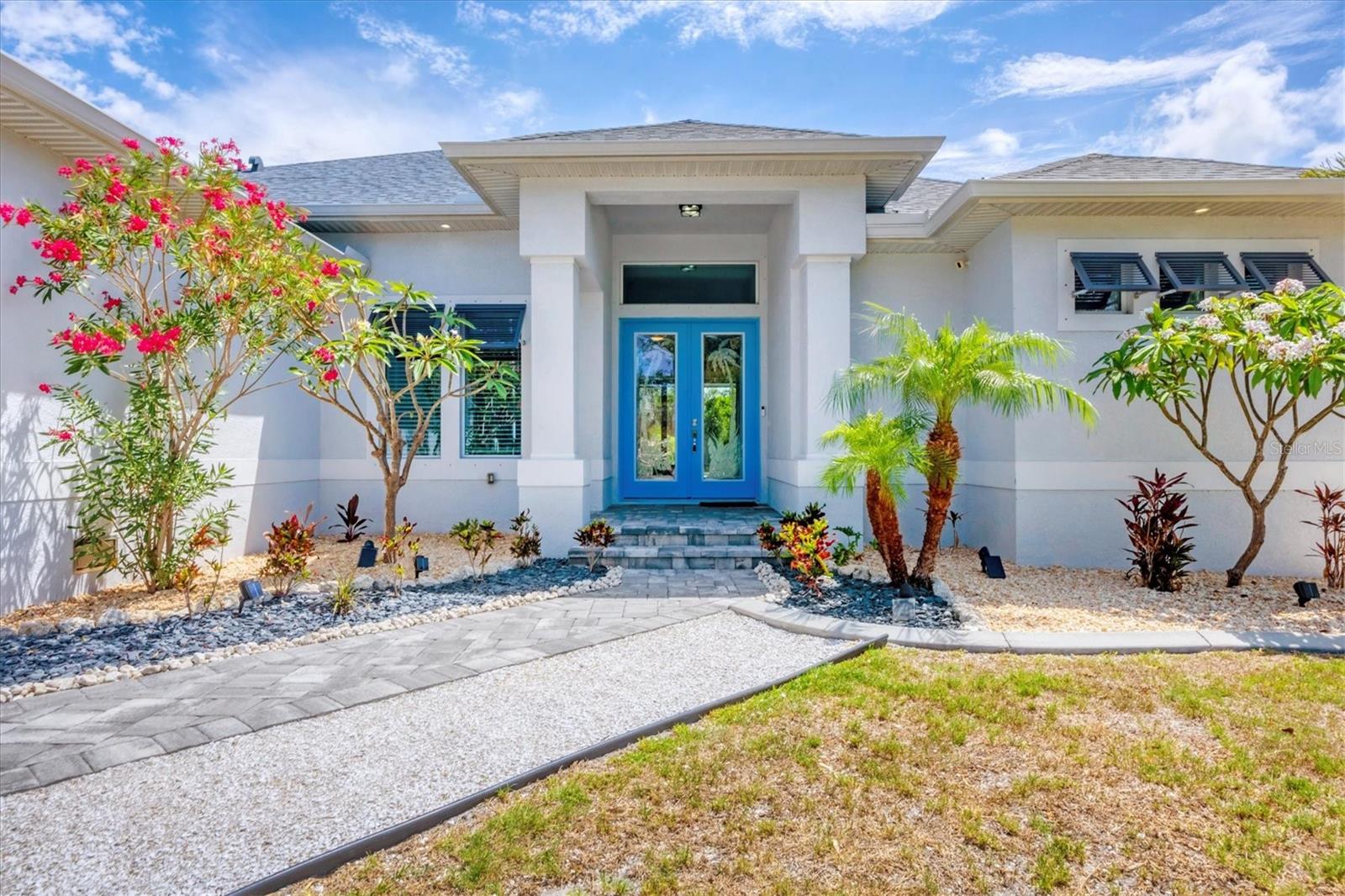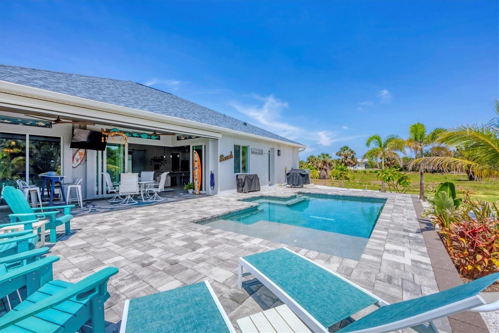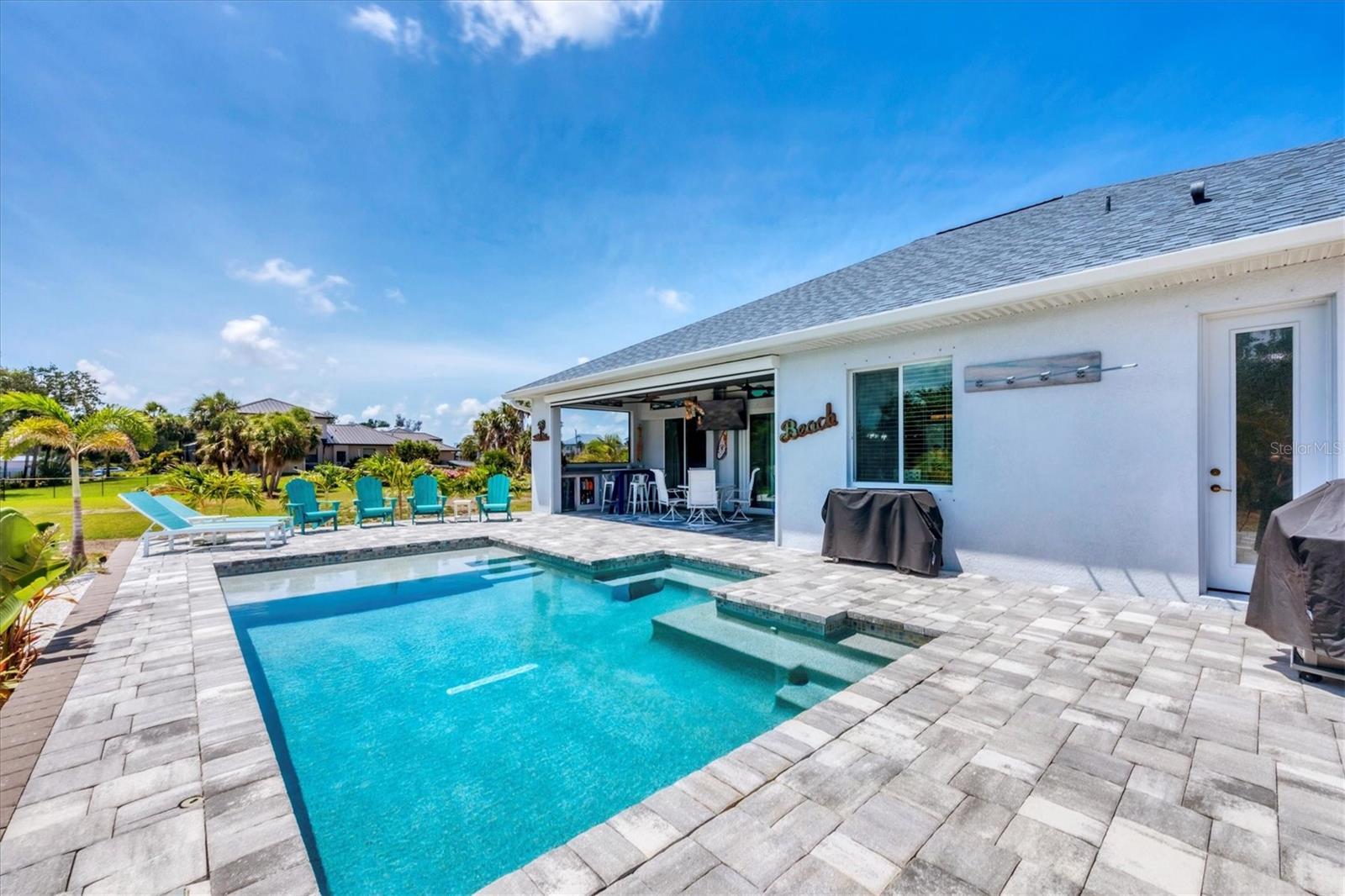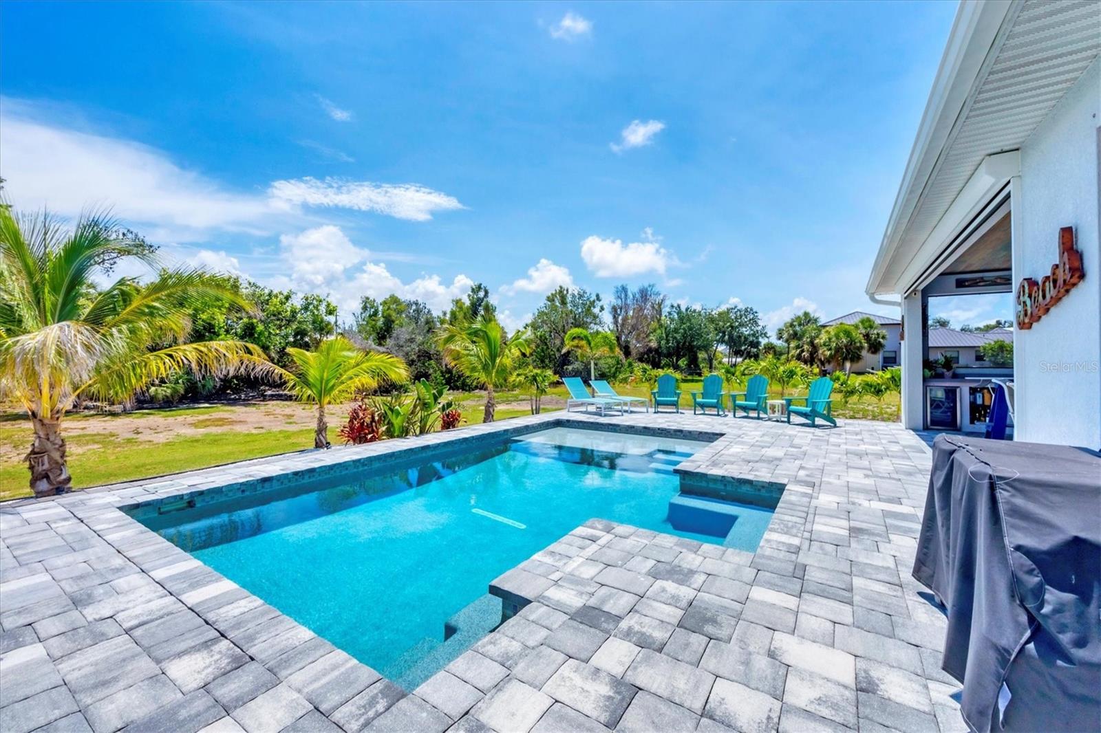 Built in 2019 this stunning 3 bed, plus den/study, 2 bath home sits on over half an acre of land, with a gorgeous heated pool and lanai and a car lover's dream 3 car garage. Located in the historic Vanderbilt developed neighborhood of Cape Haze with banyan lined streets, sidewalks to stroll to shopping and dining. Like all the homes in the neighborhood the house sits nicely back from the street, with a wide paver driveway and walkway up to the front door. Tall ceilings, large open kitchen and great room, custom wood cabinetry, stone counter tops, designer tile backsplash, high end appliances, plank tile flooring throughout, 8-foot zero corner sliding glass doors to the lanai, a full roll down screen and an outdoor kitchen on the lanai. Expansive paver lanai, beautifully designed pool with a sun shelf and in-pool seating. An incredible jumbo size 3 car garage with oversized stall doors, with two doors that are 9' wide by 10' tall and one 10'x10' middle door. Extra deep and tall ceilings, perfect for car lifts, storing boats, a workshop, and tremendous storage space. The home also comes with a very handy 10'x16' shed, perfect for even more storage. Cape Haze is a special waterfront community with membership in the Cape Haze POA there is usage of a dock and private beach on Don Pedro Island. A phenomenal location, Cape Haze is close to three full service marinas, numerous public and private golf courses, historic Boca Grande, miles of pristine sandy beaches and world-class fishing and boating.