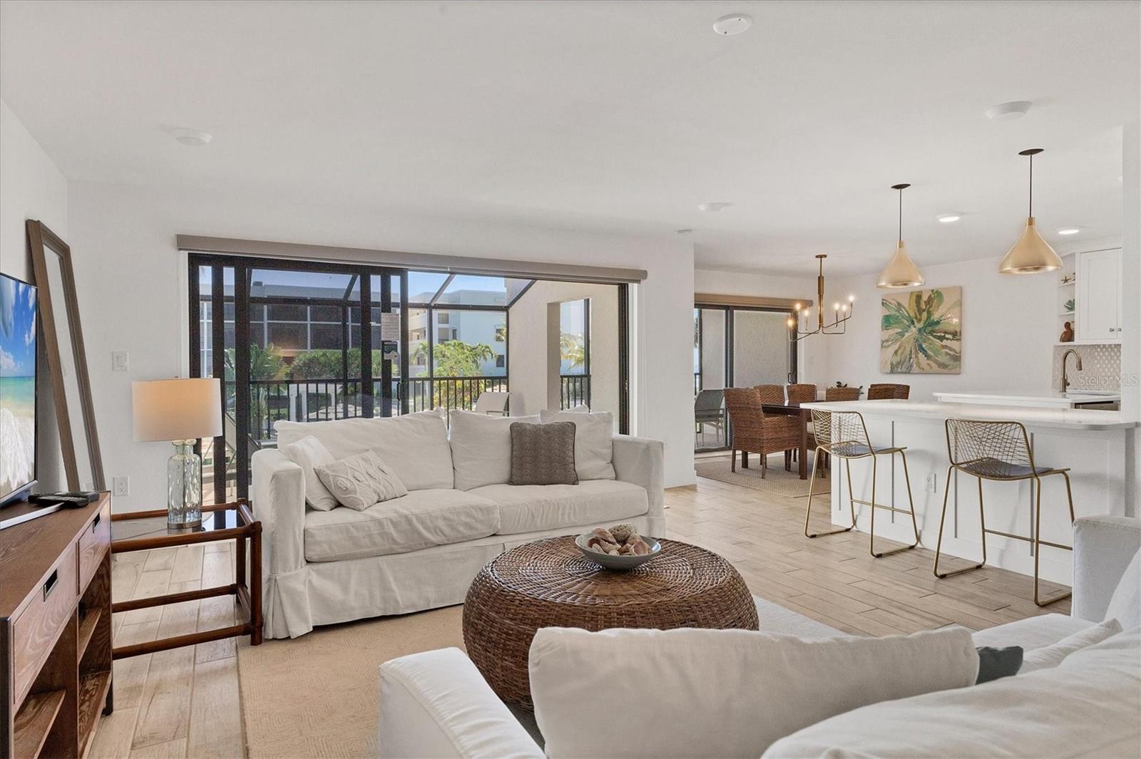 Now's your chance to own a piece of paradise! Breathtaking, pool and GULF views from the extra large enclosed lanai! Renovated down to the studs in 2017 this 2 bed, 2 bath has a completely new layout! Kitchen has new appliances and elegant quartz countertops. Custom Starmark cabinetry with hidden hinges and flush inset doors along with Kohler and Brizo hardware are found both in the kitchen and baths. Primary has large walk-in shower. New light fixtures and recessed ceiling lights. Tile floor throughout looks like wood but durable and easy to clean! Plantation shutters and impact glass on windows and lanai doors. New electric, plumbing and HVAC. Not a detail was missed in this must see condominium! Unit includes a parking space, storage closet and use of golf cart lot. Resort - like amentities include a large heated swimming pool, lighted tennis courts, patios for BBQ's and elevators for easy access. Enjoy walks on Boca Grande's coveted white sandy shoreline, take a golf cart ( included in sale) to the nearby bike path and head downtown to enjoy the many restaurants and shopping or simply relax and watch the sunset from your lanai.