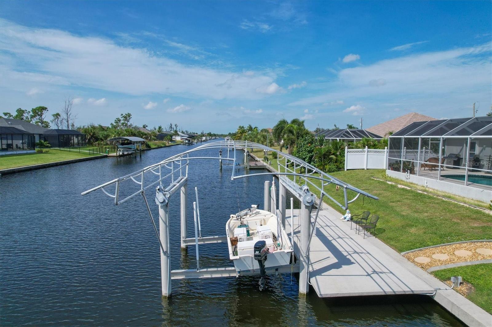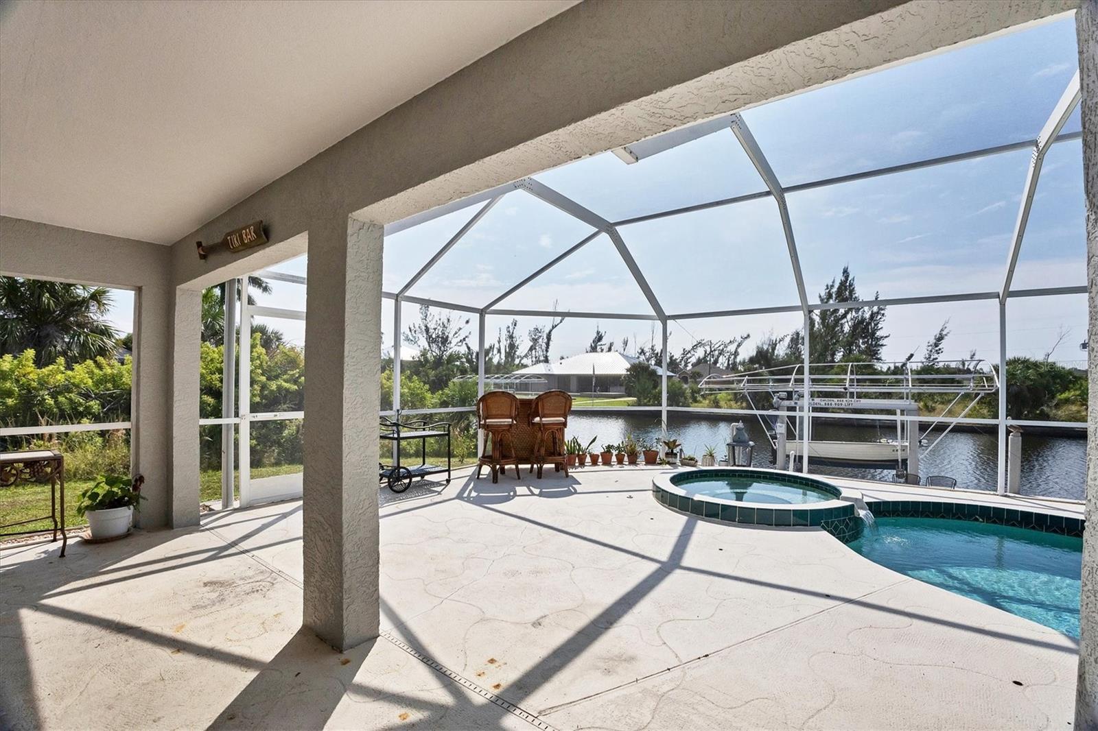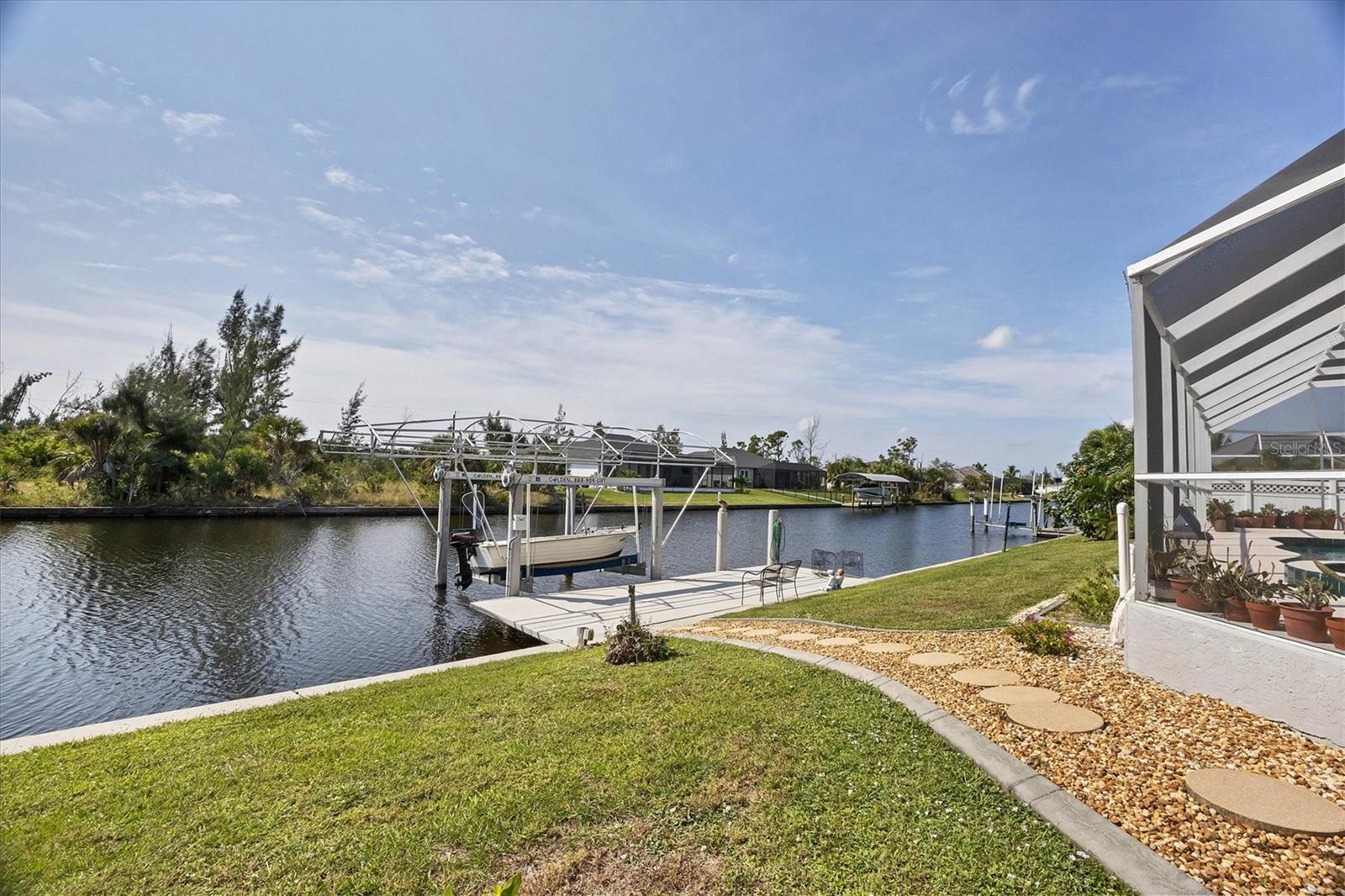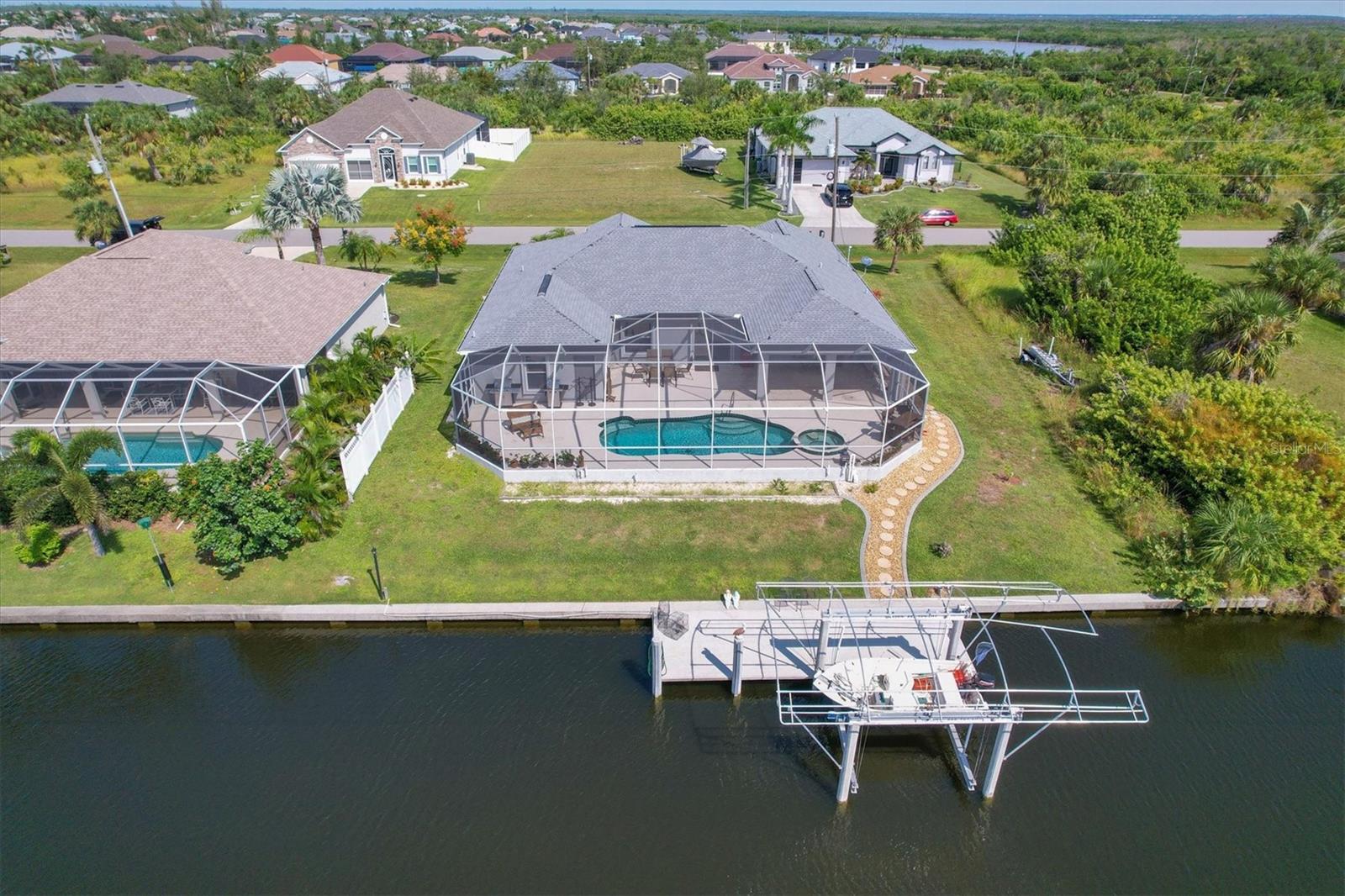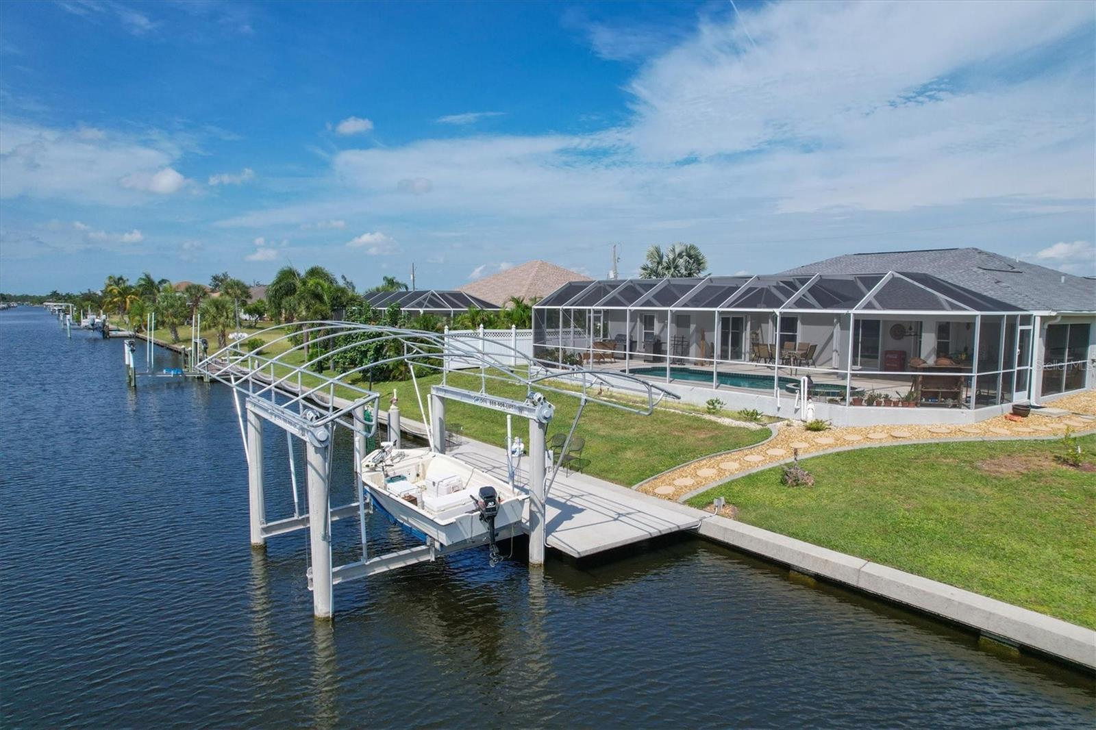 Amazing opportunity to own a private piece of paradise. This 4 bedroom, 2 bathroom, heated pool and spa home is now available in South Gulf Cove. There is an additional room that is very large and can be easily made into a 5th bedroom or a den/office space but does not have a closet currently. So many features were included in this remodel but a few to mention are luxury vinyl flooring throughout, newer roof installed in 2019, remodeled bathrooms, granite countertops throughout, replaced water pressure lines, updated kitchen with newer stainless steel appliances, accordion hurricane shutters around the whole house, freshly painted interior and exterior, and the list goes on. The most important of all features of this property is your own private concrete deck with a 80 foot seawall that includes a 10,000 lb capacity boat lift with canopy, that provides easy access to the Charlotte Harbor and the Gasparilla Sound where some of the finest boating and fishing that Florida has to offer are found. You are only one lock away from the full access to the water, which is about a 5 minute boat ride. That alone is a boater's dream in this area. South Gulf Cove is a sought-after neighborhood of mostly waterfront homes with limited deed restrictions and numerous parks including a boat ramp, master garden park, linear park, playground, and a clubhouse/meeting room for social gatherings. Conveniently located closed to shopping, dining, entertainment, beaches, and Boca Grande. This opportunity will not last long so call and schedule your private showing today.