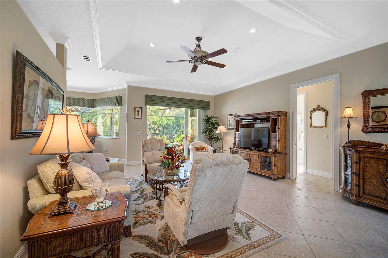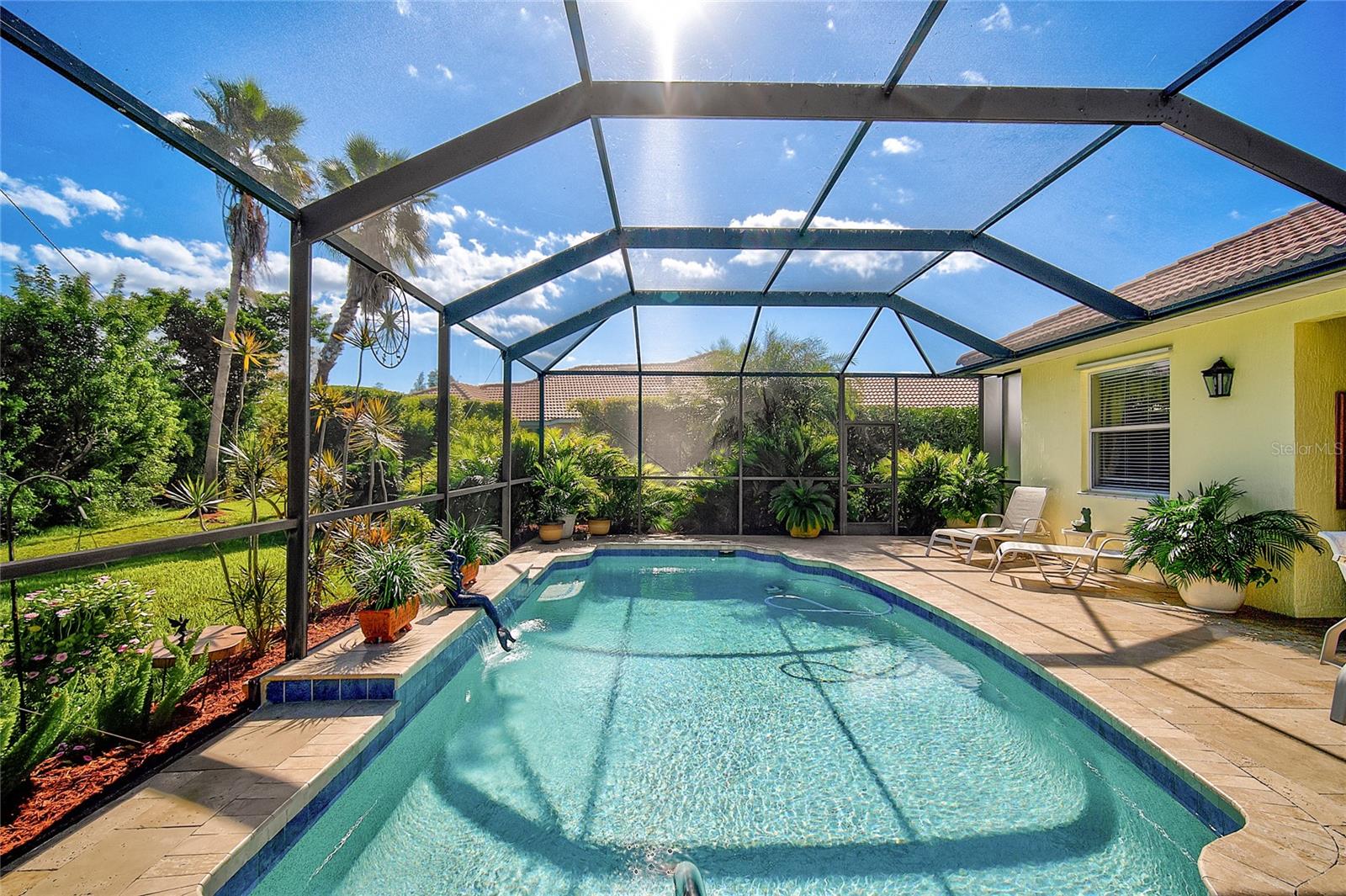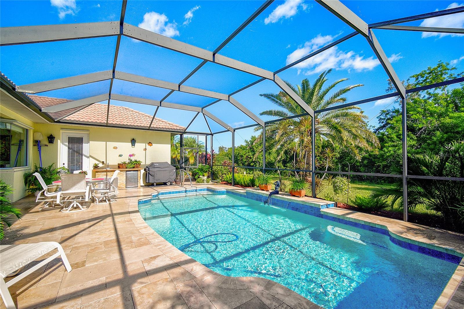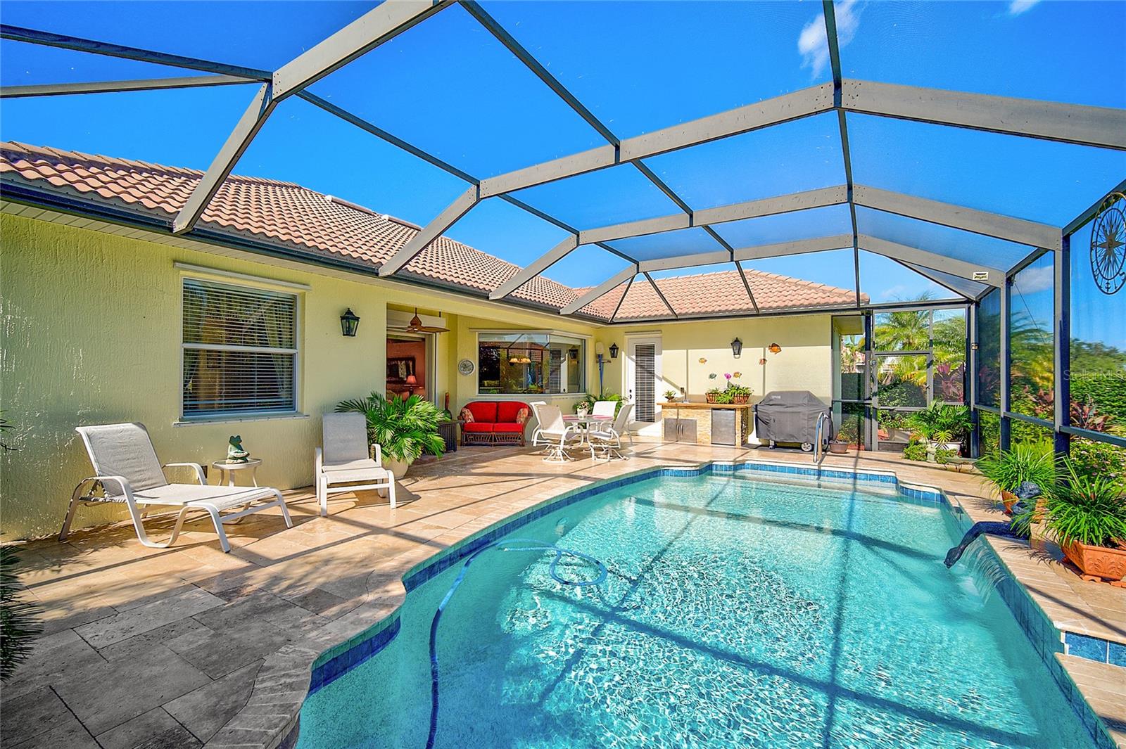 New and Improved Price! Welcome to your dream home in the beautiful Venetia Community! This stunning single-family residence boasts 3 bedrooms and 2 baths, offering a perfect blend of comfort and elegance. As you step inside, the spacious family room and dining area greet you, featuring high ceilings and exquisite crown molding that add a touch of sophistication. The living room is a haven of natural light, courtesy of sliding doors leading out to the back lanai. The well-appointed kitchen is complete with a breakfast bar and an adjacent eating space featuring Bay windows overlooking the inviting pool. The primary suite is a retreat within itself, offering panoramic views of the backyard and pool. It includes an en suite bathroom, two generously sized closets, high ceilings, dual sinks, a private toilet, a linen closet, a large spa tub, and a spacious walk-in shower. On the other side of the residence, two additional bedrooms await, each adorned with windows that flood the space with invigorating natural light. The second bathroom offers relaxation, complete with a shower and tub combination. The level of luxury is elevated with the inclusion of a water softener and a convenient in-home laundry room. Step outside to the beautifully landscaped exterior, where a screened-in lanai awaits with tranquil nature views and new travertine tiles. The large pool becomes the centerpiece of your outdoor oasis, complemented by an outdoor kitchen space equipped with a sink, ample counter space, a mini-fridge, a TV, and an outdoor propane firepit. Your peace of mind is ensured with hurricane shutters throughout the home, including automatic ones on the sliding glass door leading to the lanai . The 2-car garage provides ample parking and storage space. Beyond the bounds of your property, Venetia unfolds as a gated community with a wealth of amenities. The clubhouse is a focal point, offering residents access to a large pool, hot tub, and courts for basketball, pickleball, bocce, shuffleboard, and tennis. Social activities abound, with groups for Mah Jongg, Bridge, Poker, Euchre, book clubs, artists workshops, and sports enthusiasts. Monthly events, including dinners, outings, and special holiday celebrations, create a vibrant and welcoming community atmosphere. Don't miss the opportunity to make this exceptional property in the heart of Venetia your forever home! Please see 3D Tour and Video