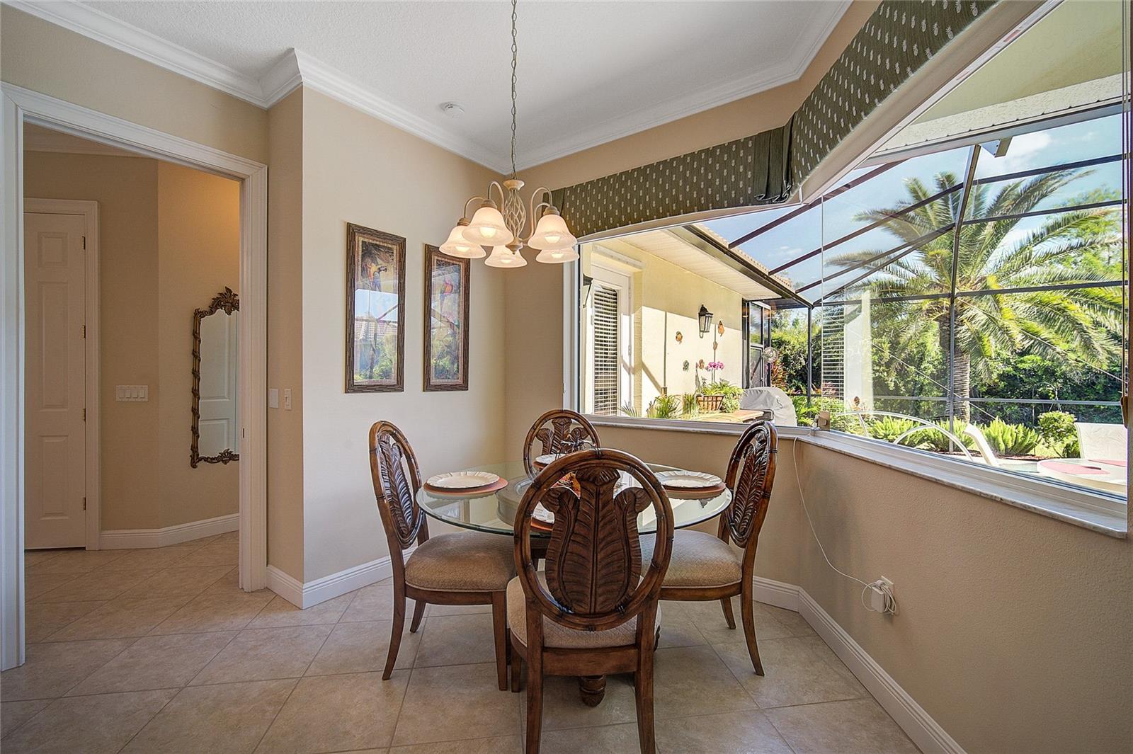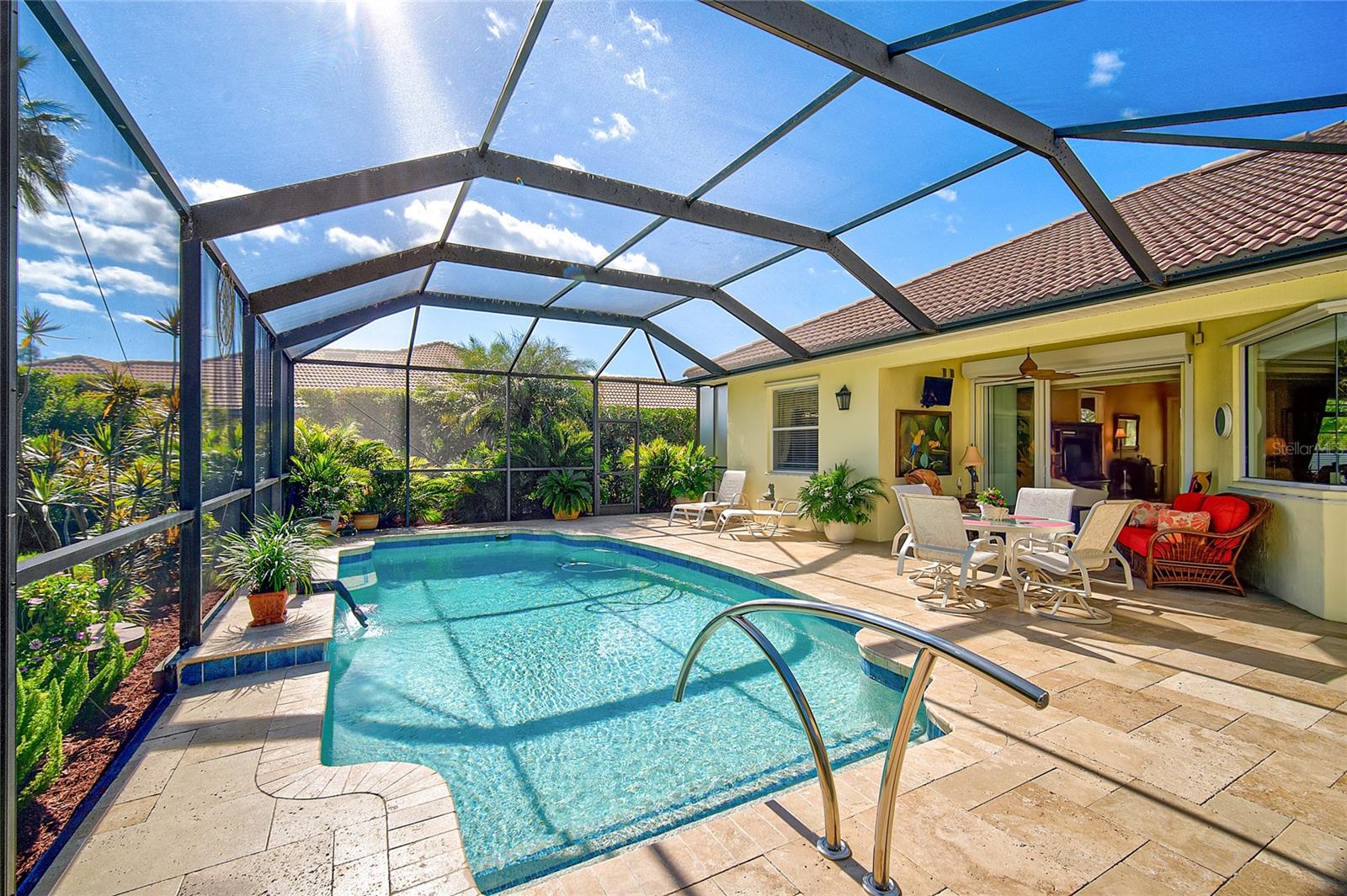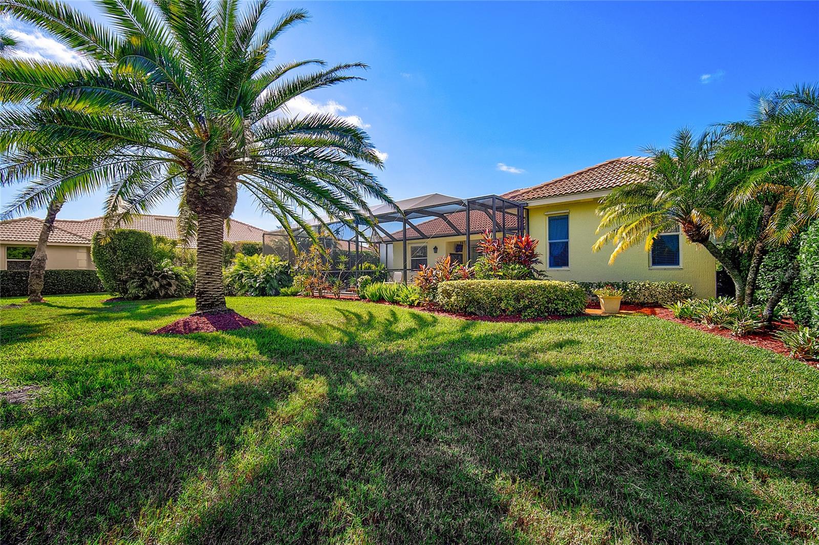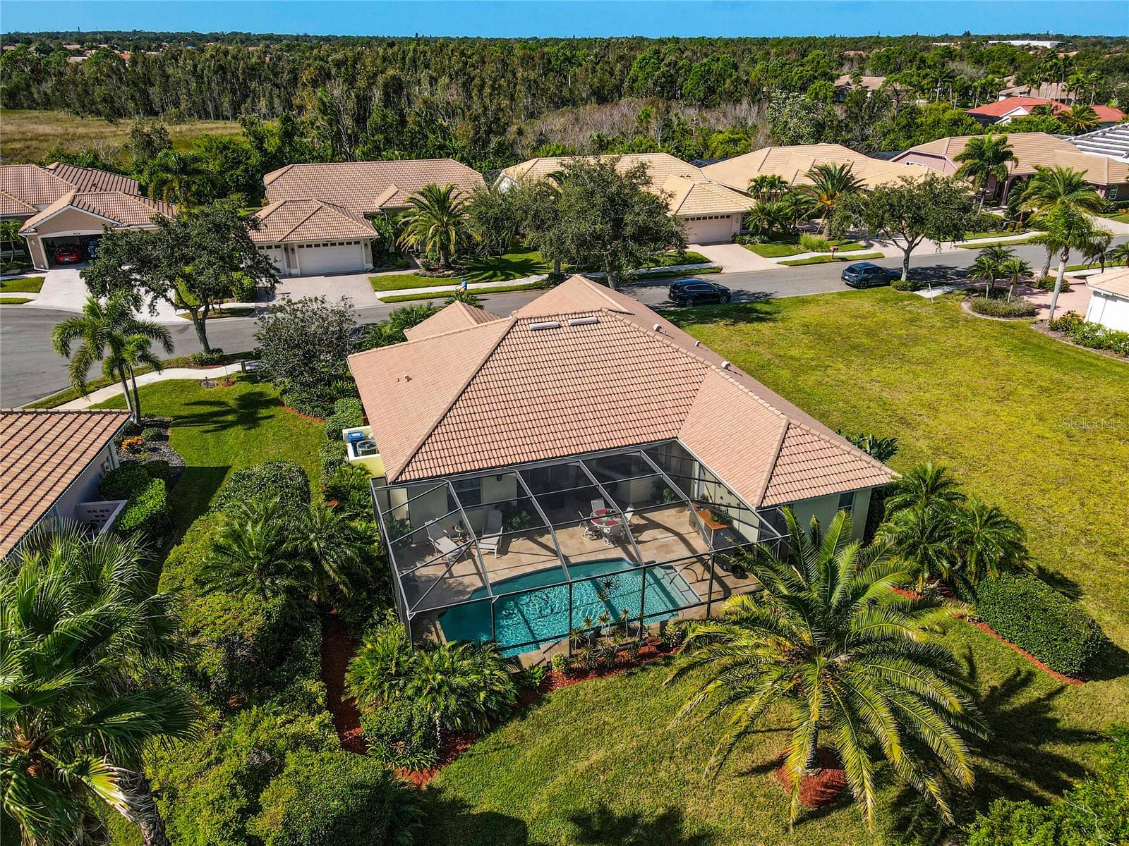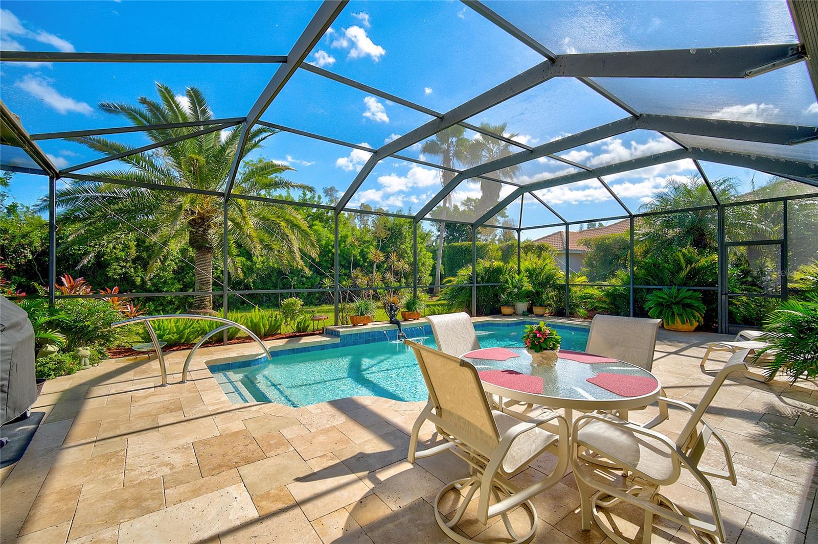 New and Improved Price! Welcome to your dream home in the beautiful Venetia Community! This stunning single-family residence boasts 3 bedrooms and 2 baths, offering a perfect blend of comfort and elegance. As you step inside, the spacious family room and dining area greet you, featuring high ceilings and exquisite crown molding that add a touch of sophistication. The living room is a haven of natural light, courtesy of sliding doors leading out to the back lanai. The well-appointed kitchen is complete with a breakfast bar and an adjacent eating space featuring Bay windows overlooking the inviting pool. The primary suite is a retreat within itself, offering panoramic views of the backyard and pool. It includes an en suite bathroom, two generously sized closets, high ceilings, dual sinks, a private toilet, a linen closet, a large spa tub, and a spacious walk-in shower. On the other side of the residence, two additional bedrooms await, each adorned with windows that flood the space with invigorating natural light. The second bathroom offers relaxation, complete with a shower and tub combination. The level of luxury is elevated with the inclusion of a water softener and a convenient in-home laundry room. Step outside to the beautifully landscaped exterior, where a screened-in lanai awaits with tranquil nature views and new travertine tiles. The large pool becomes the centerpiece of your outdoor oasis, complemented by an outdoor kitchen space equipped with a sink, ample counter space, a mini-fridge, a TV, and an outdoor propane firepit. Your peace of mind is ensured with hurricane shutters throughout the home, including automatic ones on the sliding glass door leading to the lanai . The 2-car garage provides ample parking and storage space. Beyond the bounds of your property, Venetia unfolds as a gated community with a wealth of amenities. The clubhouse is a focal point, offering residents access to a large pool, hot tub, and courts for basketball, pickleball, bocce, shuffleboard, and tennis. Social activities abound, with groups for Mah Jongg, Bridge, Poker, Euchre, book clubs, artists workshops, and sports enthusiasts. Monthly events, including dinners, outings, and special holiday celebrations, create a vibrant and welcoming community atmosphere. Don't miss the opportunity to make this exceptional property in the heart of Venetia your forever home! Please see 3D Tour and Video