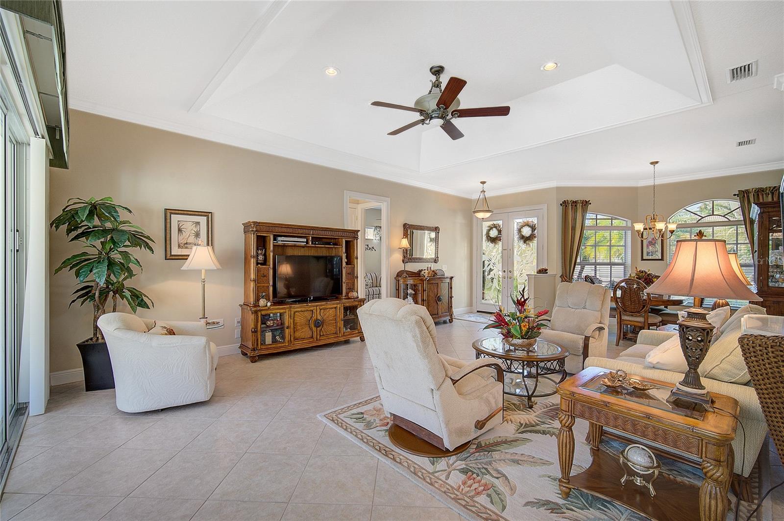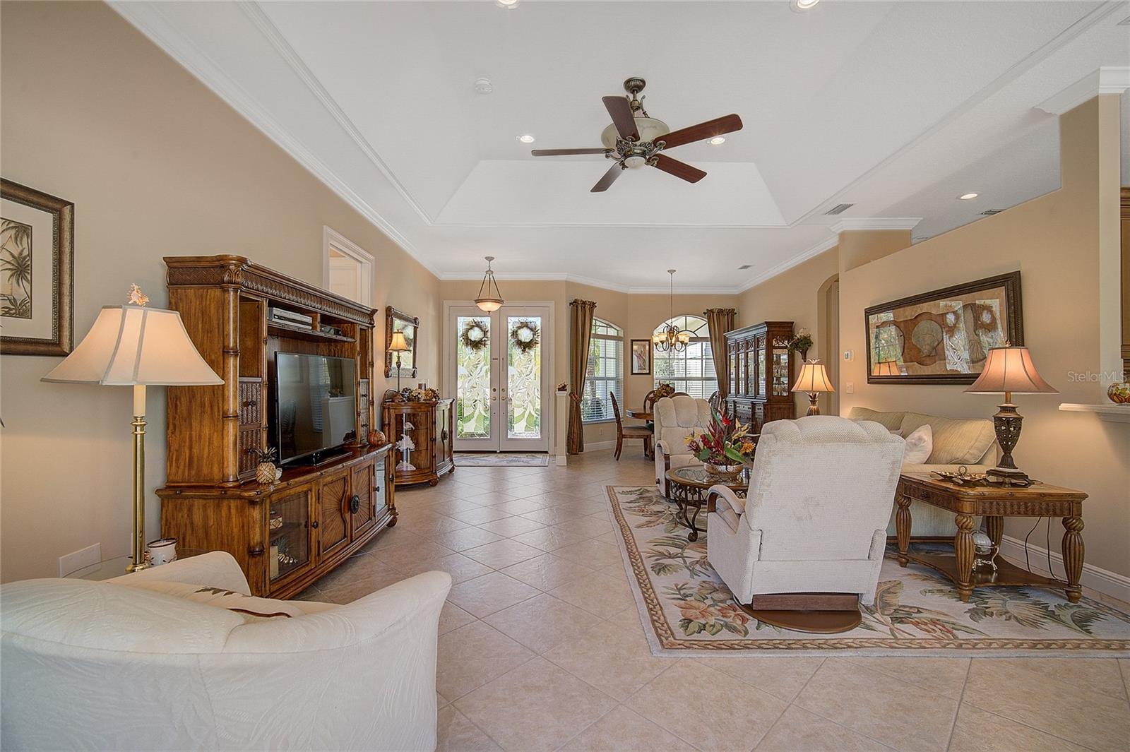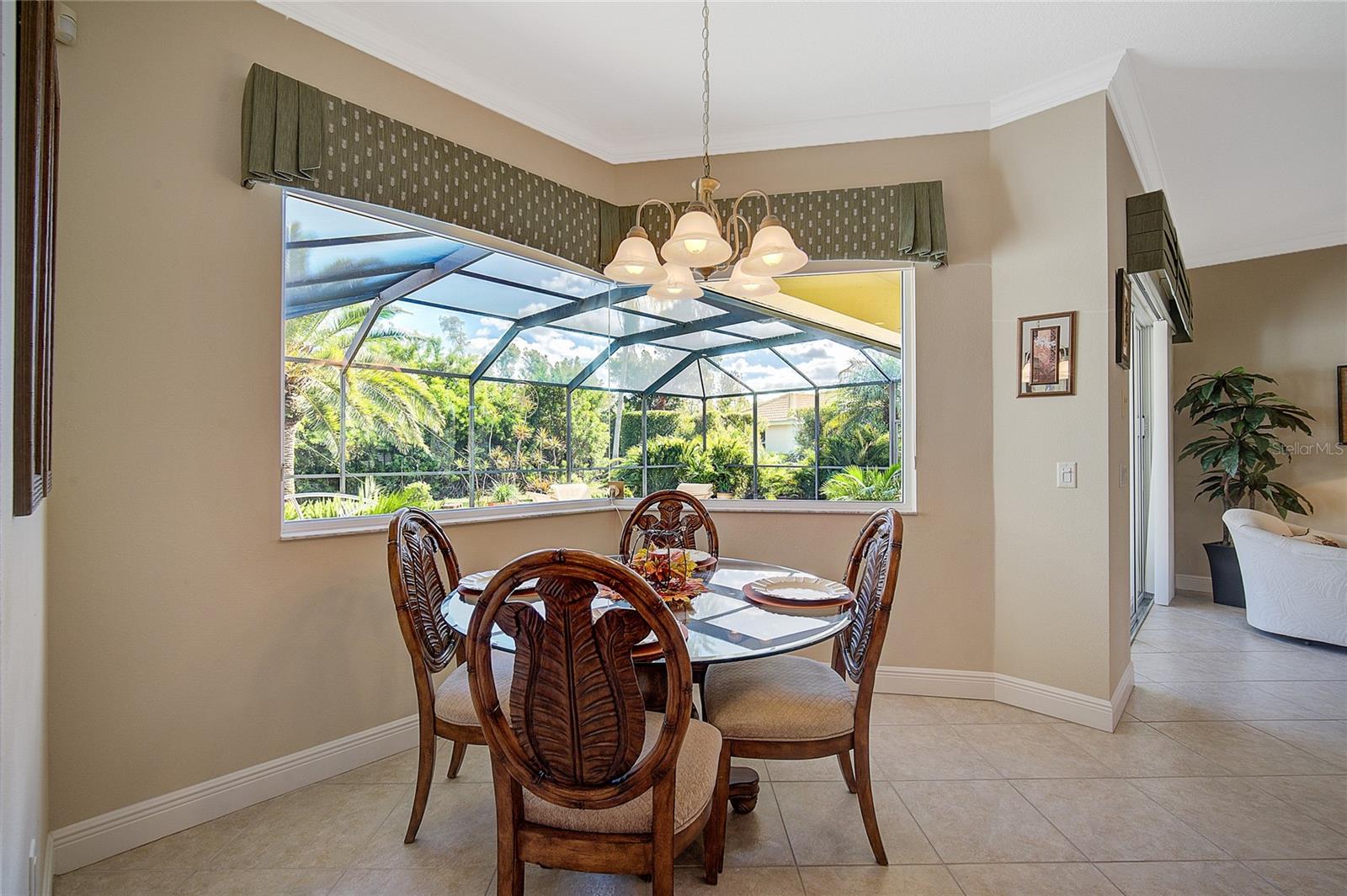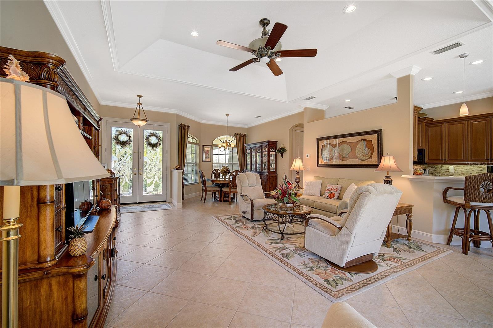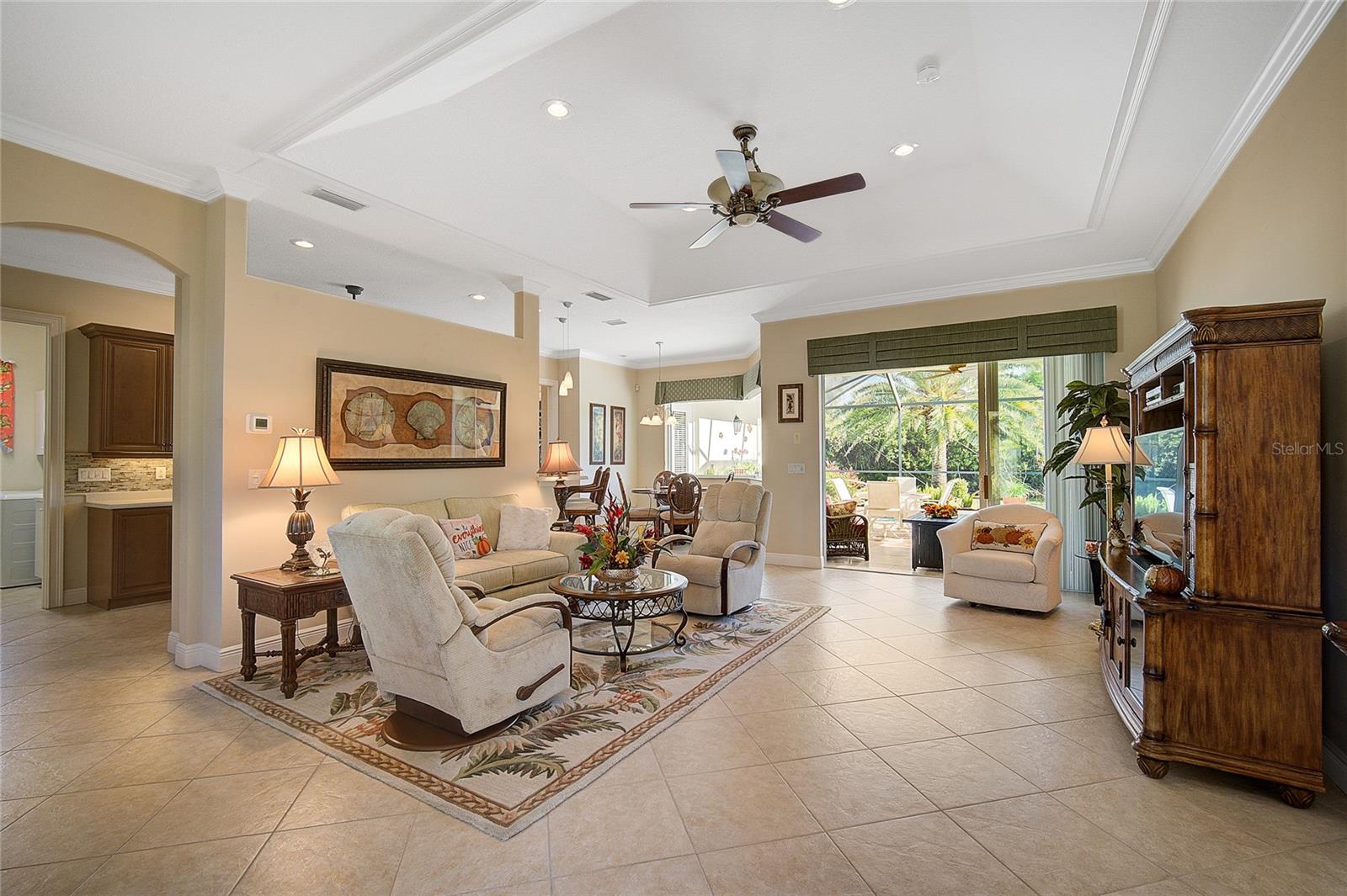 New and Improved Price! Welcome to your dream home in the beautiful Venetia Community! This stunning single-family residence boasts 3 bedrooms and 2 baths, offering a perfect blend of comfort and elegance. As you step inside, the spacious family room and dining area greet you, featuring high ceilings and exquisite crown molding that add a touch of sophistication. The living room is a haven of natural light, courtesy of sliding doors leading out to the back lanai. The well-appointed kitchen is complete with a breakfast bar and an adjacent eating space featuring Bay windows overlooking the inviting pool. The primary suite is a retreat within itself, offering panoramic views of the backyard and pool. It includes an en suite bathroom, two generously sized closets, high ceilings, dual sinks, a private toilet, a linen closet, a large spa tub, and a spacious walk-in shower. On the other side of the residence, two additional bedrooms await, each adorned with windows that flood the space with invigorating natural light. The second bathroom offers relaxation, complete with a shower and tub combination. The level of luxury is elevated with the inclusion of a water softener and a convenient in-home laundry room. Step outside to the beautifully landscaped exterior, where a screened-in lanai awaits with tranquil nature views and new travertine tiles. The large pool becomes the centerpiece of your outdoor oasis, complemented by an outdoor kitchen space equipped with a sink, ample counter space, a mini-fridge, a TV, and an outdoor propane firepit. Your peace of mind is ensured with hurricane shutters throughout the home, including automatic ones on the sliding glass door leading to the lanai . The 2-car garage provides ample parking and storage space. Beyond the bounds of your property, Venetia unfolds as a gated community with a wealth of amenities. The clubhouse is a focal point, offering residents access to a large pool, hot tub, and courts for basketball, pickleball, bocce, shuffleboard, and tennis. Social activities abound, with groups for Mah Jongg, Bridge, Poker, Euchre, book clubs, artists workshops, and sports enthusiasts. Monthly events, including dinners, outings, and special holiday celebrations, create a vibrant and welcoming community atmosphere. Don't miss the opportunity to make this exceptional property in the heart of Venetia your forever home! Please see 3D Tour and Video