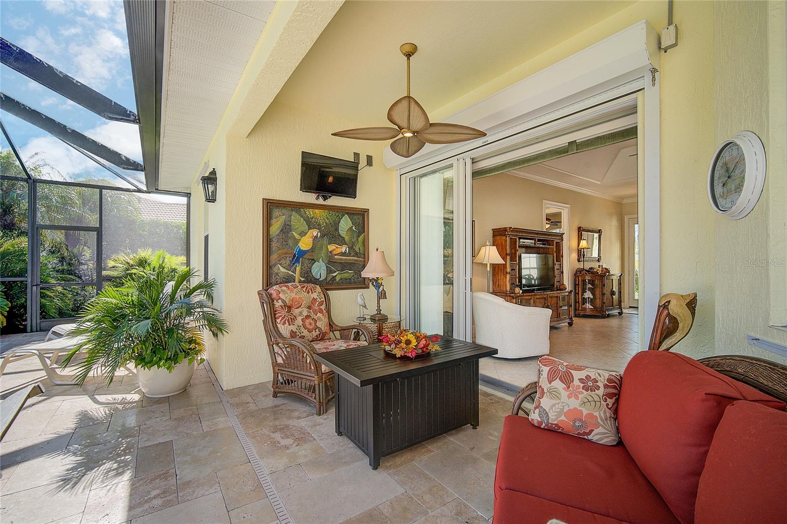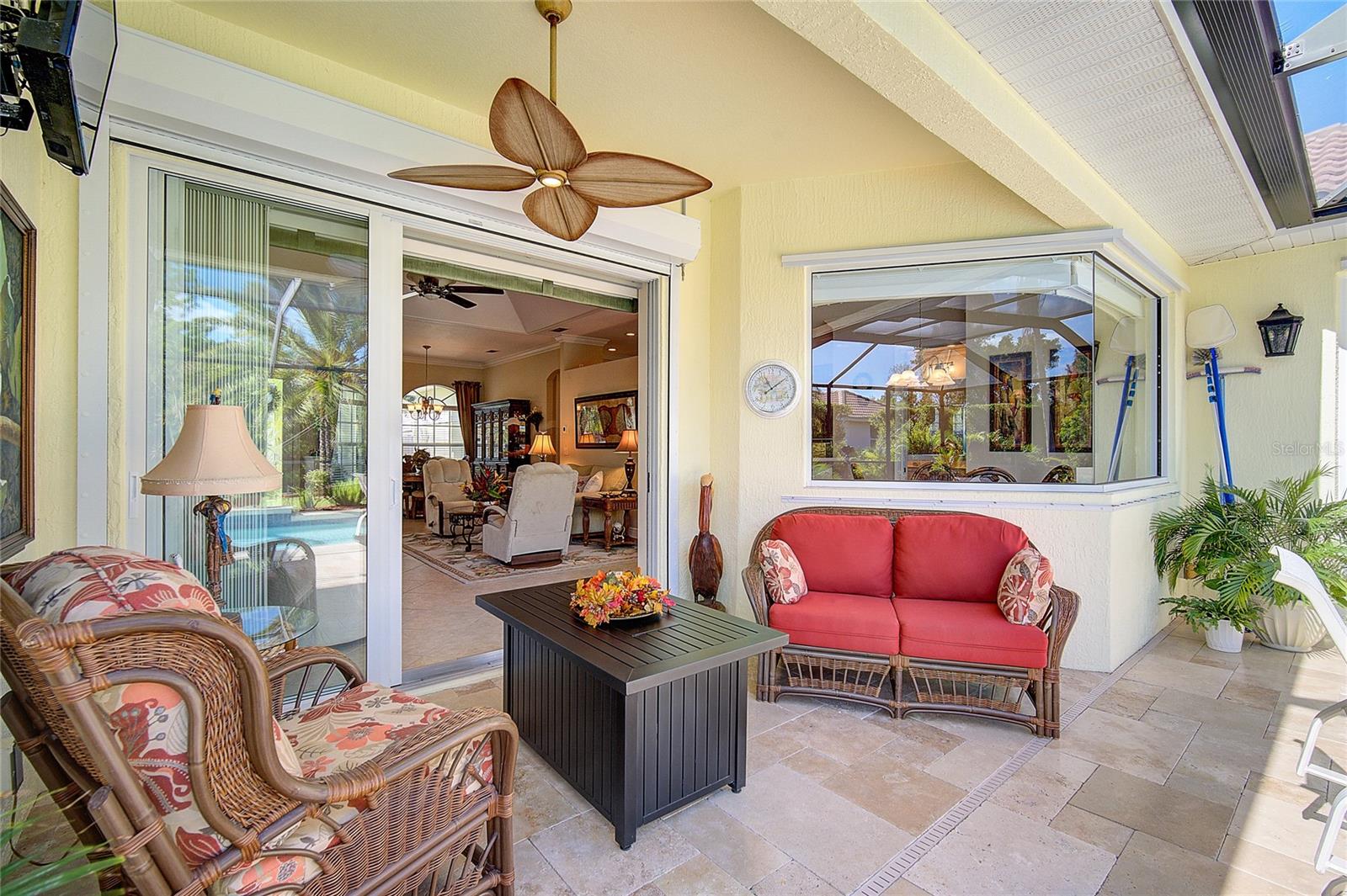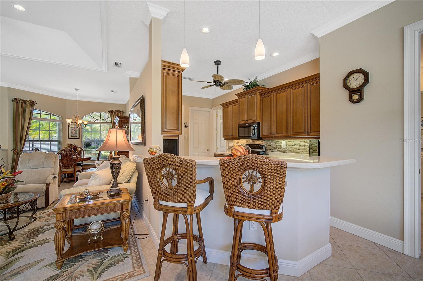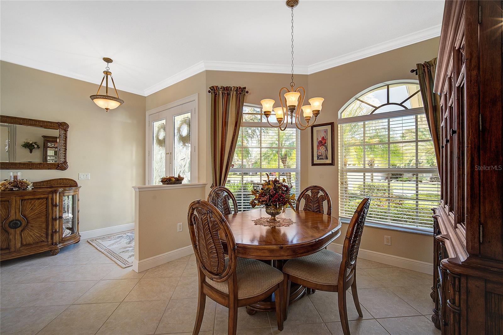 New and Improved Price! Welcome to your dream home in the beautiful Venetia Community! This stunning single-family residence boasts 3 bedrooms and 2 baths, offering a perfect blend of comfort and elegance. As you step inside, the spacious family room and dining area greet you, featuring high ceilings and exquisite crown molding that add a touch of sophistication. The living room is a haven of natural light, courtesy of sliding doors leading out to the back lanai. The well-appointed kitchen is complete with a breakfast bar and an adjacent eating space featuring Bay windows overlooking the inviting pool. The primary suite is a retreat within itself, offering panoramic views of the backyard and pool. It includes an en suite bathroom, two generously sized closets, high ceilings, dual sinks, a private toilet, a linen closet, a large spa tub, and a spacious walk-in shower. On the other side of the residence, two additional bedrooms await, each adorned with windows that flood the space with invigorating natural light. The second bathroom offers relaxation, complete with a shower and tub combination. The level of luxury is elevated with the inclusion of a water softener and a convenient in-home laundry room. Step outside to the beautifully landscaped exterior, where a screened-in lanai awaits with tranquil nature views and new travertine tiles. The large pool becomes the centerpiece of your outdoor oasis, complemented by an outdoor kitchen space equipped with a sink, ample counter space, a mini-fridge, a TV, and an outdoor propane firepit. Your peace of mind is ensured with hurricane shutters throughout the home, including automatic ones on the sliding glass door leading to the lanai . The 2-car garage provides ample parking and storage space. Beyond the bounds of your property, Venetia unfolds as a gated community with a wealth of amenities. The clubhouse is a focal point, offering residents access to a large pool, hot tub, and courts for basketball, pickleball, bocce, shuffleboard, and tennis. Social activities abound, with groups for Mah Jongg, Bridge, Poker, Euchre, book clubs, artists workshops, and sports enthusiasts. Monthly events, including dinners, outings, and special holiday celebrations, create a vibrant and welcoming community atmosphere. Don't miss the opportunity to make this exceptional property in the heart of Venetia your forever home! Please see 3D Tour and Video