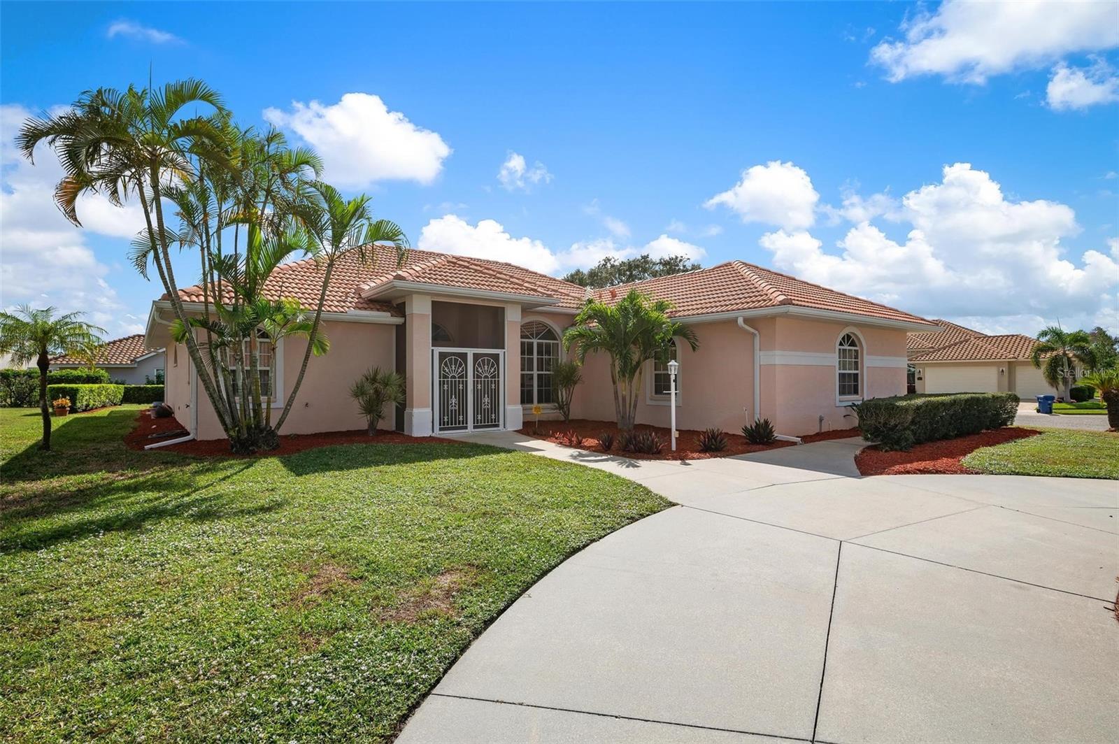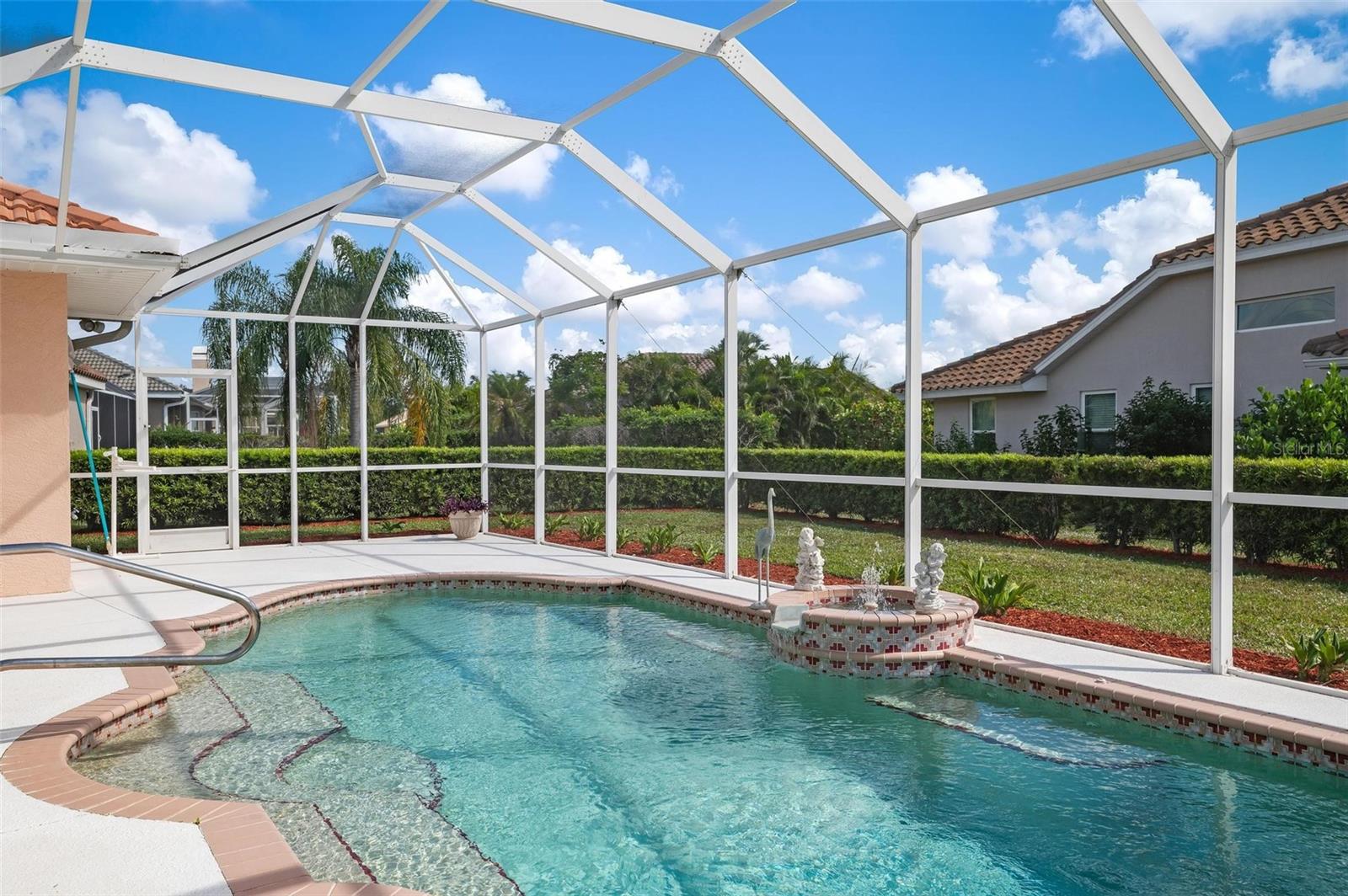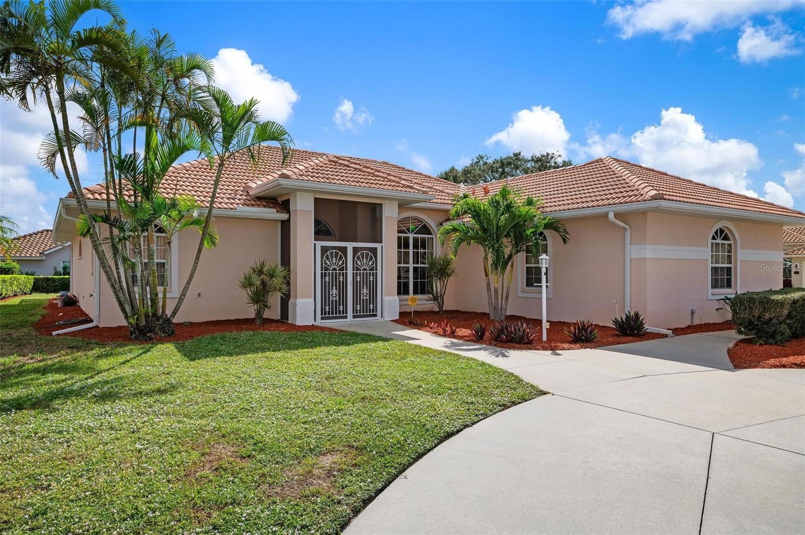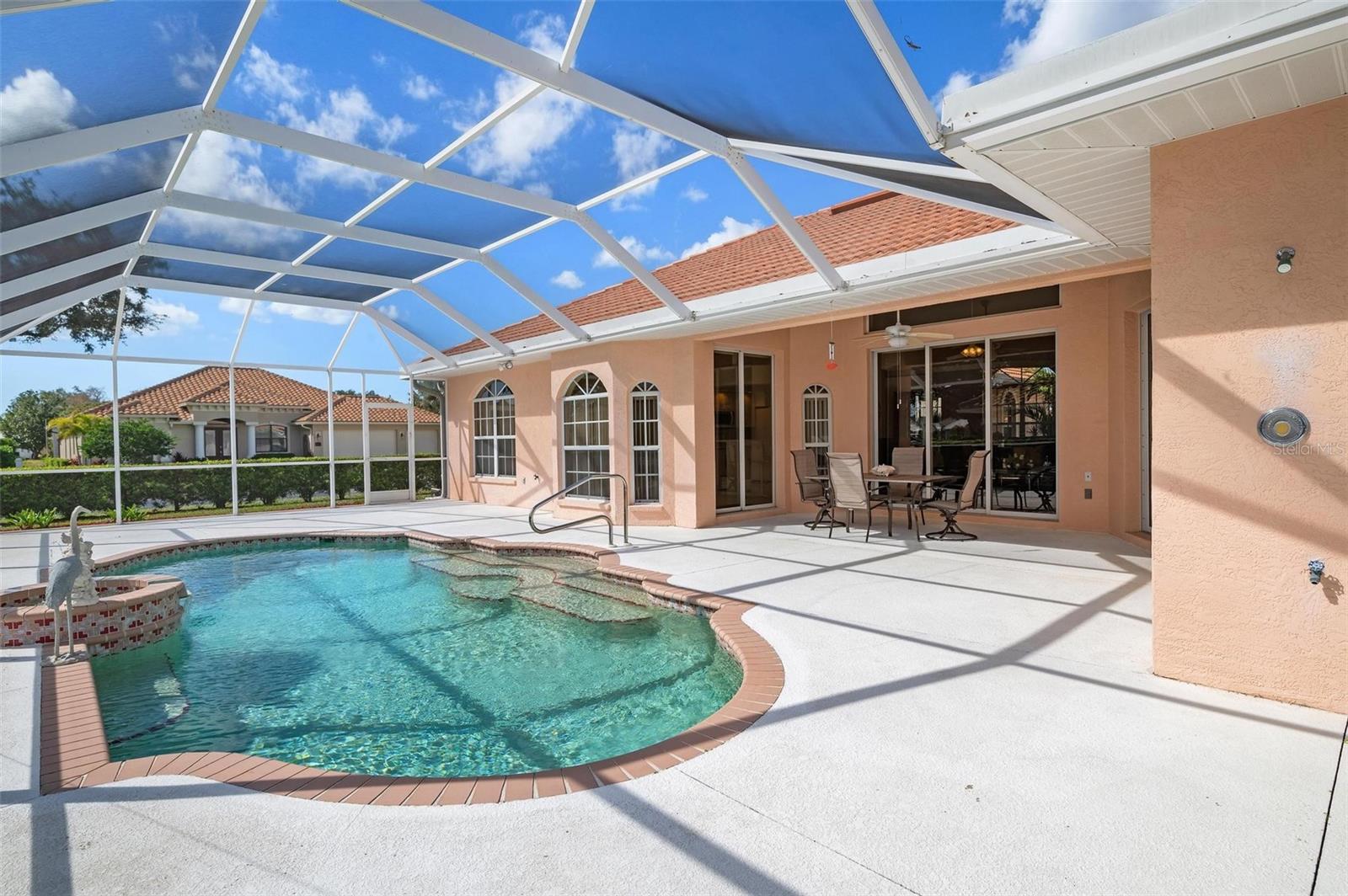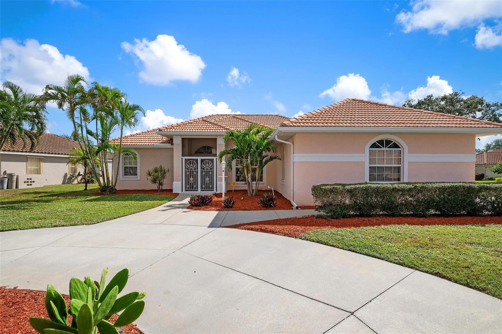 Nestled in the desirable Manors of Chestnut Creek, this impressive custom pool home offers three bedrooms and two and a half baths on an oversized corner lot. The front of the residence exudes curb appeal with a circular drive and welcoming double leaded glass doors. Upon entry, you're greeted by a spacious great room featuring cathedral ceilings and expansive sliders that open up to a sizable lanai and sparkling caged pool. The interior boasts an open, airy, and bright split floor plan, adorned with tasteful tile throughout, a testament to the care and attention of the original owner. The Grecian style pool enjoys all-day sun thanks to its southern exposure, providing an inviting outdoor space for relaxation, exercise, or gatherings. The Manors of Chestnut Creek is a community with a lot to offer, including a low HOA fee and no CDD fees. This prime location places you within a 10-15 minute drive of some of the area's most sought-after attractions, such as pristine beaches, Downtown Venice, Downtown Wellen Park, the Braves Stadium, and a multitude of shopping and dining destinations. Whether you're seeking a comfortable family home or a serene retreat for yourself, this property combines a beautiful setting with convenience, making it an attractive option for those looking to enjoy the Venice lifestyle to the fullest.