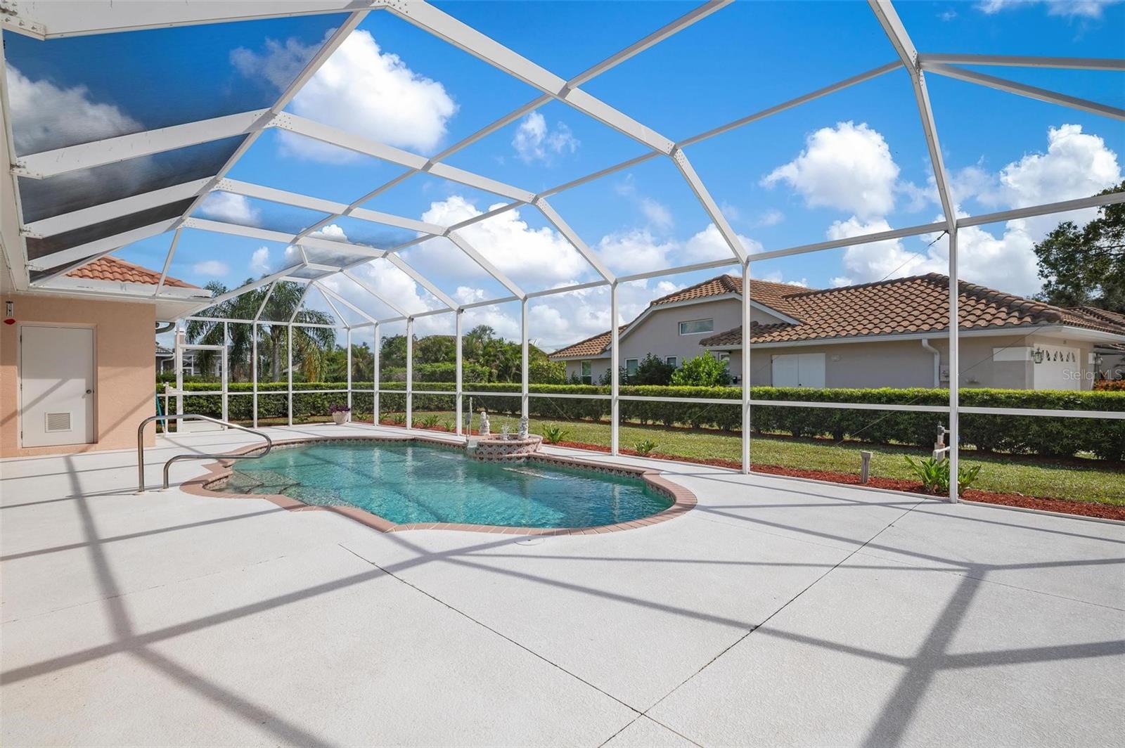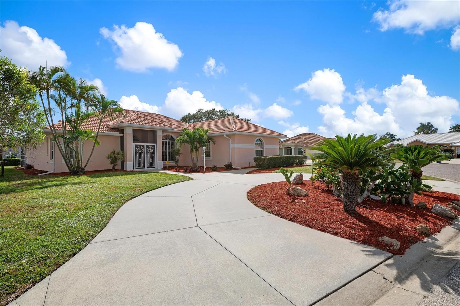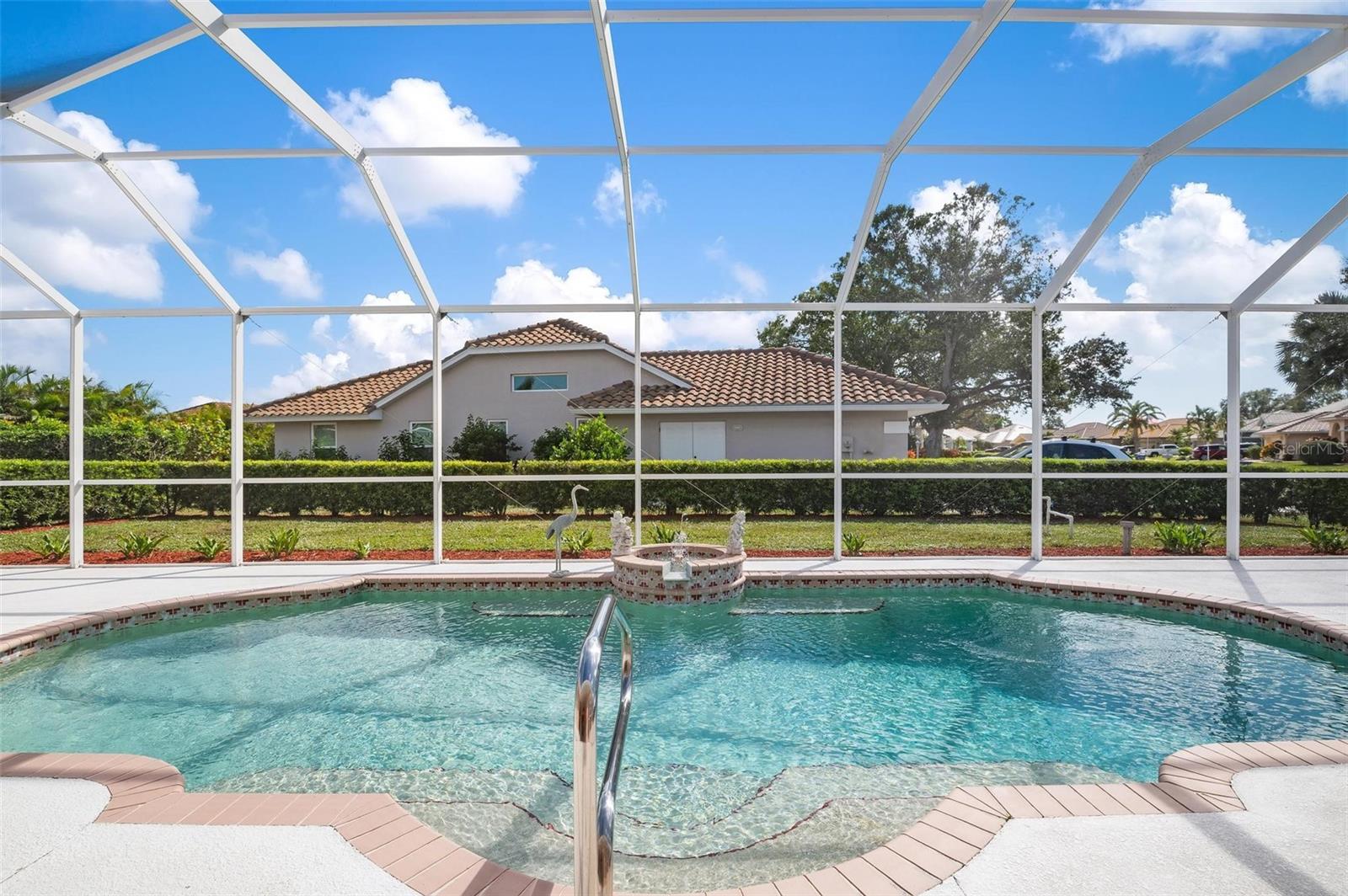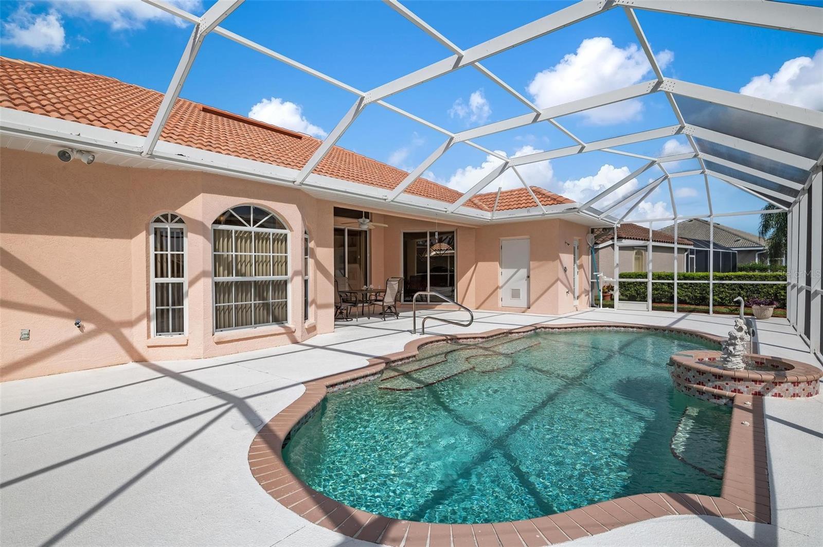 Nestled in the desirable Manors of Chestnut Creek, this impressive custom pool home offers three bedrooms and two and a half baths on an oversized corner lot. The front of the residence exudes curb appeal with a circular drive and welcoming double leaded glass doors. Upon entry, you're greeted by a spacious great room featuring cathedral ceilings and expansive sliders that open up to a sizable lanai and sparkling caged pool. The interior boasts an open, airy, and bright split floor plan, adorned with tasteful tile throughout, a testament to the care and attention of the original owner. The Grecian style pool enjoys all-day sun thanks to its southern exposure, providing an inviting outdoor space for relaxation, exercise, or gatherings. The Manors of Chestnut Creek is a community with a lot to offer, including a low HOA fee and no CDD fees. This prime location places you within a 10-15 minute drive of some of the area's most sought-after attractions, such as pristine beaches, Downtown Venice, Downtown Wellen Park, the Braves Stadium, and a multitude of shopping and dining destinations. Whether you're seeking a comfortable family home or a serene retreat for yourself, this property combines a beautiful setting with convenience, making it an attractive option for those looking to enjoy the Venice lifestyle to the fullest.