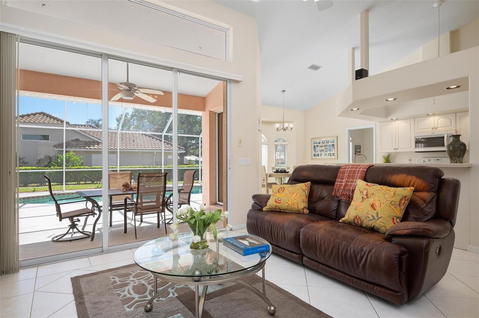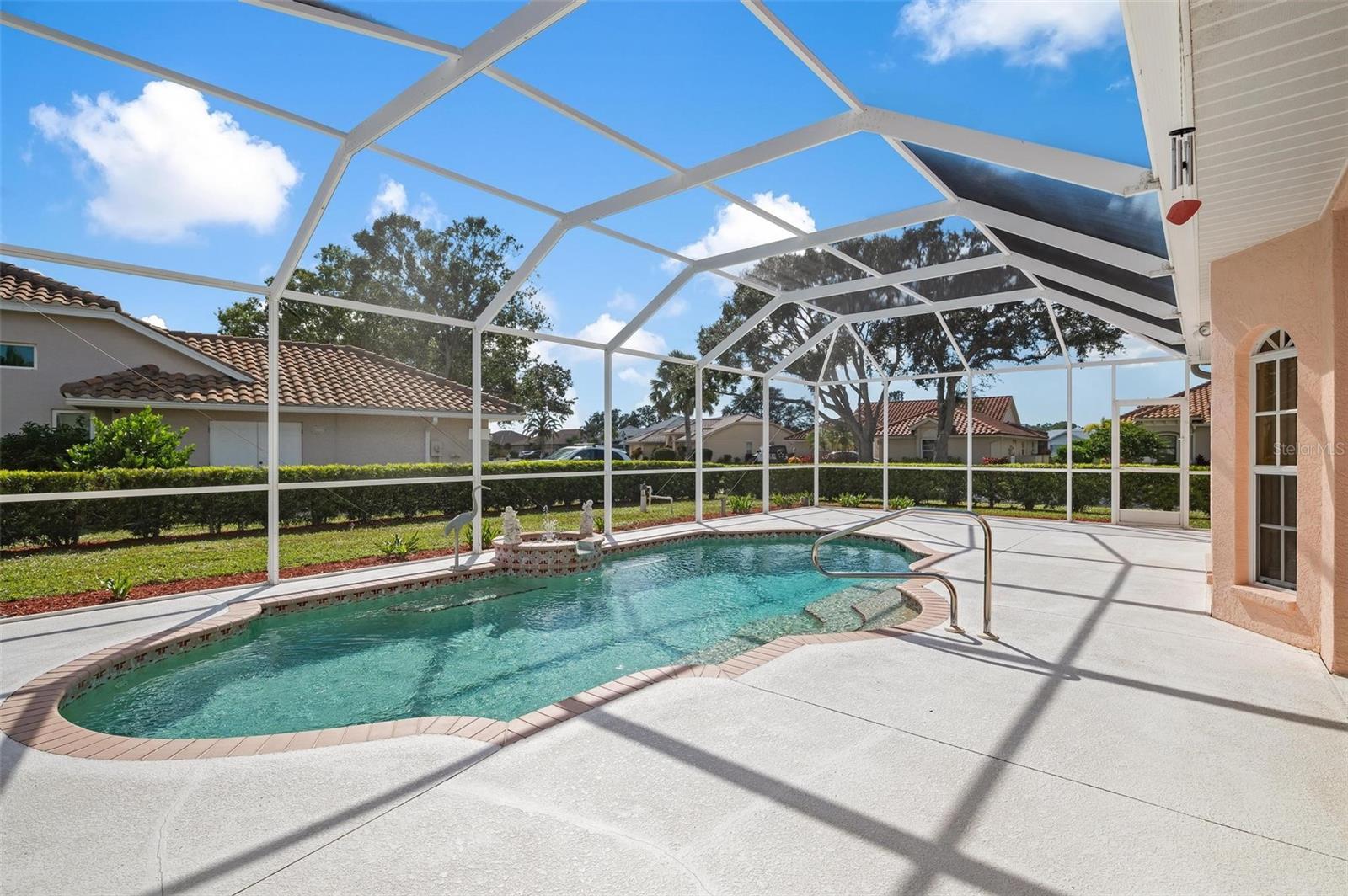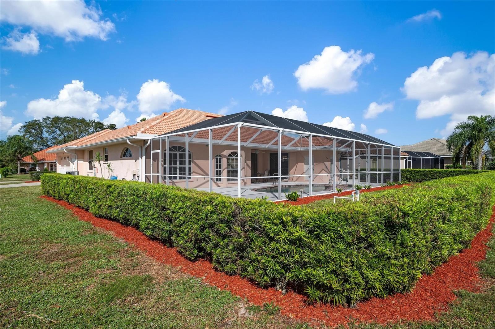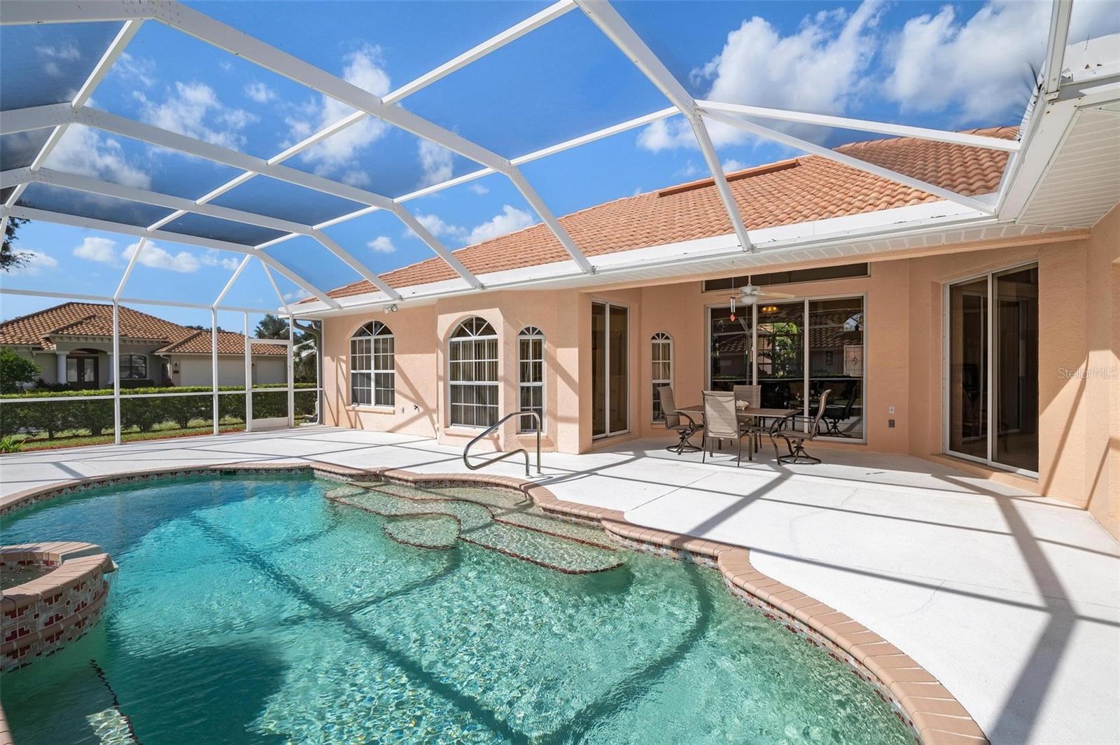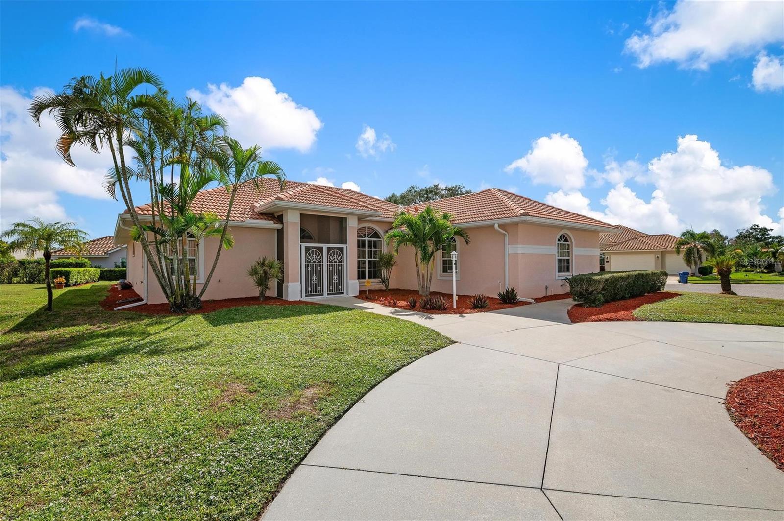 Nestled in the desirable Manors of Chestnut Creek, this impressive custom pool home offers three bedrooms and two and a half baths on an oversized corner lot. The front of the residence exudes curb appeal with a circular drive and welcoming double leaded glass doors. Upon entry, you're greeted by a spacious great room featuring cathedral ceilings and expansive sliders that open up to a sizable lanai and sparkling caged pool. The interior boasts an open, airy, and bright split floor plan, adorned with tasteful tile throughout, a testament to the care and attention of the original owner. The Grecian style pool enjoys all-day sun thanks to its southern exposure, providing an inviting outdoor space for relaxation, exercise, or gatherings. The Manors of Chestnut Creek is a community with a lot to offer, including a low HOA fee and no CDD fees. This prime location places you within a 10-15 minute drive of some of the area's most sought-after attractions, such as pristine beaches, Downtown Venice, Downtown Wellen Park, the Braves Stadium, and a multitude of shopping and dining destinations. Whether you're seeking a comfortable family home or a serene retreat for yourself, this property combines a beautiful setting with convenience, making it an attractive option for those looking to enjoy the Venice lifestyle to the fullest.