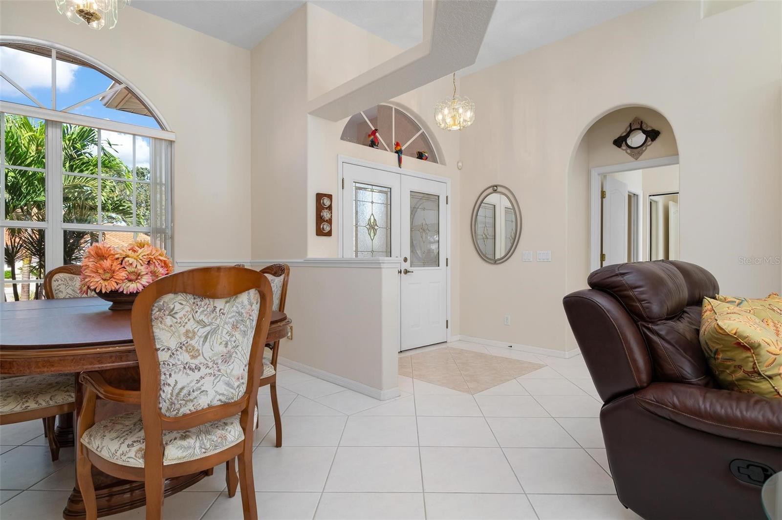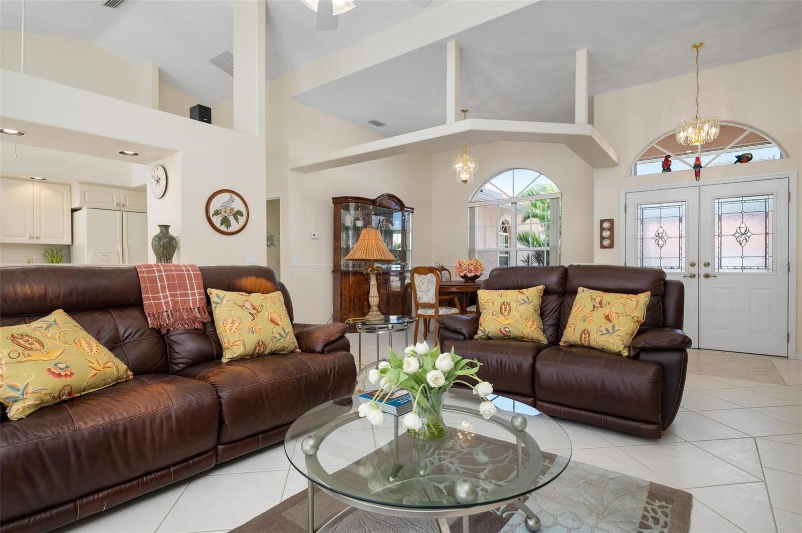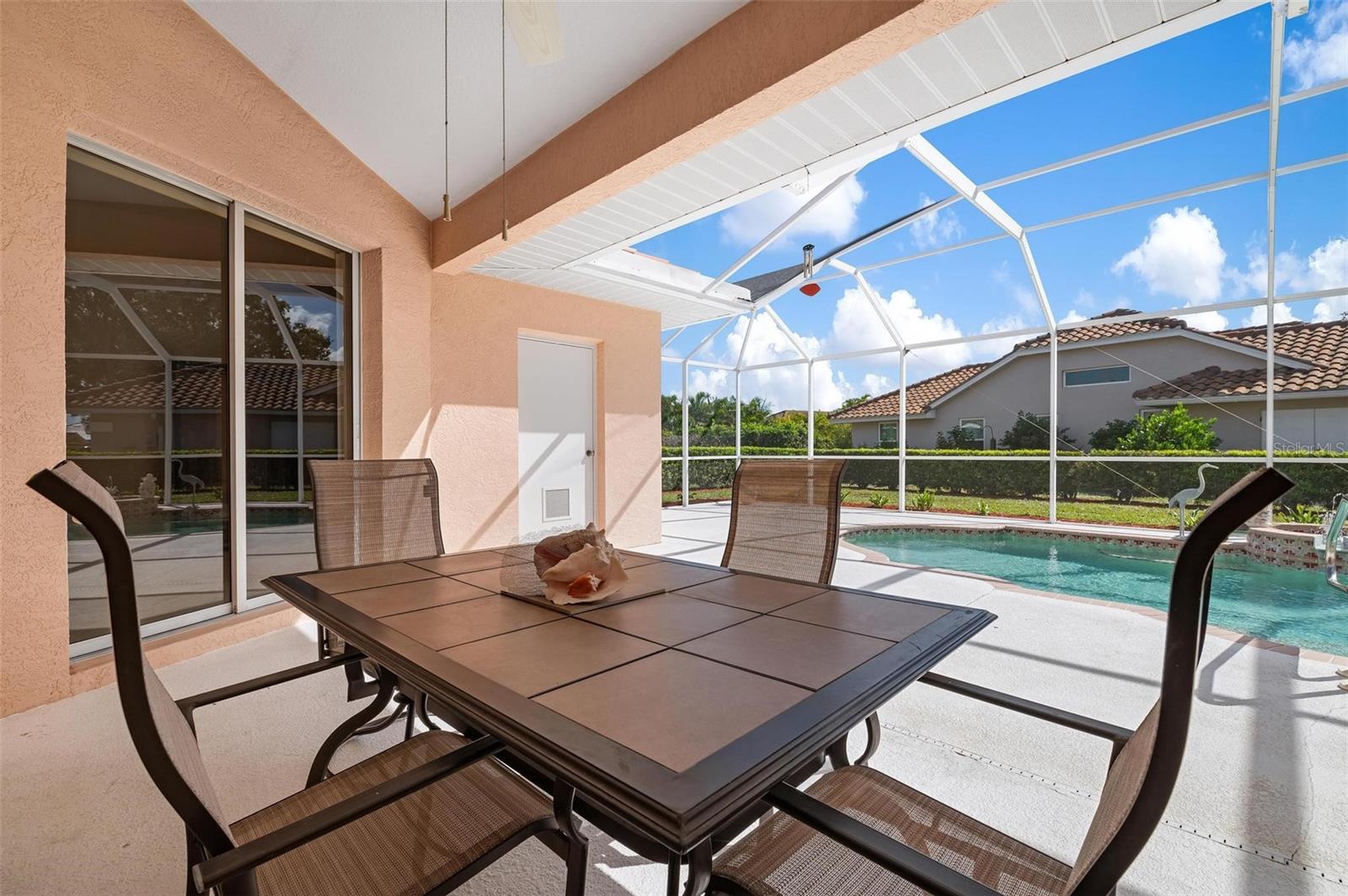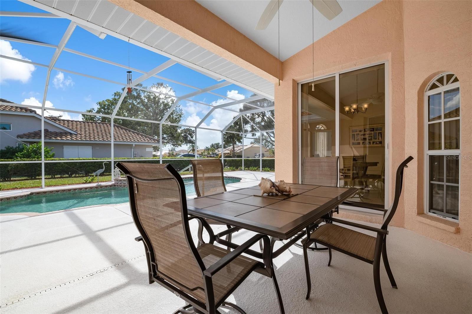 Nestled in the desirable Manors of Chestnut Creek, this impressive custom pool home offers three bedrooms and two and a half baths on an oversized corner lot. The front of the residence exudes curb appeal with a circular drive and welcoming double leaded glass doors. Upon entry, you're greeted by a spacious great room featuring cathedral ceilings and expansive sliders that open up to a sizable lanai and sparkling caged pool. The interior boasts an open, airy, and bright split floor plan, adorned with tasteful tile throughout, a testament to the care and attention of the original owner. The Grecian style pool enjoys all-day sun thanks to its southern exposure, providing an inviting outdoor space for relaxation, exercise, or gatherings. The Manors of Chestnut Creek is a community with a lot to offer, including a low HOA fee and no CDD fees. This prime location places you within a 10-15 minute drive of some of the area's most sought-after attractions, such as pristine beaches, Downtown Venice, Downtown Wellen Park, the Braves Stadium, and a multitude of shopping and dining destinations. Whether you're seeking a comfortable family home or a serene retreat for yourself, this property combines a beautiful setting with convenience, making it an attractive option for those looking to enjoy the Venice lifestyle to the fullest.