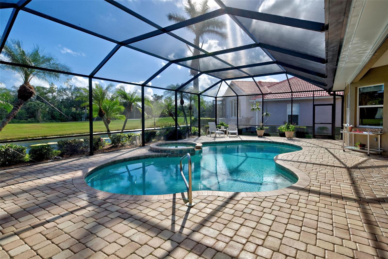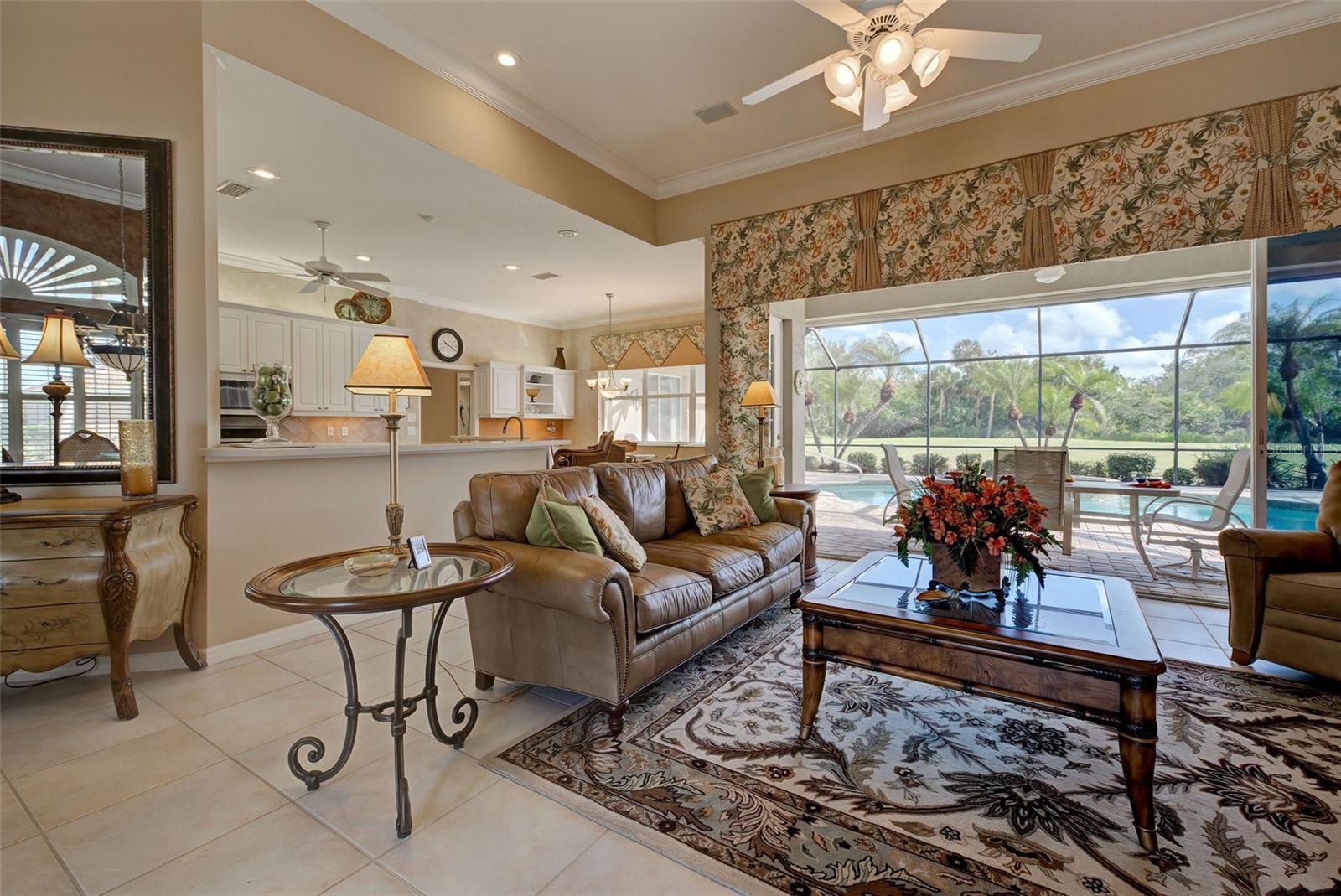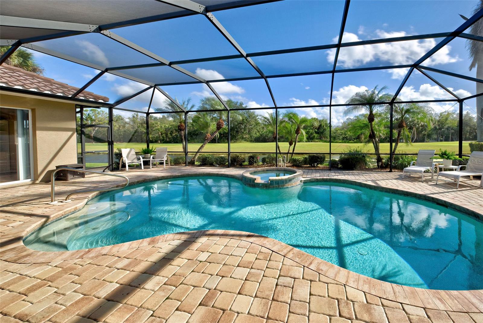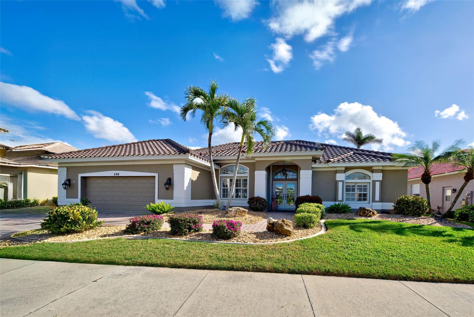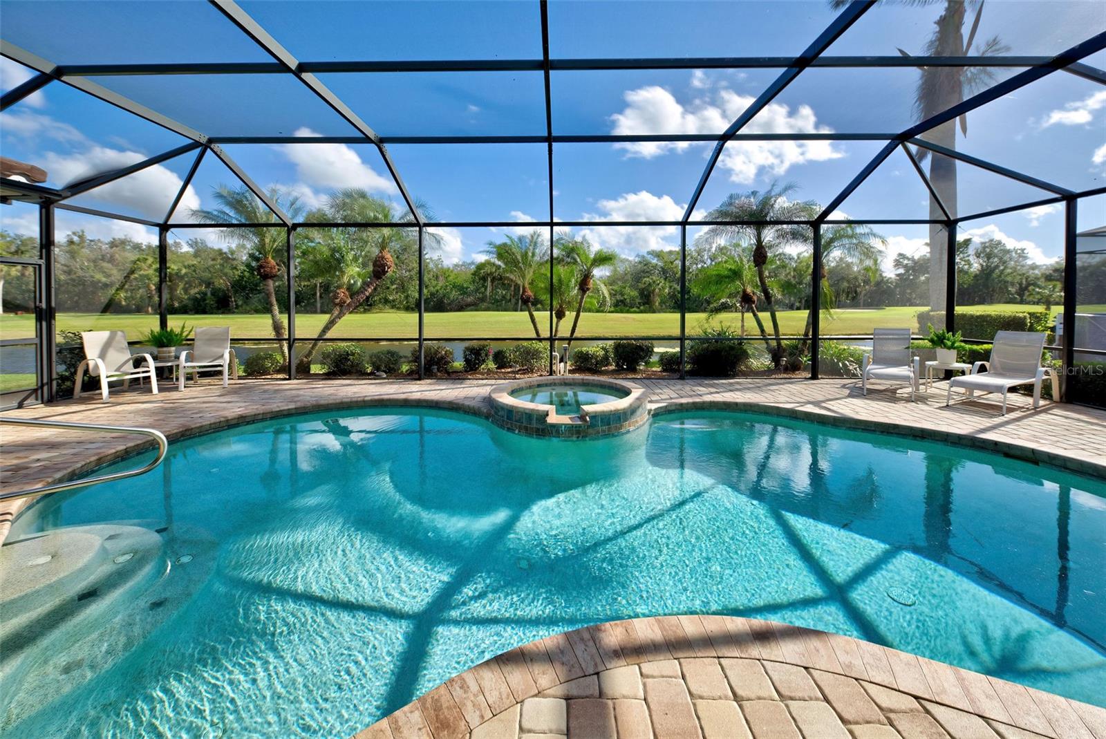 WOW - SIGNIFICANT PRICE REDUCTION, PRICED TO SELL AND MOTIVATED SELLER! Tremendous value with BRAND NEW TILE ROOF with transferable warranty and mesmerizing water, golf and preserve views! This beautifully maintained POOL home with over 2,241 feet of exquisite living space offers 3 large bedrooms, 2 bathrooms, an over-sized 2 car garage (4 extra feet) and beautiful pool and spa. This elegant home welcomes you with luxury from the moment you step into the foyer through double-leaded glass doors, where expansive water and golf views captivate the eye. You will appreciate the open and split floorplan, the soaring 12-foot ceilings, classy crown molding throughout, new AC (2022) and the transom windows which allow an abundance of natural light to flood the home. Entertain with ease on your private lanai with gorgeous, pebble tech pool or savor a cup of coffee, watching the sun rise over the lake and golf course while listening to the soothing waterfall. Chefs will love the stylish kitchen which offers stainless steel appliances, cabinet pullouts, a huge breakfast bar, under and upper cabinet lighting, lovely backsplash, sunny breakfast nook and pantry. The spacious master suite is a true retreat with tranquil water and golf views, has his and her walk-in closets and the elegant ensuite bath offers double vanities, large tiled, walk in shower and private commode. Guests have plenty of privacy thanks to the guest suite with split floorplan and both bedrooms are generously sized, ensuring maximum comfort, especially with a Murphy bed. Rest easy knowing that the home is not in a flood zone and lanai and front door have electric hurricane shutters. More to love: gutters were just installed, the irrigation system is newer (2022), the pool cage was replaced in 2015, the R19 attic insulation keeps the home cooler, the extended garages' 4 feet can accommodate larger vehicles and all of the lanai furniture and TV in primary bedroom remains. The ever sought after Sawgrass community has no CDD fee, low HOA fees, is an established neighborhood with mature landscaping and 9 holes of Waterford's public (golf is optional) course meandering through the community. Sawgrass is a friendly and active community that boasts a resort style pool, fitness center, pickleball courts and a clubhouse with social events. Start your mornings with a swim in the community's heated pool, a round of golf or some invigorating pickleball with new friends. With easy access to historic Venice Island (4 miles), pristine beaches, many restaurants, golfing, marinas, the new Sarasota Memorial hospital, I-75 and the Wellen Park district, you'll find everything you need right at your doorstep. This fabulous home promises a life of comfort, convenience and fun - make it your home today! Be sure to check out the video.