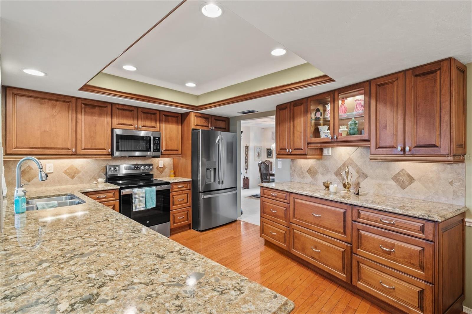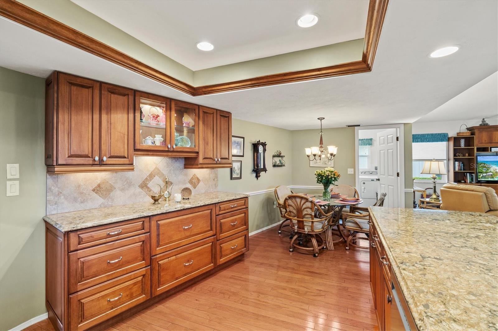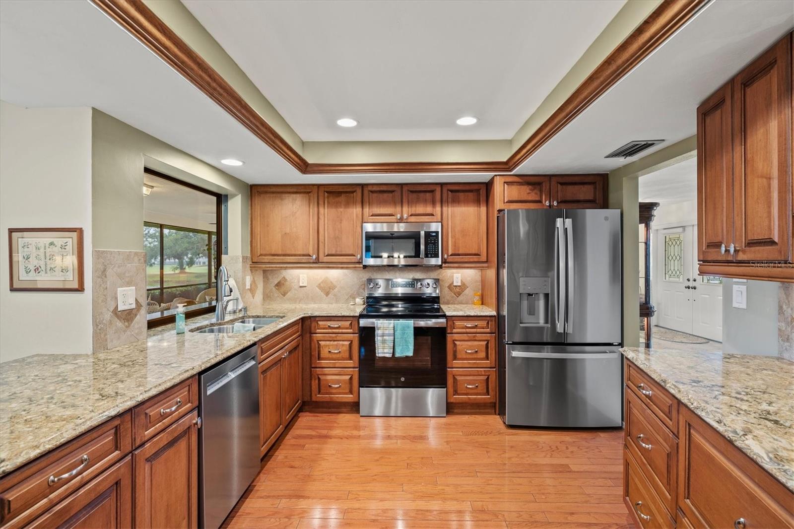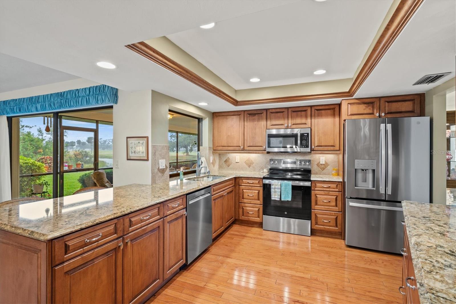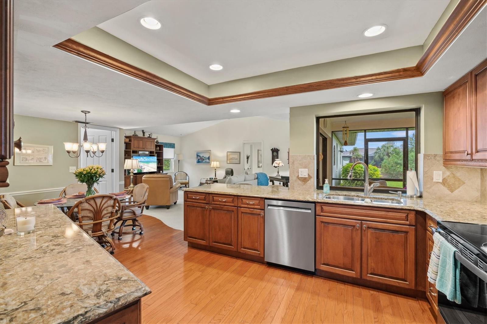 The remodeled kitchen is a true showstopper, featuring wood cabinets, granite countertops, new stainless steel appliances, and wood flooring, complemented by a pass-through window to the lanai--ideal for hosting gatherings. Additional conveniences include a laundry room with cabinets, a utility sink, and an included washer and dryer.