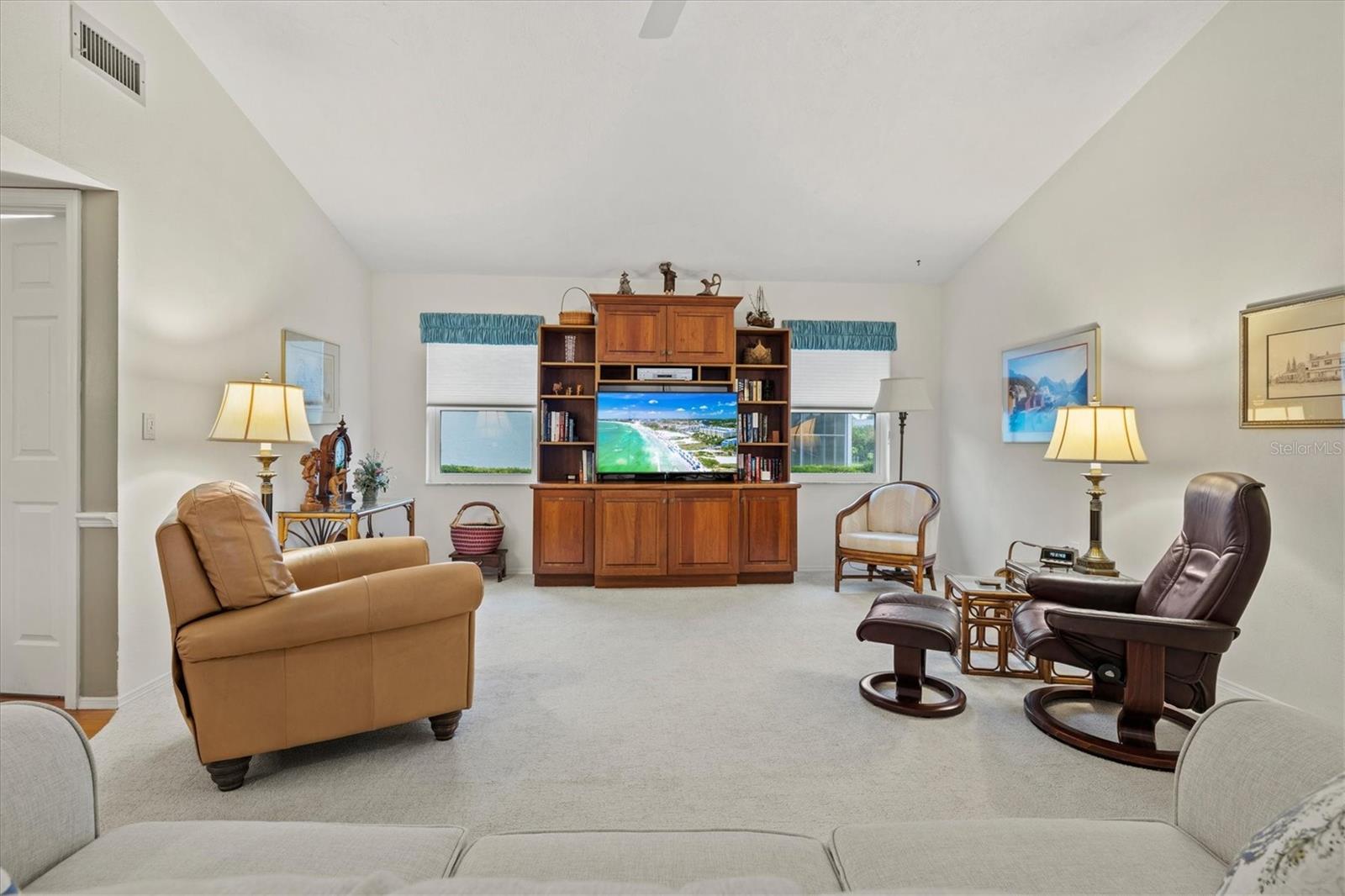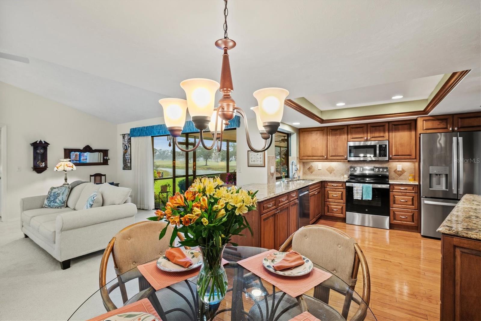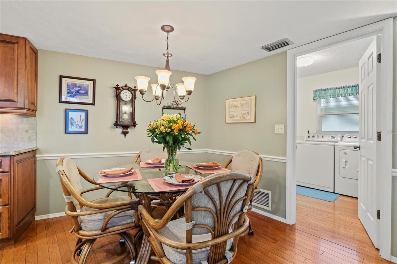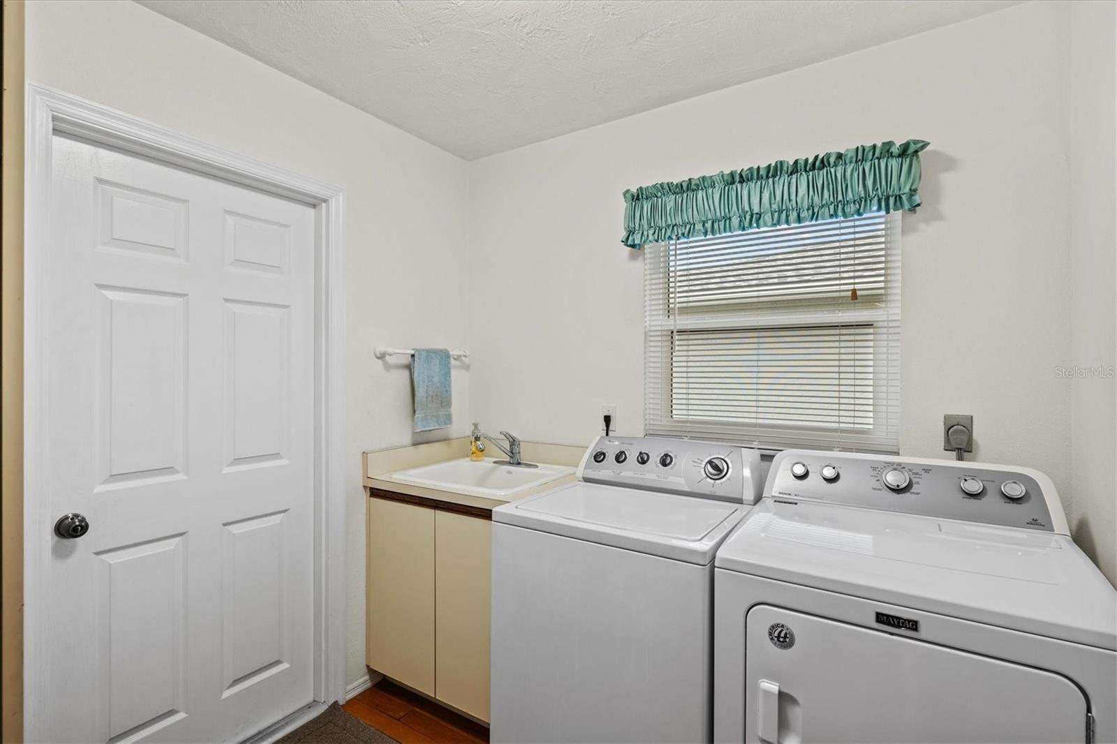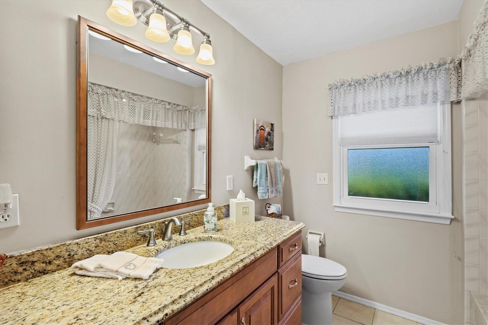 The remodeled kitchen is a true showstopper, featuring wood cabinets, granite countertops, new stainless steel appliances, and wood flooring, complemented by a pass-through window to the lanai--ideal for hosting gatherings. Additional conveniences include a laundry room with cabinets, a utility sink, and an included washer and dryer.