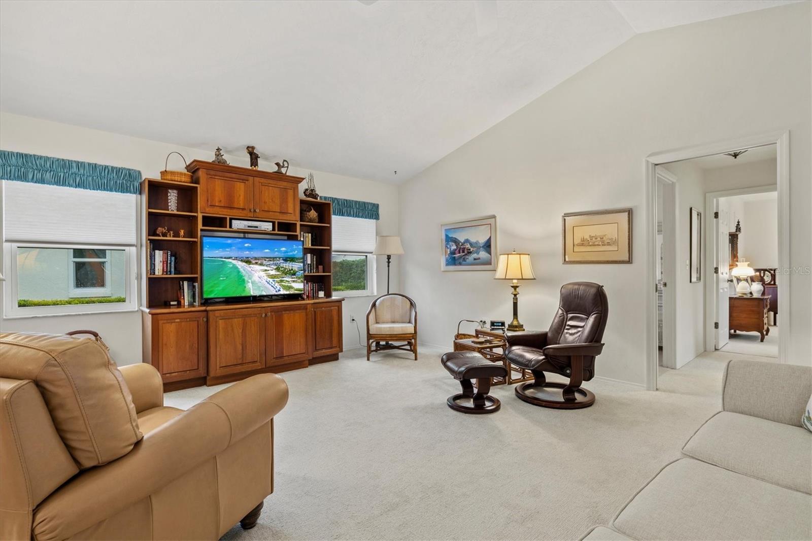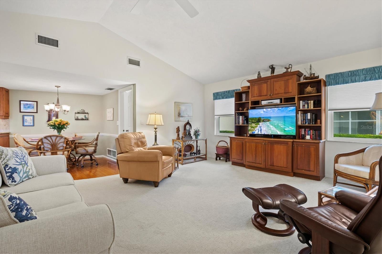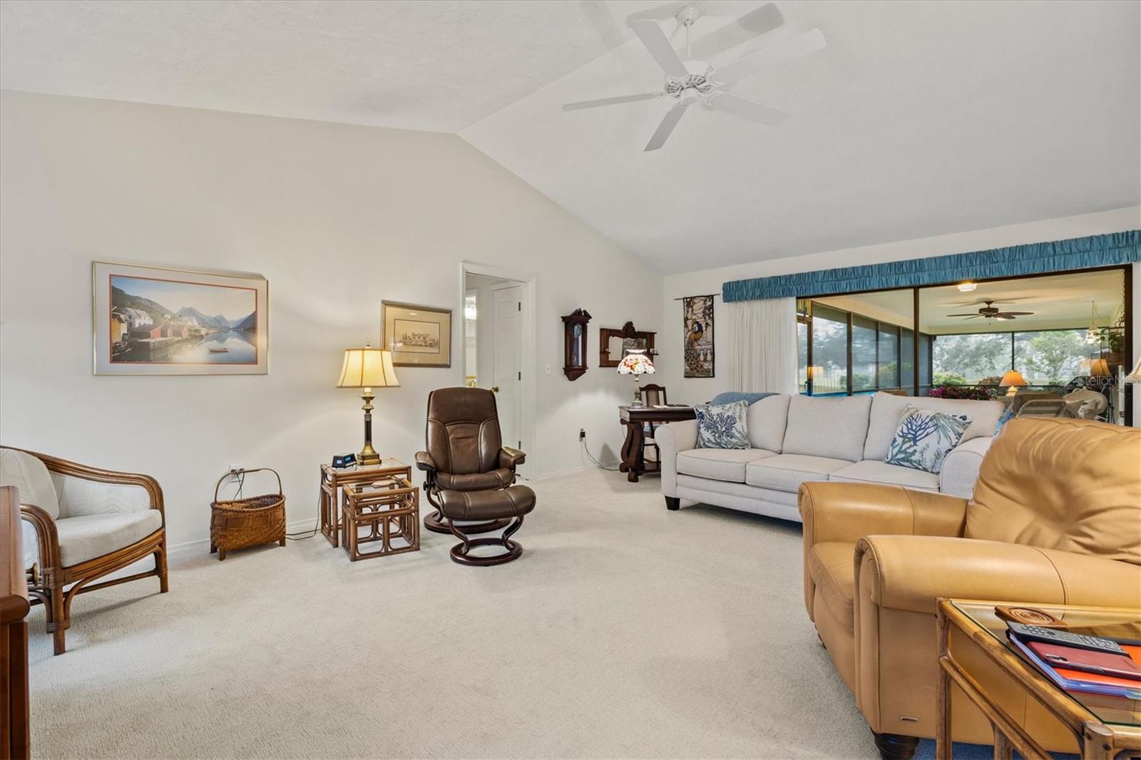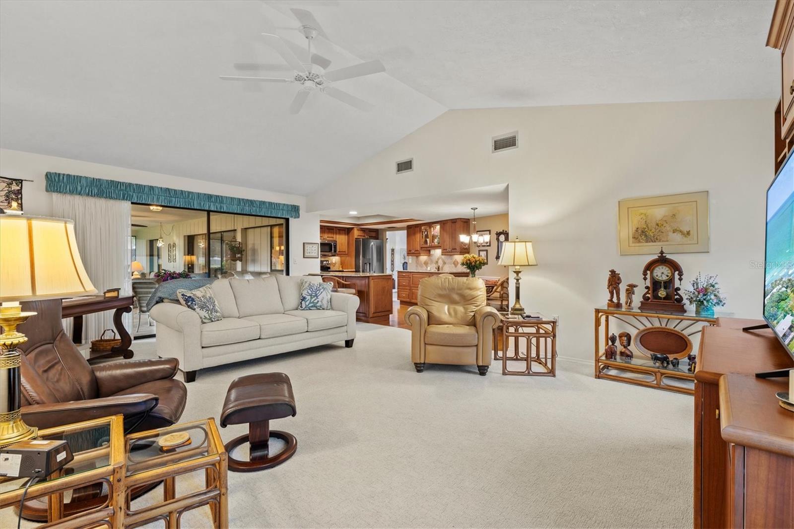 Boasting 2,109 interior square feet and 3,114 total square feet, this spacious single-family home features 3 oversized bedrooms, each with large walk-in closets, 2 bathrooms, and an oversized 2-car garage. The thoughtful layout includes a grand living room with soaring vaulted ceilings, a separate family room, and a formal dining room. The double-door front entry offers an inviting first impression, while the split-bedroom design ensures privacy, with the primary suite on one side of the home and the secondary bedrooms and bath on the other. The primary suite also features sliding doors leading to the expansive lanai.