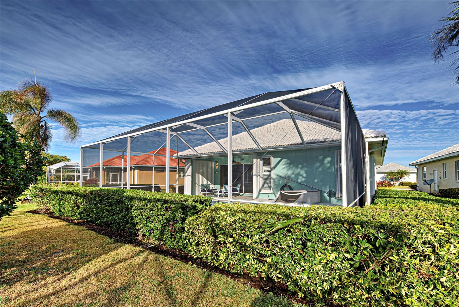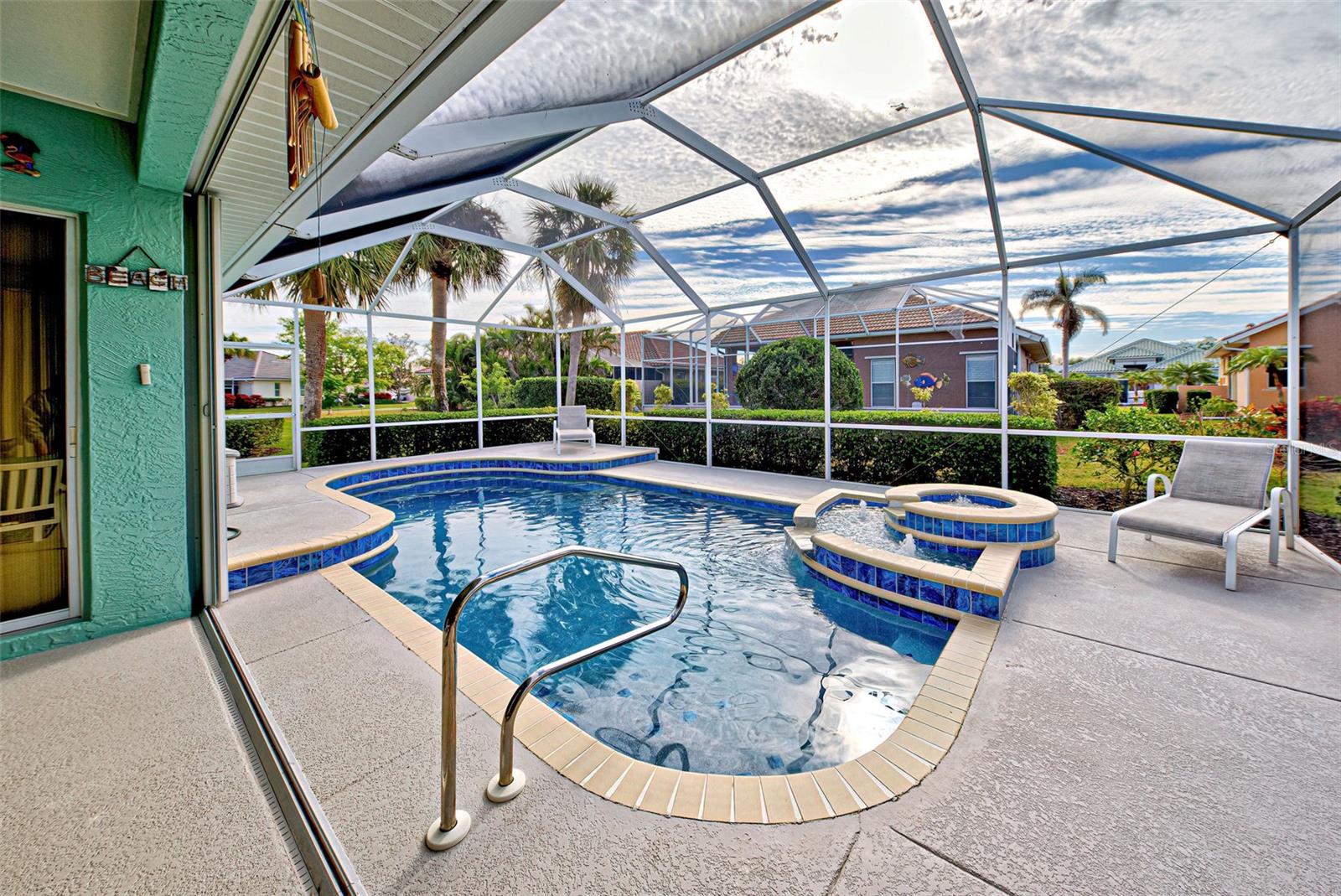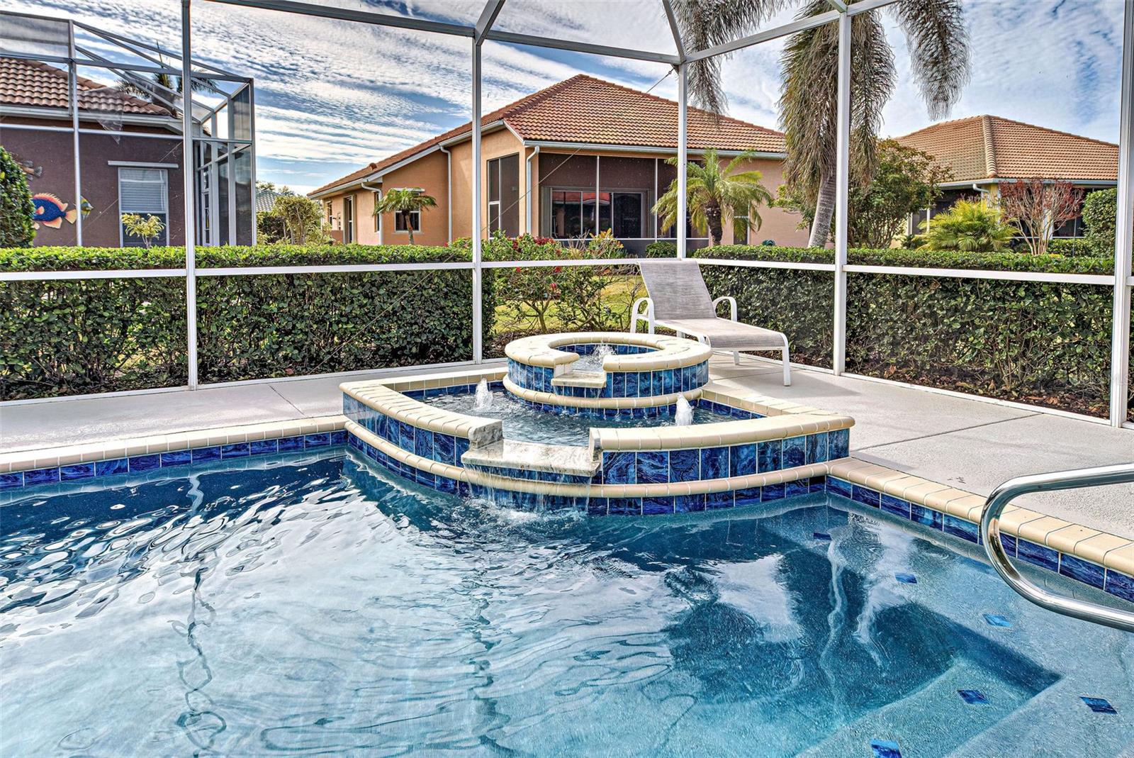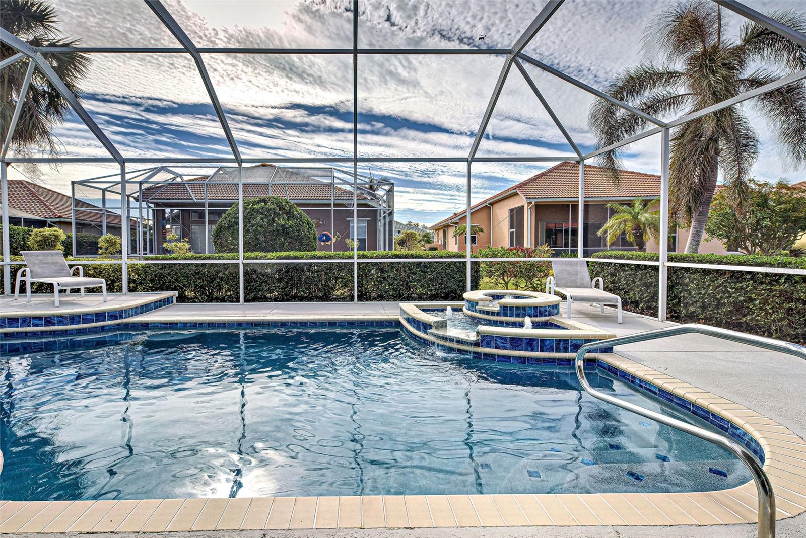 ***NEW PRICE***Nestled in the beautiful maintenance free community of The Lakes of Jacaranda, this J & J Victoria model offers a 3-bedroom, 2-bathroom, 2 car garage captivating pool home with an unparalleled blend of elegance. Enjoy the Florida lifestyle in this thoughtfully designed home that flawlessly accommodates both family and guests. Featuring a NEW ROOF in 2023, and newer AC 2020! As you enter through the glass lit double entry doors you are welcomed with a great room and dining room featuring crown molding, high ceilings and gorgeous tile floors. You will be immediately drawn to the beautiful saltwater pool with a waterfall/spa feature, newly refurbished pool surface and pool pump in 2022, and a newer pool heater 2021 for year round swimming. The updated kitchen boasts solid wood cabinets, granite countertops, stainless steel appliances, with a new dishwasher and refrigerator 2023, a convection stove, and solid hardwood bamboo flooring to complete the look. Bamboo flooring also graces all bedrooms. The master bedroom closet is equipped with a California style storage system. This home is truly well cared for and immaculate. The exterior of the home was newly painted in 2021 and a new garage door opener was installed in 2022. Additionally, permanent style accordion Hurricane shutters are in place. The community clubhouse is available for private functions, and features an oversized pool, tennis courts and walking trails along the lakes. Experience the warmth of a community where residents enjoy the sidewalks that wind through the neighborhood, picturesque surroundings, well-maintained amenities and active lifestyle. Conveniently located near the pristine beaches of Venice and Manasota Key, shopping, grocery, golfing, dining, and recreational activities. Schedule your private tour today and discover the unparalleled comfort and convenience that awaits you in The Lakes of Jacaranda.