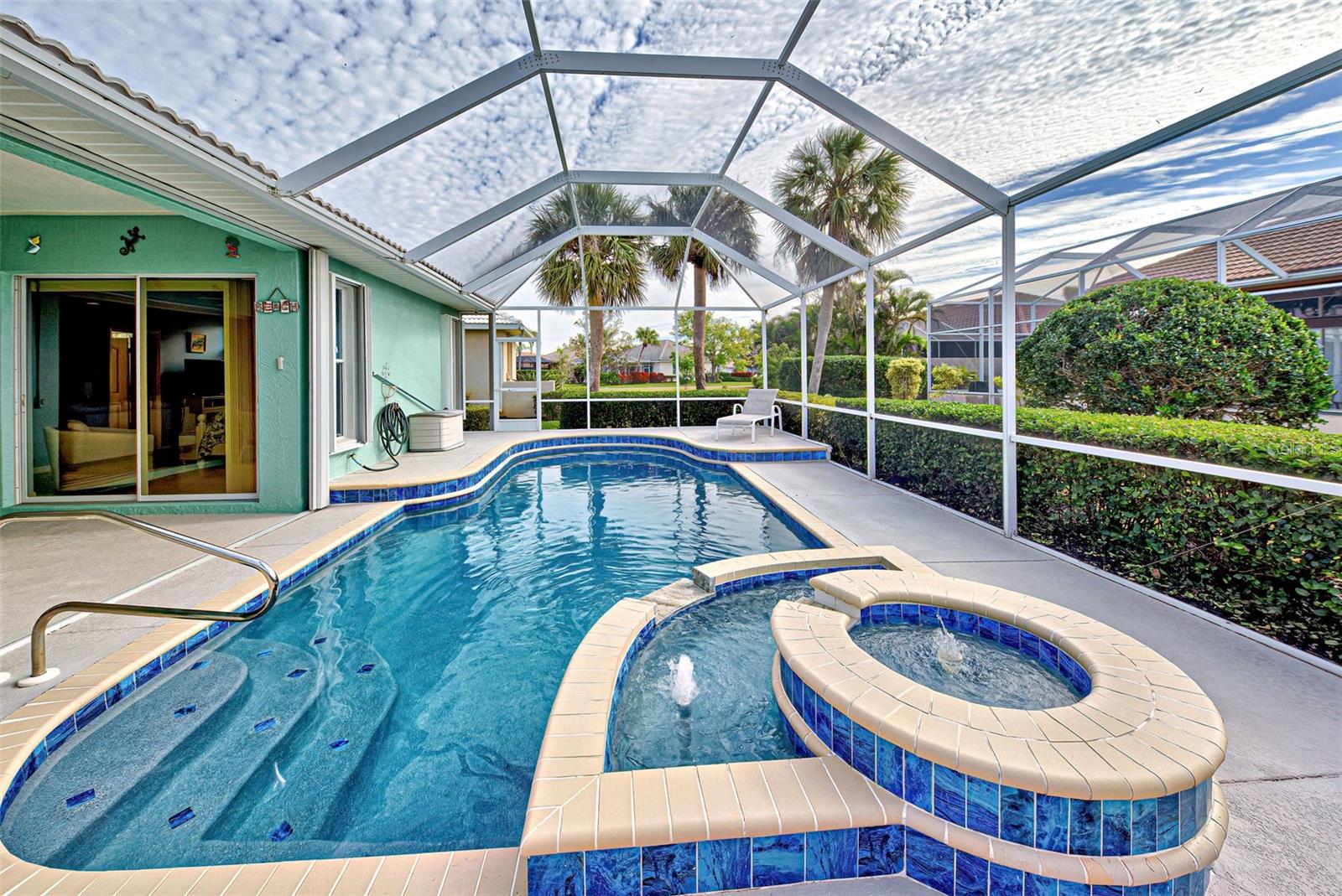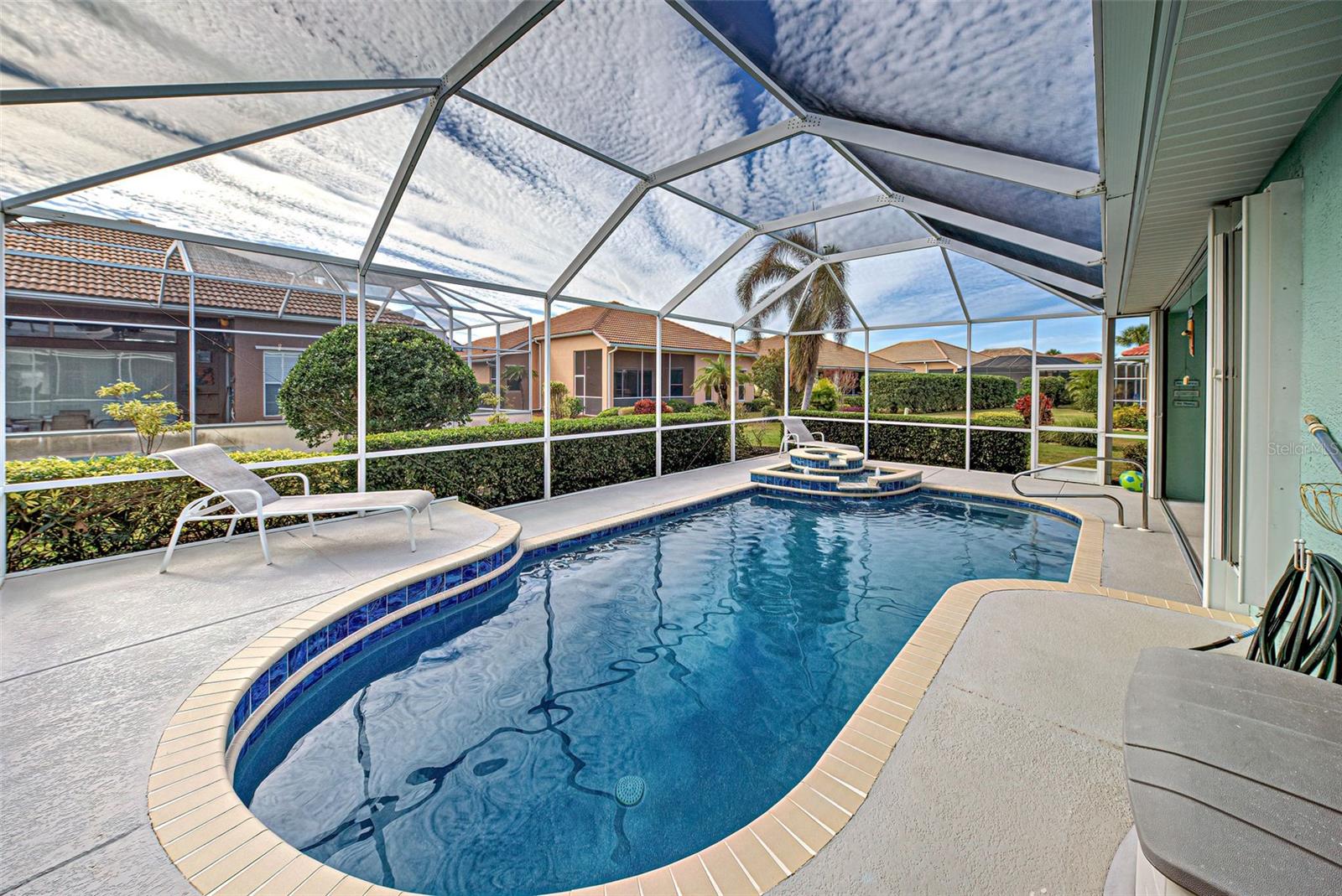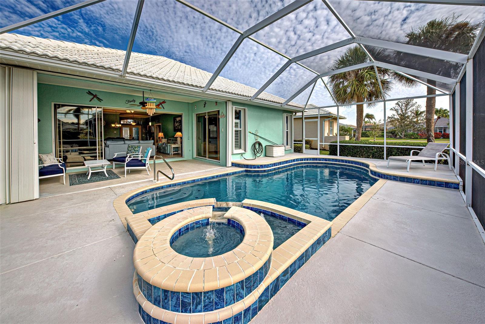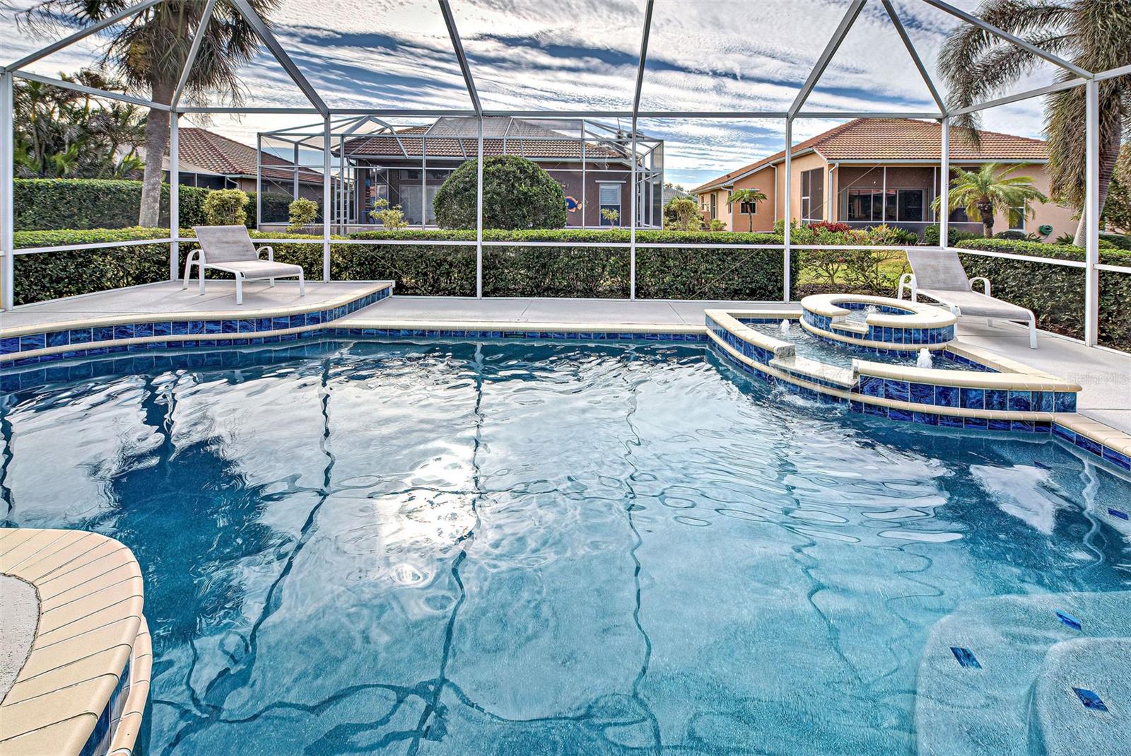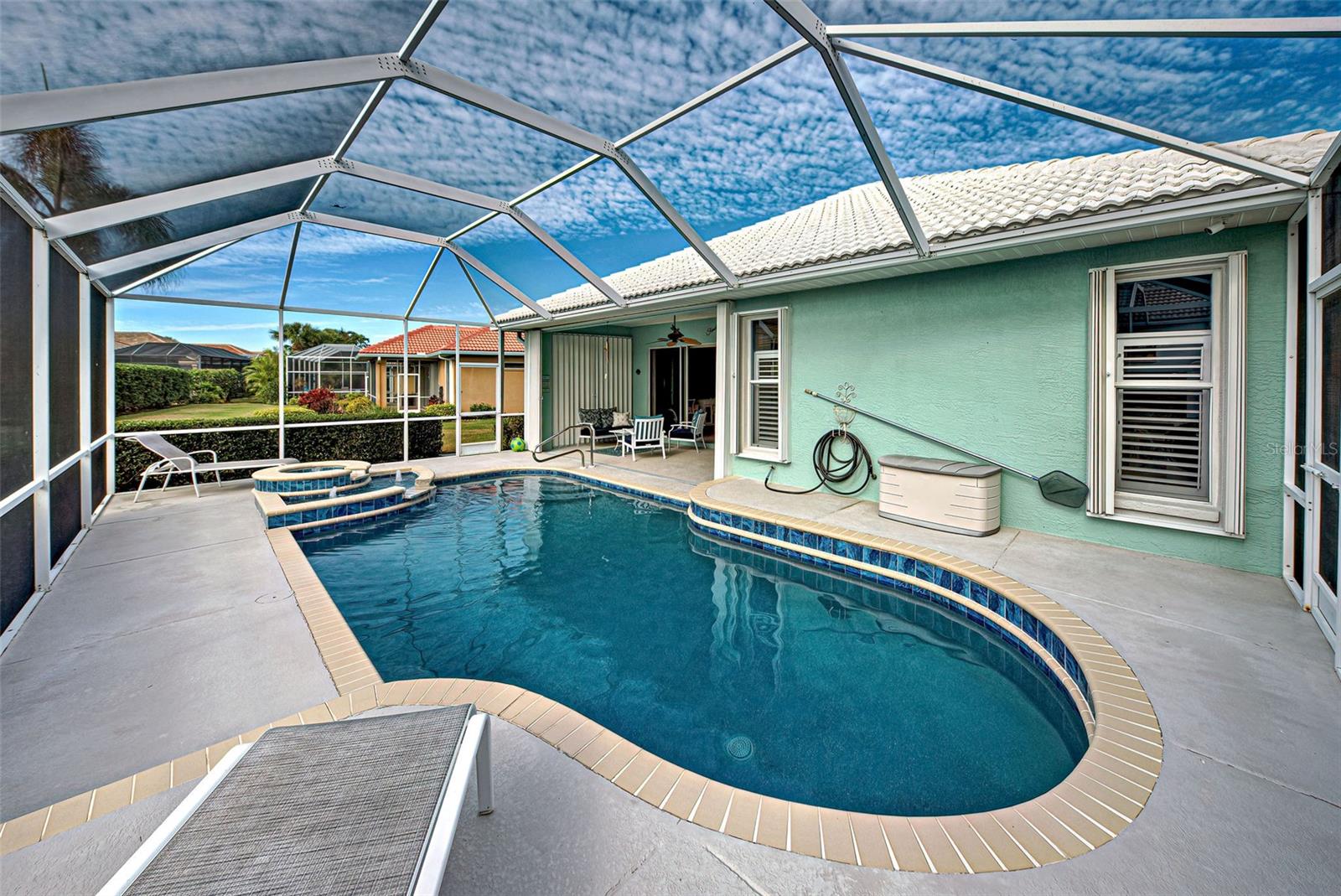 ***NEW PRICE***Nestled in the beautiful maintenance free community of The Lakes of Jacaranda, this J & J Victoria model offers a 3-bedroom, 2-bathroom, 2 car garage captivating pool home with an unparalleled blend of elegance. Enjoy the Florida lifestyle in this thoughtfully designed home that flawlessly accommodates both family and guests. Featuring a NEW ROOF in 2023, and newer AC 2020! As you enter through the glass lit double entry doors you are welcomed with a great room and dining room featuring crown molding, high ceilings and gorgeous tile floors. You will be immediately drawn to the beautiful saltwater pool with a waterfall/spa feature, newly refurbished pool surface and pool pump in 2022, and a newer pool heater 2021 for year round swimming. The updated kitchen boasts solid wood cabinets, granite countertops, stainless steel appliances, with a new dishwasher and refrigerator 2023, a convection stove, and solid hardwood bamboo flooring to complete the look. Bamboo flooring also graces all bedrooms. The master bedroom closet is equipped with a California style storage system. This home is truly well cared for and immaculate. The exterior of the home was newly painted in 2021 and a new garage door opener was installed in 2022. Additionally, permanent style accordion Hurricane shutters are in place. The community clubhouse is available for private functions, and features an oversized pool, tennis courts and walking trails along the lakes. Experience the warmth of a community where residents enjoy the sidewalks that wind through the neighborhood, picturesque surroundings, well-maintained amenities and active lifestyle. Conveniently located near the pristine beaches of Venice and Manasota Key, shopping, grocery, golfing, dining, and recreational activities. Schedule your private tour today and discover the unparalleled comfort and convenience that awaits you in The Lakes of Jacaranda.