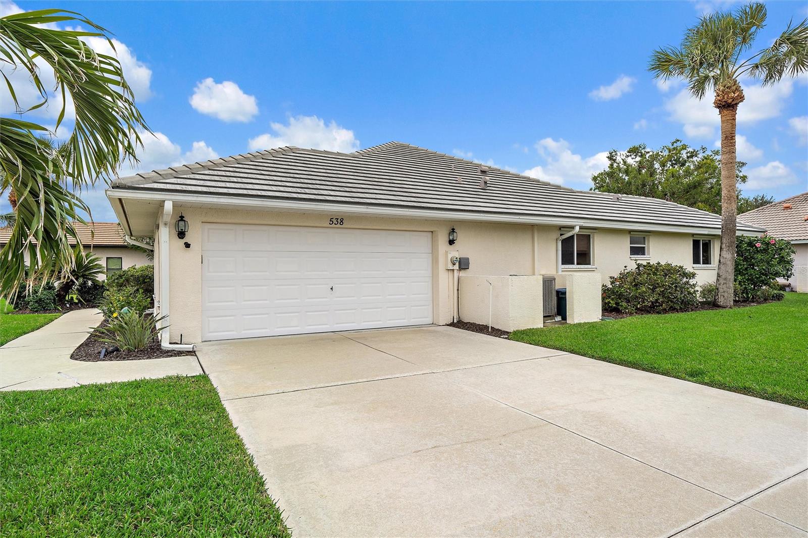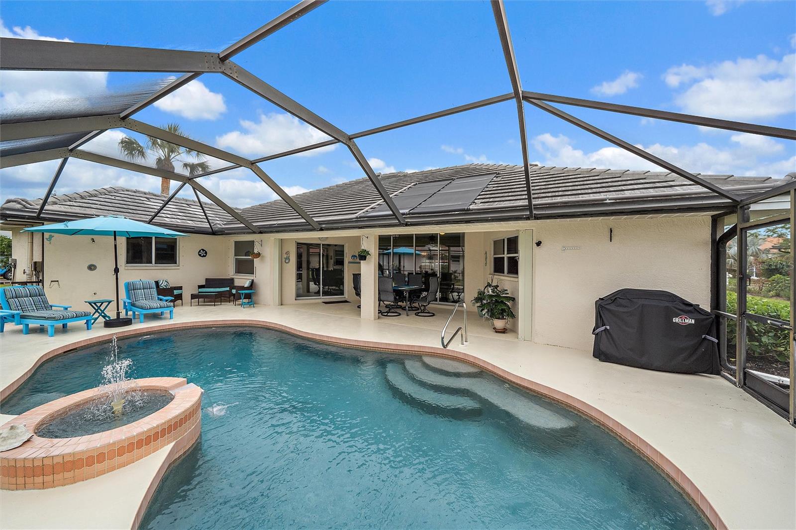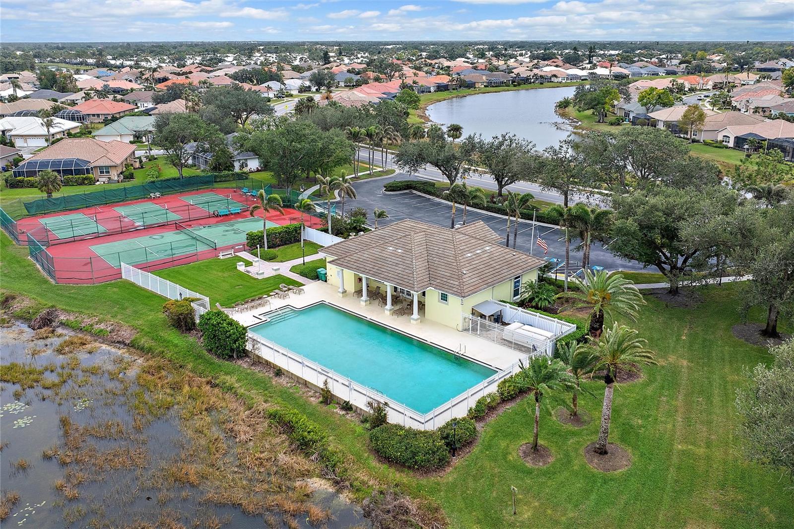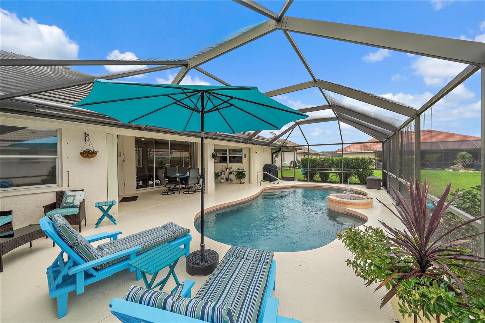 AMAZING PRICE on this stunning pool home located in the highly sought-after community of The Lakes of Jacaranda. This meticulously cared-for 3-bedroom, 2-bathroom home is move-in ready and boasts a newer tile roof (2021) along with hurricane protection windows and doors. The layout is open and bright! As you step through the front door, you'll be greeted by a recently painted living room with high ceilings and a lovely view of the pool and spacious lanai. The lanai offers plenty of room for outdoor living and comes equipped with peace-of-mind hurricane shield screens. The kitchen is a delight, featuring beautiful granite countertops, newer appliances, white cabinets, and a stylish tile backsplash. You'll also appreciate that there is no carpet in the home, making maintenance a breeze. Take note of the newer ceiling fans in all the bedrooms, living room, kitchen, and lanai. The garage has 85 Feet of storage shelving! The garage floor is epoxy. The split bedroom layout is great, and all the bedrooms are generously sized. Care Notes: roof 2021, HVAC 2021,new electrical panel 2023, irrigation well pump 2022, custom blinds 2023, all appliances 2020 or newer, freshly painted including ceilings 2023, pool deck painted 2025, new solar pool panels 2025. This HOME at 538 Laurel Cherry is a peach of a home!