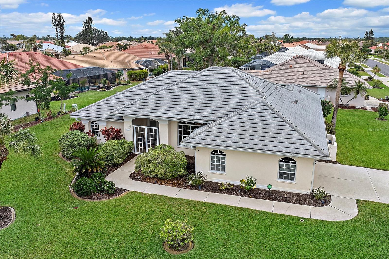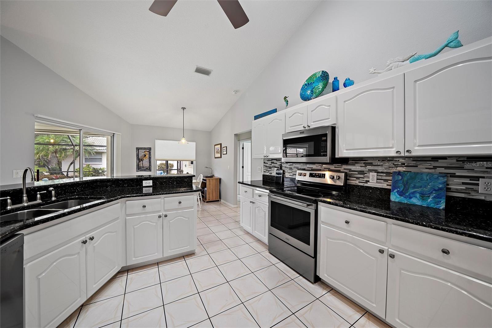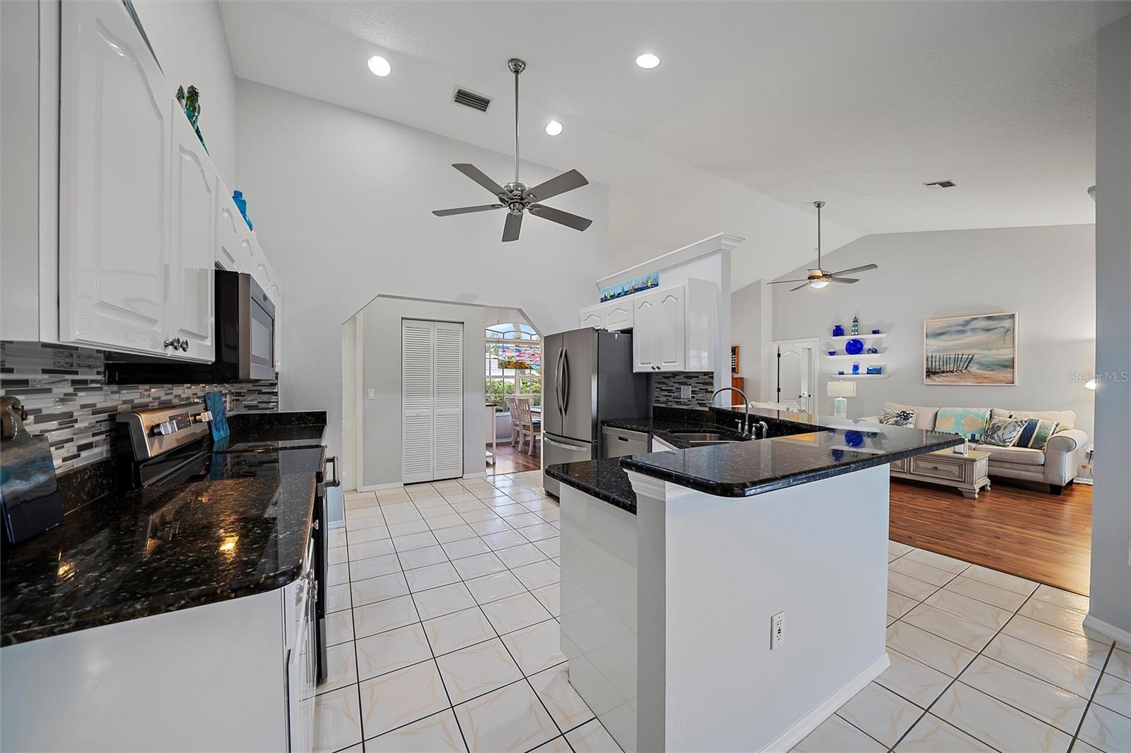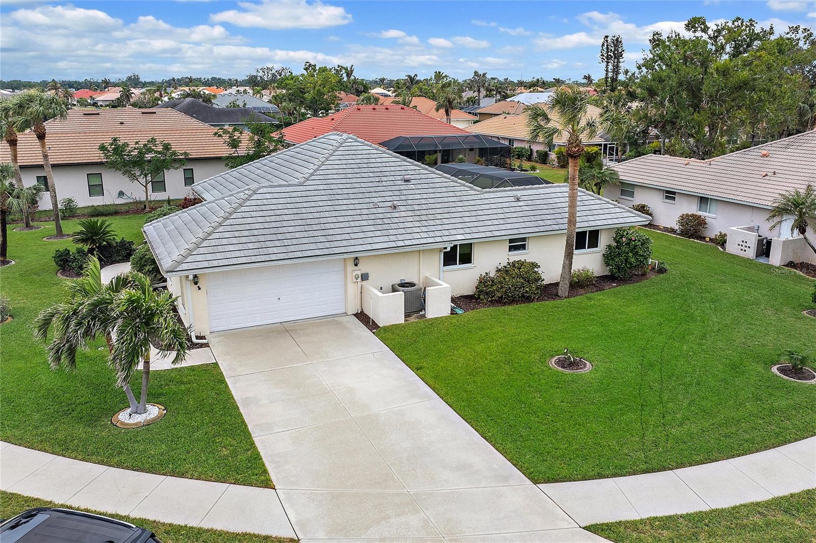 AMAZING PRICE on this stunning pool home located in the highly sought-after community of The Lakes of Jacaranda. This meticulously cared-for 3-bedroom, 2-bathroom home is move-in ready and boasts a newer tile roof (2021) along with hurricane protection windows and doors. The layout is open and bright! As you step through the front door, you'll be greeted by a recently painted living room with high ceilings and a lovely view of the pool and spacious lanai. The lanai offers plenty of room for outdoor living and comes equipped with peace-of-mind hurricane shield screens. The kitchen is a delight, featuring beautiful granite countertops, newer appliances, white cabinets, and a stylish tile backsplash. You'll also appreciate that there is no carpet in the home, making maintenance a breeze. Take note of the newer ceiling fans in all the bedrooms, living room, kitchen, and lanai. The garage has 85 Feet of storage shelving! The garage floor is epoxy. The split bedroom layout is great, and all the bedrooms are generously sized. Care Notes: roof 2021, HVAC 2021,new electrical panel 2023, irrigation well pump 2022, custom blinds 2023, all appliances 2020 or newer, freshly painted including ceilings 2023, pool deck painted 2025, new solar pool panels 2025. This HOME at 538 Laurel Cherry is a peach of a home!