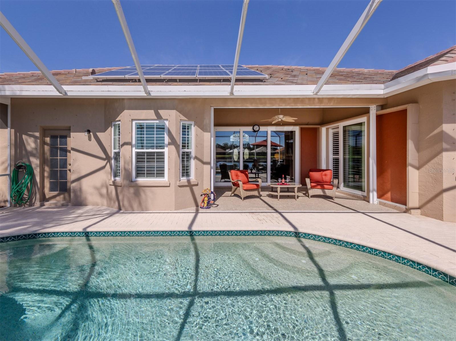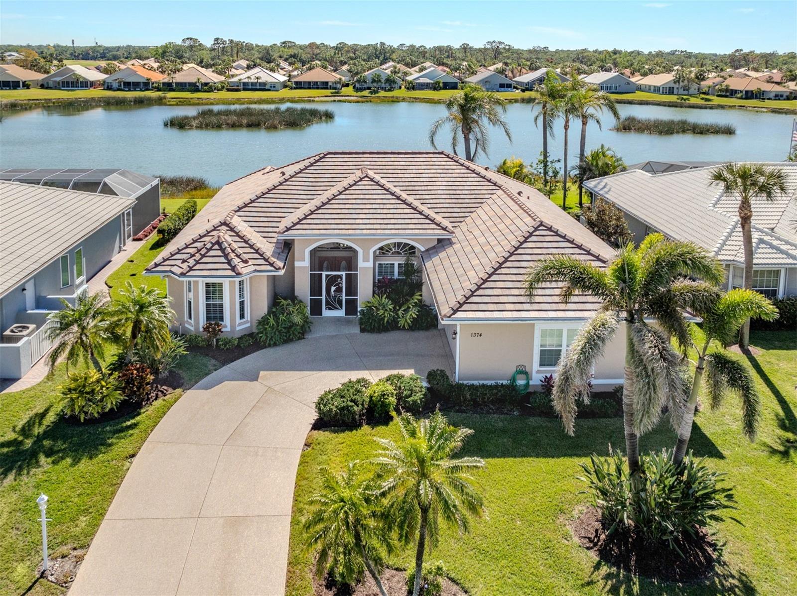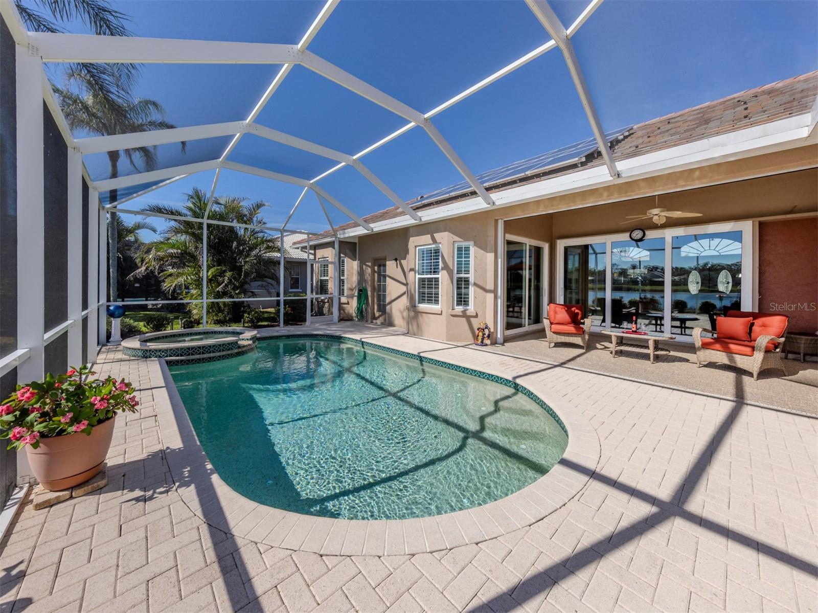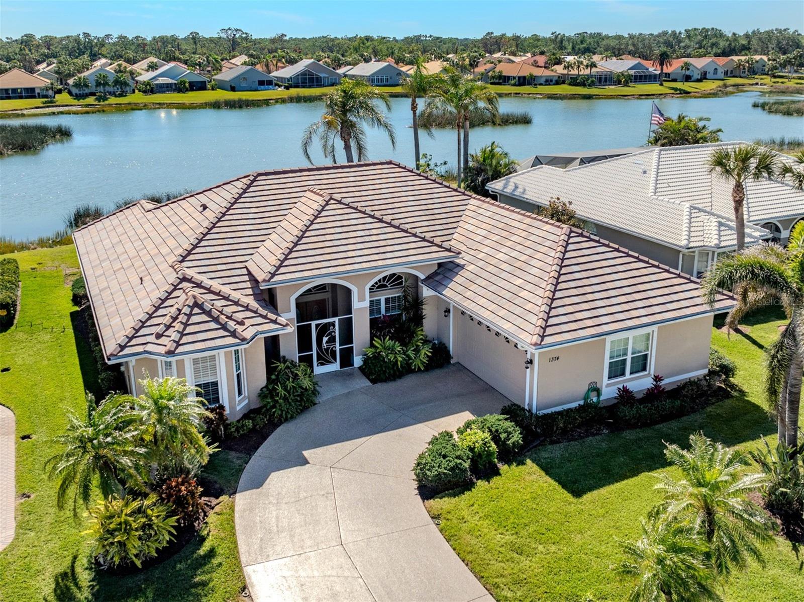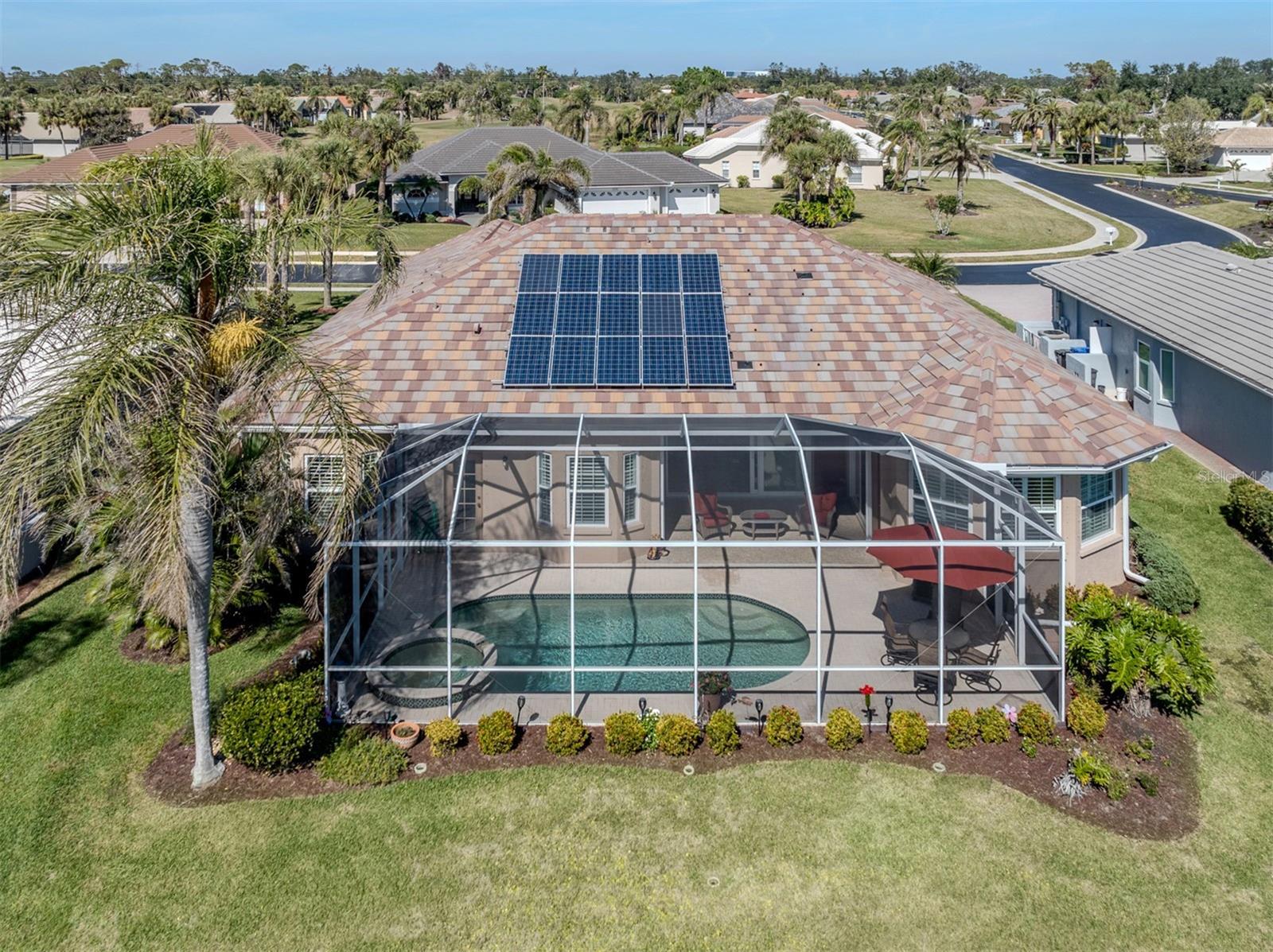 THIS WATER VIEW IS AMAZING!!! This beautifully meticulously maintained 2,448-square-foot, FULL HURRICANE PROTECTION and NO FLOOD ZONE, PAID OFF SOLAR PANELS, boasts four-bedroom, two-bath, oversized two-car garage pool home with breathtaking long water south views in the desirable Waterford Golf Club community in the heart of Venice. This stunningly designed residence features a split floor plan, providing plenty of privacy and a functional flow between the spaces. Updates include 2024 water heater, 2022 air conditioner, 2021 re-roof, 2018 hurricane sliders, 2015-2014 electric hurricane shutter on lanai and Lexan hurricane shutters for house, 2010 solar panels, custom plantation shutters and porcelain tile throughout, plenty of storage, and more! Step inside this home and your eyes are drawn to 14-foot ceilings throughout, contributing to its open, airy atmosphere, helping to maximize natural light with amazing water views. With windows that frame the ever-dancing water views, the great room becomes a canvas of nature's art, ideal for those quiet moments with a book or lively gathering with friends. The kitchen overlooks the great room and boasts solid wood cabinetry, granite countertops, newer appliances, breakfast bar, island and built-in desk so the chef can plan those special meals. The formal dining room is off the kitchen making those special meals a breeze. Just off the kitchen a caf which is an ideal spot to enjoy the birds dancing on the water and have a quick bite before heading off to the golf course. The extended primary suite includes triple sliding glass doors, bay windows and private en suite. The spa-like private en suite is spacious and boasts dual walk-in closets, dual sinks, garden tub and large walk-in shower. The second bedroom is at the front of the home and could easily double as an office with private access to the main en suite. The third and fourth bedrooms are at the back of the home near the second full bath that doubles as a pool bath and includes a hall pocket door creating a private tropical oasis for guests or the ideal space for a blended family. The fourth bedroom boasts a Murphy bed with matching desk and large closet making this space useable for day-to-day living. The large laundry room is just off the kitchen, with extra cabinetry, storage, utility sink and leads to the oversized garage. In the garage, high ceilings, pull-down attic stairs, cabinetry and rear door access to the backyard. Open the pocketing sliders in the living room and caf to seamlessly extend your living space outside to the large, covered lanai. The OVERSIZED extended paver lanai includes a pool bath access, covered and open lanai space and electric drop-down hurricane shutter. Not in a flood zone, one low HOA fee of $2,165 annually and no CDD. Waterford offers 27 holes of championship golf, a heated pool, lighted Har-Tru tennis courts, pickleball, social room with kitchen, dance floor and fitness center. After a day of golf enjoy lunch at the club with no restaurant minimums. Membership to Waterford Golf Club is not required. Easy access to Interstate 75, U.S. 41, pristine Gulf of Mexico beaches, shopping, dining, medical and the new Sarasota Memorial Hospital.