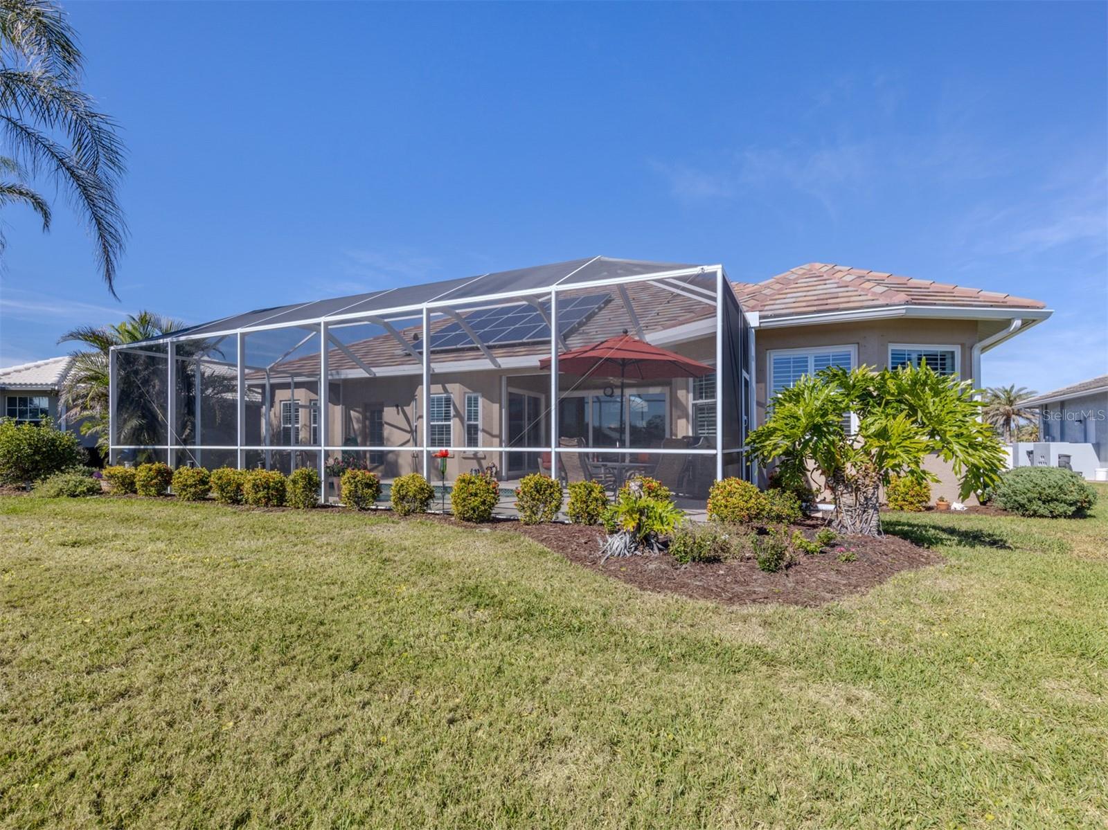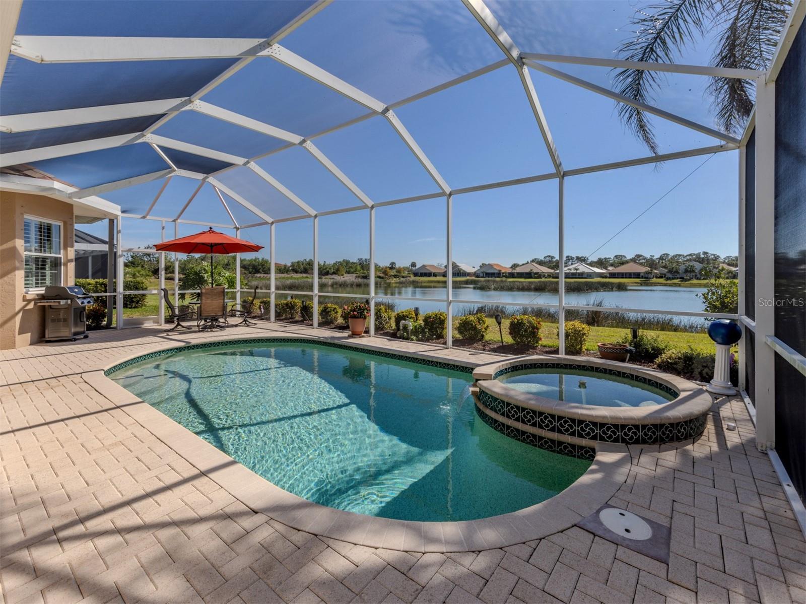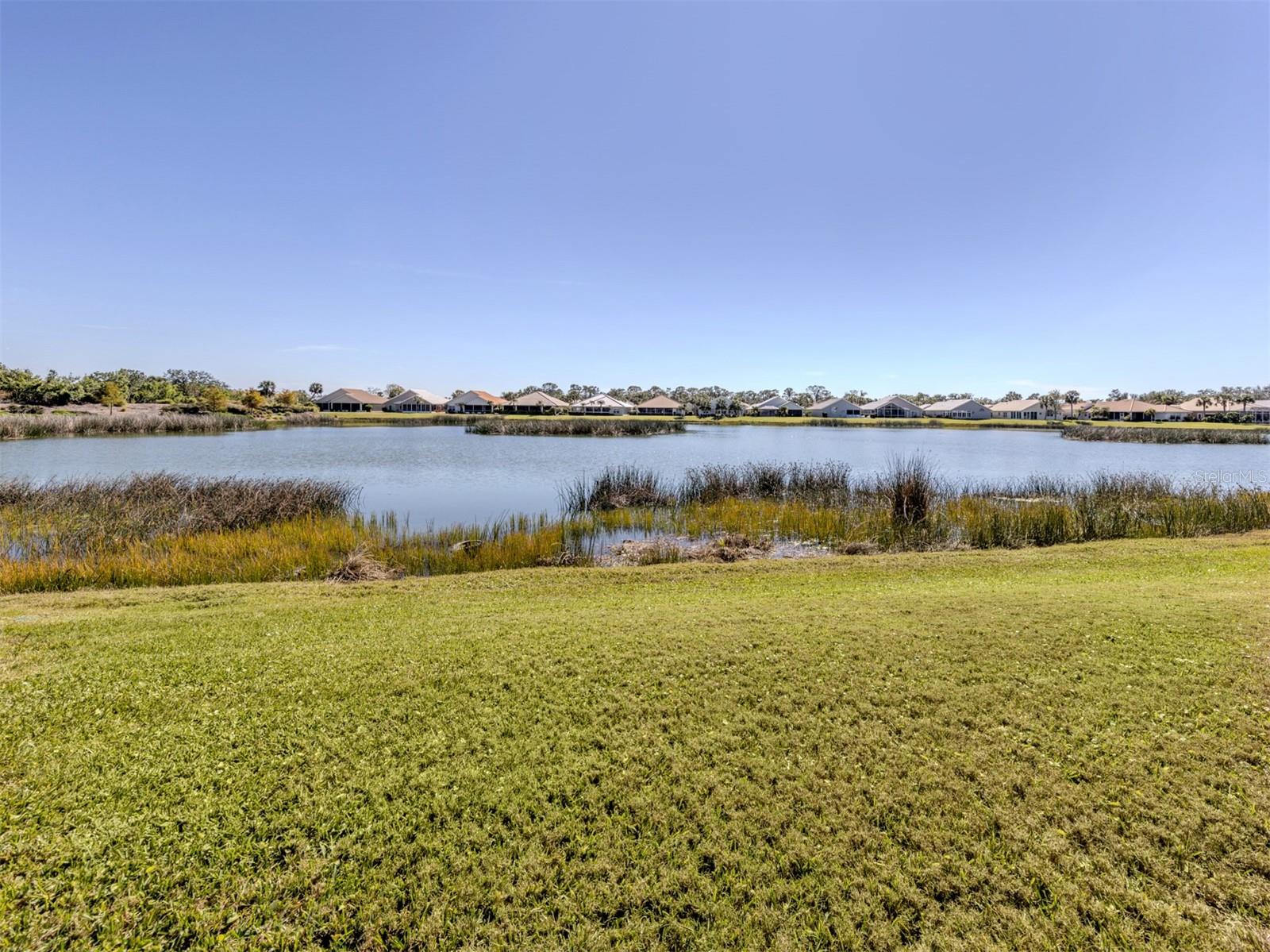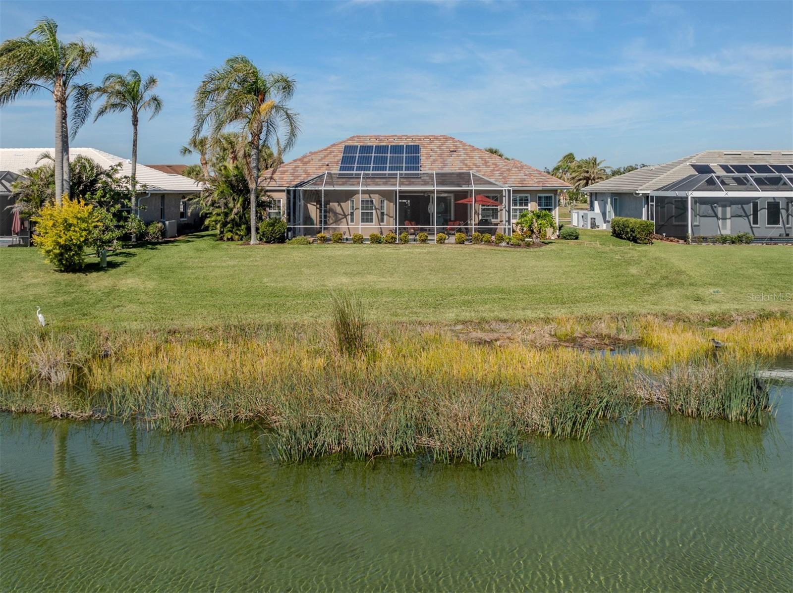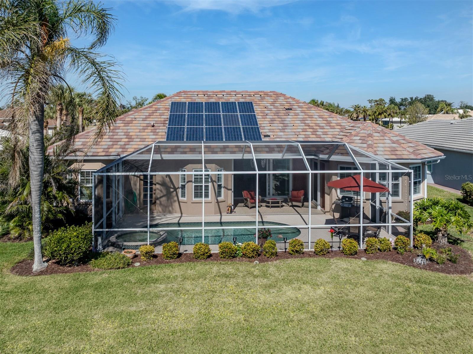THIS WATER VIEW IS AMAZING!!! This beautifully meticulously maintained 2,448-square-foot, FULL HURRICANE PROTECTION and NO FLOOD ZONE, PAID OFF SOLAR PANELS, boasts four-bedroom, two-bath, oversized two-car garage pool home with breathtaking long water south views in the desirable Waterford Golf Club community in the heart of Venice. This stunningly designed residence features a split floor plan, providing plenty of privacy and a functional flow between the spaces. Updates include 2024 water heater, 2022 air conditioner, 2021 re-roof, 2018 hurricane sliders, 2015-2014 electric hurricane shutter on lanai and Lexan hurricane shutters for house, 2010 solar panels, custom plantation shutters and porcelain tile throughout, plenty of storage, and more! Step inside this home and your eyes are drawn to 14-foot ceilings throughout, contributing to its open, airy atmosphere, helping to maximize natural light with amazing water views. With windows that frame the ever-dancing water views, the great room becomes a canvas of nature's art, ideal for those quiet moments with a book or lively gathering with friends. The kitchen overlooks the great room and boasts solid wood cabinetry, granite countertops, newer appliances, breakfast bar, island and built-in desk so the chef can plan those special meals. The formal dining room is off the kitchen making those special meals a breeze. Just off the kitchen a caf which is an ideal spot to enjoy the birds dancing on the water and have a quick bite before heading off to the golf course. The extended primary suite includes triple sliding glass doors, bay windows and private en suite. The spa-like private en suite is spacious and boasts dual walk-in closets, dual sinks, garden tub and large walk-in shower. The second bedroom is at the front of the home and could easily double as an office with private access to the main en suite. The third and fourth bedrooms are at the back of the home near the second full bath that doubles as a pool bath and includes a hall pocket door creating a private tropical oasis for guests or the ideal space for a blended family. The fourth bedroom boasts a Murphy bed with matching desk and large closet making this space useable for day-to-day living. The large laundry room is just off the kitchen, with extra cabinetry, storage, utility sink and leads to the oversized garage. In the garage, high ceilings, pull-down attic stairs, cabinetry and rear door access to the backyard. Open the pocketing sliders in the living room and caf to seamlessly extend your living space outside to the large, covered lanai. The OVERSIZED extended paver lanai includes a pool bath access, covered and open lanai space and electric drop-down hurricane shutter. Not in a flood zone, one low HOA fee of $2,165 annually and no CDD. Waterford offers 27 holes of championship golf, a heated pool, lighted Har-Tru tennis courts, pickleball, social room with kitchen, dance floor and fitness center. After a day of golf enjoy lunch at the club with no restaurant minimums. Membership to Waterford Golf Club is not required. Easy access to Interstate 75, U.S. 41, pristine Gulf of Mexico beaches, shopping, dining, medical and the new Sarasota Memorial Hospital.