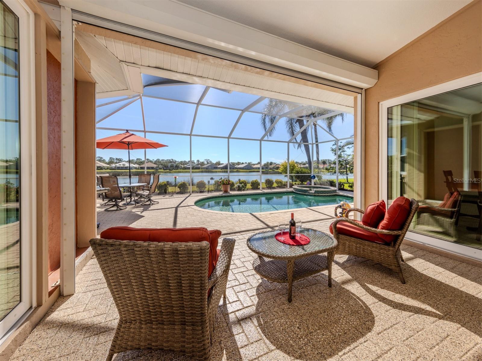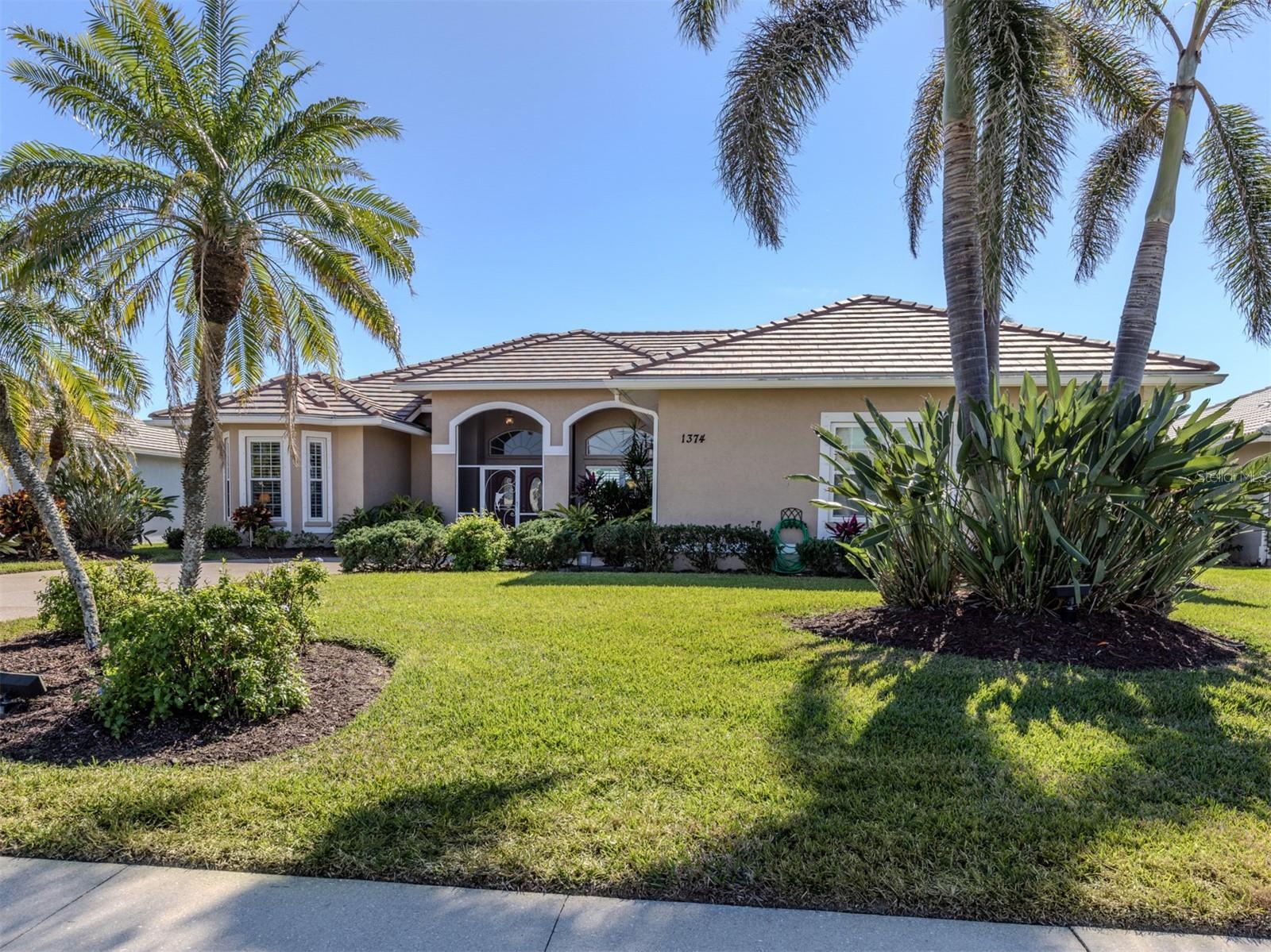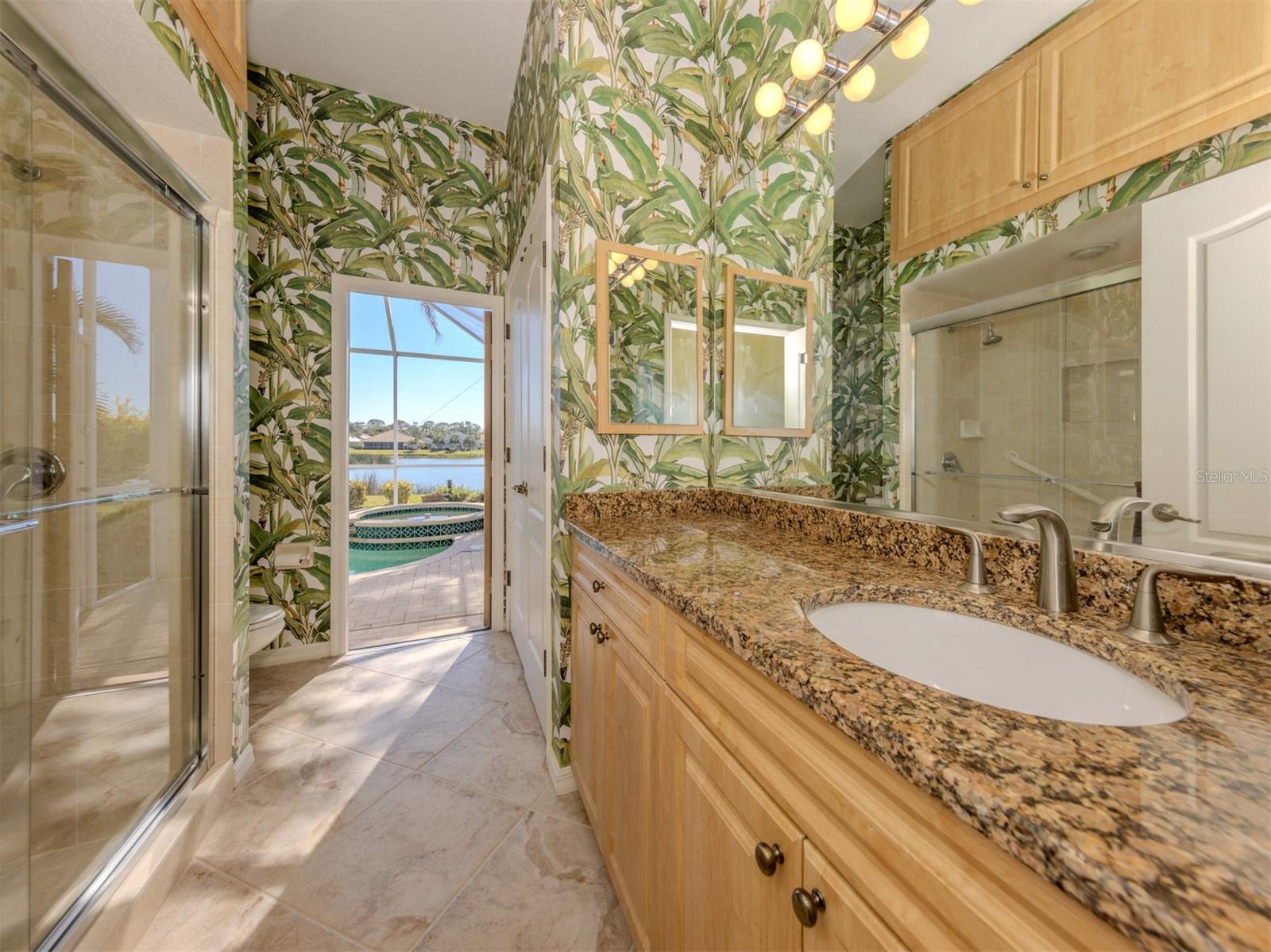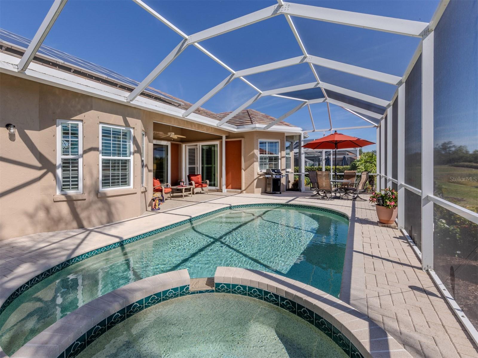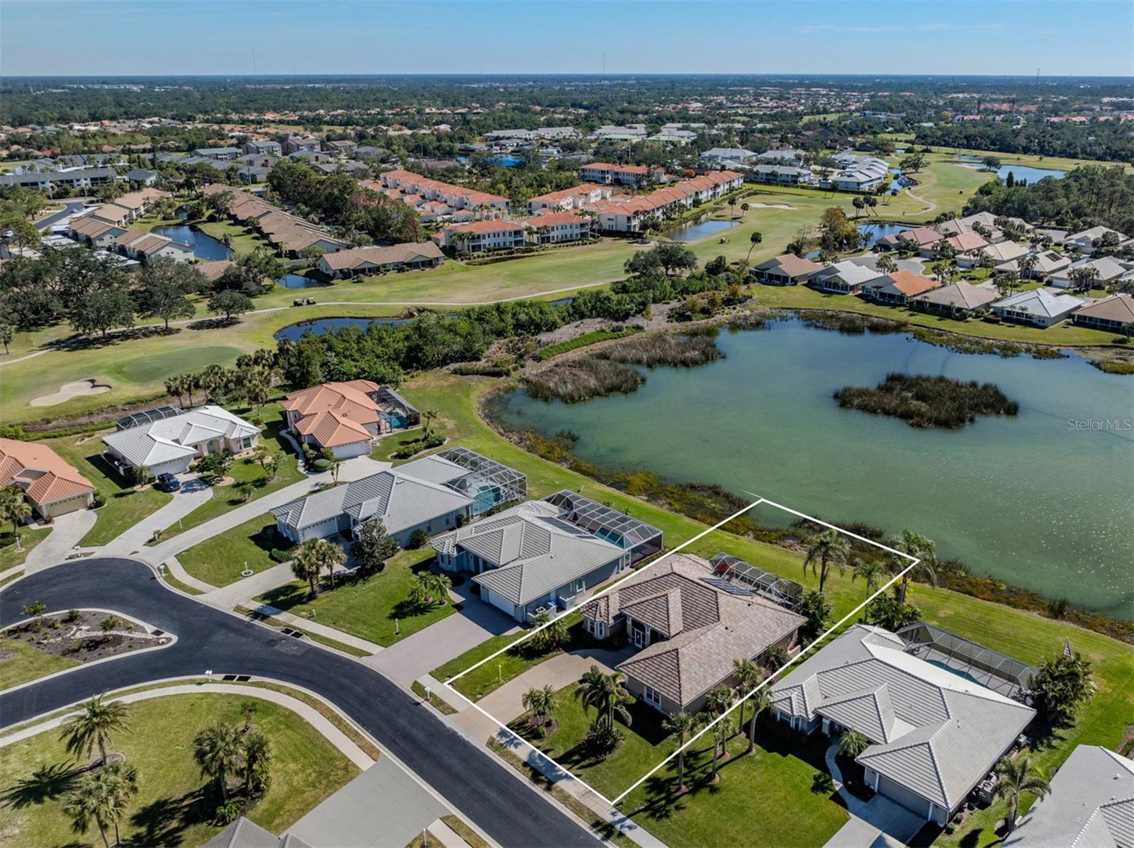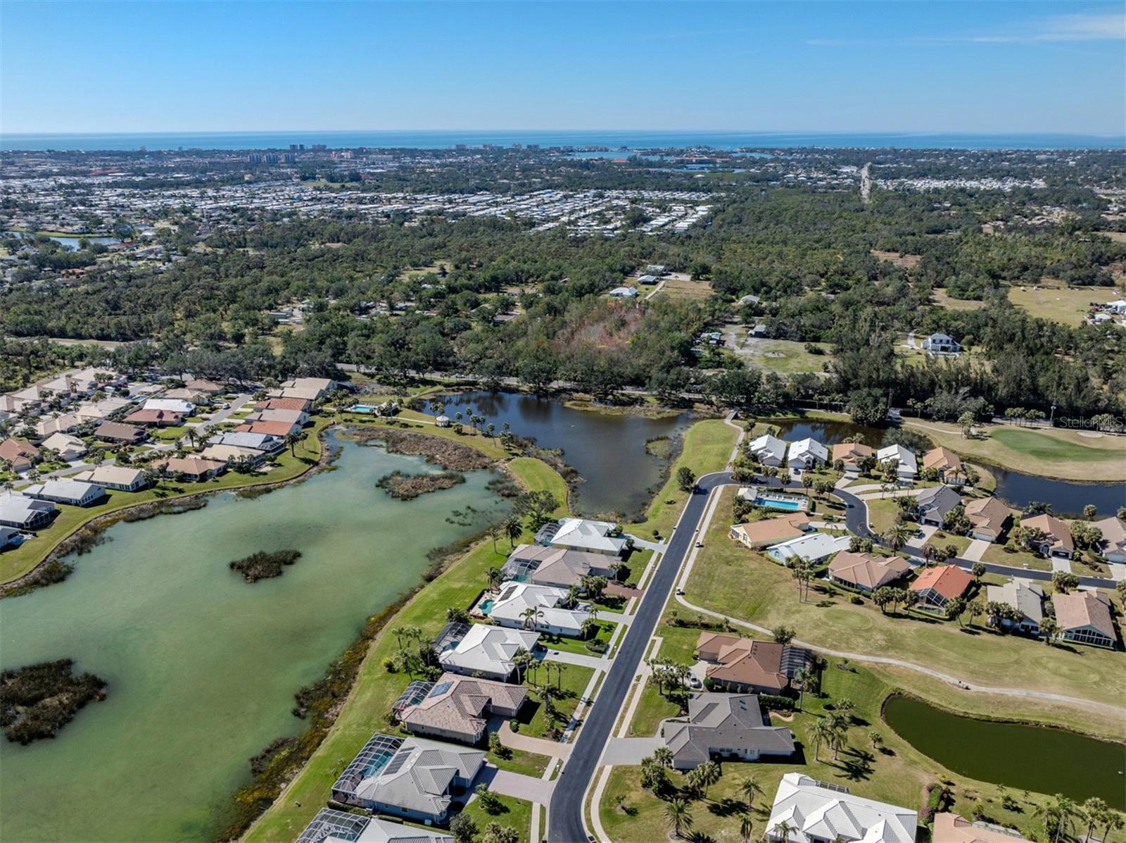 THIS WATER VIEW IS AMAZING!!! This beautifully meticulously maintained 2,448-square-foot, FULL HURRICANE PROTECTION and NO FLOOD ZONE, PAID OFF SOLAR PANELS, boasts four-bedroom, two-bath, oversized two-car garage pool home with breathtaking long water south views in the desirable Waterford Golf Club community in the heart of Venice. This stunningly designed residence features a split floor plan, providing plenty of privacy and a functional flow between the spaces. Updates include 2024 water heater, 2022 air conditioner, 2021 re-roof, 2018 hurricane sliders, 2015-2014 electric hurricane shutter on lanai and Lexan hurricane shutters for house, 2010 solar panels, custom plantation shutters and porcelain tile throughout, plenty of storage, and more! Step inside this home and your eyes are drawn to 14-foot ceilings throughout, contributing to its open, airy atmosphere, helping to maximize natural light with amazing water views. With windows that frame the ever-dancing water views, the great room becomes a canvas of nature's art, ideal for those quiet moments with a book or lively gathering with friends. The kitchen overlooks the great room and boasts solid wood cabinetry, granite countertops, newer appliances, breakfast bar, island and built-in desk so the chef can plan those special meals. The formal dining room is off the kitchen making those special meals a breeze. Just off the kitchen a caf which is an ideal spot to enjoy the birds dancing on the water and have a quick bite before heading off to the golf course. The extended primary suite includes triple sliding glass doors, bay windows and private en suite. The spa-like private en suite is spacious and boasts dual walk-in closets, dual sinks, garden tub and large walk-in shower. The second bedroom is at the front of the home and could easily double as an office with private access to the main en suite. The third and fourth bedrooms are at the back of the home near the second full bath that doubles as a pool bath and includes a hall pocket door creating a private tropical oasis for guests or the ideal space for a blended family. The fourth bedroom boasts a Murphy bed with matching desk and large closet making this space useable for day-to-day living. The large laundry room is just off the kitchen, with extra cabinetry, storage, utility sink and leads to the oversized garage. In the garage, high ceilings, pull-down attic stairs, cabinetry and rear door access to the backyard. Open the pocketing sliders in the living room and caf to seamlessly extend your living space outside to the large, covered lanai. The OVERSIZED extended paver lanai includes a pool bath access, covered and open lanai space and electric drop-down hurricane shutter. Not in a flood zone, one low HOA fee of $2,165 annually and no CDD. Waterford offers 27 holes of championship golf, a heated pool, lighted Har-Tru tennis courts, pickleball, social room with kitchen, dance floor and fitness center. After a day of golf enjoy lunch at the club with no restaurant minimums. Membership to Waterford Golf Club is not required. Easy access to Interstate 75, U.S. 41, pristine Gulf of Mexico beaches, shopping, dining, medical and the new Sarasota Memorial Hospital.