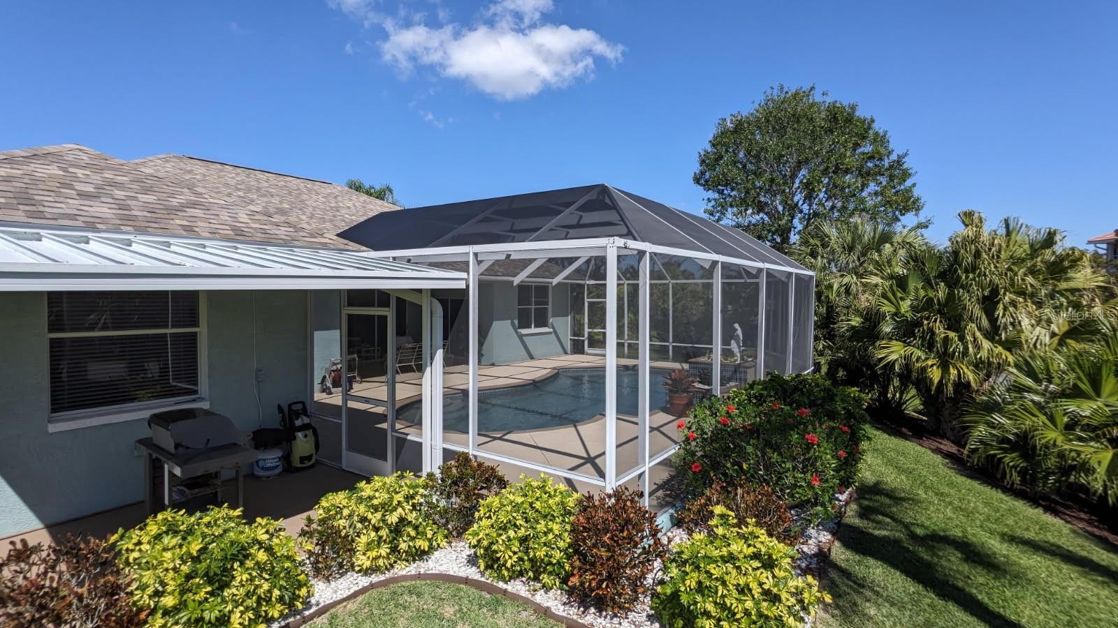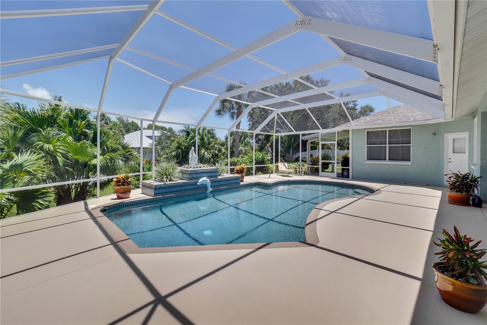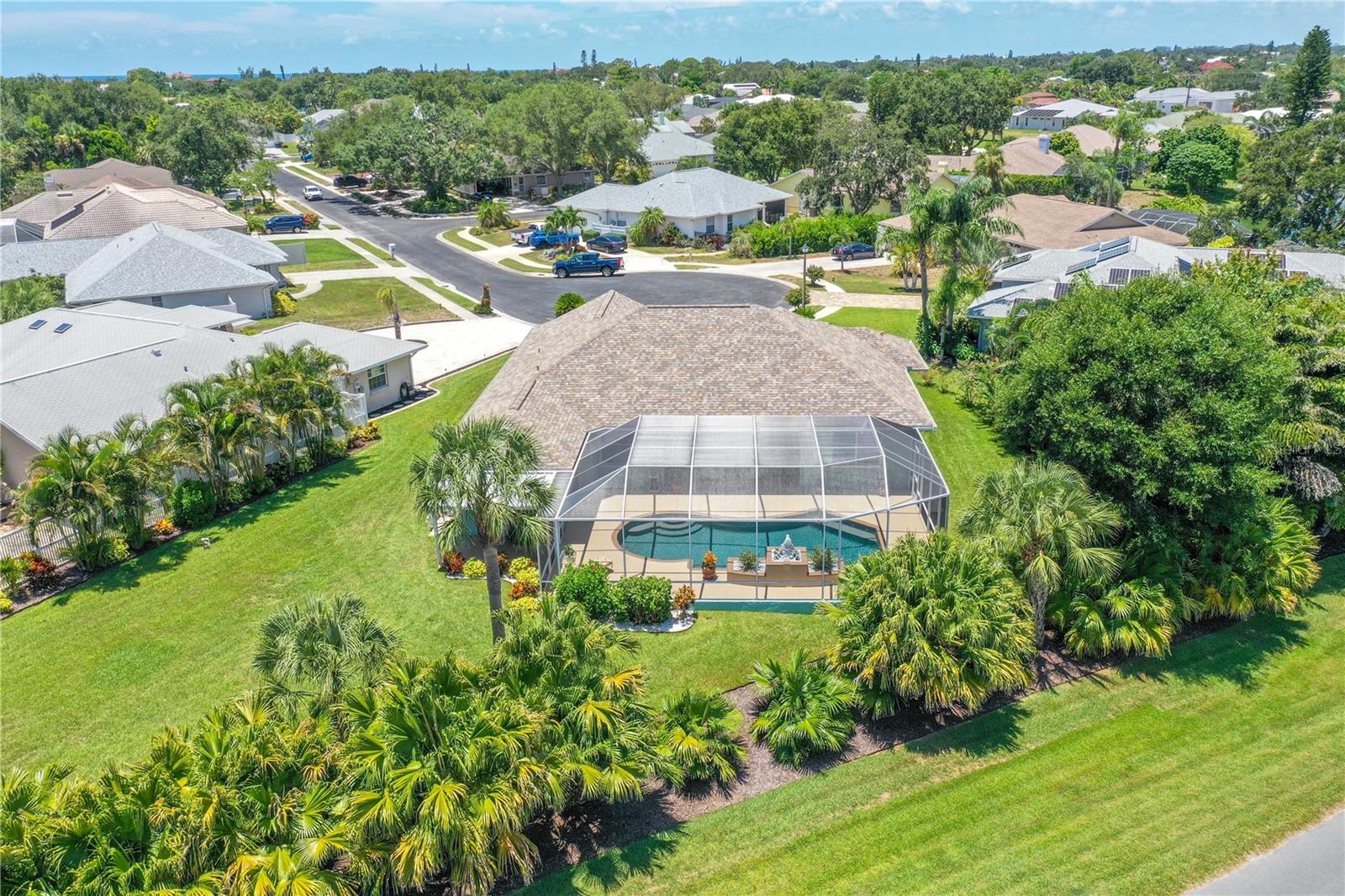 This beautifully maintained west of trail home sits on 1/3 Acre in the Cul-De-Sac. Flood Zone (X) No flood insurance required. Underground utilities / no ugly poles and wires / fewer power outages. Enjoy the views of the well-maintained tropical landscaping from inside and while enjoying the large pool area. Extended steel reinforced concrete block foundation. High flat ceilings. 21' x 24' attached garage with attic stairs, service door and opener. Custom 15' x 30' swimming pool with waterfalls and planters. Pool cage has been resecured with stainless steel screws and tap-con anchors around entire perimeter and the cage canopy has new screens. Pool has a variable speed pump and was resurfaced in 2017 with Caribbean Blue Pebble Stone (lifetime warranty) Large 29' x 40' screened in pool deck. A 10' x 17' Sheltered lanai and a 8' x 12' covered patio. Roof replaced with new Owens Corning Decorator Engineered Dimensional Shingles with ridge vents in 2017. New seamless gutters front and sides in 2017 with underground drains and pop-up emitters. New 50 gallon hot water tank in 2022. Irrigation system with 1 HP stainless steel pump, new pressure tank and control box 2015. Paver tile front entry. New 3 ton Inverter HVAC with two surge protectors and touch pad thermostat with 10 year transferable warranty covering all parts and labor installed July 2023. Large master suite 12' x 17' with 2 walk-in closets, large garden tub, separate 3' x 5' walk in shower, dual sinks and private commode. Custom blinds and draperies throughout. Porcelain tile foyer, hallway, kitchen, dinette and in both bathrooms. Whole house security system. Interior laundry with stainless steel sink, multiple cabinets, pantry, washer and dryer. New satin nickel finished door and cabinet hardware throughout. New dcor electric rocker switches throughout. New PEX pipe plumbing service 2017. Ceiling fans in all bedrooms, living room and lanai. Steel Hurricane shutters for all operable windows. Hurricane steel reinforced garage door. Hardwired surround sound in living room with 4 speakers. Private security street lighting in the front and rear. Located north of the City of Venice and south of Sarasota where there are many events, parades, theatre, restaurants, beaches and shopping. Staying close to home you will enjoy the shopping, restaurants (great waterfront ones too), and be within 3 miles of Nokomis Beach and have the local feel of home.