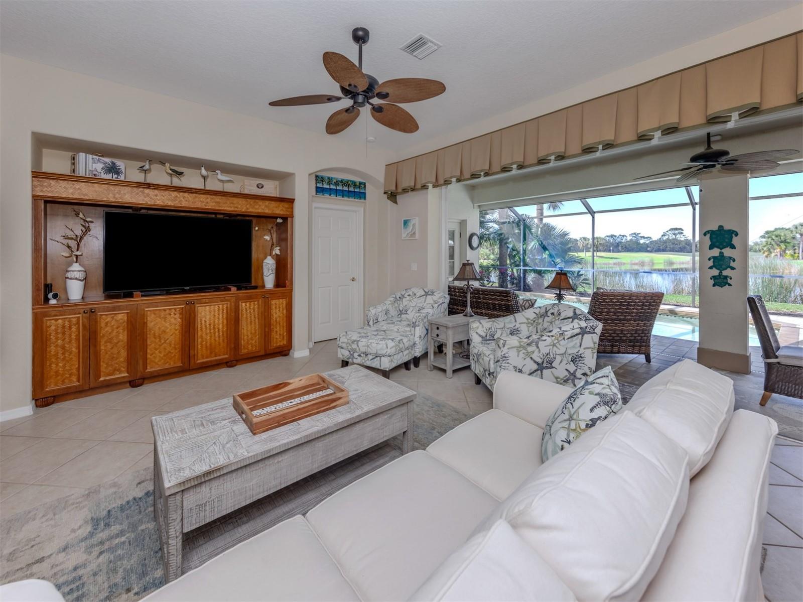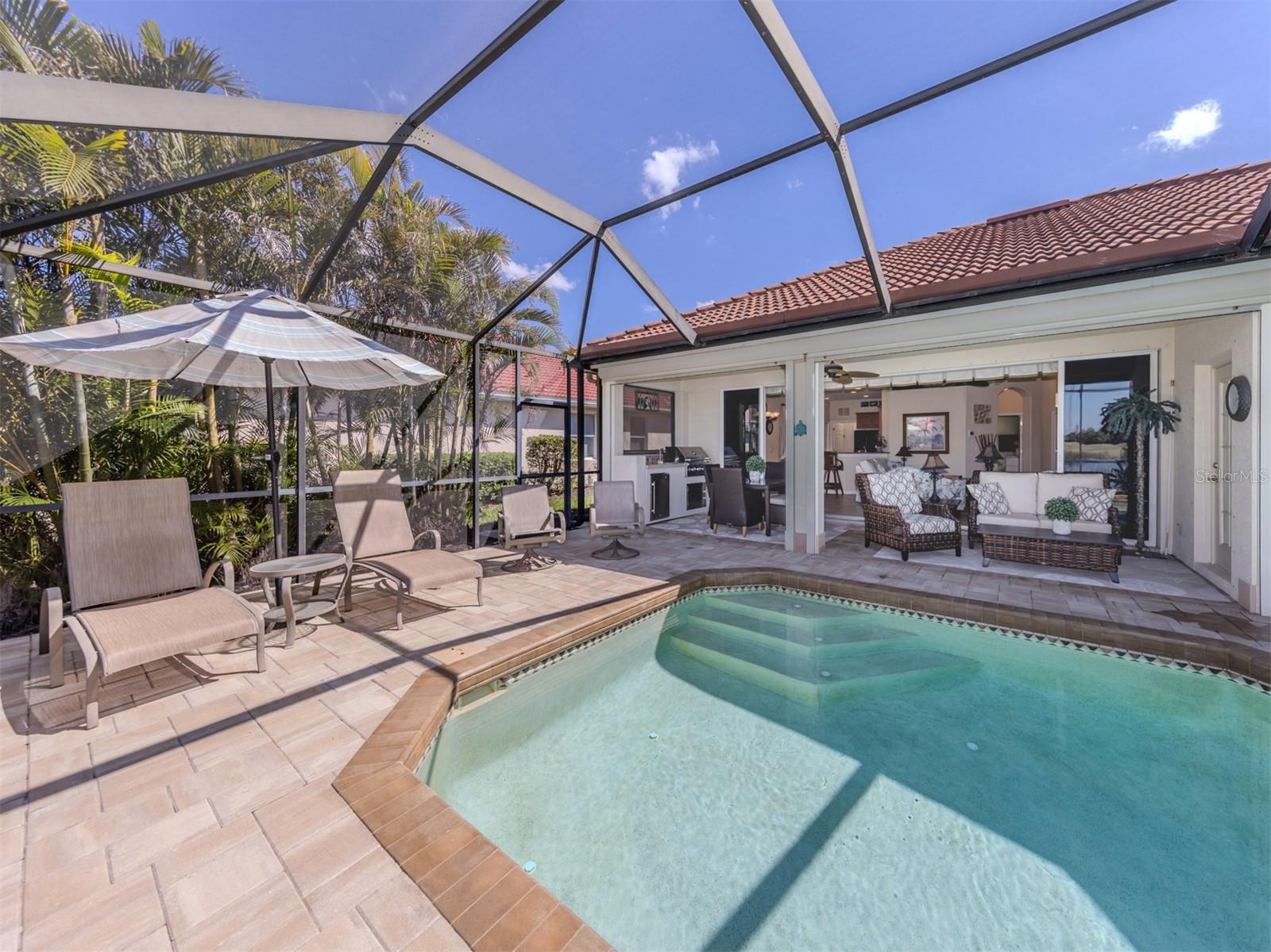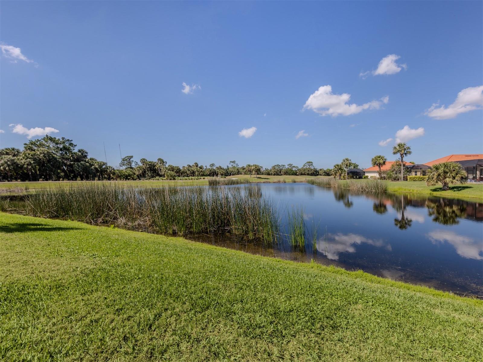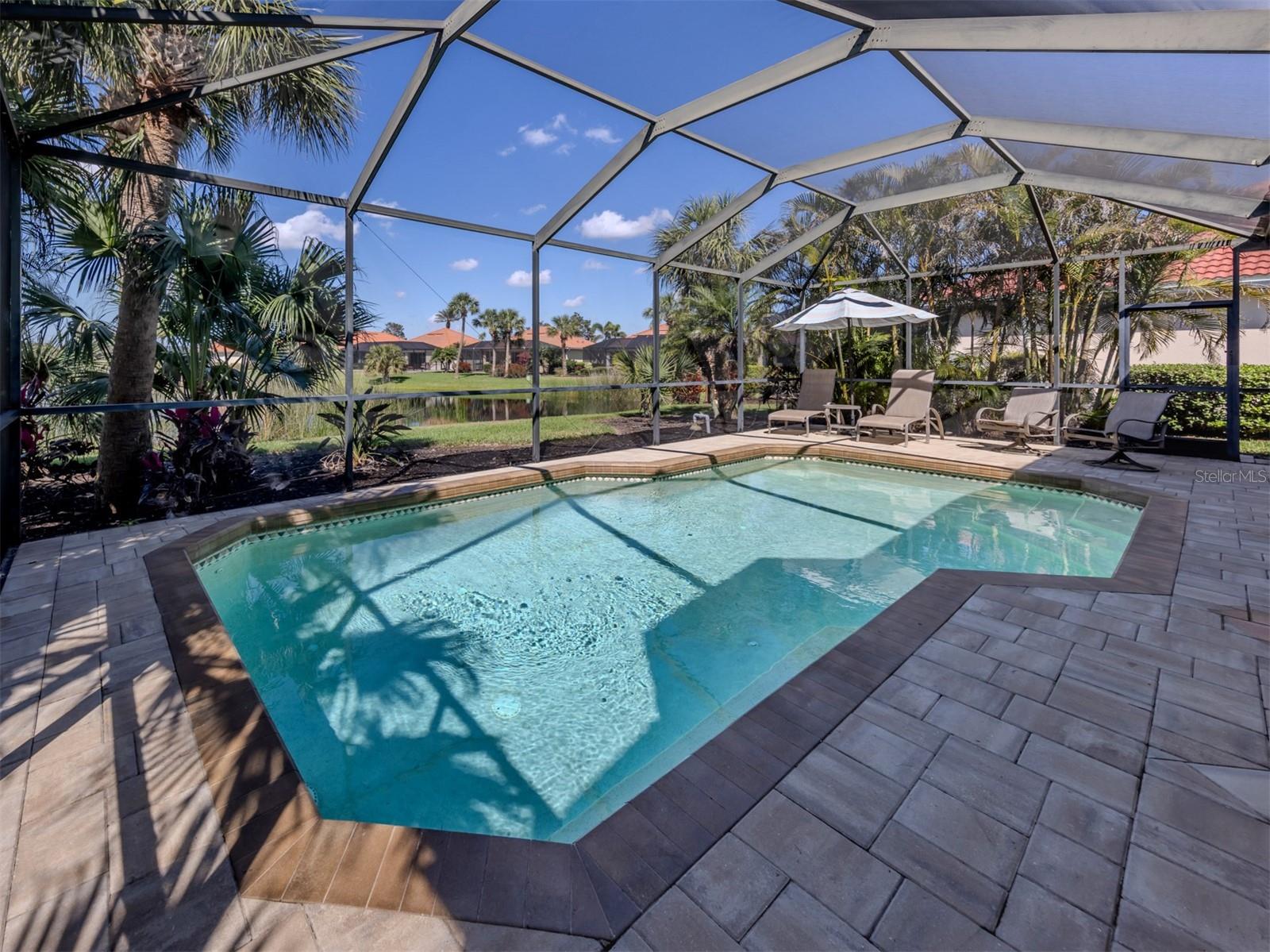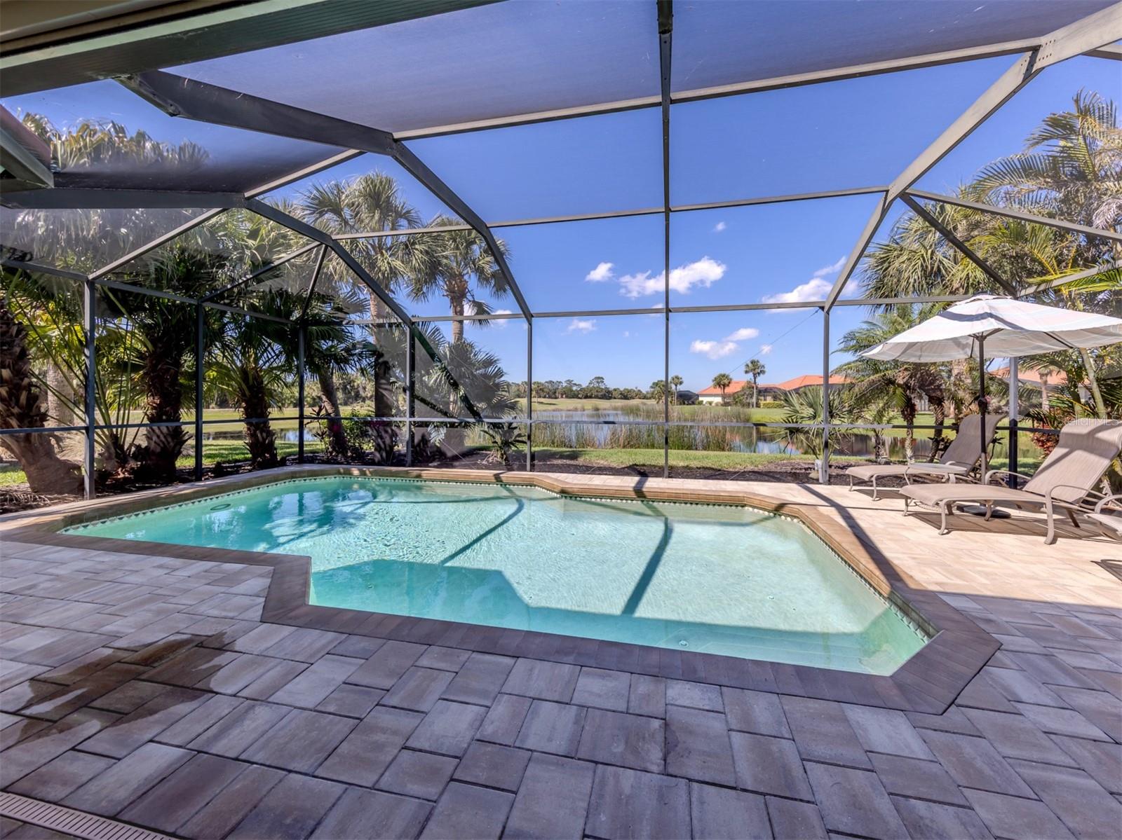 Stunning lake, golf and sunset views with maintenance-free living! Experience the beauty and serenity of this WCI-built Cavallini floor plan, featuring two spacious bedrooms, two baths, and a versatile study/guest room with a built-in Murphy bed behind bookshelves. Being sold turnkey furnished. This open plan with pocketing glass doors leads seamlessly to the extended lanai with outdoor kitchen built in 2024, and a heated pool with new pool heater and pump. All this makes it ideal for relaxation and entertainment. The chef-inspired kitchen is a dream with gas appliances, a breakfast bar, granite countertops, built-in storage with functionality and style. Upgrades include luxurious wood cabinetry, California closets, Storm Smart hurricane screens, tankless water heater, lanai pavers and pool coping, paver stone driveway and front walkway, new washer, dryer and refrigerator. Enjoy resort-style amenities at the Venetian Golf and River Club, including an 18-hole championship golf course, heated community pool, lap pool, six Har-Tru® tennis courts, pickleball courts and a top-tier fitness center with scheduled classes. Savor delicious meals at the River Club restaurant or poolside during the season. Only a short drive from stunning Gulf Coast beaches and vibrant downtown Venice, this location offers everything you need. Explore tree-lined boulevards, charming shops, exquisite dining and cultural hotspots like the Venice Art Center, theatre and library. Plus, you're just minutes from state-of-the-art medical facilities, including Sarasota Memorial Hospital.