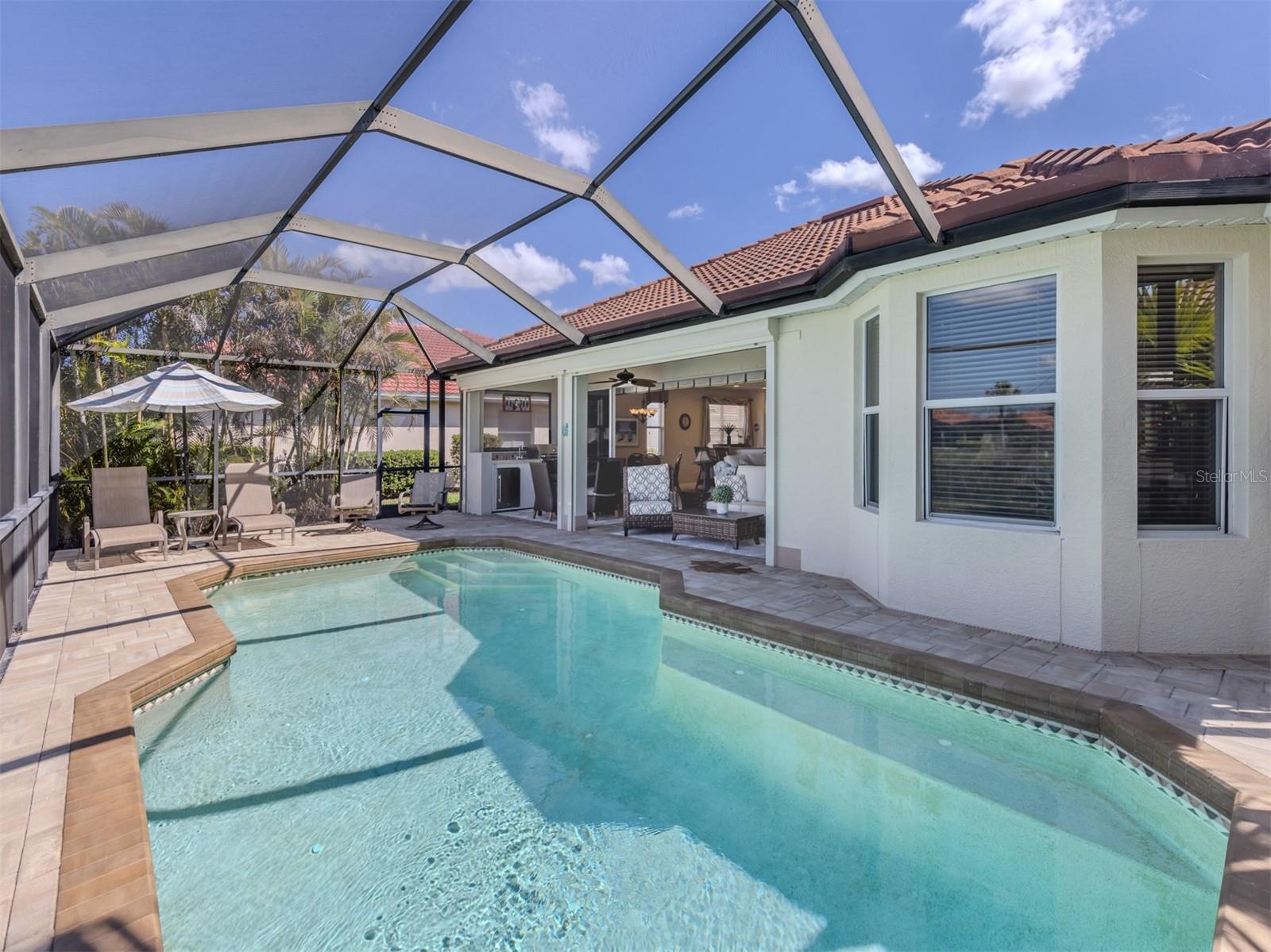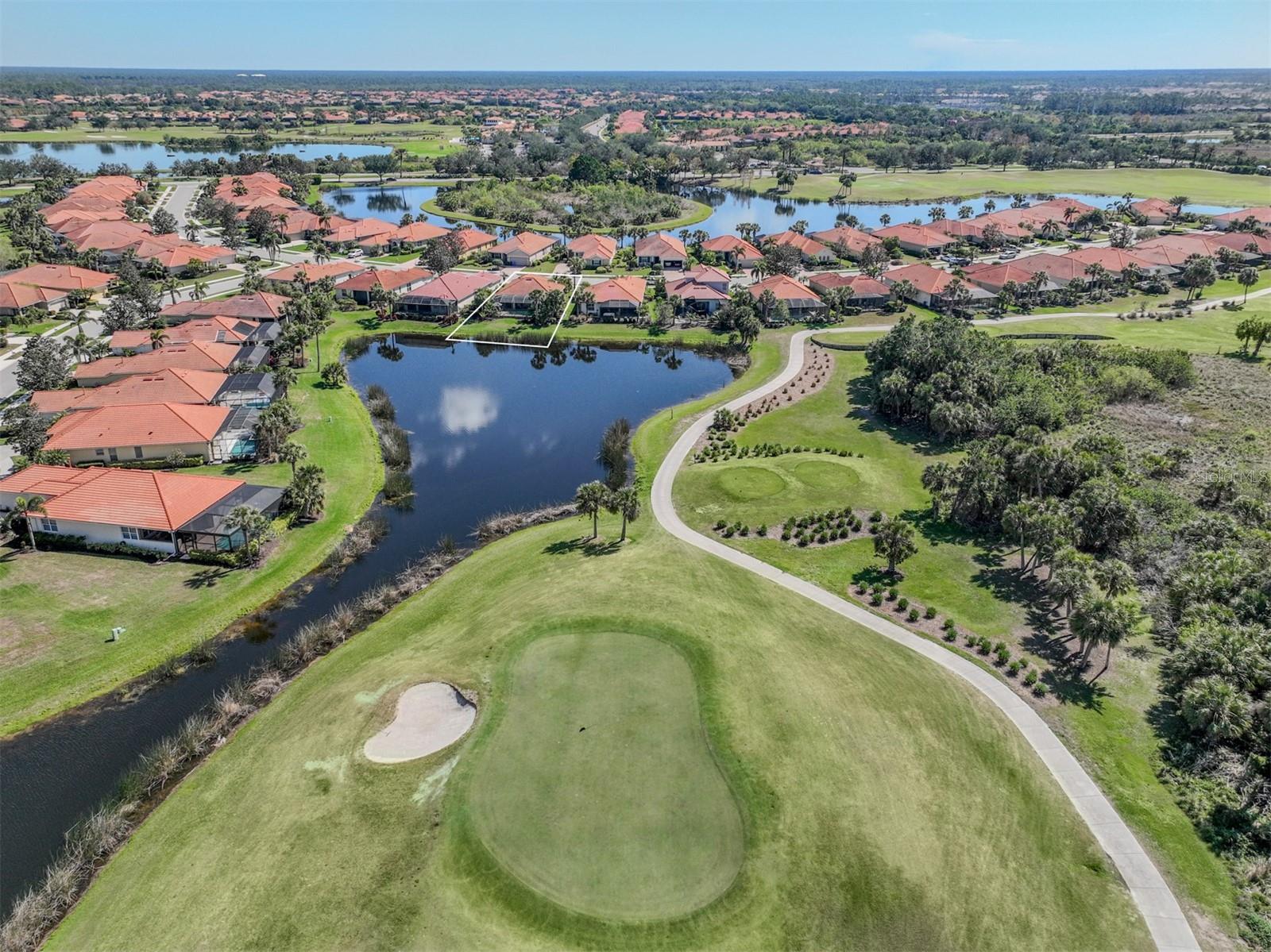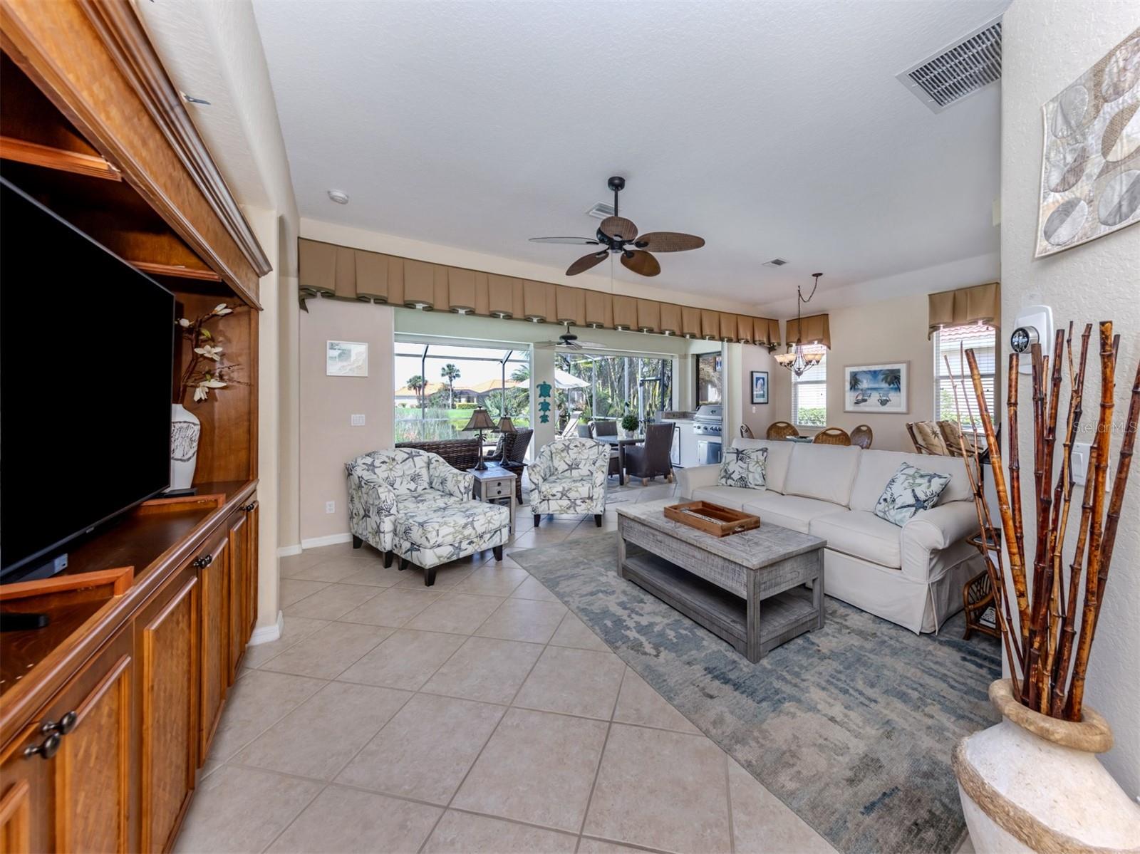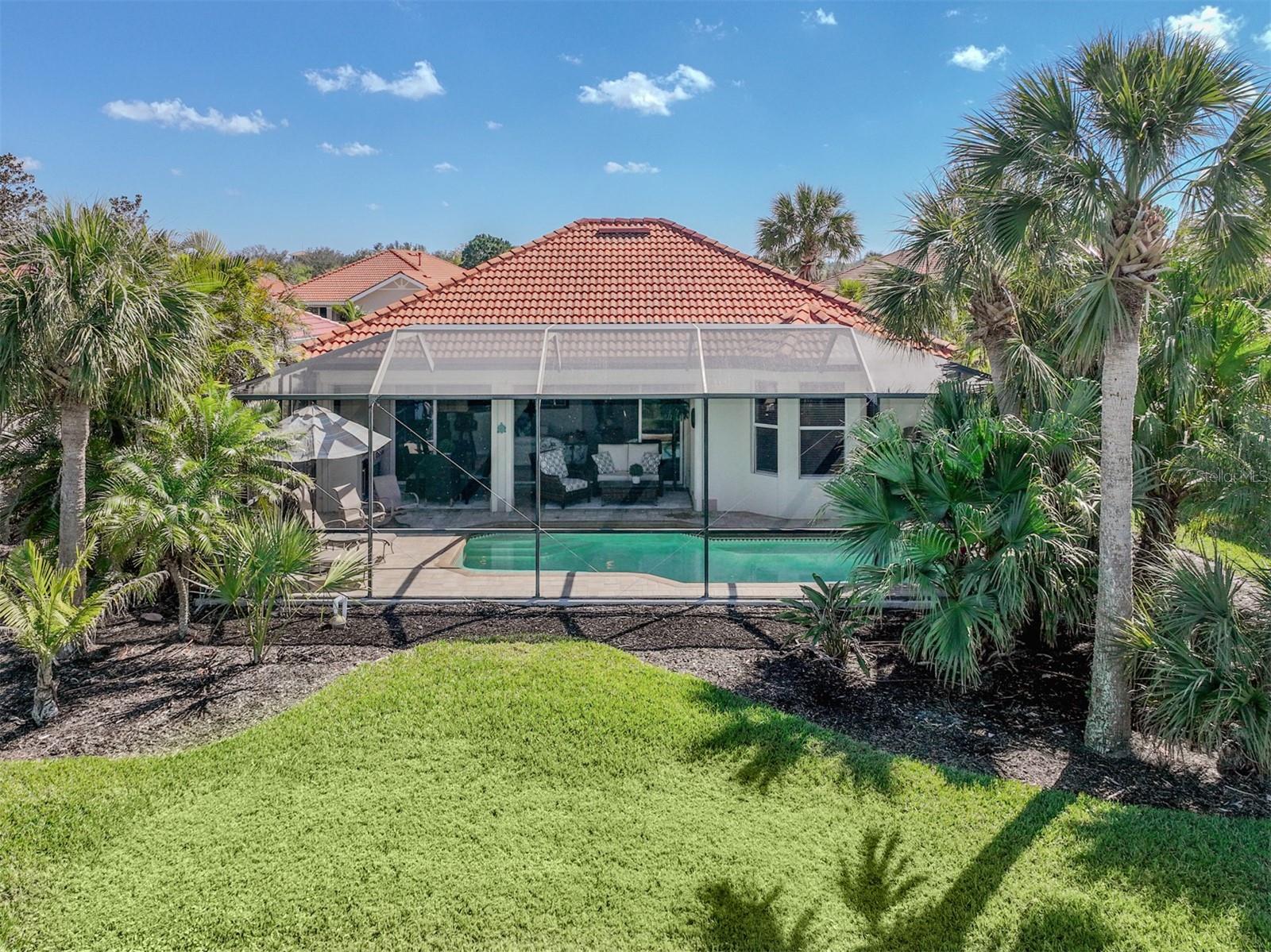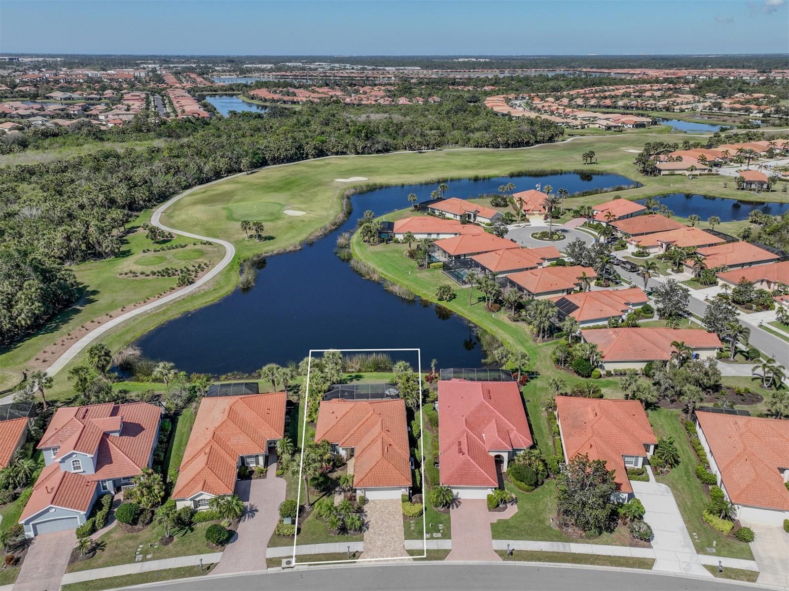 Stunning lake, golf and sunset views with maintenance-free living! Experience the beauty and serenity of this WCI-built Cavallini floor plan, featuring two spacious bedrooms, two baths, and a versatile study/guest room with a built-in Murphy bed behind bookshelves. Being sold turnkey furnished. This open plan with pocketing glass doors leads seamlessly to the extended lanai with outdoor kitchen built in 2024, and a heated pool with new pool heater and pump. All this makes it ideal for relaxation and entertainment. The chef-inspired kitchen is a dream with gas appliances, a breakfast bar, granite countertops, built-in storage with functionality and style. Upgrades include luxurious wood cabinetry, California closets, Storm Smart hurricane screens, tankless water heater, lanai pavers and pool coping, paver stone driveway and front walkway, new washer, dryer and refrigerator. Enjoy resort-style amenities at the Venetian Golf and River Club, including an 18-hole championship golf course, heated community pool, lap pool, six Har-Tru® tennis courts, pickleball courts and a top-tier fitness center with scheduled classes. Savor delicious meals at the River Club restaurant or poolside during the season. Only a short drive from stunning Gulf Coast beaches and vibrant downtown Venice, this location offers everything you need. Explore tree-lined boulevards, charming shops, exquisite dining and cultural hotspots like the Venice Art Center, theatre and library. Plus, you're just minutes from state-of-the-art medical facilities, including Sarasota Memorial Hospital.