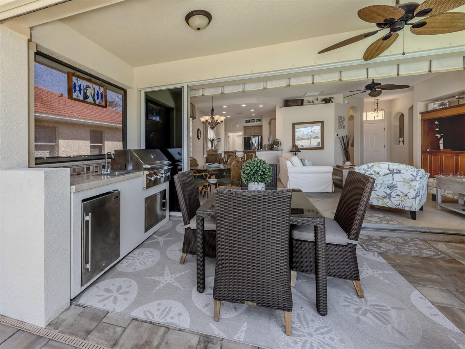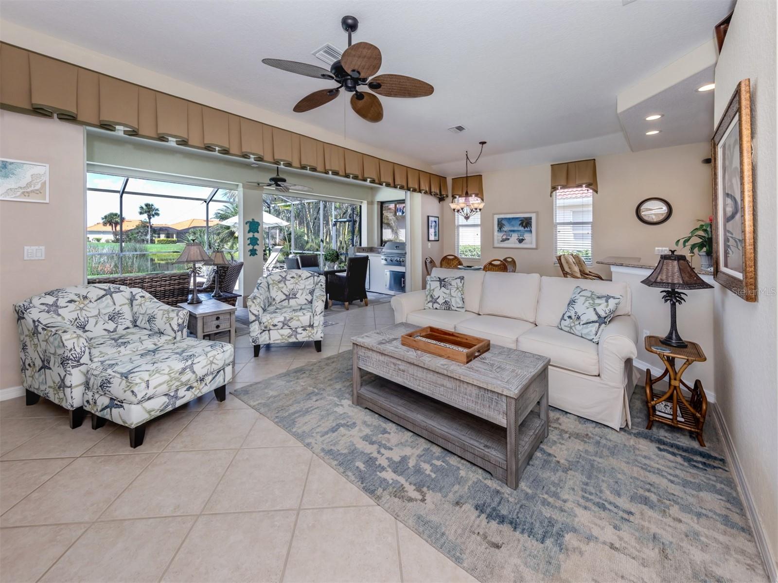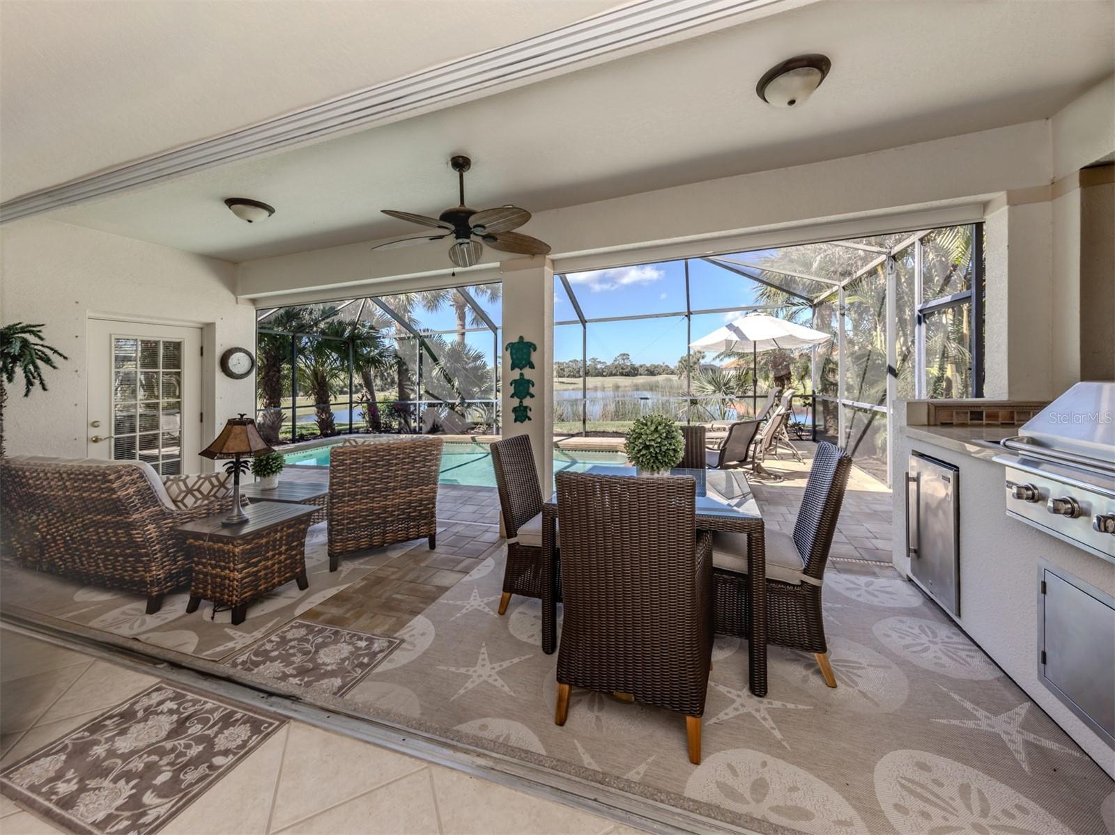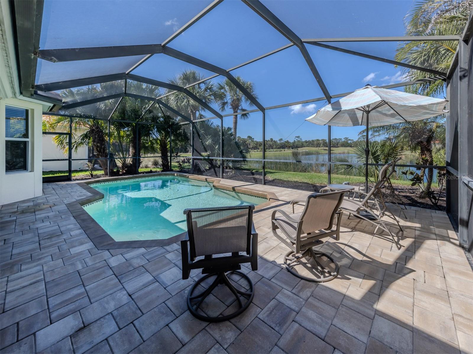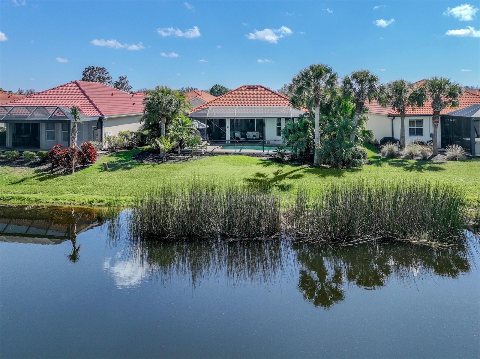 Stunning lake, golf and sunset views with maintenance-free living! Experience the beauty and serenity of this WCI-built Cavallini floor plan, featuring two spacious bedrooms, two baths, and a versatile study/guest room with a built-in Murphy bed behind bookshelves. Being sold turnkey furnished. This open plan with pocketing glass doors leads seamlessly to the extended lanai with outdoor kitchen built in 2024, and a heated pool with new pool heater and pump. All this makes it ideal for relaxation and entertainment. The chef-inspired kitchen is a dream with gas appliances, a breakfast bar, granite countertops, built-in storage with functionality and style. Upgrades include luxurious wood cabinetry, California closets, Storm Smart hurricane screens, tankless water heater, lanai pavers and pool coping, paver stone driveway and front walkway, new washer, dryer and refrigerator. Enjoy resort-style amenities at the Venetian Golf and River Club, including an 18-hole championship golf course, heated community pool, lap pool, six Har-Tru® tennis courts, pickleball courts and a top-tier fitness center with scheduled classes. Savor delicious meals at the River Club restaurant or poolside during the season. Only a short drive from stunning Gulf Coast beaches and vibrant downtown Venice, this location offers everything you need. Explore tree-lined boulevards, charming shops, exquisite dining and cultural hotspots like the Venice Art Center, theatre and library. Plus, you're just minutes from state-of-the-art medical facilities, including Sarasota Memorial Hospital.