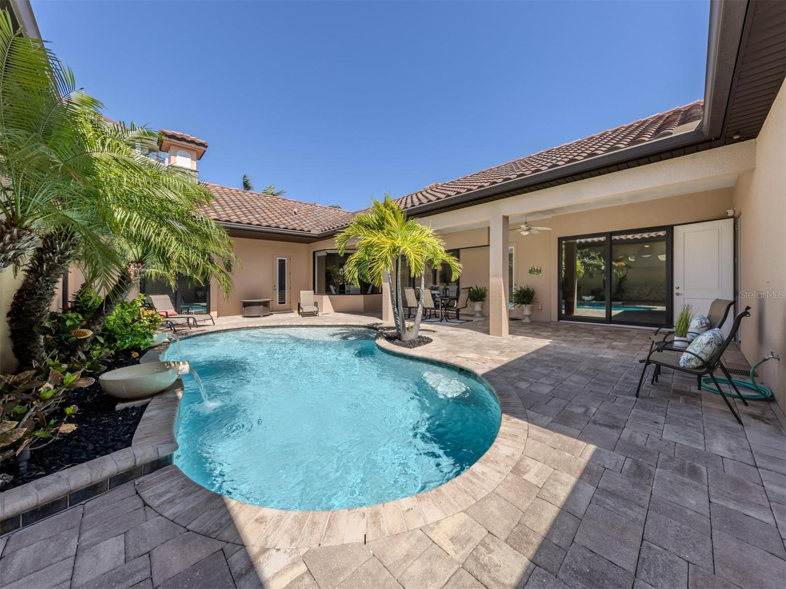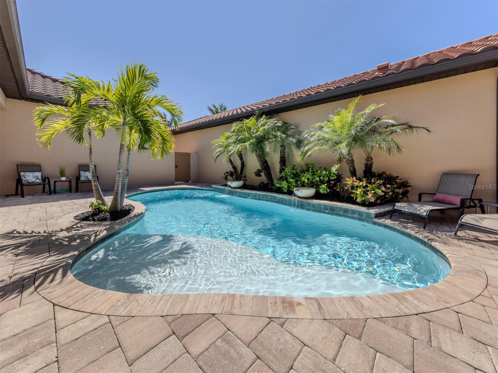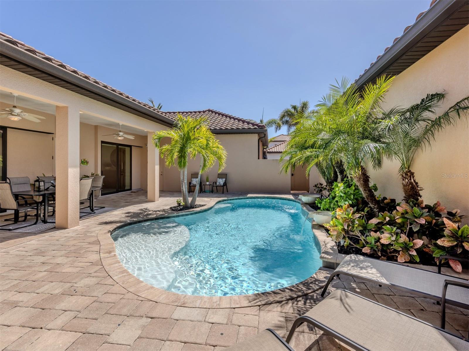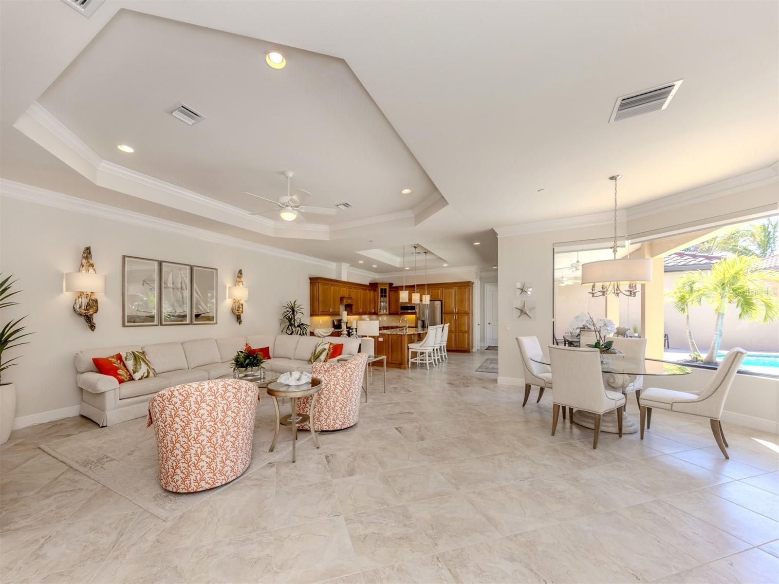 Elegant coastal living in the heart of Venice. Experience the best of Gulf Coast living in this exquisite residence in Tra Ponti Villaggio, in the heart of Venice, a charming seaside city known for its historic downtown, boutique shopping, fine dining, and vibrant outdoor lifestyle. Just a short distance from downtown, this home provides seamless access to the Legacy Trail along the Intracoastal Waterway, offering breathtaking views and endless opportunities for biking, walking and enjoying the waterfront. Inside, this three-bedroom-plus-den home features a thoughtfully designed split floor plan, boasting a spacious great room and a gourmet kitchen equipped with premium stainless steel appliances. The bright dining area, surrounded by aquarium windows, offers a stunning view of the private pool and tropical landscaping. Elegant details such as large ceramic tile laid on the diagonal, crown molding and coffered ceilings add a touch of luxury and sophistication to every space. Step outside to your private oasis, where a resort-style pool with tranquil fountain features creates the ideal ambiance for relaxation and entertaining. Complete with a two-car garage and maintenance-free living, this home offers the ideal blend of luxury, comfort and an unbeatable location. Don't miss this rare opportunity and schedule your private tour today!