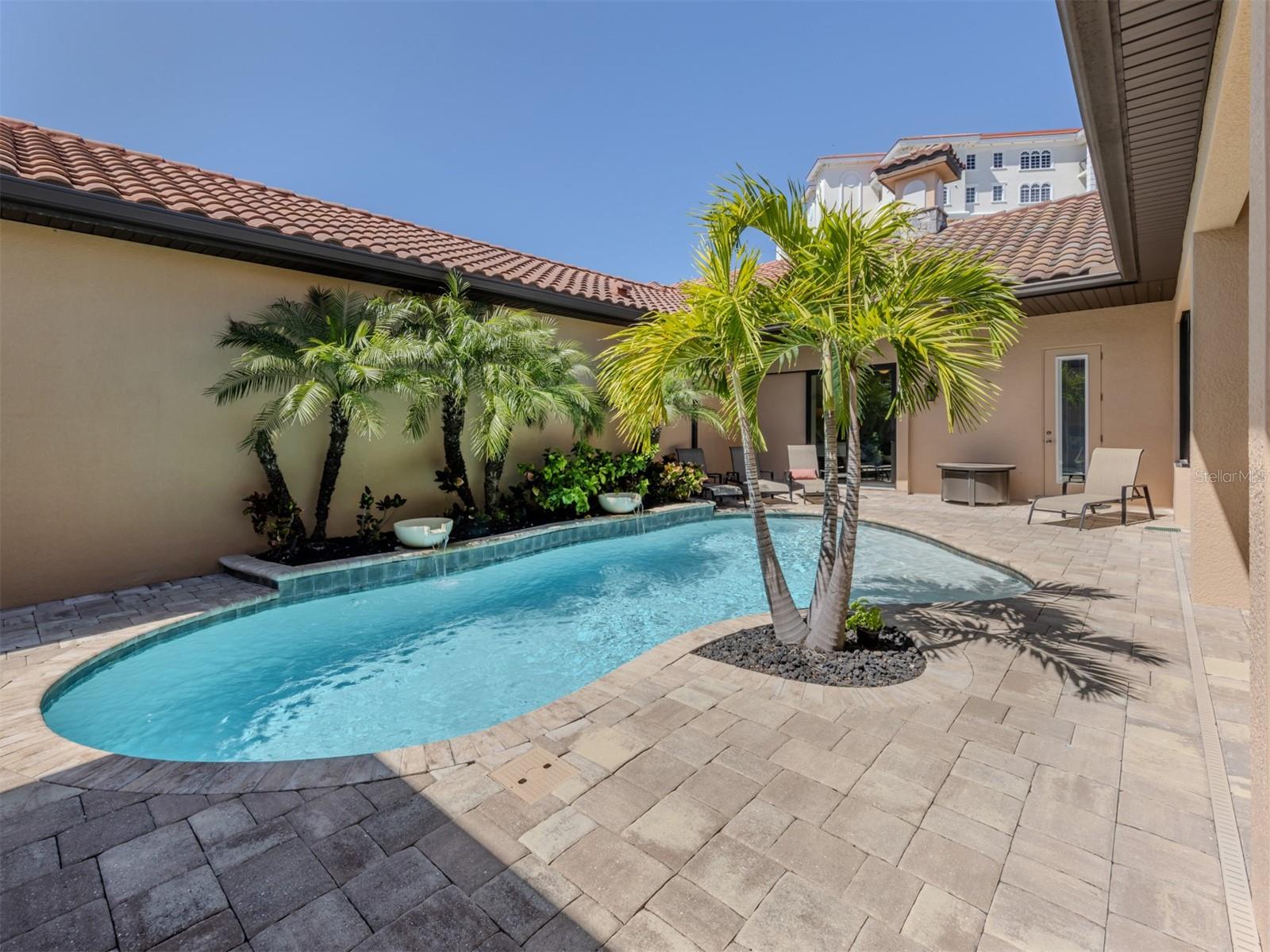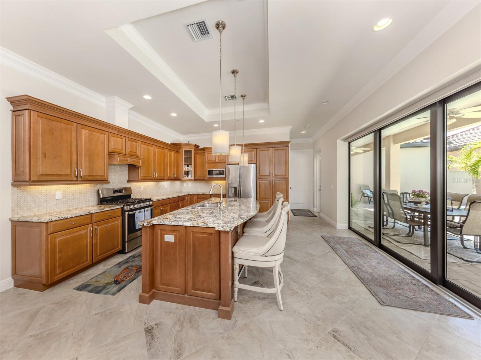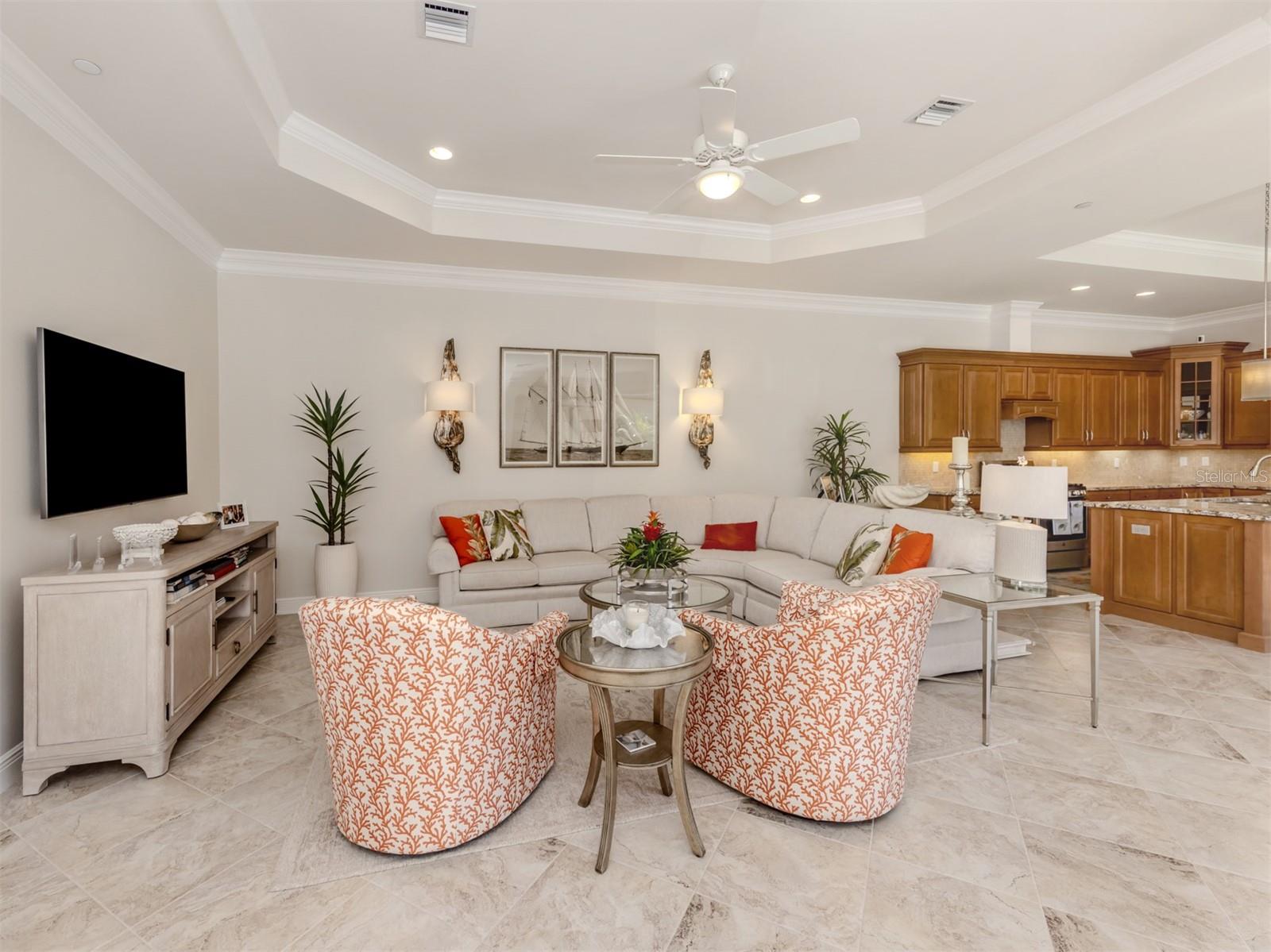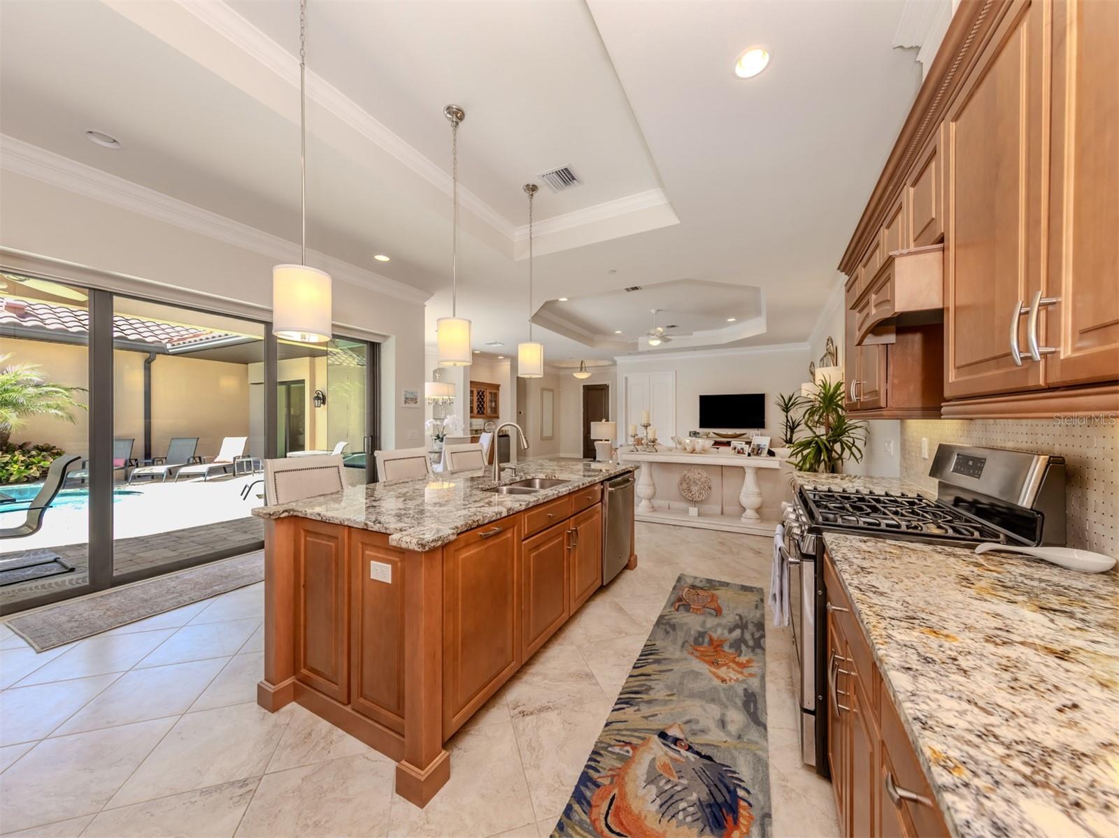Elegant coastal living in the heart of Venice. Experience the best of Gulf Coast living in this exquisite residence in Tra Ponti Villaggio, in the heart of Venice, a charming seaside city known for its historic downtown, boutique shopping, fine dining, and vibrant outdoor lifestyle. Just a short distance from downtown, this home provides seamless access to the Legacy Trail along the Intracoastal Waterway, offering breathtaking views and endless opportunities for biking, walking and enjoying the waterfront. Inside, this three-bedroom-plus-den home features a thoughtfully designed split floor plan, boasting a spacious great room and a gourmet kitchen equipped with premium stainless steel appliances. The bright dining area, surrounded by aquarium windows, offers a stunning view of the private pool and tropical landscaping. Elegant details such as large ceramic tile laid on the diagonal, crown molding and coffered ceilings add a touch of luxury and sophistication to every space. Step outside to your private oasis, where a resort-style pool with tranquil fountain features creates the ideal ambiance for relaxation and entertaining. Complete with a two-car garage and maintenance-free living, this home offers the ideal blend of luxury, comfort and an unbeatable location. Don't miss this rare opportunity and schedule your private tour today!