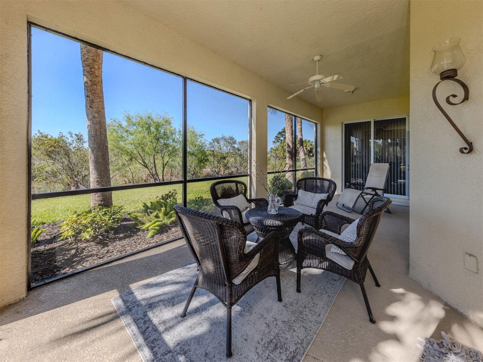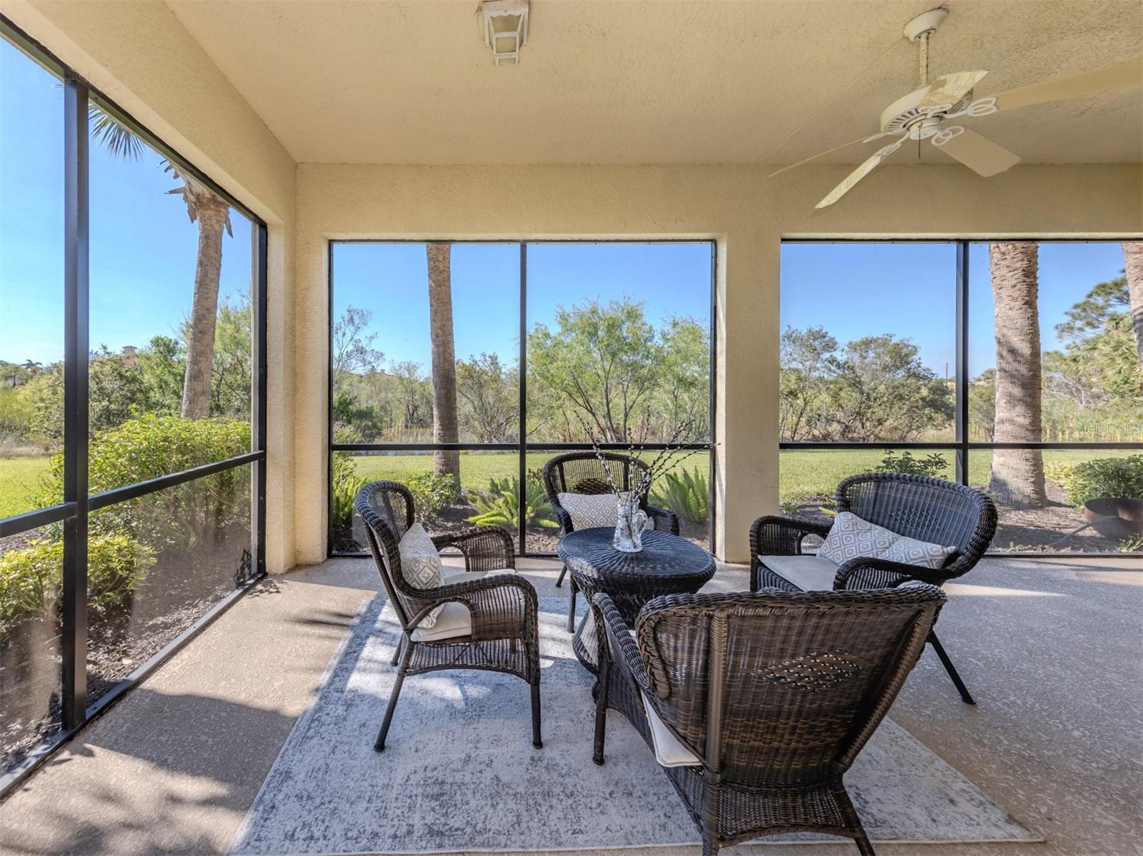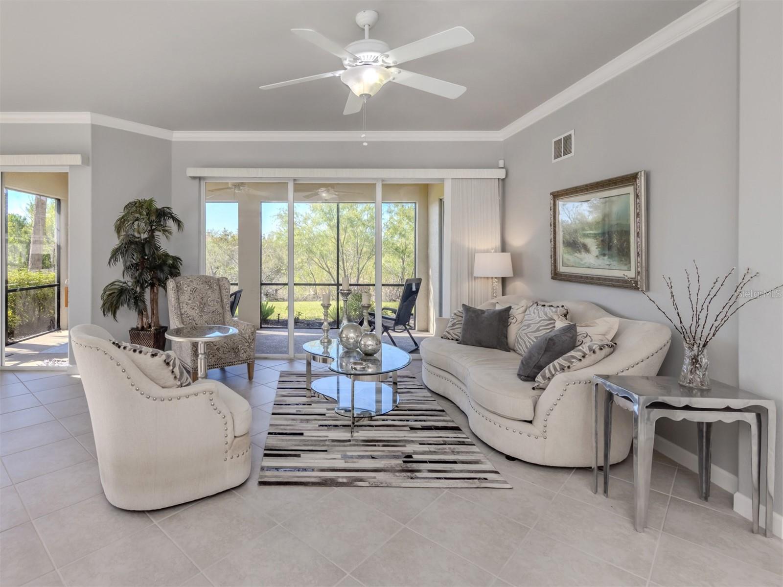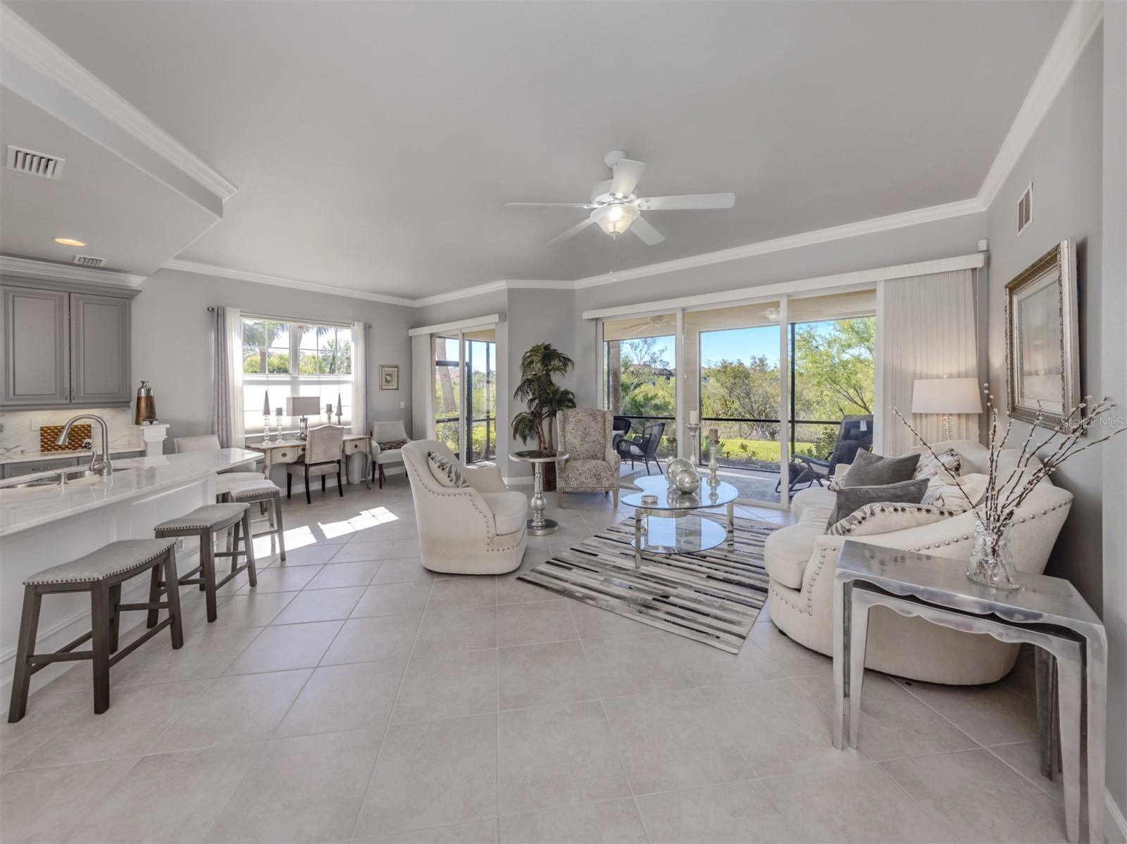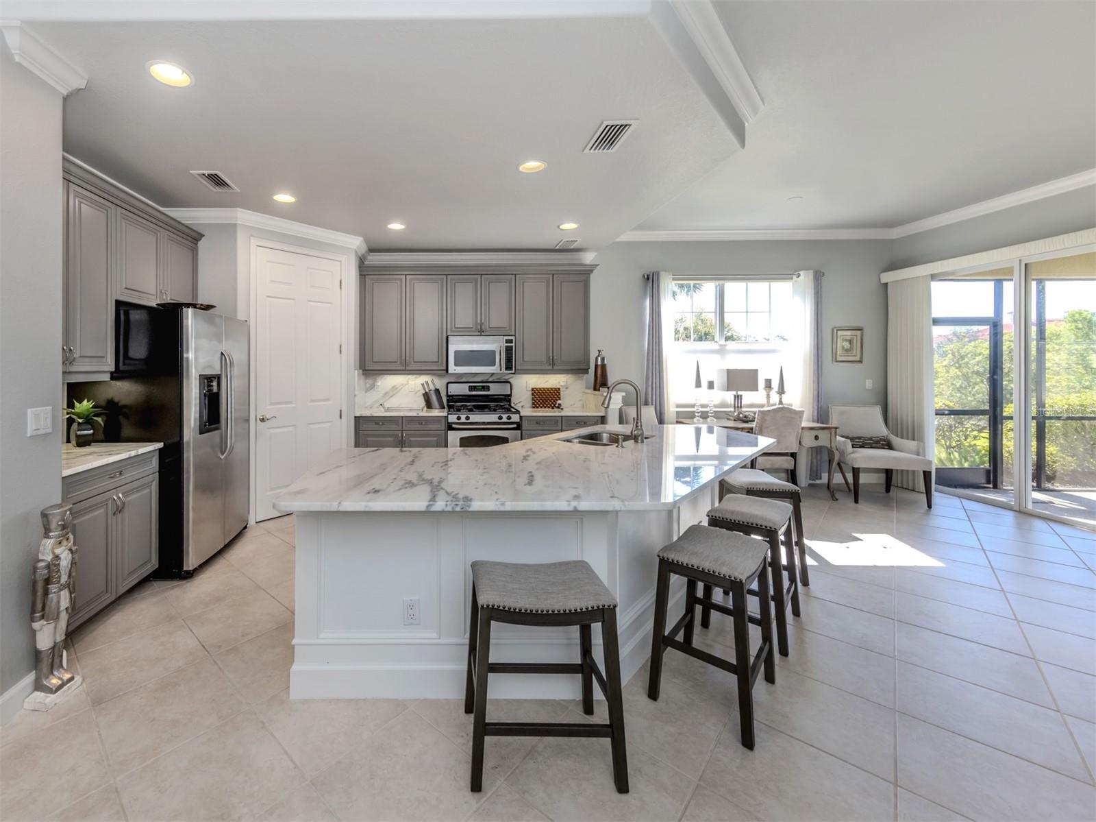 Puttin' on the Ritz! You can move right into this luxurious and elegant first-floor condominium today. This newly redone kitchen makes entertaining a breeze. The bright open great room includes multiple sliders to lanai, large living room area, dining room, sitting area and large kitchen with new granite stainless appliances, walk-in pantry and gas range. This split floor plan offers two bedrooms, one with a walk-in closet, hall bath, and laundry room leading to two-car attached garage. The primary is on the other side with sliders to lanai, en-suite bath with dual sinks, large walk-in shower and nearby walk-in closet and two linen closets. Enjoy sunsets from your private lanai with private marshy preserve views and all the visiting wildlife. Turnkey furnished. Just move in and enjoy your new resort living with private restaurant with wonderful chef, featuring special dinners, dances, events, hamburger night, fish fry Fridays, buffets, Sunday breakfast and recently added pizza oven. Yum! No waiting or traffic in season. Other offerings in this wonderful and popular neighborhood are six Har-Tru tennis courts, three pickleball courts, large resort pool with spa, tiki bar for drinks and food, and occasional entertainment and karaoke, lap pool, gym, aerobics room, many games groups and last but far from least, a -mile boardwalk through the jungle down to the Myakka River. All this and so conveniently near the highway, hospital, fire station, many beaches and beautiful downtown Venice. Enjoy today!