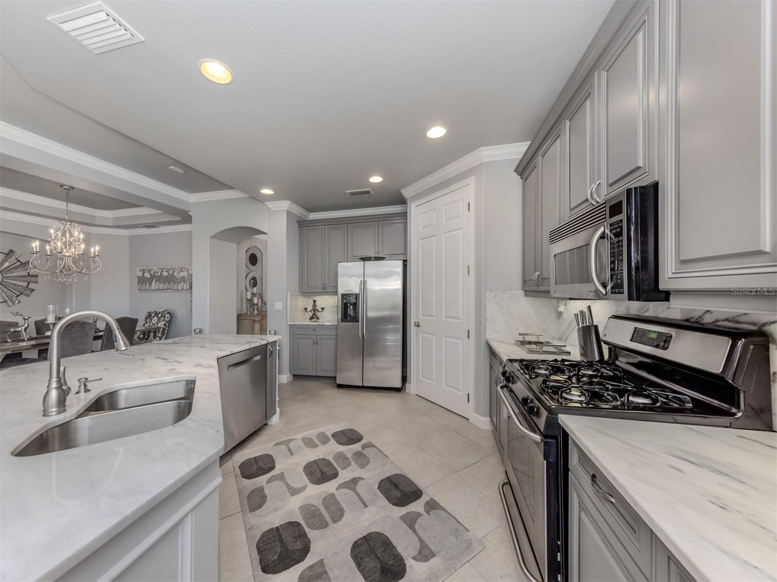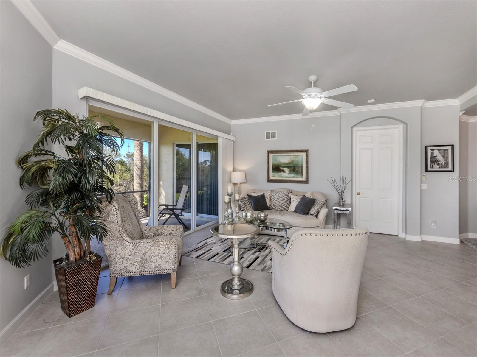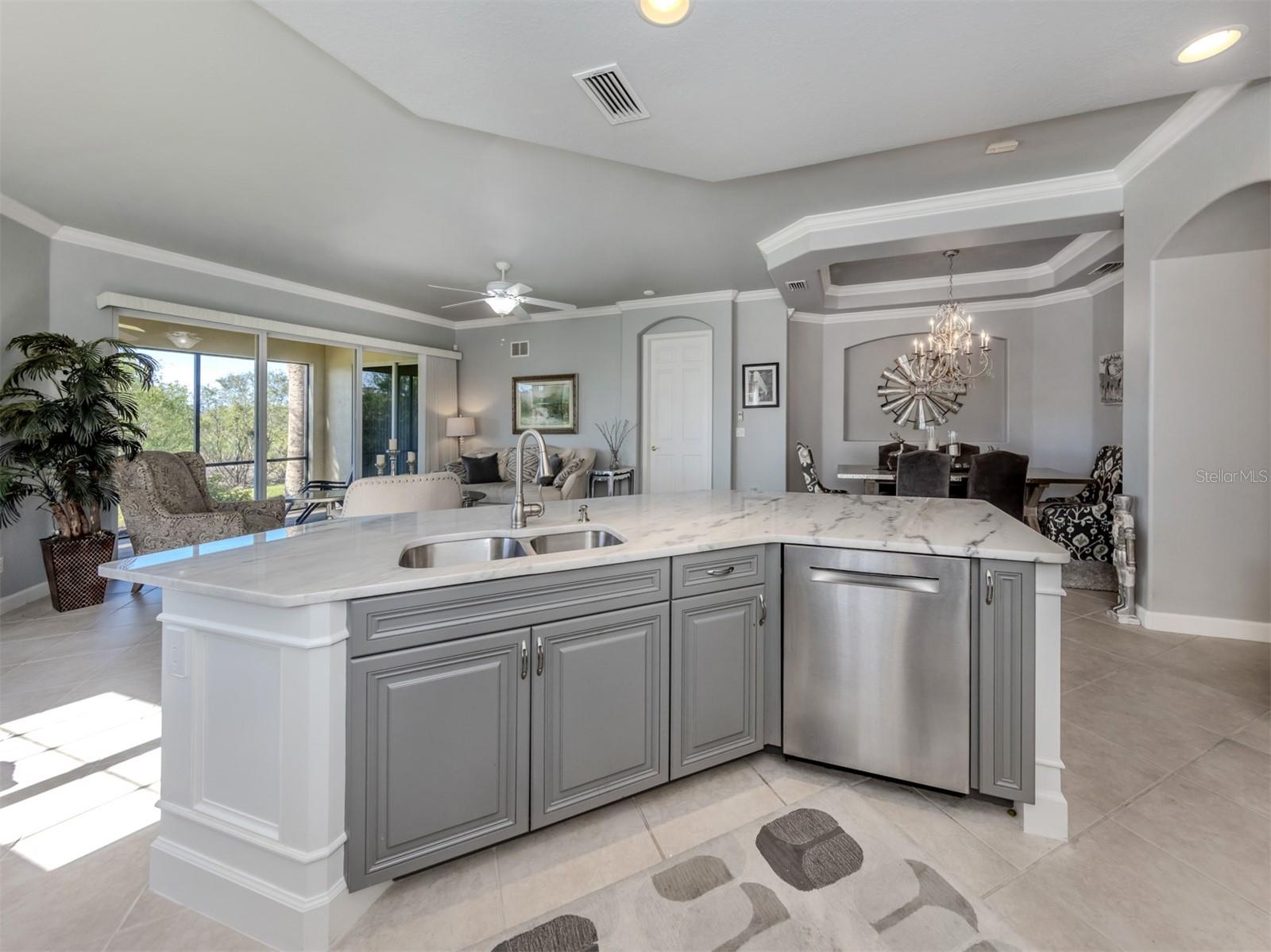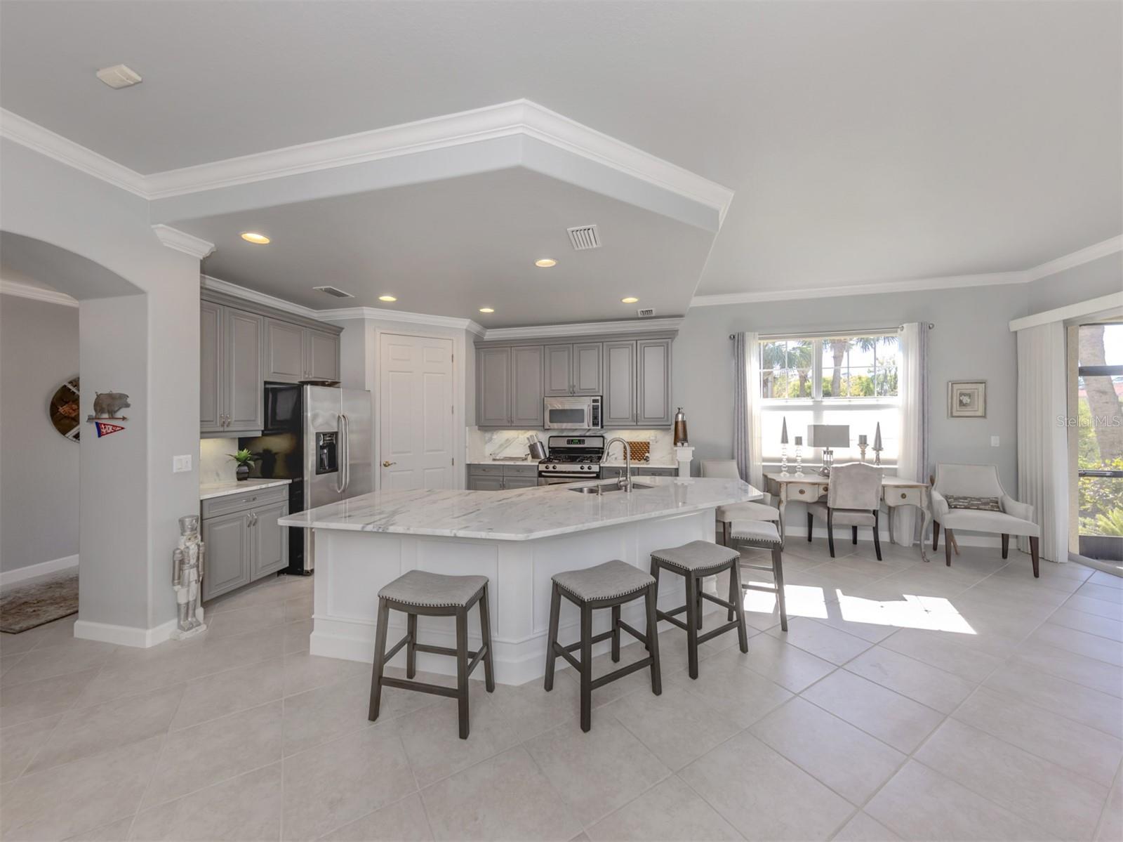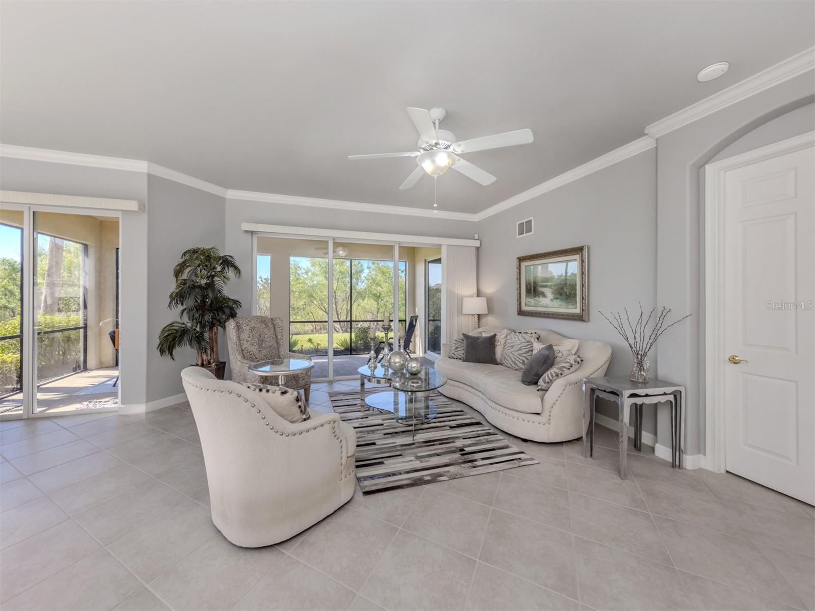 Puttin' on the Ritz! You can move right into this luxurious and elegant first-floor condominium today. This newly redone kitchen makes entertaining a breeze. The bright open great room includes multiple sliders to lanai, large living room area, dining room, sitting area and large kitchen with new granite stainless appliances, walk-in pantry and gas range. This split floor plan offers two bedrooms, one with a walk-in closet, hall bath, and laundry room leading to two-car attached garage. The primary is on the other side with sliders to lanai, en-suite bath with dual sinks, large walk-in shower and nearby walk-in closet and two linen closets. Enjoy sunsets from your private lanai with private marshy preserve views and all the visiting wildlife. Turnkey furnished. Just move in and enjoy your new resort living with private restaurant with wonderful chef, featuring special dinners, dances, events, hamburger night, fish fry Fridays, buffets, Sunday breakfast and recently added pizza oven. Yum! No waiting or traffic in season. Other offerings in this wonderful and popular neighborhood are six Har-Tru tennis courts, three pickleball courts, large resort pool with spa, tiki bar for drinks and food, and occasional entertainment and karaoke, lap pool, gym, aerobics room, many games groups and last but far from least, a -mile boardwalk through the jungle down to the Myakka River. All this and so conveniently near the highway, hospital, fire station, many beaches and beautiful downtown Venice. Enjoy today!