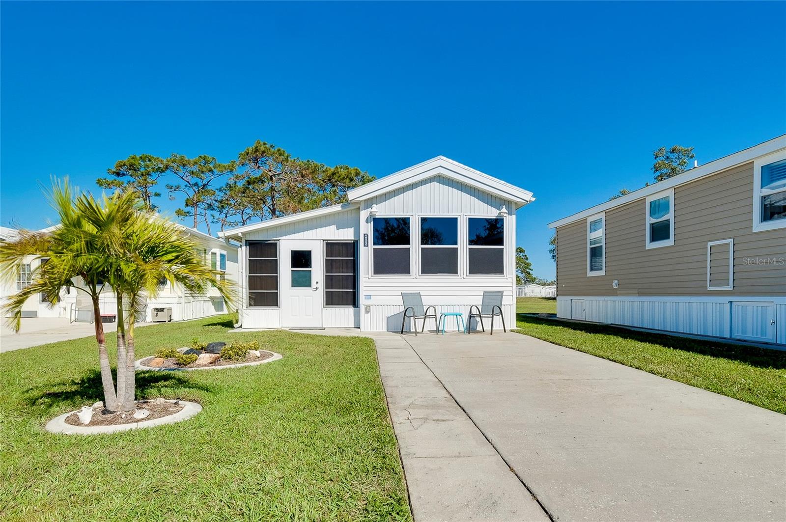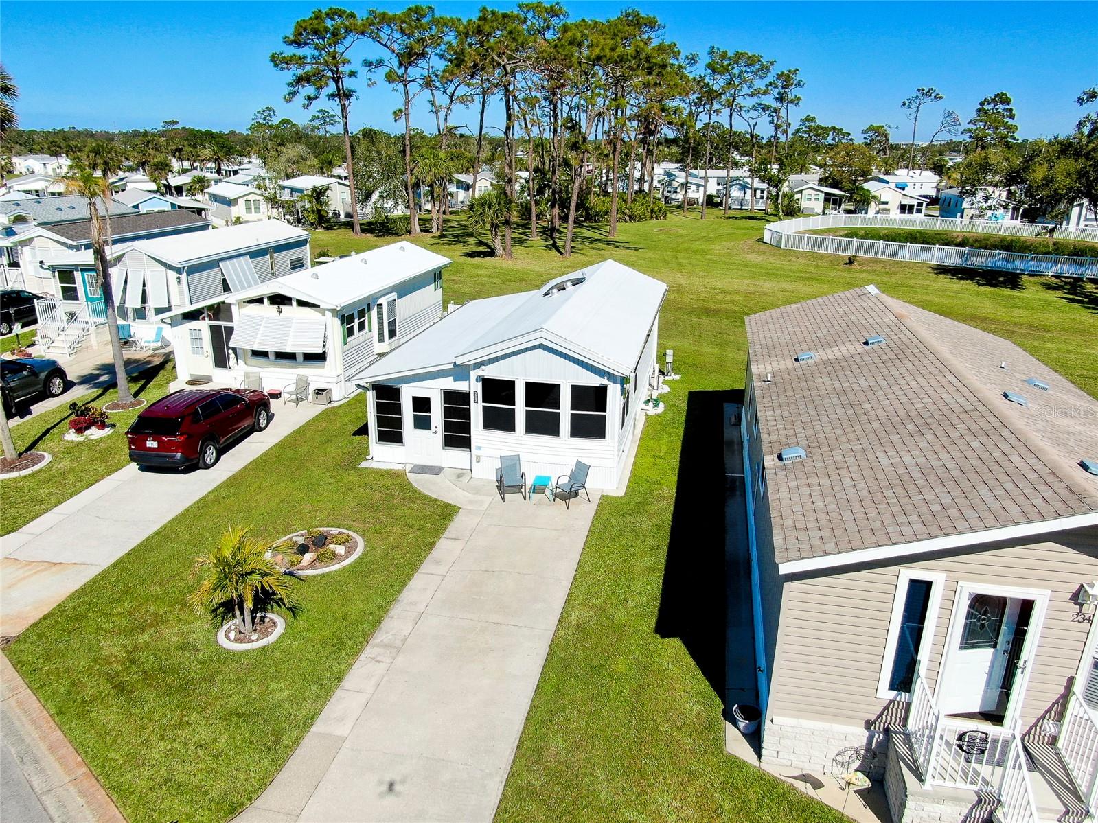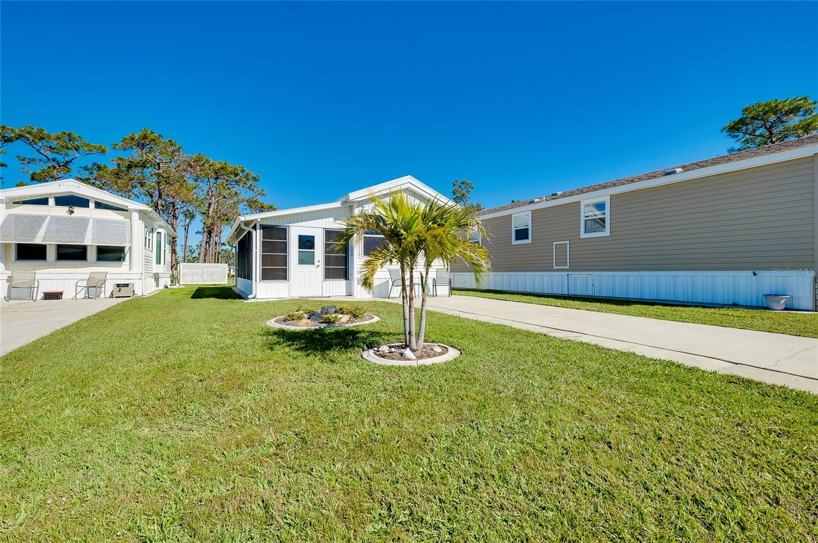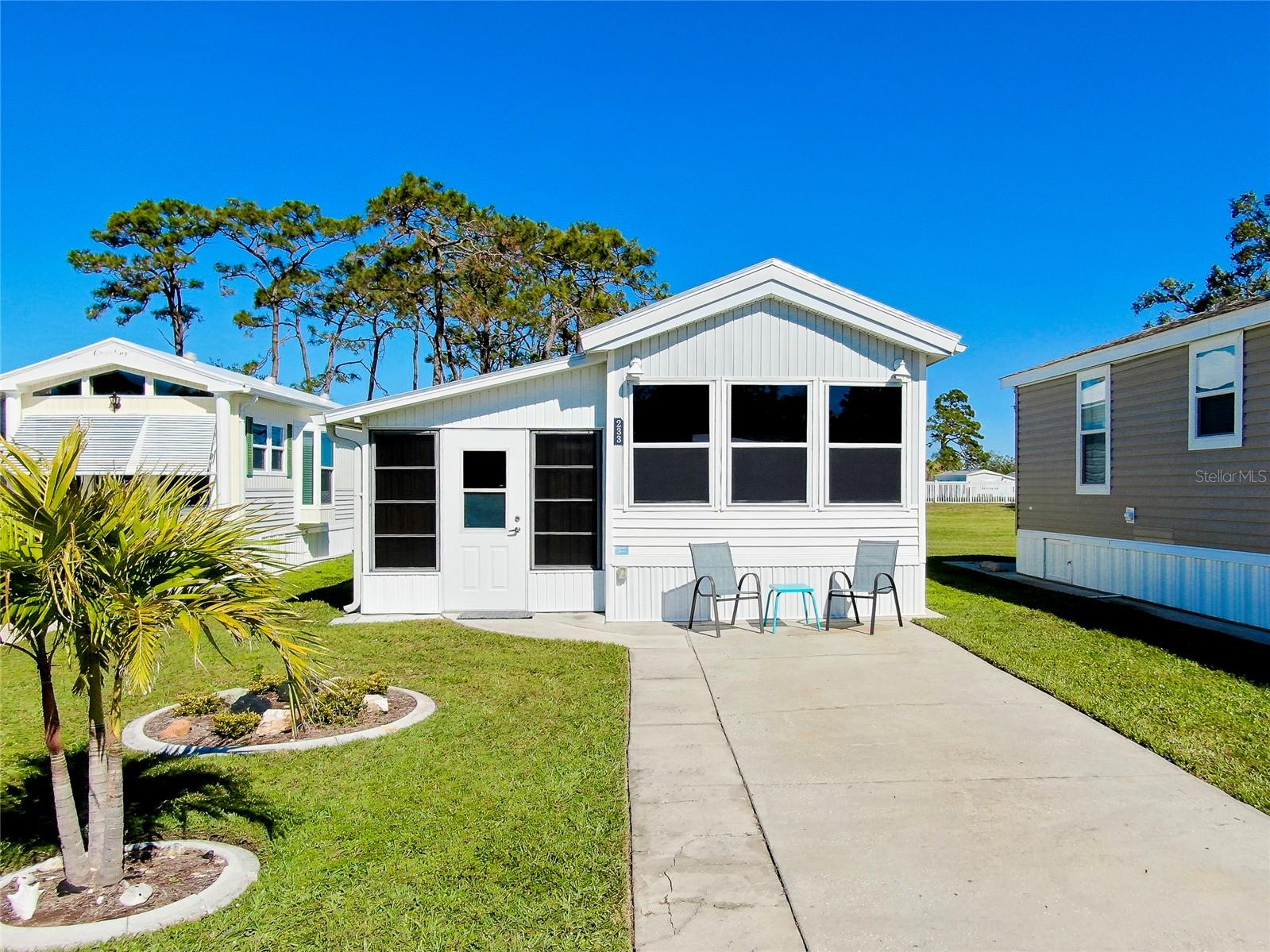 Charming and updated fully furnished home in Kings Gate Park.55 + Gated Community, Where You Own Your Own Lot.Offering 721 sq. ft. of comfortable living space including under A/C lanai, this one-bedroom, one bathroom home features a spacious air-conditioned lanai, which can be used as a second bedroom for guests. The bright and inviting interior is complemented by numerous recent upgrades, making this home move in ready. Modern Updates for Comfort and Efficiency. Recent improvements include new plumbing and faucets (2023), a new water heater (2023), and new kitchen LED lighting (2023), enhancing both functionality and style. It has a newer membrane roof (2021), new flooring (2021), and new window treatments that add to the homes fresh and updated feel. A new front door (2024), new siding and skirting (2024), sewer backup preventer (2024), new surge protector (2024) all provide added durability and peace of mind. The window tinting and sun screens contribute to energy efficiency, helping to keep your power bill low. The outdoor space is designed for convenience and relaxation, featuring a covered back patio with LED lighting, perfect for grilling in the evenings.The lanai's back section opens to allow for golf cart storage, and the long driveway can accommodate two cars. Kings Gate Park offers a very friendly, and welcoming atmosphere with low HOA fees that include water, sewer, high speed internet, over 270 TV and music channels, and grounds maintenance.Residence enjoy access to a large heated pool, tennis and pickleball courts, bocce, shuffleboard, a fitness center, craft room, gardening room, woodworking shop, bike repair/rental shop and a clubhouse. The community also features a private Marina for boat storage, and a boat and kayak ramp, fishing dock, and RV storage. Prime Location - Minutes to the Beach & Downtown.This home is conveniently located Just 4 miles from Nokomis Beach, and historic downtown Venice, offering easy access to shopping, dining, and entertainment. Sarasota Memorial Hospital's Venice campus is only 2.5 miles away, ensuring close proximity to medical facilities.Outdoor enthusiast will love the Legacy Trail, perfect for biking and walking, as well as the nearby Oscar Scherer State Park for nature filled adventures.Whether you're looking for a seasonal retreat, or a full-time residence, this home provides a perfect blend of comfort, modern updates, and an active lifestyle in a fantastic location. Schedule your showing today.