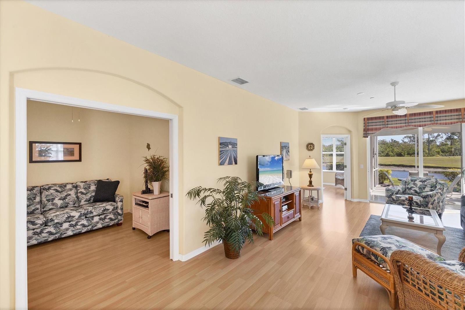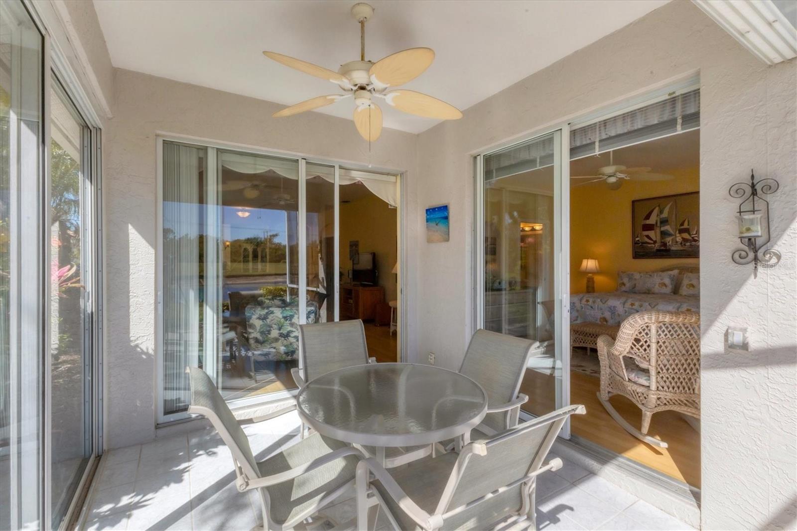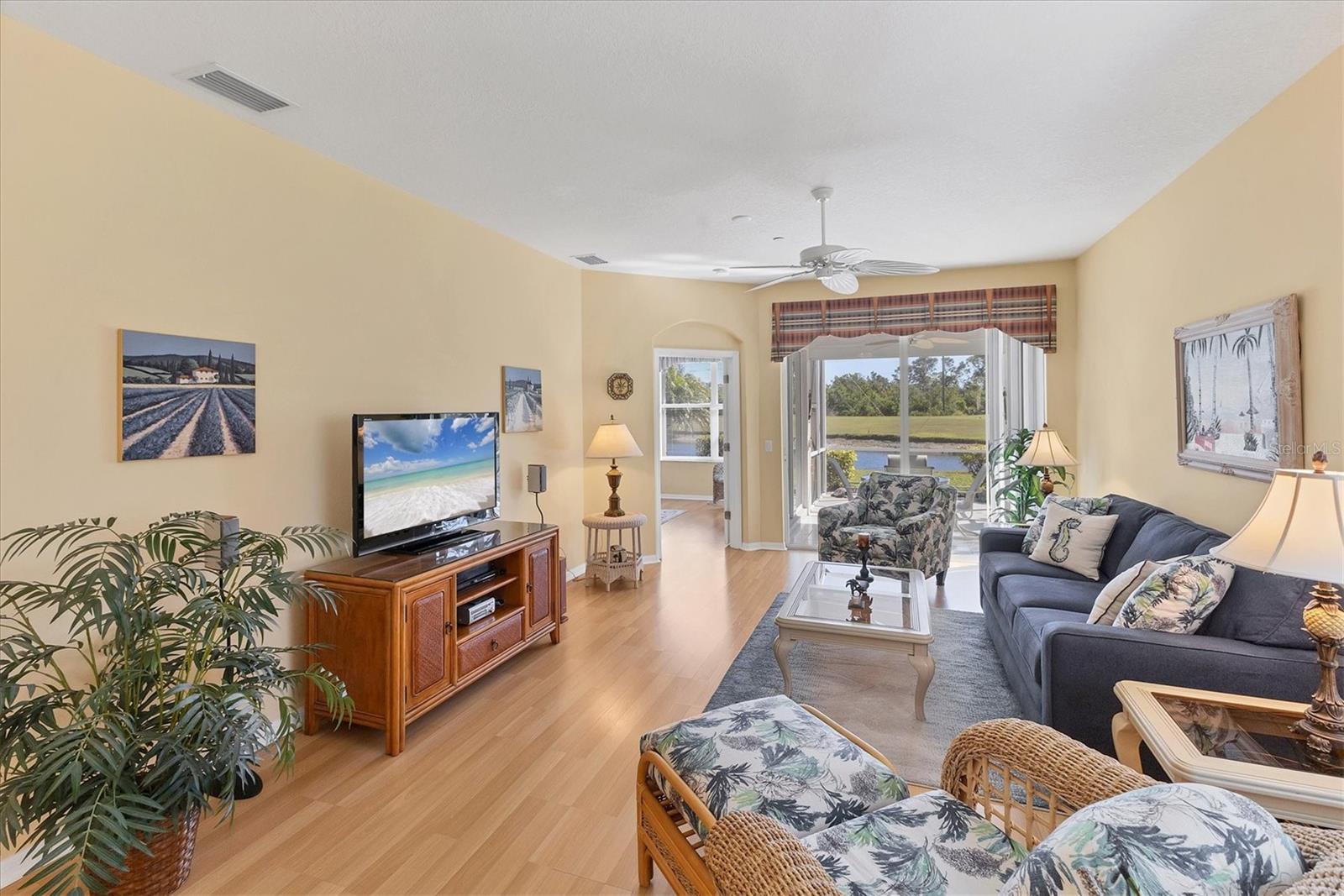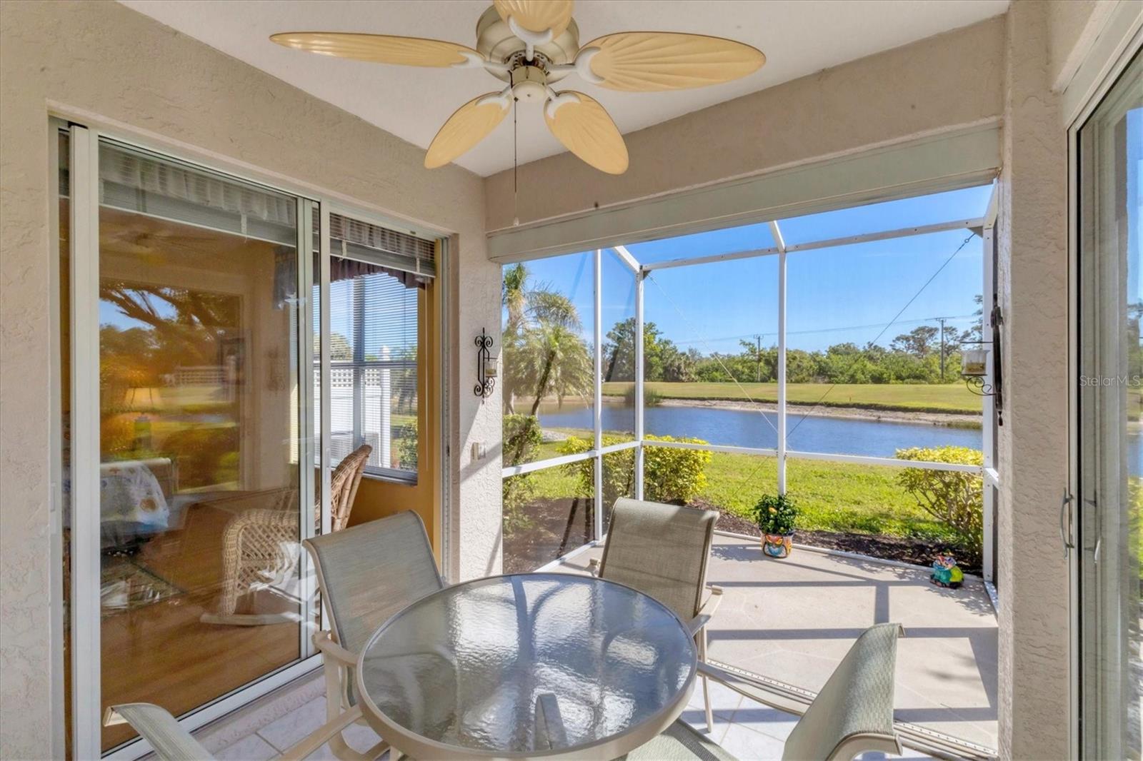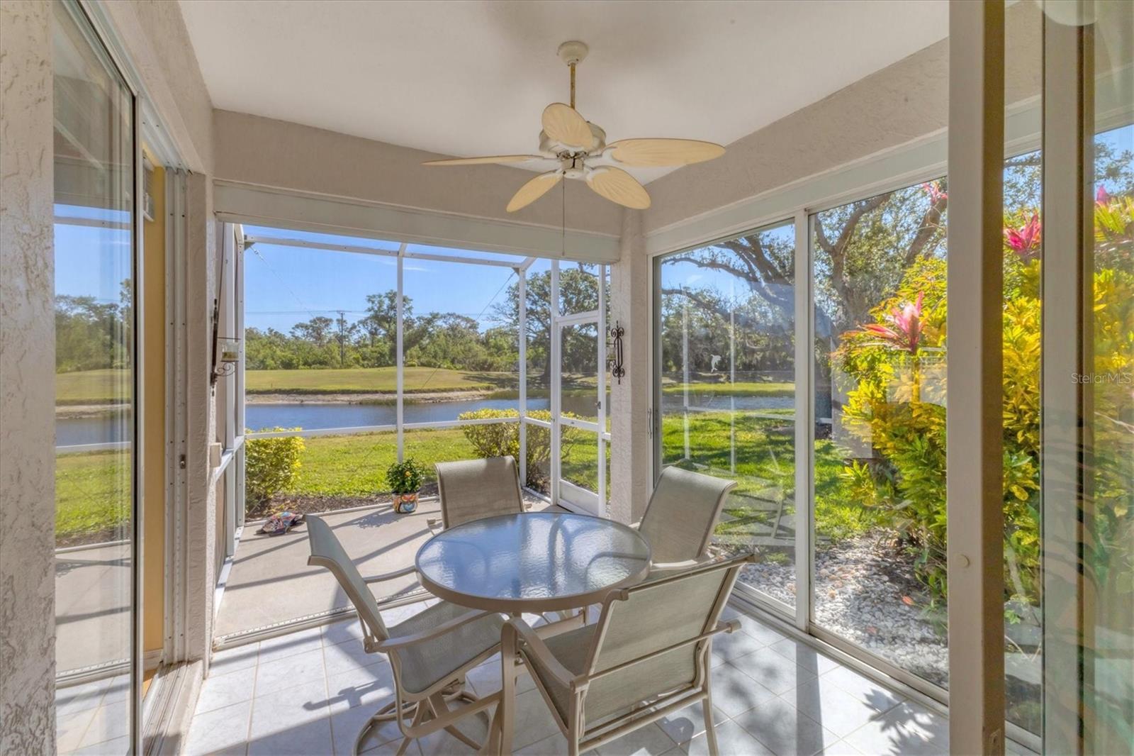 PANORAMIC VIEWS OF LAKE, GOLF COURSE, AND PRESERVE. This must see villa is just what you are looking for!! Magnificent views and Gorgeous Updates, TURNKEY FURNISHED. Popular end unit Birdie Floor plan, 2BD/2BA/Den. Windows are on the South side of villa for a natural bright and cheery space. Open floor plan with your living space leading you out the sliders to the extended lanai with panoramic views. Covered portion of lanai is enclosed by glass doors for protection of lanai from wind and rain and the floor has been tiled. Extended portion screened to catch the breezes and sitting in the sun. Interior has been updated. Laminate floors throughout main living areas with tile flooring in wet areas. Kitchen was updated with new cabinets, granite counters, subway tile backsplash, rectangle tile floors, and new appliances. Spacious Master Bedroom with a view and sliders to lanai. En suite master bath with dual sinks, walk in shower, and walk in closet with updated counter tops. cabinets, and fixtures. Guest bedroom at opposite end of villa for guest privacy. Guest bath updated with same materials as master bath. NEW ROOF. Exterior painted 2025. AC 2024. WH 2017. Property has been replumbed. NO HURRICANE DAMAGE AND NOT IN A FLOOD ZONE!!!. This immaculate villa will go quickly, so MAKE YOUR APPOINTMENT TODAY and start living YOUR Florida Lifestyle. Not in Florida to see it? 3D WALK THROUGH AT: https://my.matterport.com/show/?m=17vB9obPo7U Pelican Pointe is Venice's premier community with resort style amenities- Clubhouse with restaurant/bar/grill, heated pool, fitness center, tennis courts, pickle ball, tons of social activities, social room/library, 27 holes of golf and pro shop. Huge and very active Women's Association with tons of activities to choose from. Golf membership is NOT mandatory. LOW HOA fees include use of all amenities, plus cable, internet, and all landscaping( grass cutting, trimming bushes, hedges, trees, yard cleanup, etc. All centrally located minutes to Venice Beach, Venice Downtown, shopping, theatres, restaurants, highways, airports, and so much more.Come find your Florida Lifestyle today!