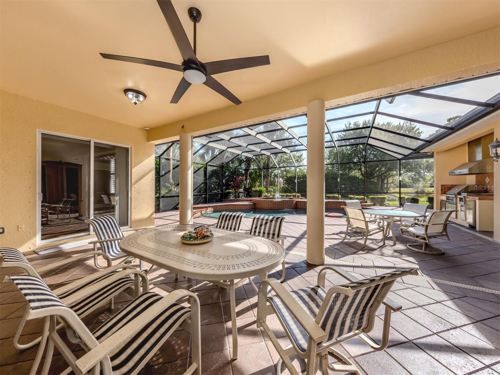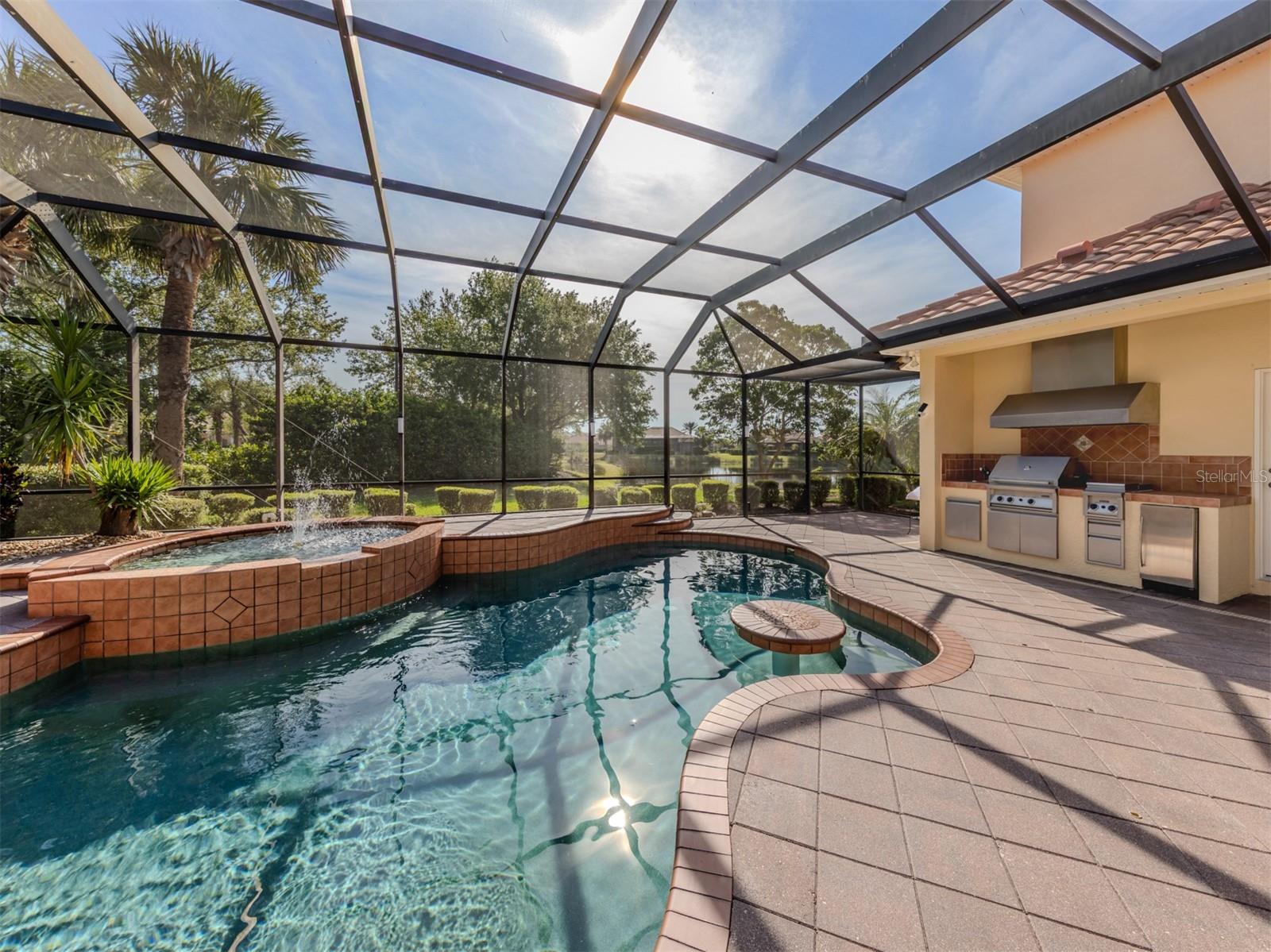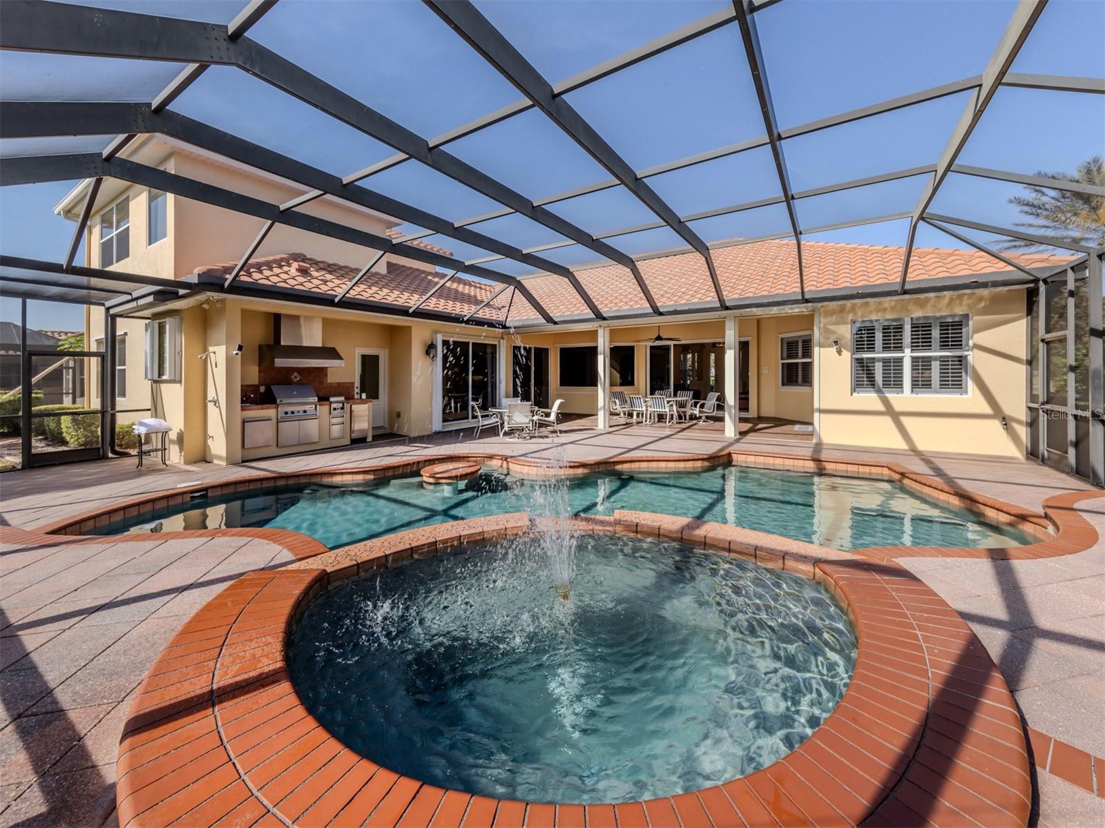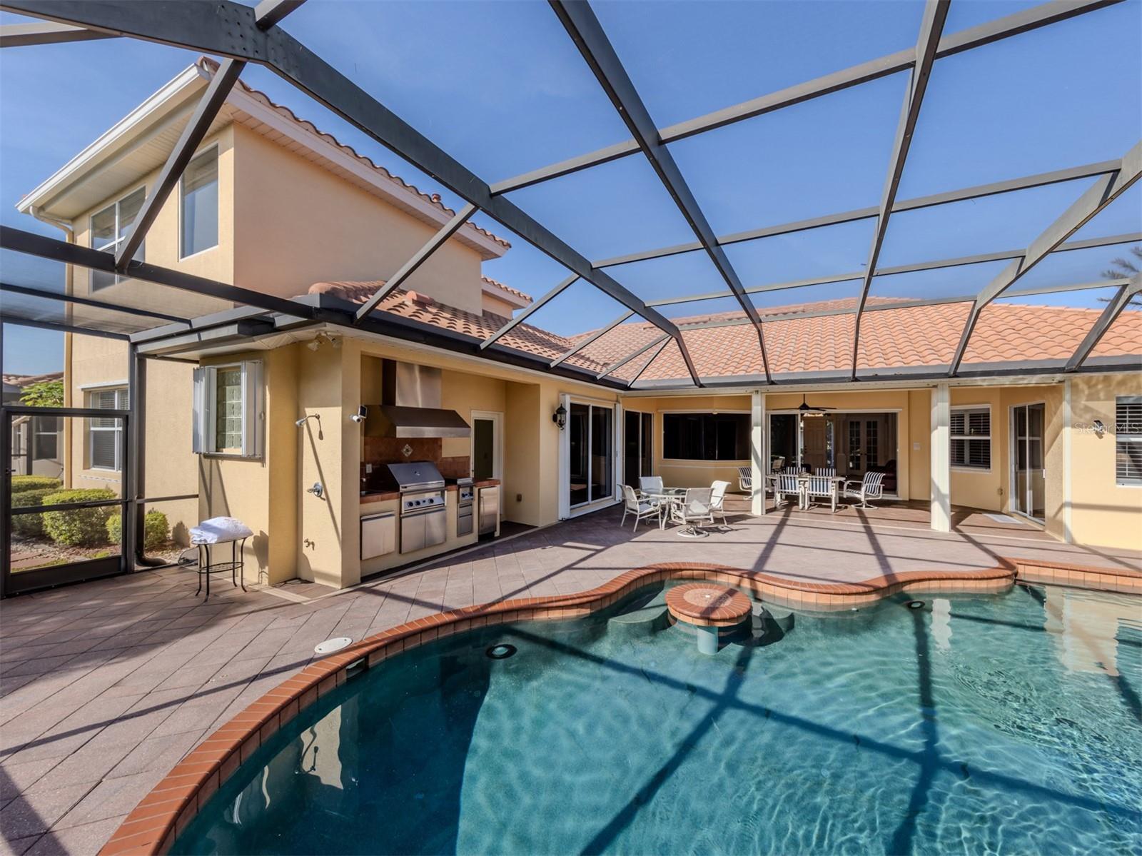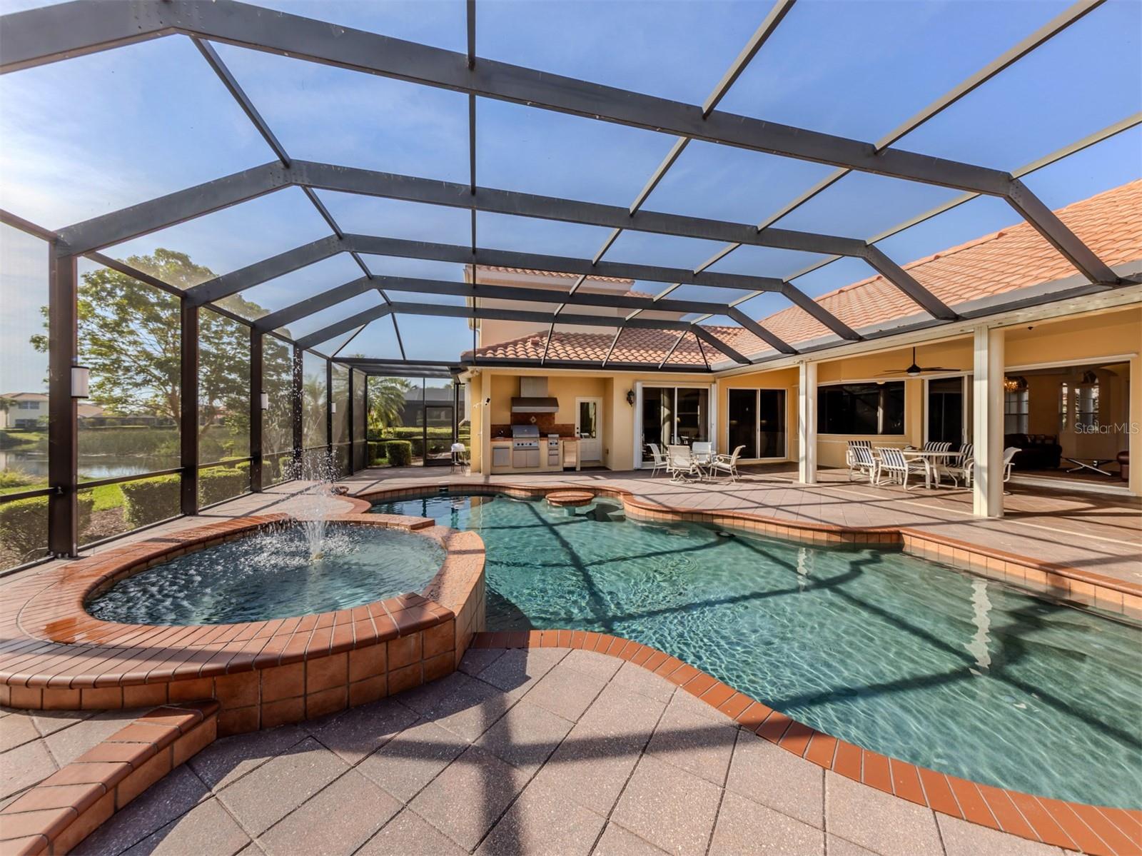 Leave the cares and stresses of the world behind as you step inside your personal sanctuary. Enter and let your eyes feast on the tropical haven that is your lanai. Wander past the living room and dining room to feel the warm embrace of the heart of the home. Whether it be entertaining or family life, this house is ideal for you. The kitchen is large with newer appliances, large breakfast room with views of pool. Three bedrooms and two baths on one side of home accommodate family and guests. There is a first-floor study next to the large primary bedroom which is a peaceful retreat from the cares of the world. It contains a beautiful bath, walk-in closets, and an intimate sitting room for reading or contemplation. Upstairs you will find an amazing room overlooking an equally amazing view. The room is decked out with built-in desk shelves, drawers, to be an incredible office for remote work, writing a best-selling novel, working out or converting to an artist studio, game room with pool table, or grandchildren's play room/bunk room. The lanai features a large pool with spa and high-top table for socializing, an outdoor shower and beautiful outdoor kitchen. The whole area is a private oasis with mature trees for privacy and a long lake view. All this in the popular Venetian Golf & River Club where you can take advantage of amenities right out your door. Walk to the restaurant and enjoy Chef Bryan's yummy offerings which include special dinners, prime rib nights, pasta nights, burger nights, and pizza nights, and more. Walk to tennis, pickleball, lap pool, water aerobics, tiki bar, gym, free exercise classes, many games like bridge, mahjong, hand and foot. You can even hop on to the exotic boardwalk through the jungle down to the Myakka River and the nature preserve from your backyard. It is all at your fingertips. Not to mention the proximity of this great subdivision to the highway, hospital, fire department, public beaches and the wonderful quaint town of Venice with its many restaurants, shops and theater. This is more than a house, it is a new way of life. The way life should be!