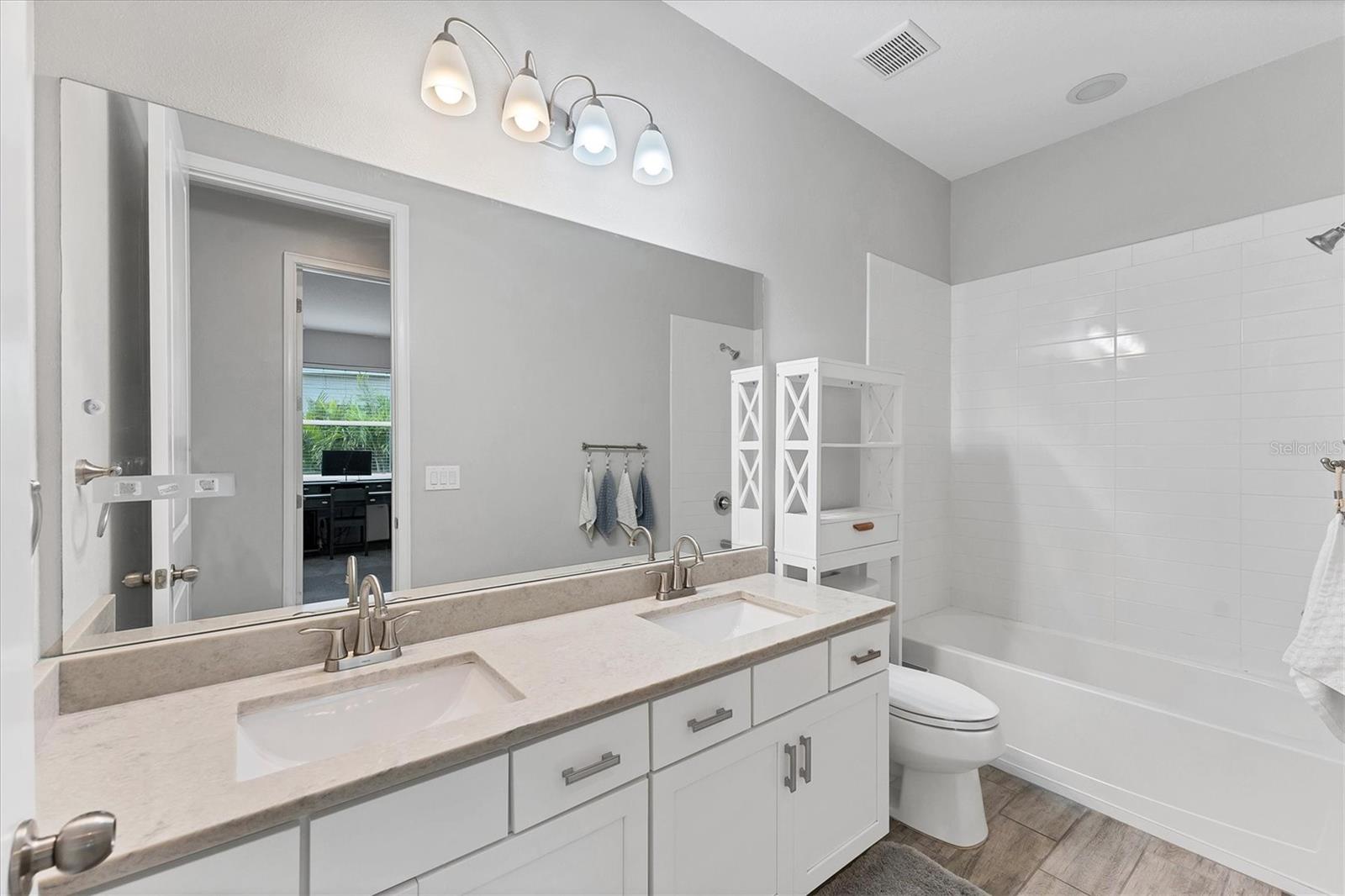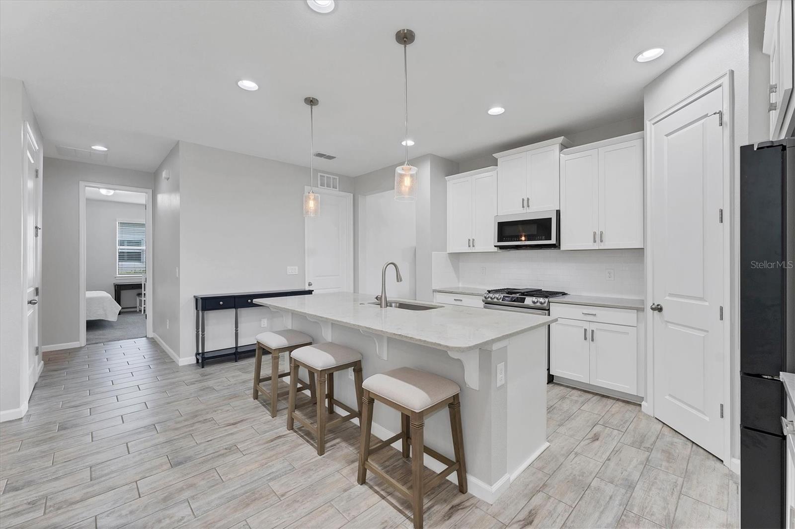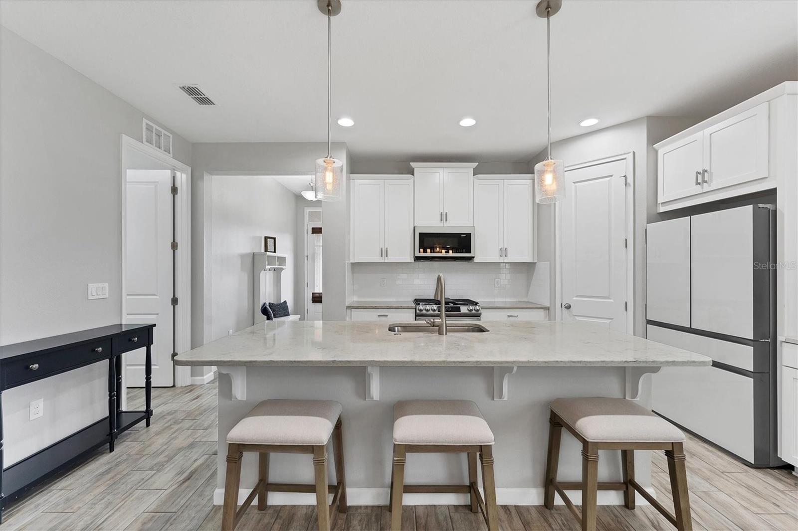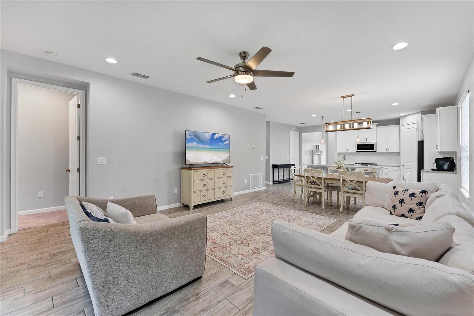 Don't miss this incredible opportunity to own a stunning home in the highly sought-after #1 Multi-Generational Master Planned Community in the U.S., Lakewood Ranch. Nestled within the peaceful, maintenance free - gated community of Harmony Reserve--part of the vibrant Harmony at Lakewood Ranch. This immaculate residence offers a beautiful Coastal and modern-inspired design and access to resort-style amenities that cater to both active and relaxed lifestyles. The property is a gorgeous 3-bedroom, 2-bathroom + den single-family home with a spacious, private, oversized lot at the end of a quiet half cul-de-sac, featuring a lush landscaped look that provides exceptional privacy and ample space to create your own backyard oasis. Inside, you'll find a bright, open floor plan that feels like a model home, with stunning distressed wood plank porcelain tile throughout the main areas, plush upgraded carpeting in all bedrooms, and elegant Sonoma Style linen-finish cabinets complemented by upgraded Marble Mist Zodiac-Quartz countertops in the kitchen and bathrooms with fresh interior paint throughout.Recent upgrades include a stylish dining room chandelier, modern ceiling fans, contemporary fixtures and newer Top of the line Samsung appliances throughout the home. The primary suite boasts a tray ceiling, sliding doors leading to the screened lanai, large walk-in closet and an ensuite bath with a double-sink raised vanity, a relaxing soaking tub, and a glass separate shower--perfect for unwinding. The chef's kitchen features 42" cabinets with crown molding, a beautiful Subway tile backsplash, an oversized island with a large single-bowl sink, and an open design that keeps everyone connected. The versatile den with double French doors offers an ideal space for a home office, homeschool room, or quiet retreat. The spacious laundry room includes newer oversized Samsung washer and dryer, built-in custom shelves, cabinets, and a utility sink for maximum organization, while ample storage is found throughout the home.The 2-car garage is finished with new epoxy floors, built-in overhead shelves, and a utility sink. Additional features include a whole-house water system, tankless water heater, and UV light in the HVAC for cleaner, healthier air. Walking distance from the areas top rated schools. This beautifully upgraded home combines luxury, functionality, and privacy in a premier community setting--truly a perfect place to call home. Schedule your private tour today and seize this exceptional opportunity!